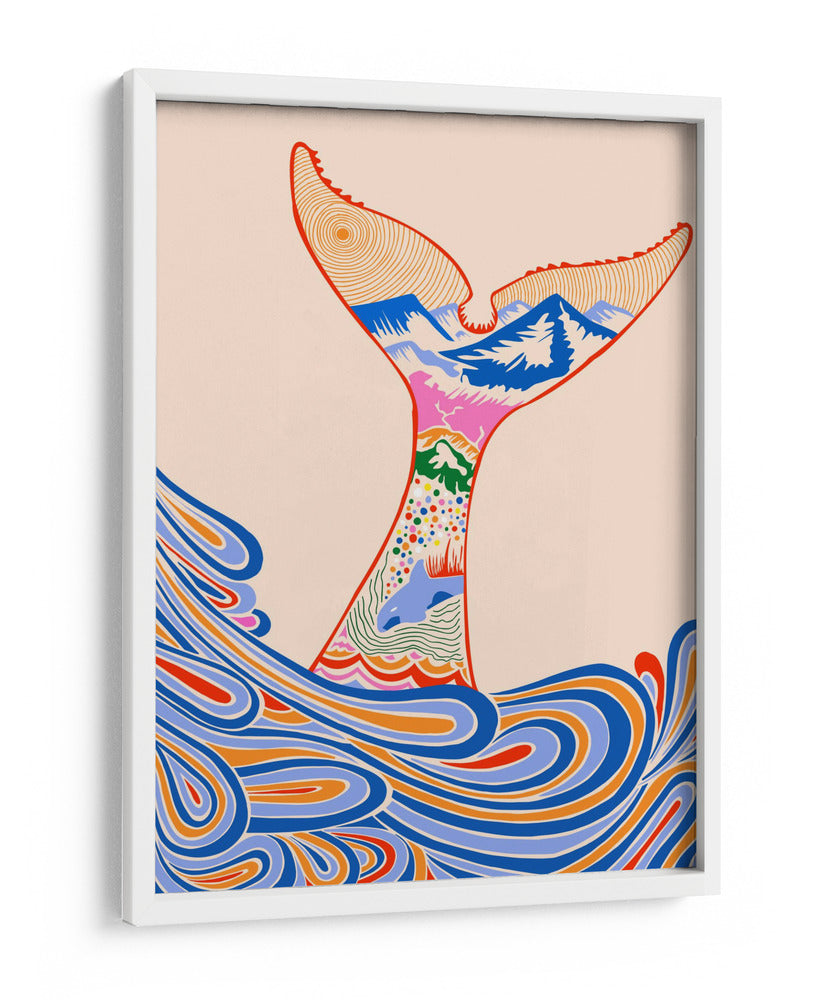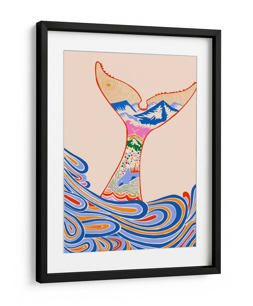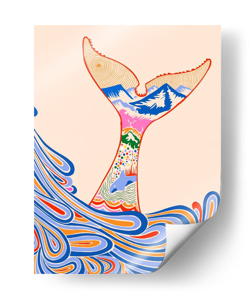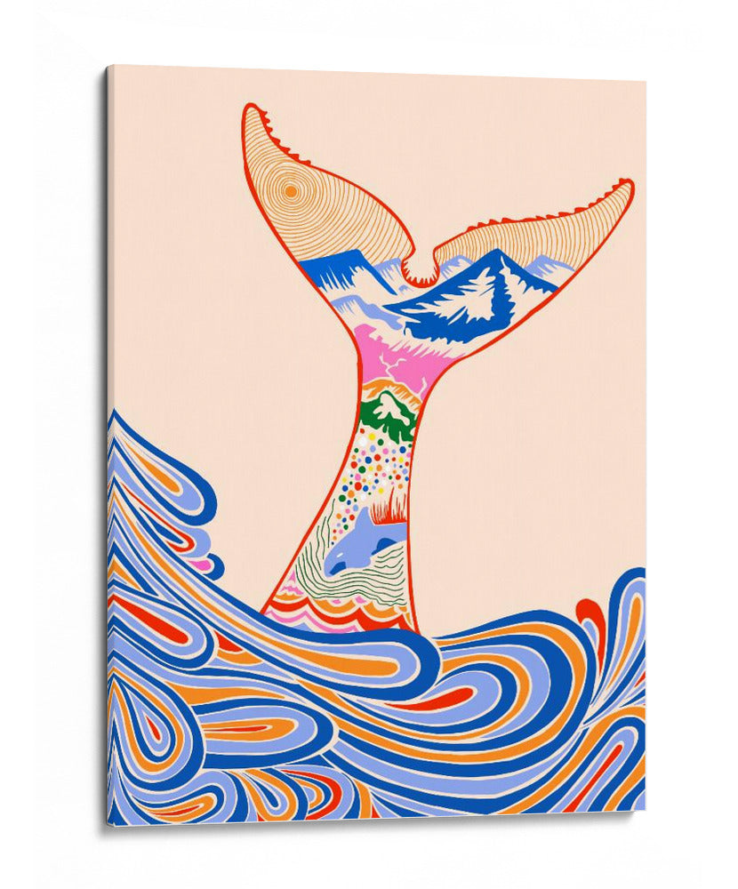 Sumérgete en la serenidad y la maravilla del océano con este cautivador cuadro decorativo, 'Sentir Azul, Tonos de Azul'. La obra presenta una estilizada cola de ballena que se eleva majestuosamente sobre un mar de vibrantes olas azules y anaranjadas, creando una escena llena de movimiento y energía. El interior de la cola se transforma en un lienzo para un paisaje de ensueño, donde montañas nevadas se funden con cielos claros y una rica vegetación, evocando una sensación de aventura y conexión con la naturaleza. La paleta de colores, dominada por tonos azules profundos, naranjas cálidos y toques de rosa y verde, aporta una atmósfera de calma y vitalidad a partes iguales. Este diseño abstracto y contemporáneo, con sus líneas limpias y su composición audaz, es ideal para añadir un punto focal distintivo a cualquier sala de estar, dormitorio o estudio. Transmite una sensación de exploración y tranquilidad, convirtiendo tu espacio en un refugio personal de inspiración artística. Una pieza versátil que evoca la inmensidad del mar y la belleza de los paisajes montañosos, perfecta para amantes de la naturaleza y el arte moderno.