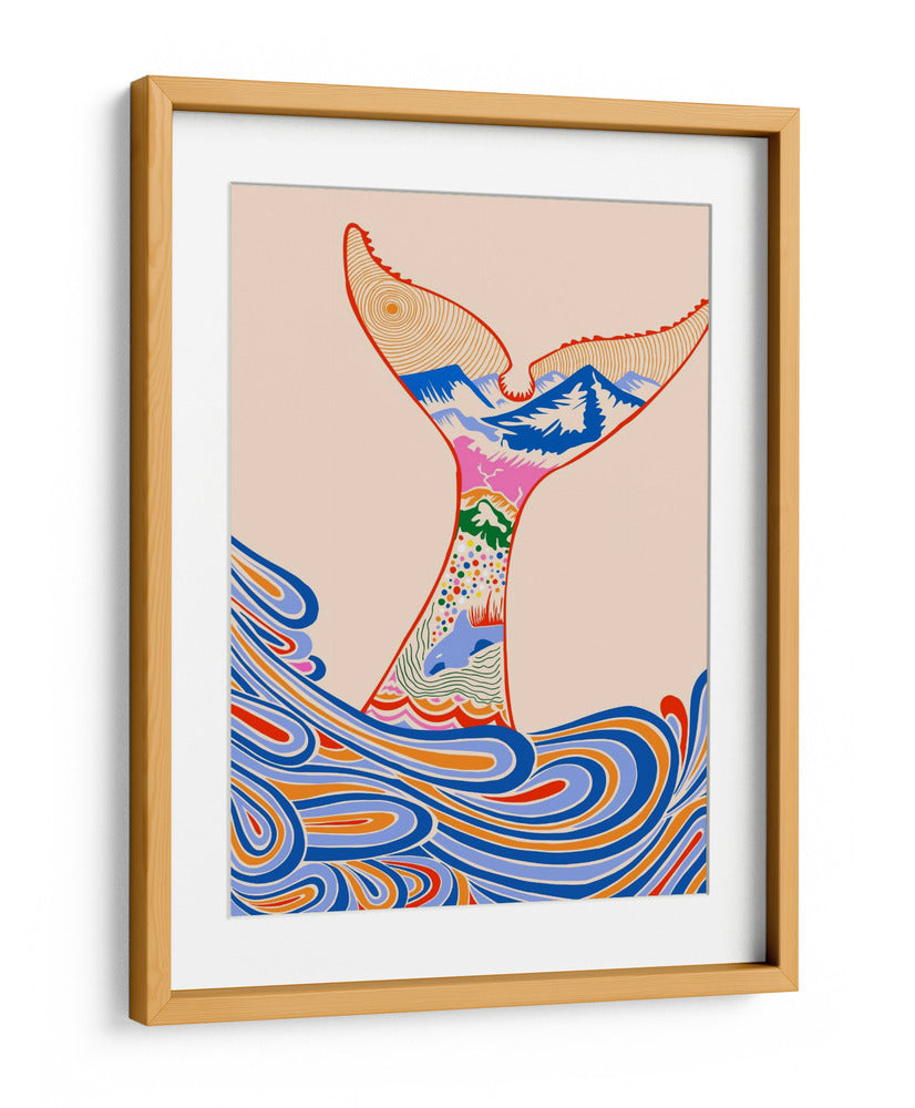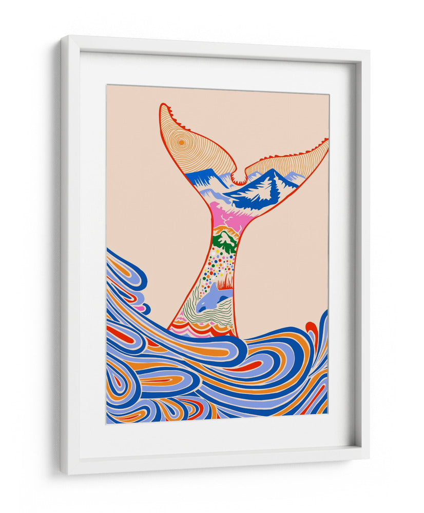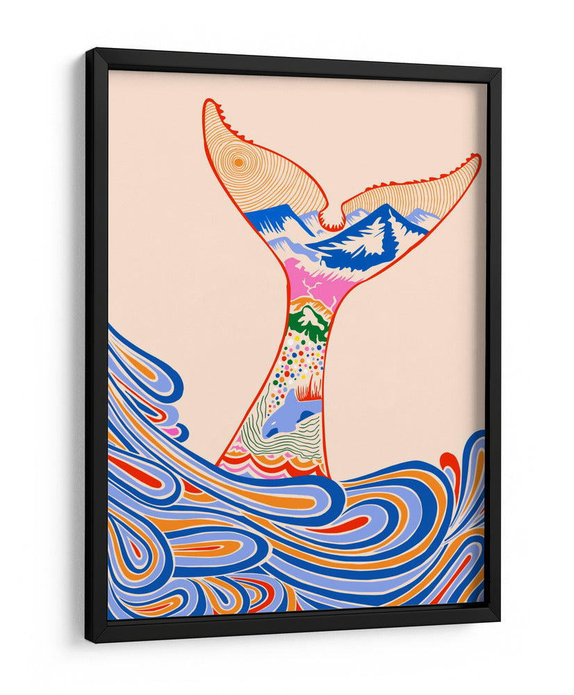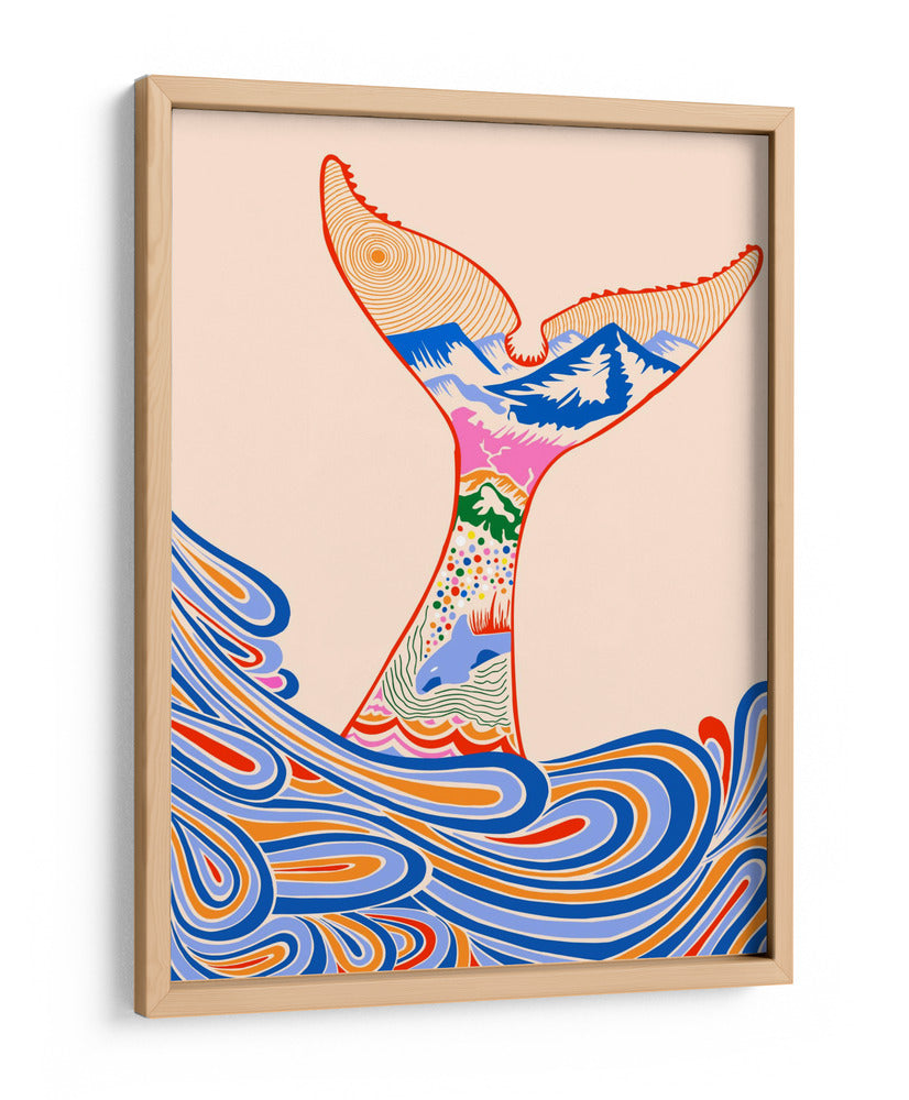 Sumérgete en la serenidad y la maravilla del océano con este cautivador cuadro decorativo, 'Sentir Azul, Tonos de Azul'. La obra presenta una estilizada cola de ballena que se eleva majestuosamente sobre un mar de vibrantes olas azules y anaranjadas, creando una escena llena de movimiento y energía. El interior de la cola se transforma en un lienzo para un paisaje de ensueño, donde montañas nevadas se funden con cielos claros y una rica vegetación, evocando una sensación de aventura y conexión con la naturaleza. La paleta de colores, dominada por tonos azules profundos, naranjas cálidos y toques de rosa y verde, aporta una atmósfera de calma y vitalidad a partes iguales. Este diseño abstracto y contemporáneo, con sus líneas limpias y su composición audaz, es ideal para añadir un punto focal distintivo a cualquier sala de estar, dormitorio o estudio. Transmite una sensación de exploración y tranquilidad, convirtiendo tu espacio en un refugio personal de inspiración artística. Una pieza versátil que evoca la inmensidad del mar y la belleza de los paisajes montañosos, perfecta para amantes de la naturaleza y el arte moderno.