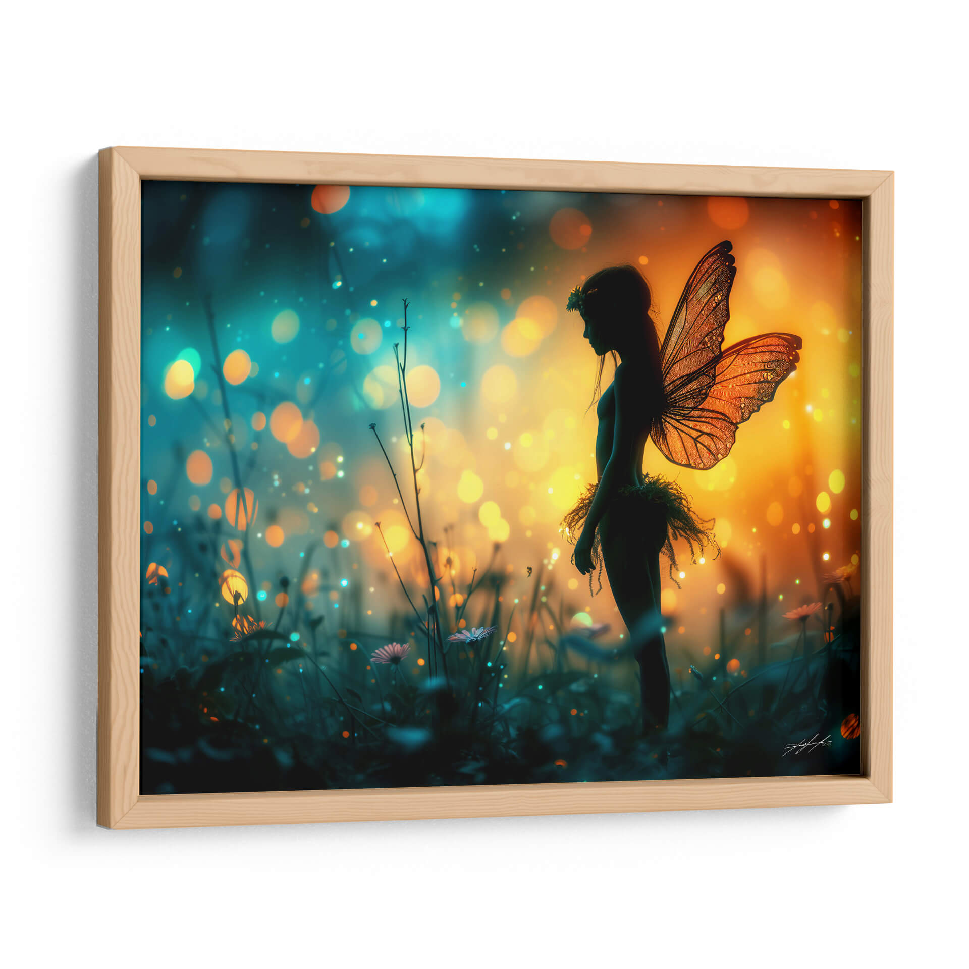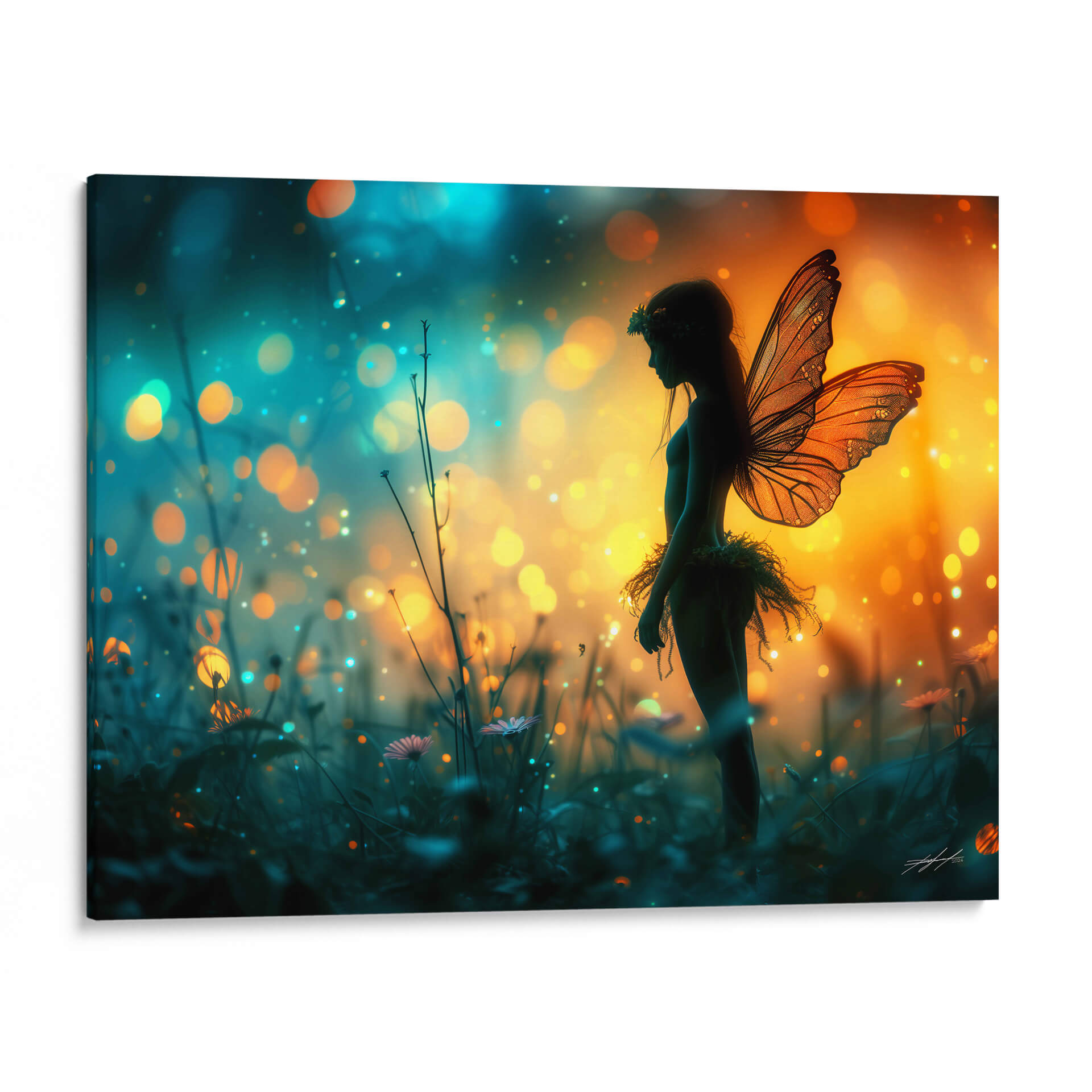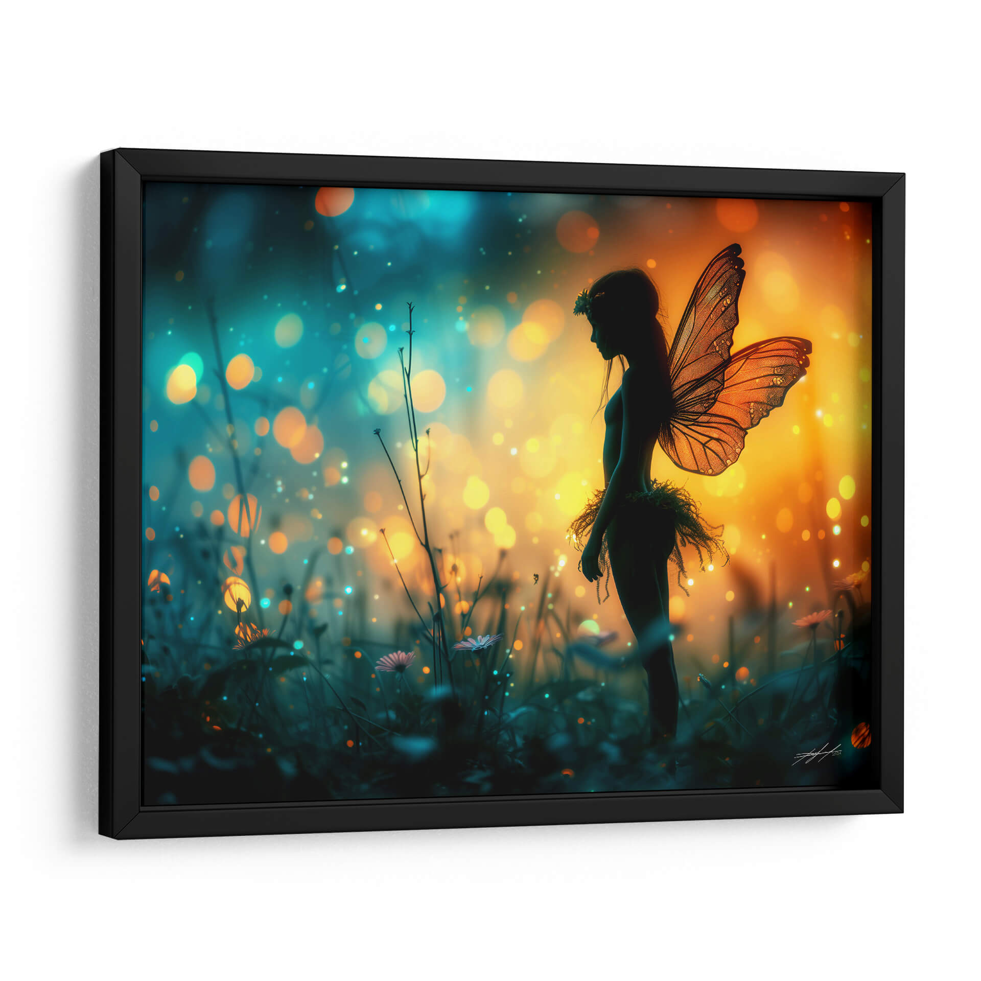 Sumérgete en un mundo de fantasía con 'Sueño de Hadas - 4', una obra de arte digital cautivadora que evoca la magia etérea de un encuentro con criaturas místicas. La pieza presenta la silueta de una figura alada, adornada con una delicada corona de flores, parada en un prado iluminado por una multitud de luces bokeh. El contraste entre los tonos fríos del primer plano, con flores silvestres y tallos esbeltos, y el cálido resplandor anaranjado del fondo crea una atmósfera de ensueño y misterio. Las alas translúcidas de la figura parecen capturar la luz, añadiendo un toque de misticismo. Este cuadro decorativo es perfecto para quienes buscan infundir a su hogar u oficina un aire de encanto y serenidad, sirviendo como un punto focal que invita a la contemplación. Ideal para habitaciones temáticas, espacios creativos o cualquier rincón que necesite un toque de magia y sofisticación. Integra este lienzo en tu decoración para transformar cualquier estancia en un santuario de imaginación y belleza.