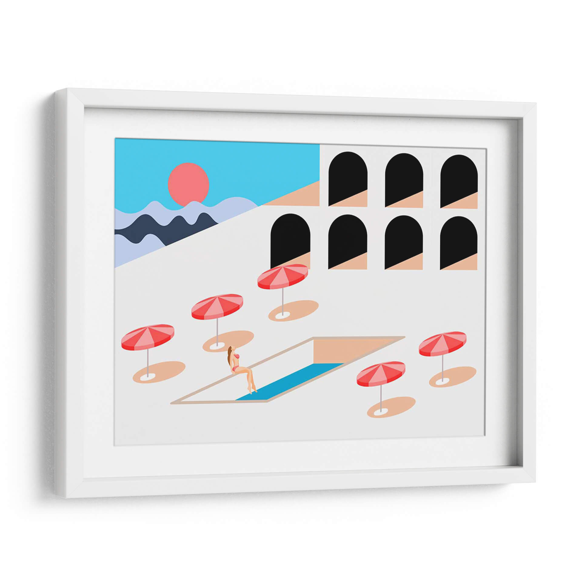 Sumérgete en la serenidad de "Vacaciones Geométricas", una obra de arte contemporáneo que captura la esencia del relax y el estilo veraniego. Esta pieza evoca un ambiente de tranquilidad y disfrute, presentando una escena de piscina estilizada con sombrillas rojas vibrantes y una figura solitaria disfrutando del sol. Los colores planos y las formas geométricas definidas crean una estética moderna y minimalista, mientras que la paleta de azules celestes, blancos puros y toques de coral y rojo aportan una sensación de frescura y calidez. Los arcos negros repetidos en la arquitectura añaden un elemento intrigante y rítmico a la composición. Ideal para espacios que buscan un toque de sofisticación lúdica, este cuadro decorativo es perfecto para salas de estar, dormitorios o incluso oficinas, aportando una atmósfera de escapada y bienestar. "Vacaciones Geométricas" no es solo una imagen, es una invitación a soñar con días soleados y momentos de paz. Añade esta obra única a tu colección y transforma tu entorno en un oasis de estilo y serenidad, un verdadero reflejo del arte moderno que embellece tu vida.