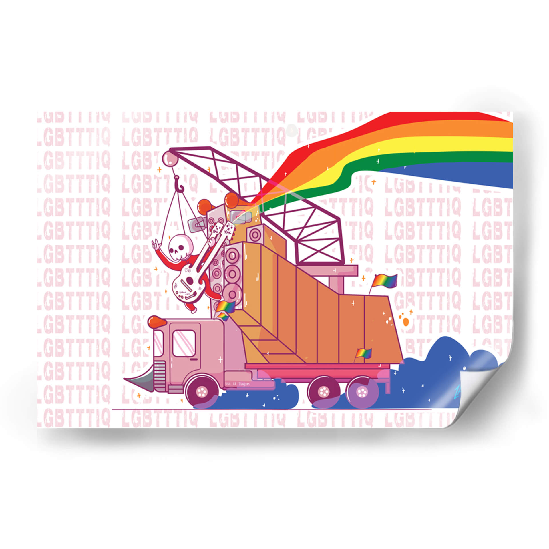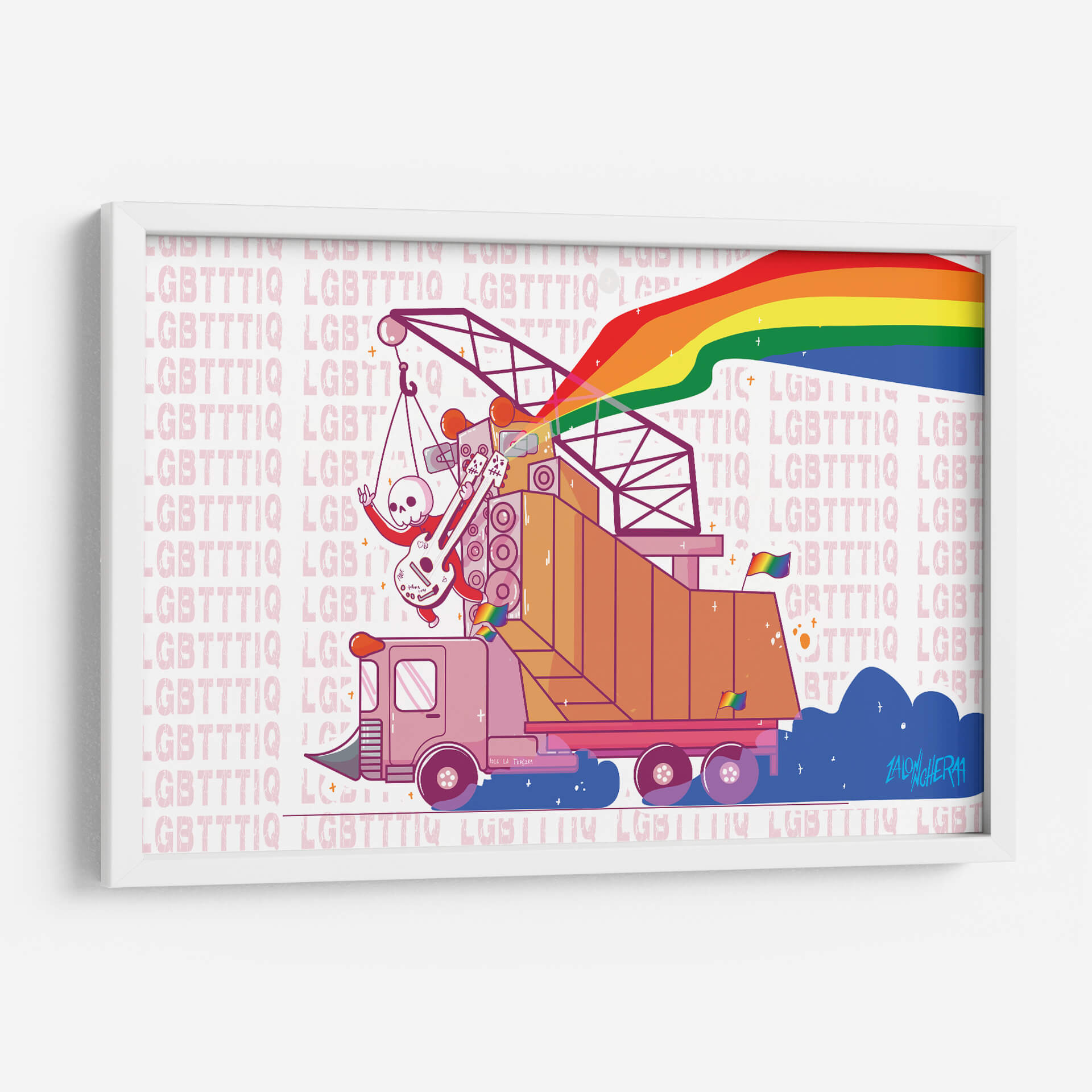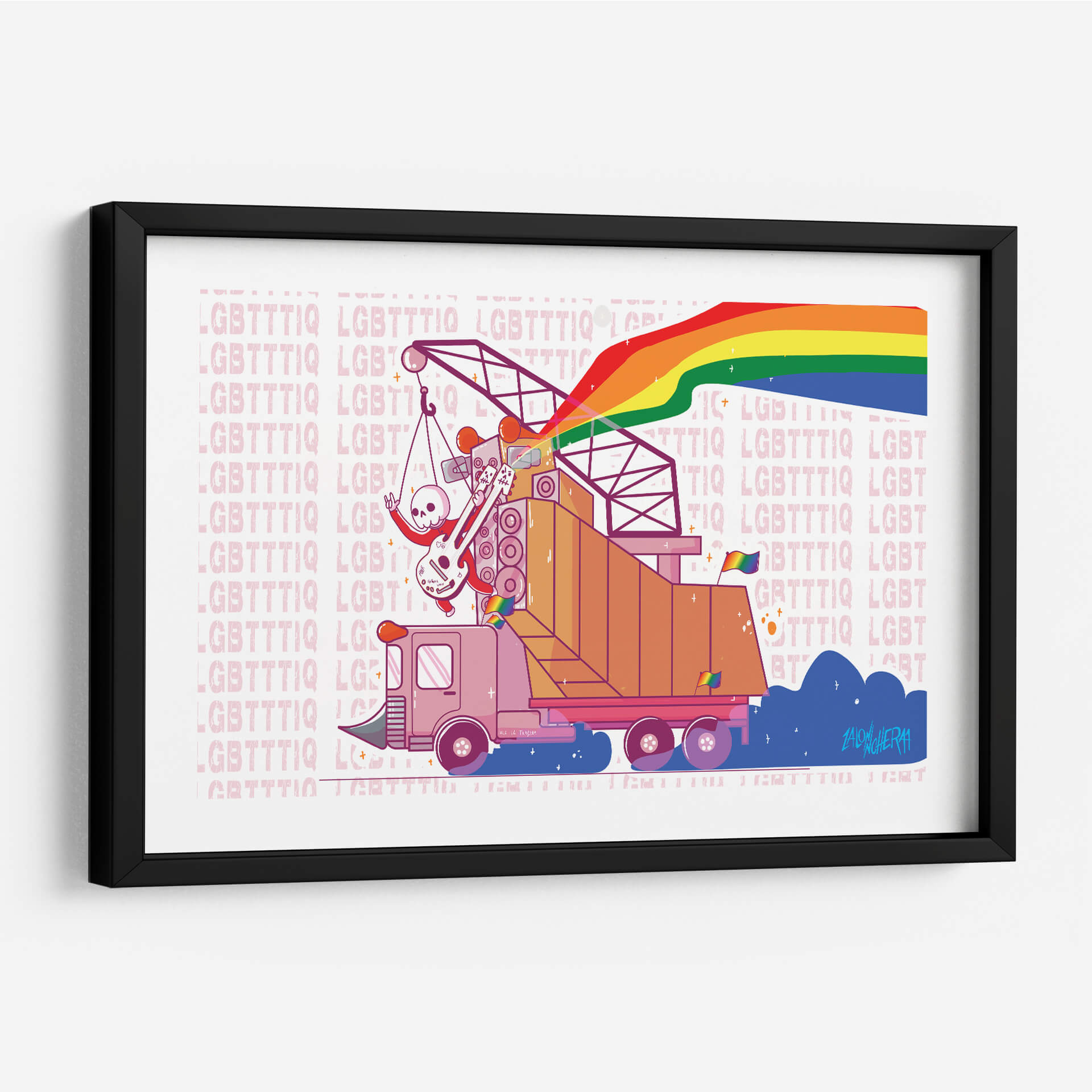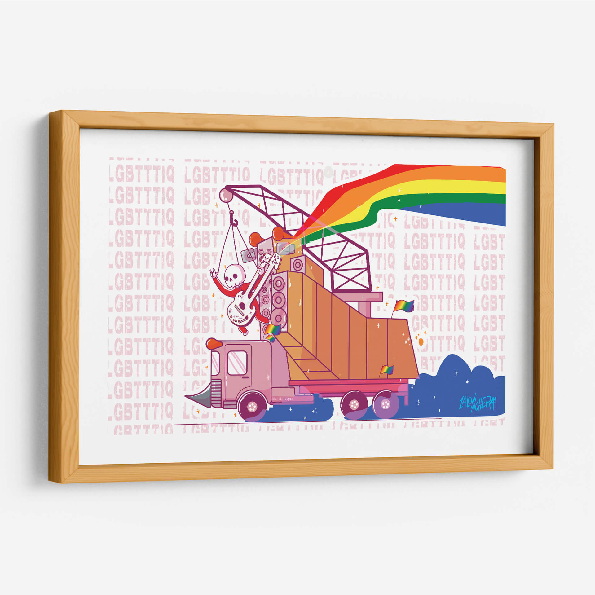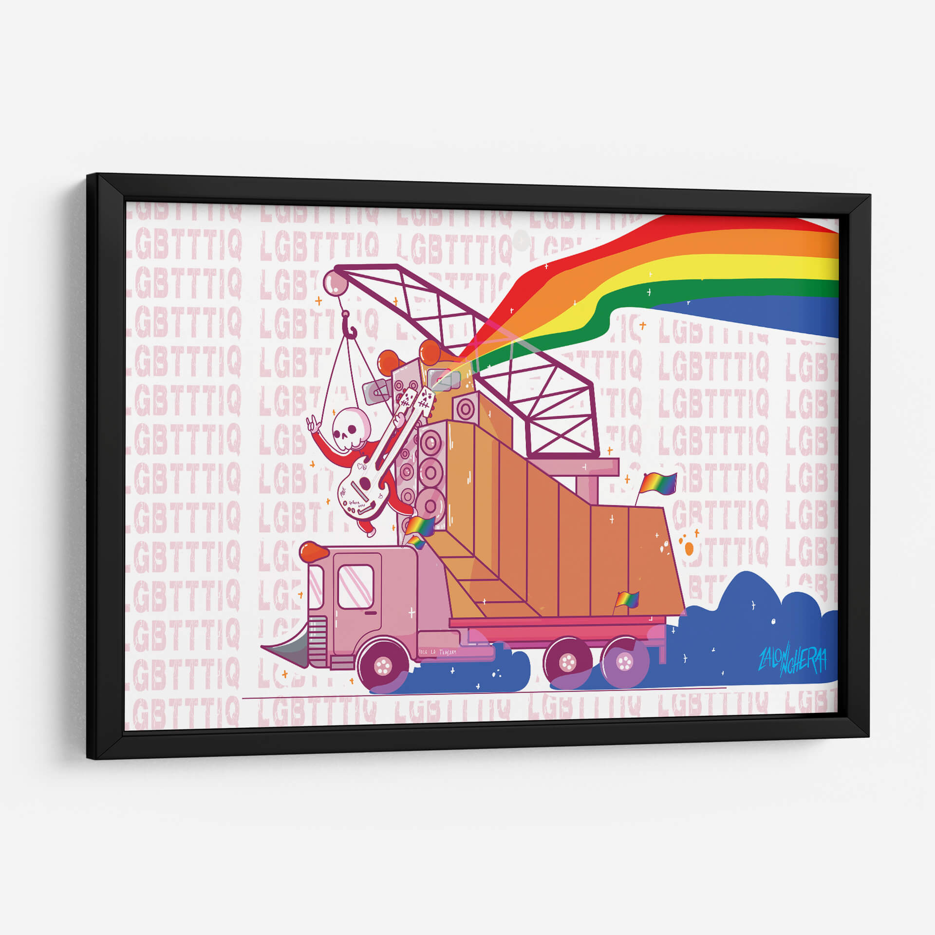 Celebra la diversidad y la alegría con este vibrante cuadro decorativo, "ATESTIGUAMEE!!" de Lalonncheraa. La obra presenta una escena lúdica y enérgica, con un camión rosa adornado con banderas arcoíris que transporta altavoces y una figura esquelética tocando una guitarra, emergiendo de un fondo repetitivo con la palabra "LGBT". Una cascada de colores del arcoíris fluye desde la parte superior, simbolizando esperanza, inclusión y la celebración de la identidad. La paleta de colores es audaz y llamativa, dominada por el rosa del camión, los tonos anaranjados de la estructura y los vibrantes colores del arcoíris. El estilo gráfico y contemporáneo de Lalonncheraa, con sus líneas definidas y su composición dinámica, crea una pieza que irradia optimismo y un espíritu festivo. Este cuadro es perfecto para añadir un toque de color y un mensaje poderoso de aceptación a cualquier espacio, ya sea un hogar, una oficina o un lugar de reunión. Ideal para quienes buscan arte que sea tanto visualmente estimulante como conceptualmente significativo, resonando con los valores de la comunidad LGBTQ+. Transforma tus paredes con esta declaración artística audaz y llena de vida, que invita a la reflexión y a la celebración de la individualidad.