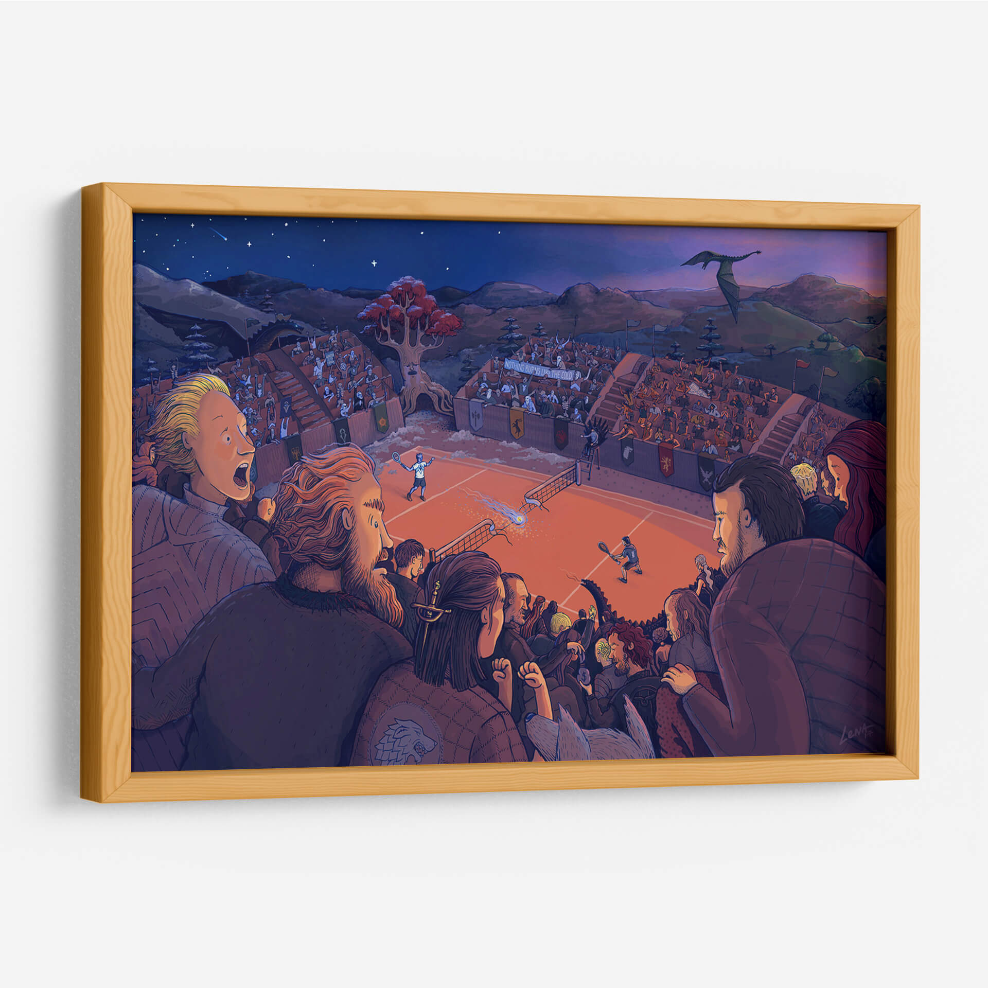 Sumérgete en un universo de fantasía y deporte con este cautivador cuadro decorativo inspirado en "GOT game". La obra presenta una escena vibrante de un partido de tenis épico ambientado en un paisaje nocturno de ensueño, con montañas escarpadas, un árbol de raíces retorcidas y un cielo estrellado salpicado de magia. La multitud eufórica en las gradas, con atuendos que evocan la época medieval, crea una atmósfera de expectación y drama. Los colores intensos, desde el naranja vibrante de la cancha hasta los azules profundos del cielo y los púrpuras de la vestimenta, añaden una dimensión de fantasía y emoción. Este cuadro es ideal para los aficionados a las series de fantasía y a los deportes, o para aquellos que buscan una pieza de arte única y llena de energía para su sala de estar, estudio u oficina. Su estilo narrativo y detallado invita a la contemplación, mientras que su temática inusual lo convierte en un punto focal que sin duda generará conversación. Añade un toque de originalidad y aventura a tu decoración con esta pieza excepcional de arte contemporáneo.