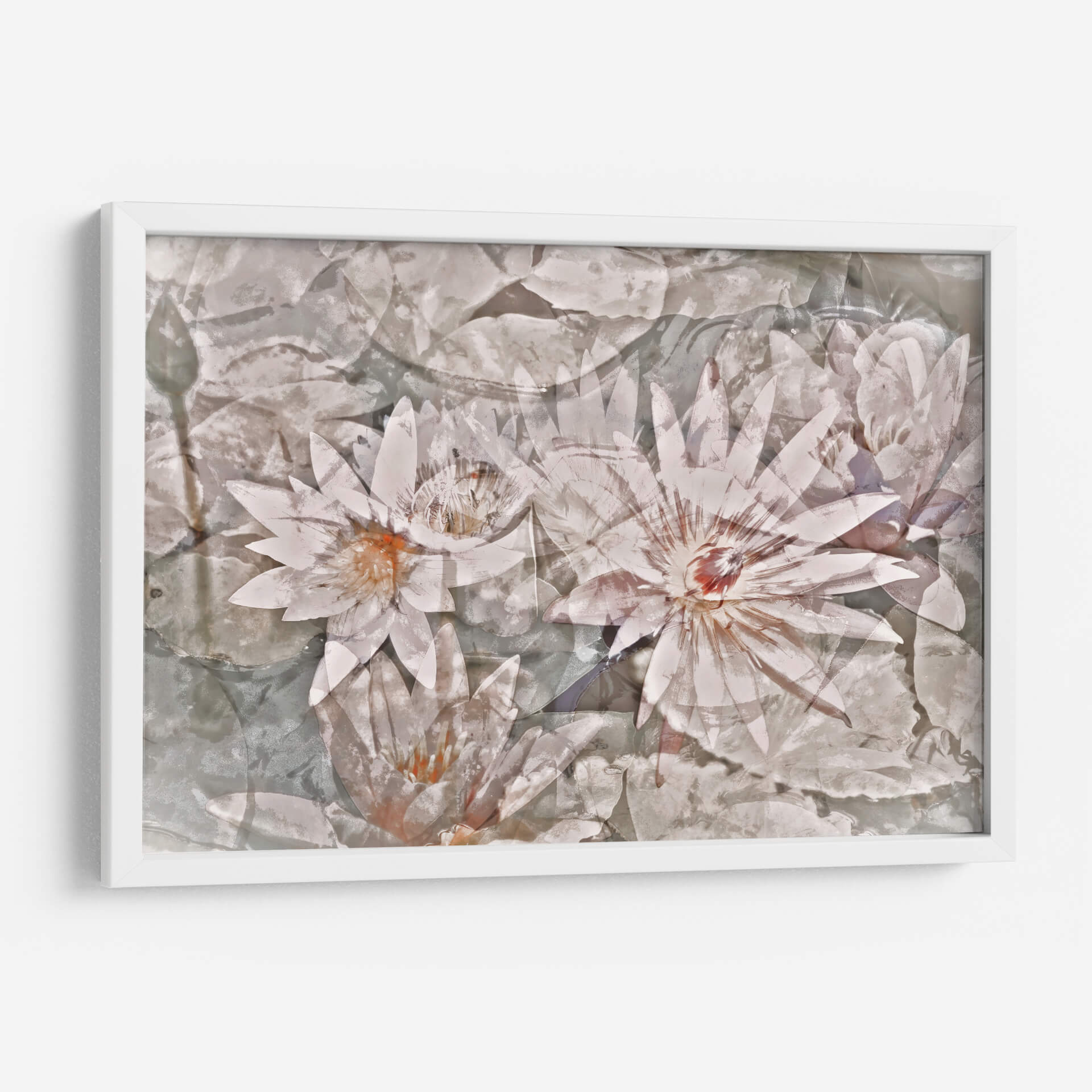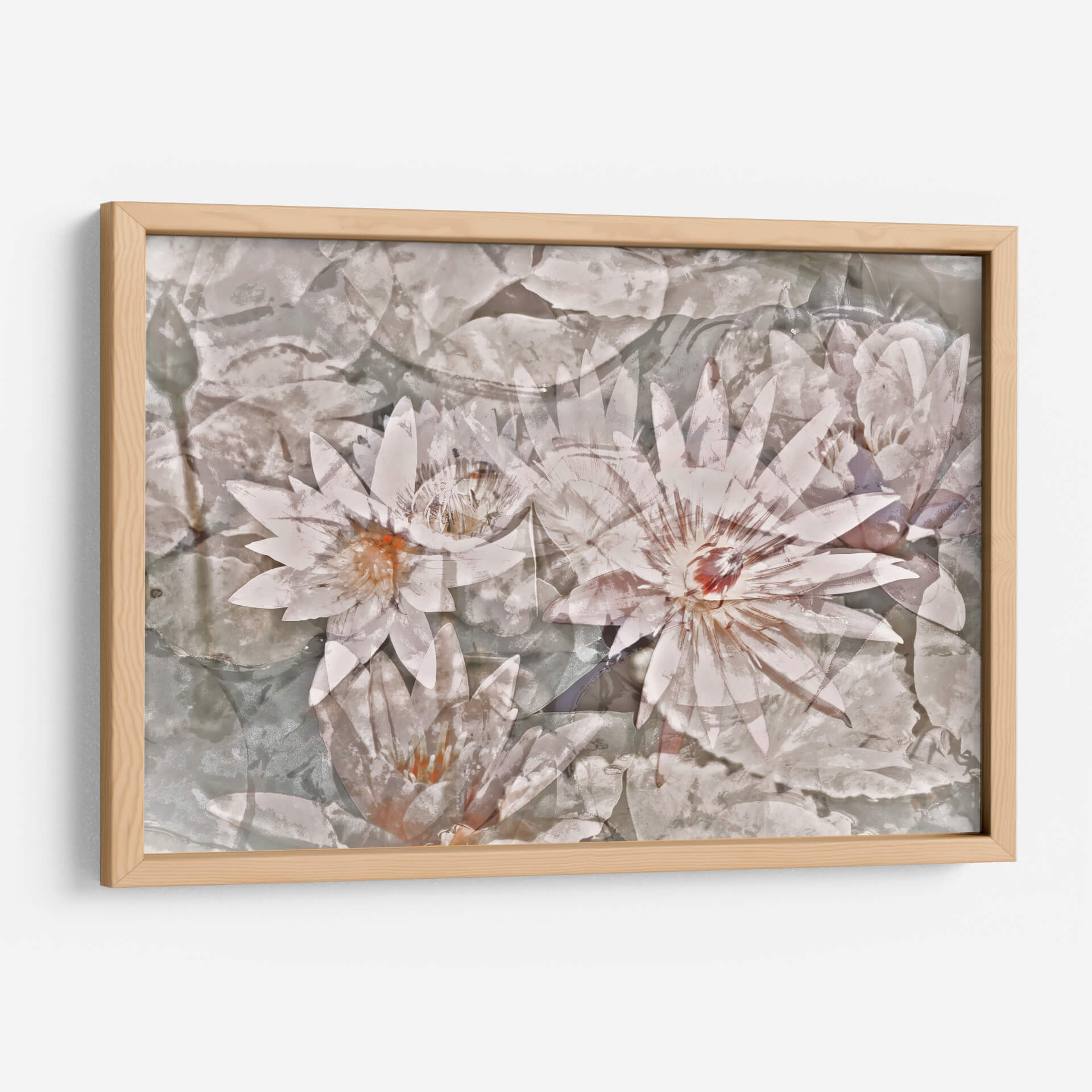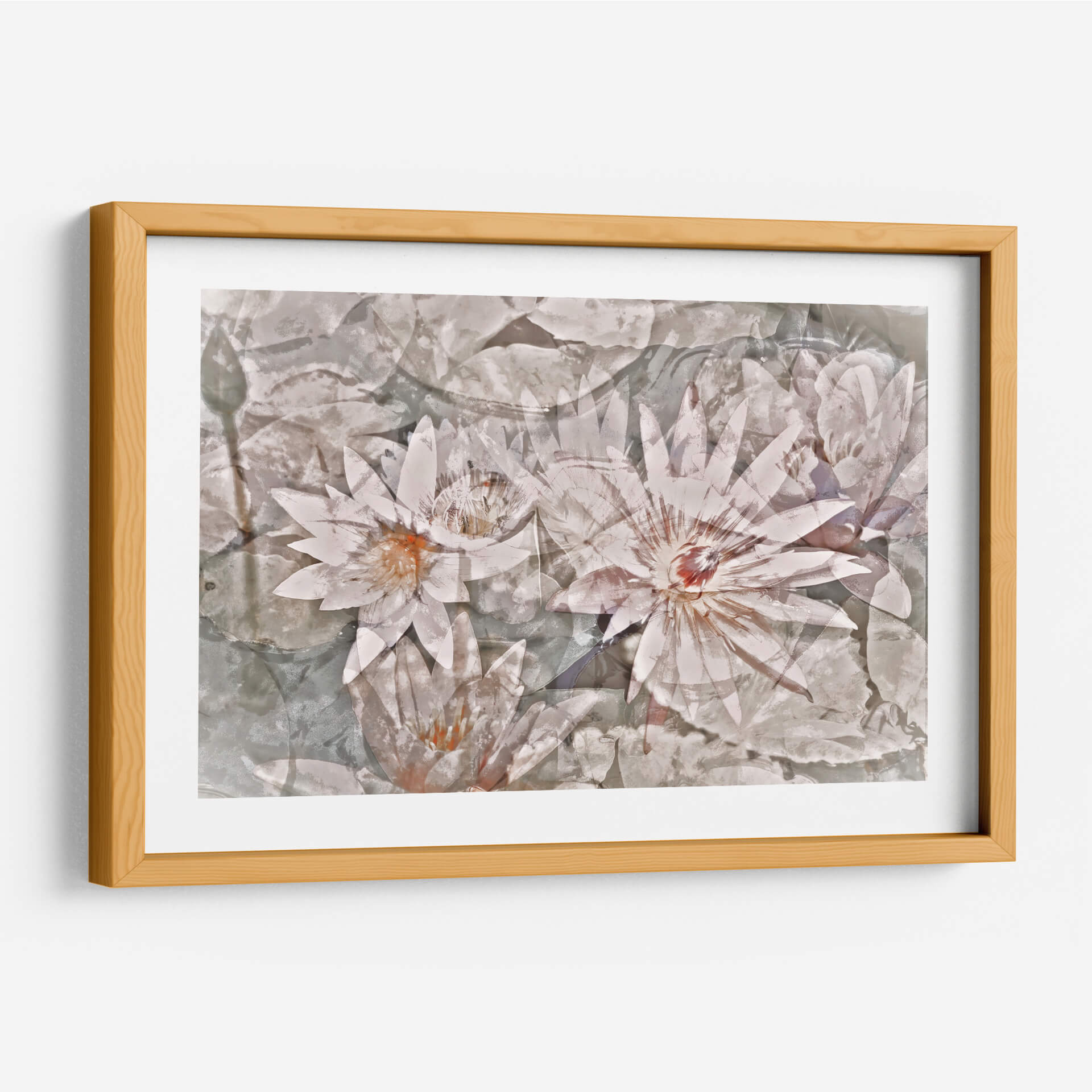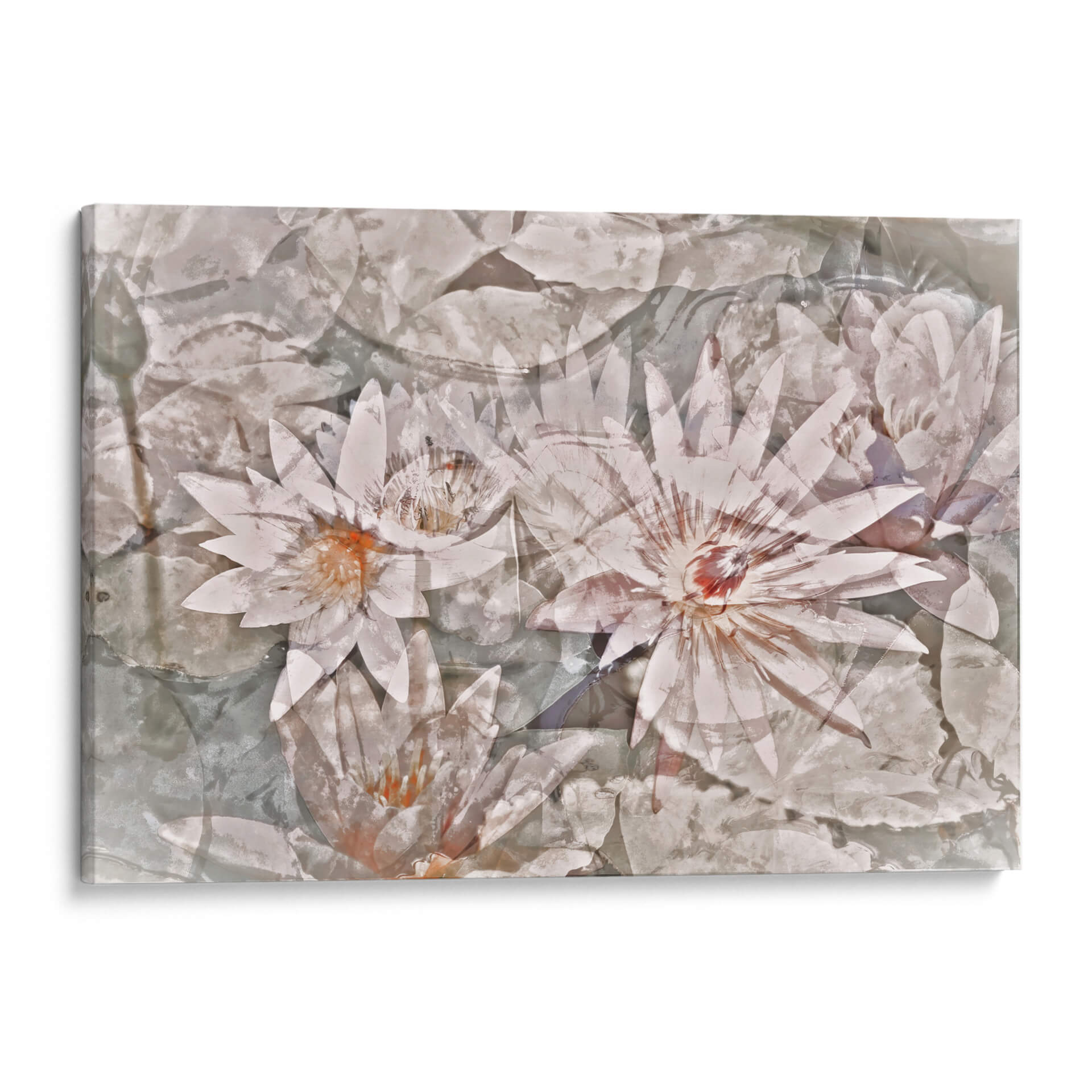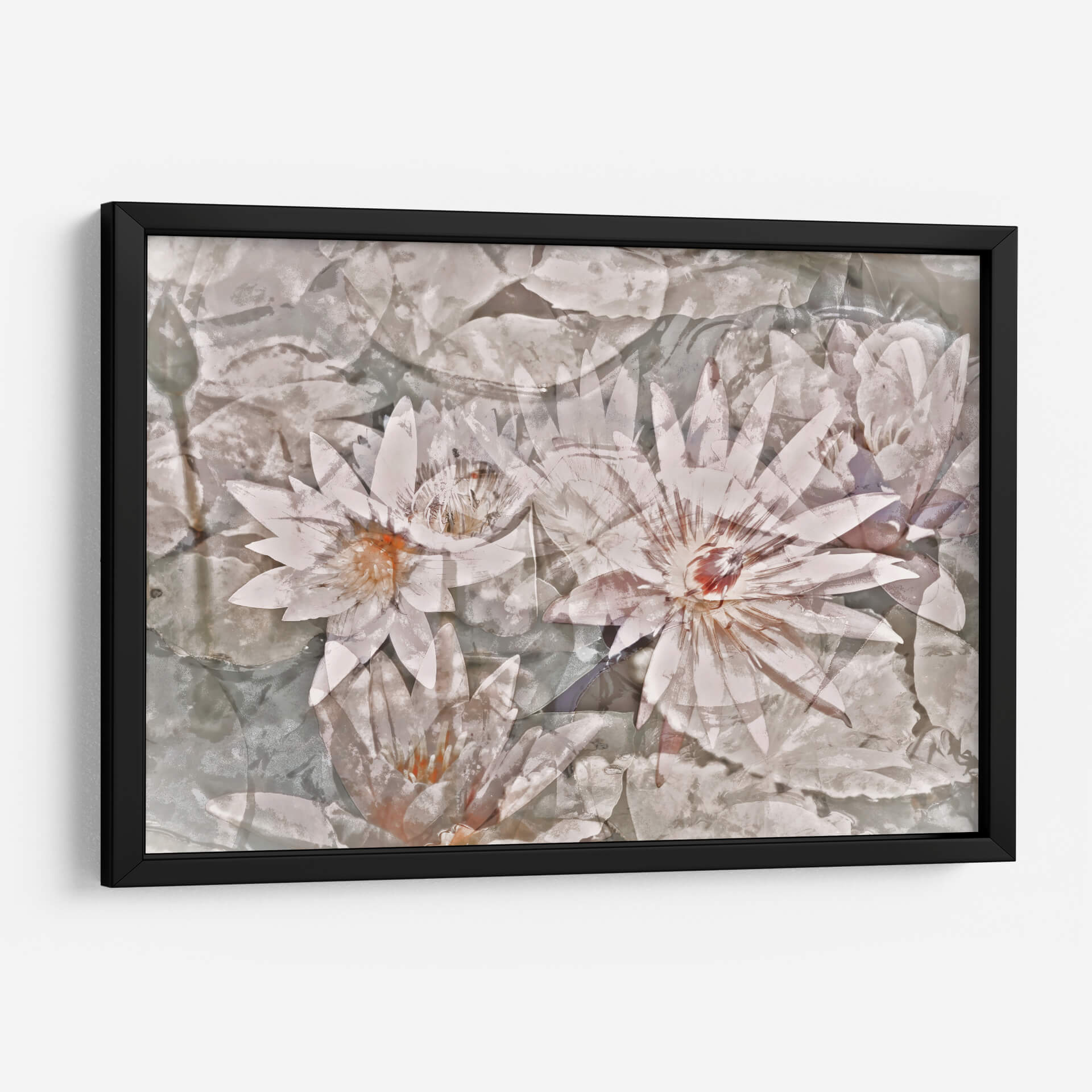 Sumérgete en la serenidad de "Floating", una obra de arte contemporáneo de Nathalie E Langner que captura la etérea belleza de los nenúfares en un estanque. Esta pieza visualmente cautivadora presenta una composición superpuesta de flores de loto en tonos pastel, con sutiles toques de naranja y rojo en sus centros, contrastando delicadamente con el fondo texturizado de hojas en tonos grises y beige. El estilo abstracto y la técnica acuarela crean una atmósfera de paz y tranquilidad, invitando a la contemplación. "Floating" es ideal para añadir un toque de calma y sofisticación a cualquier espacio, ya sea un dormitorio, un spa o una sala de estar que busque un refugio de serenidad. Su paleta de colores suave y sus formas fluidas la convierten en una adición versátil para decoraciones modernas, minimalistas o inspiradas en la naturaleza. Deja que esta evocadora pieza floral transforme tu hogar en un santuario de paz y belleza natural, conectándote con la delicadeza y la armonía del mundo acuático. Es el cuadro decorativo perfecto para quienes buscan inspiración y un respiro visual en su día a día.