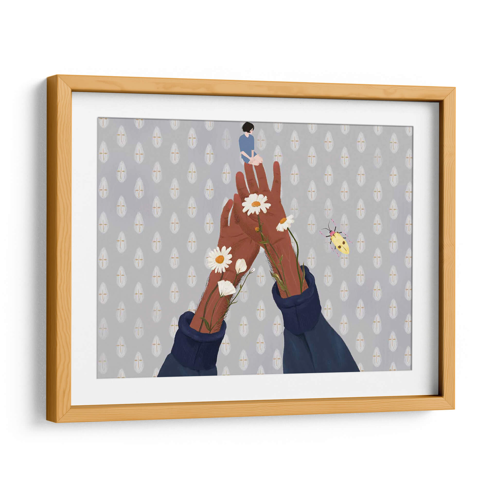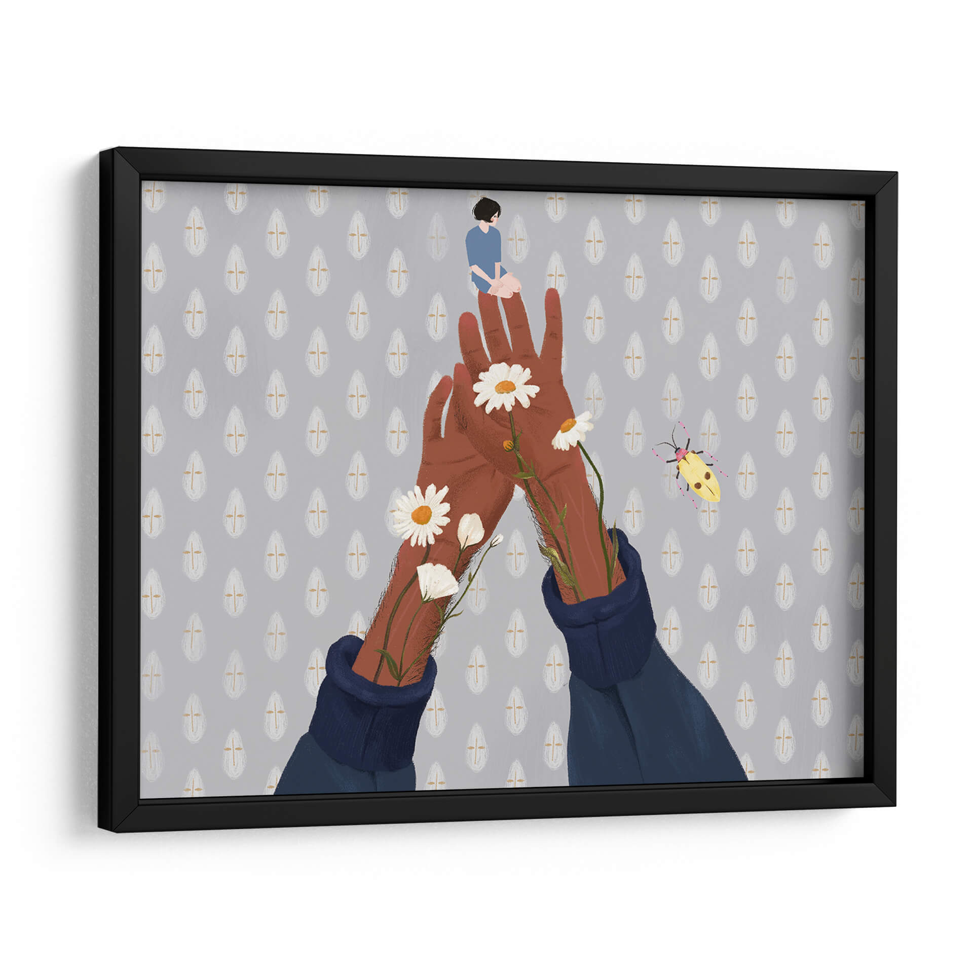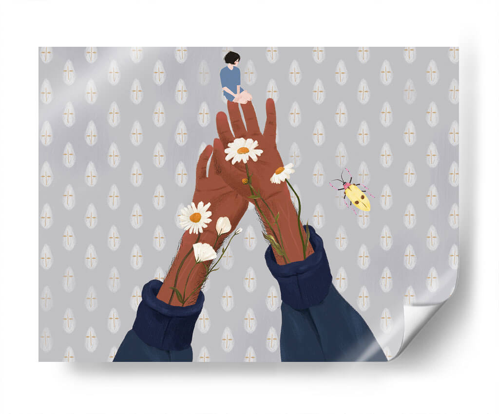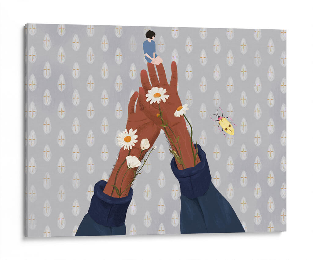 Sumérgete en la enigmática serenidad del cuadro decorativo "Jardín en mi", una obra que invita a la introspección y a la conexión con la naturaleza interior. La pieza presenta una delicada figura humana sentada en la palma de una mano extendida, rodeada por manos morenas que emergen de mangas de suéter azul oscuro. De estas manos brotan margaritas blancas y capullos, símbolos de pureza y crecimiento, añadiendo un toque de vitalidad a la escena. El fondo, texturizado con un patrón repetitivo de gotas grises y doradas, crea una atmósfera onírica y etérea, complementado por la presencia de un vibrante escarabajo amarillo que parece danzar en el aire. La paleta de colores, dominada por tonos grises, marrones y acentos de blanco y amarillo, evoca calma y contemplación, haciendo de esta obra un punto focal perfecto para espacios que buscan transmitir paz y un toque de ensueño. "Jardín en mi" es ideal para dormitorios, salas de estar o estudios donde se anhela un refugio visual y emocional. Su estilo único y su composición simbólica la convierten en una pieza de arte contemporáneo que estimula la imaginación y añade profundidad a cualquier decoración.