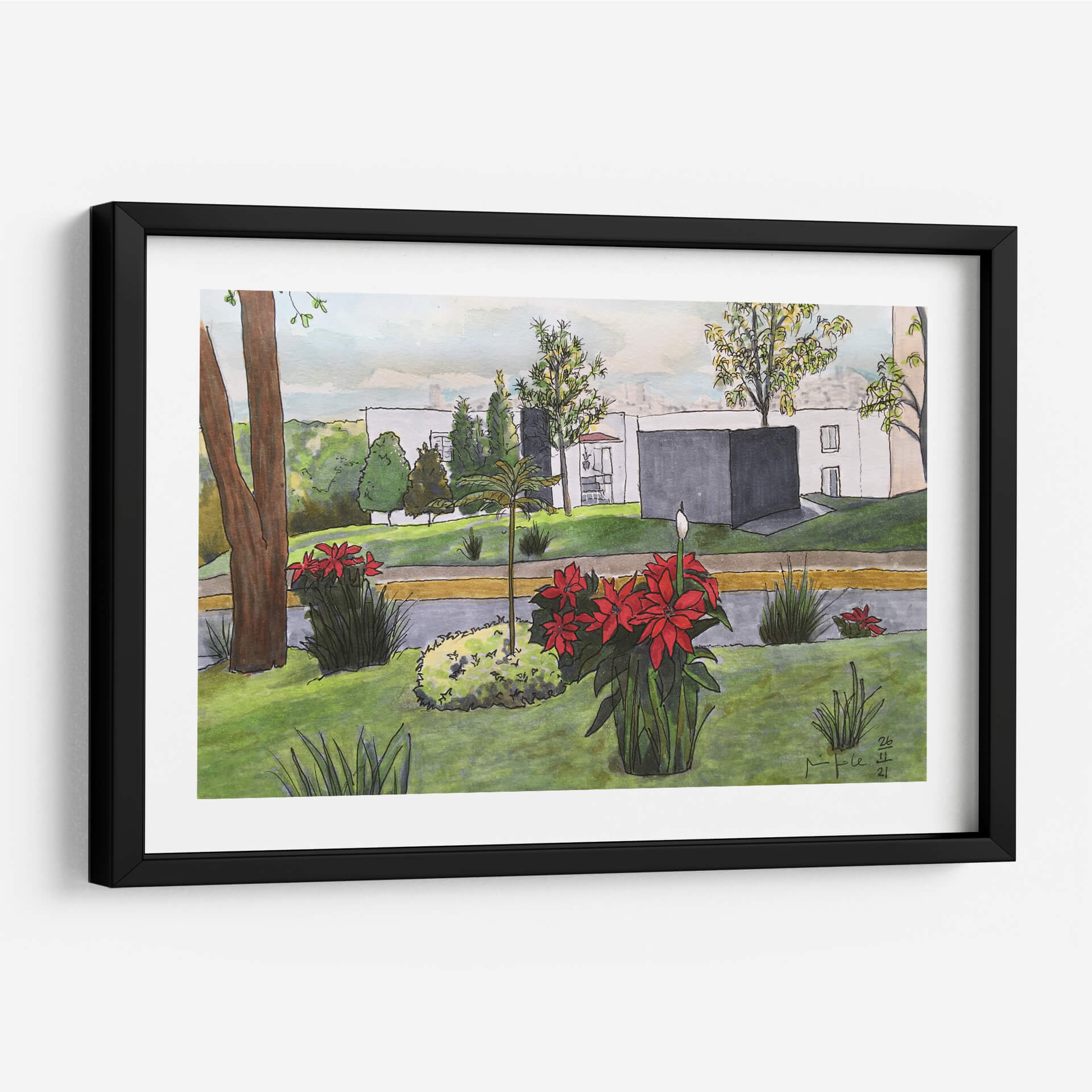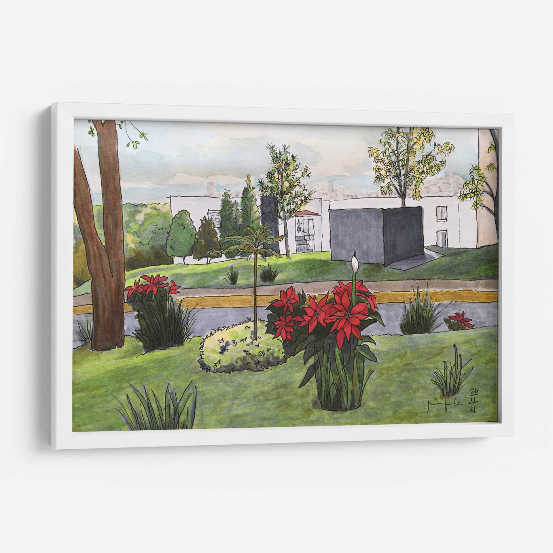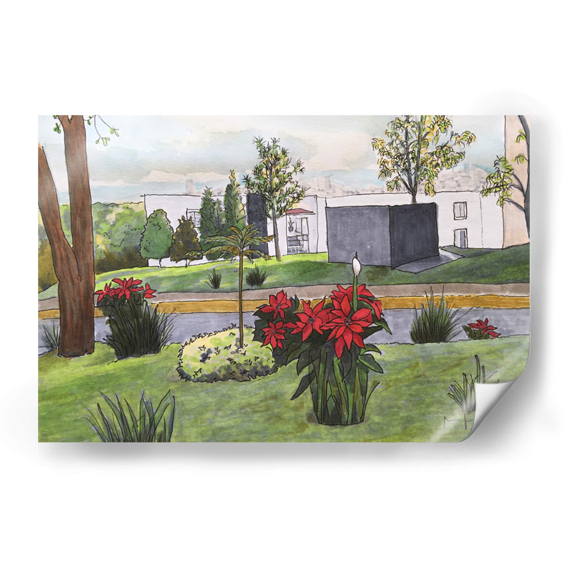 Sumérgete en la serenidad de "Noche Buenas", una cautivadora obra de arte que captura la esencia de un tranquilo paisaje urbano con un toque de naturaleza vibrante. Fitzmaurice nos presenta una escena dominada por la exuberante vegetación y las llamativas flores rojas, que contrastan armoniosamente con la arquitectura moderna de fondo. Los tonos verdes predominantes crean una atmósfera de calma y frescura, mientras que los acentos rojos de las poinsettias aportan un punto focal de energía y vida. La técnica, que combina trazos delicados con un uso expresivo del color, evoca una sensación de cotidianidad y belleza en los detalles. Este cuadro decorativo es ideal para infundir serenidad y un toque de color en cualquier espacio, ya sea una sala de estar, un estudio o un dormitorio. La composición equilibrada y la atmósfera pacífica invitan a la contemplación, convirtiendo esta pieza en una adición inspiradora para quienes buscan arte que conecte con la naturaleza y la vida urbana.