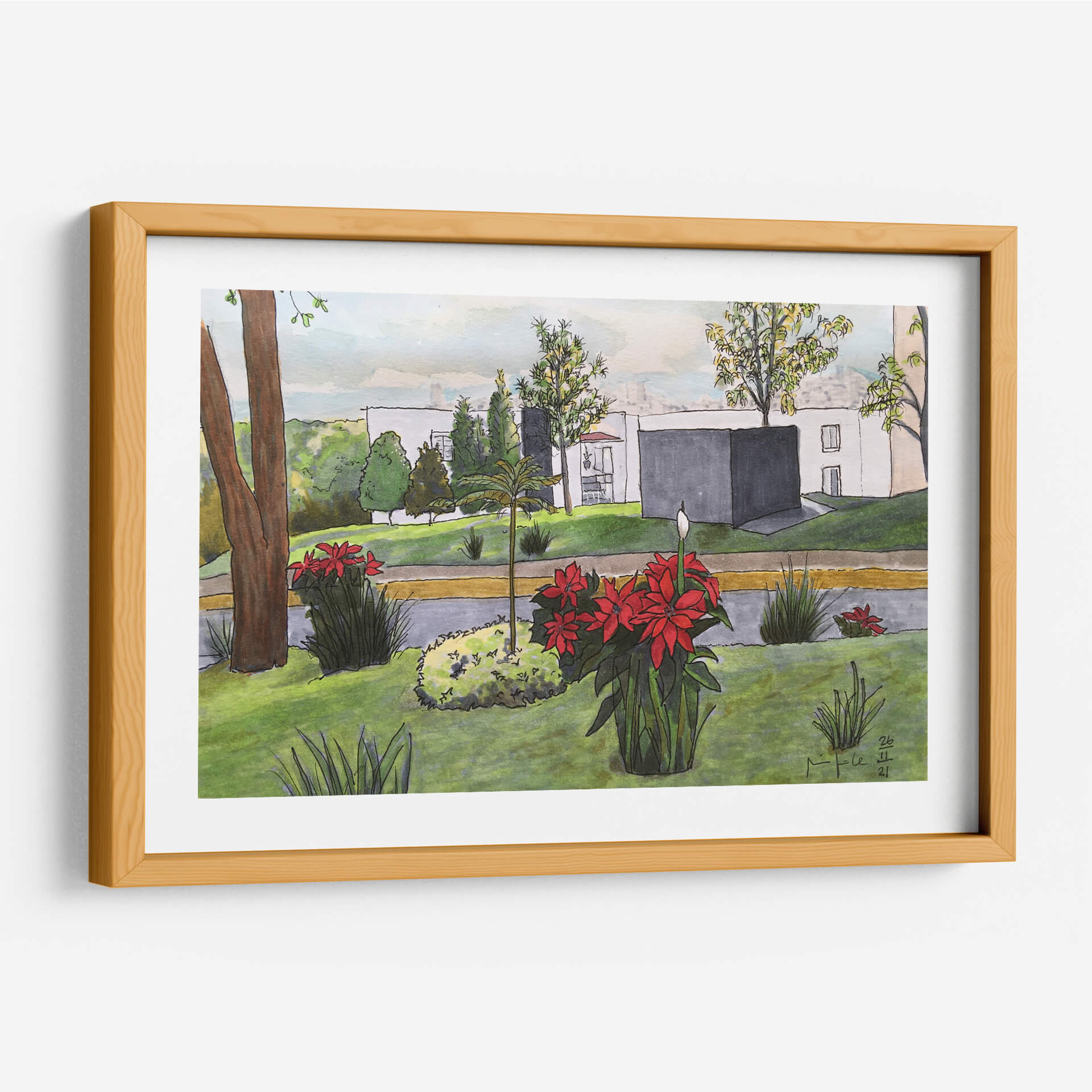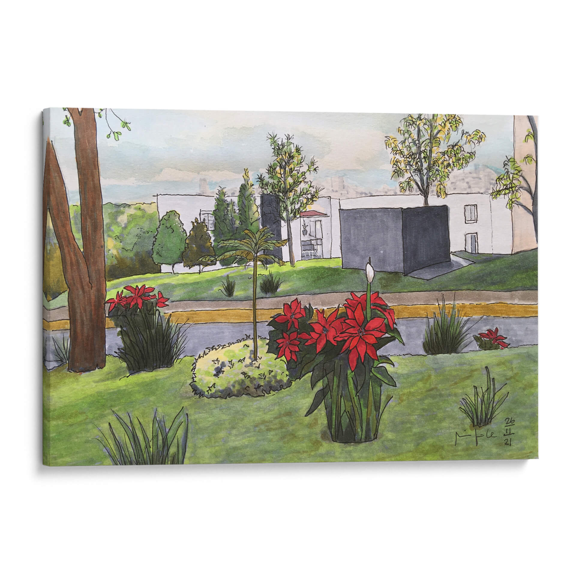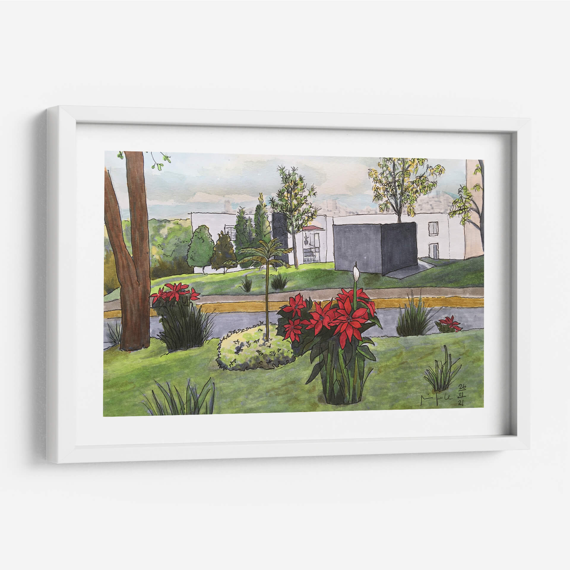 Sumérgete en la serenidad de "Noche Buenas", una cautivadora obra de arte que captura la esencia de un tranquilo paisaje urbano con un toque de naturaleza vibrante. Fitzmaurice nos presenta una escena dominada por la exuberante vegetación y las llamativas flores rojas, que contrastan armoniosamente con la arquitectura moderna de fondo. Los tonos verdes predominantes crean una atmósfera de calma y frescura, mientras que los acentos rojos de las poinsettias aportan un punto focal de energía y vida. La técnica, que combina trazos delicados con un uso expresivo del color, evoca una sensación de cotidianidad y belleza en los detalles. Este cuadro decorativo es ideal para infundir serenidad y un toque de color en cualquier espacio, ya sea una sala de estar, un estudio o un dormitorio. La composición equilibrada y la atmósfera pacífica invitan a la contemplación, convirtiendo esta pieza en una adición inspiradora para quienes buscan arte que conecte con la naturaleza y la vida urbana.