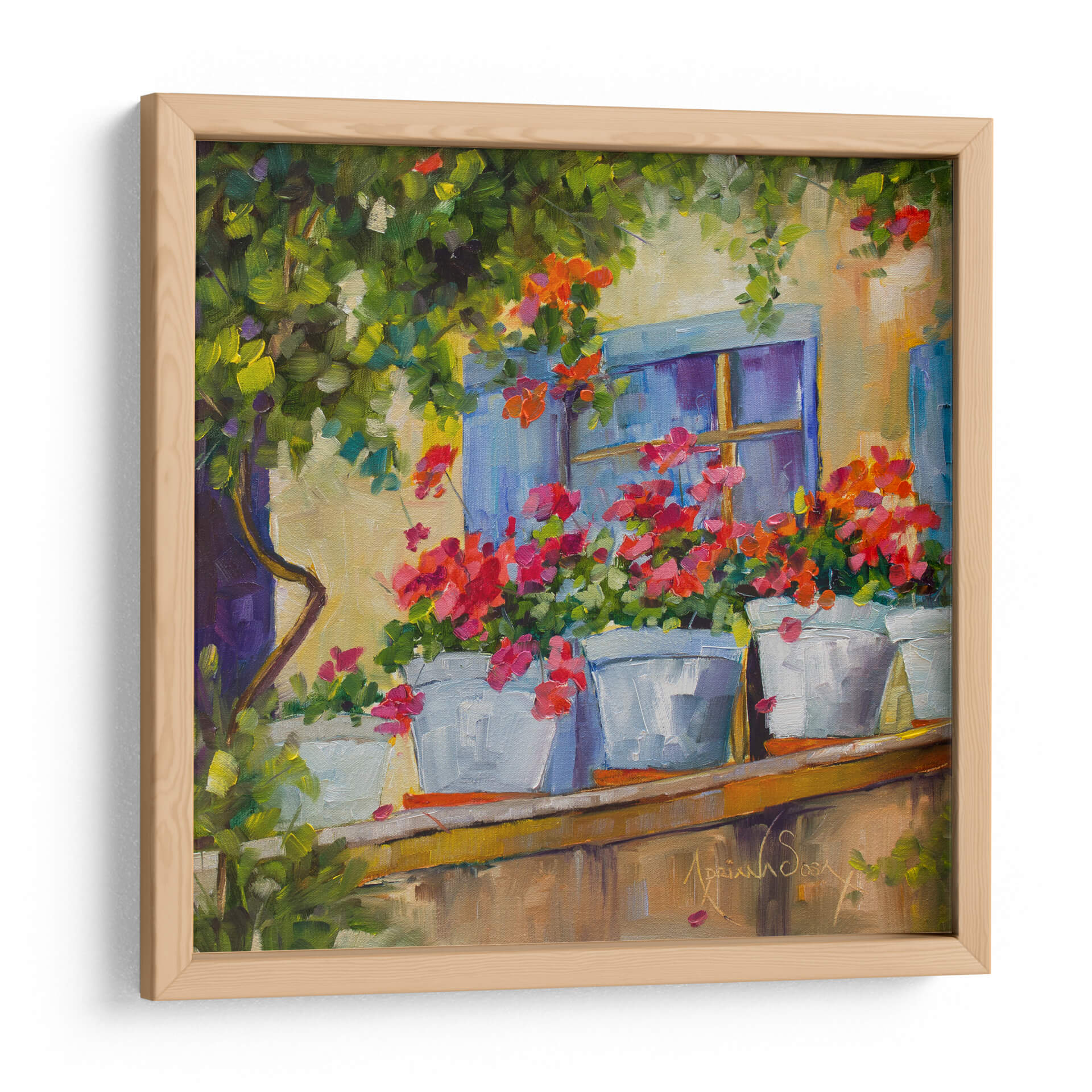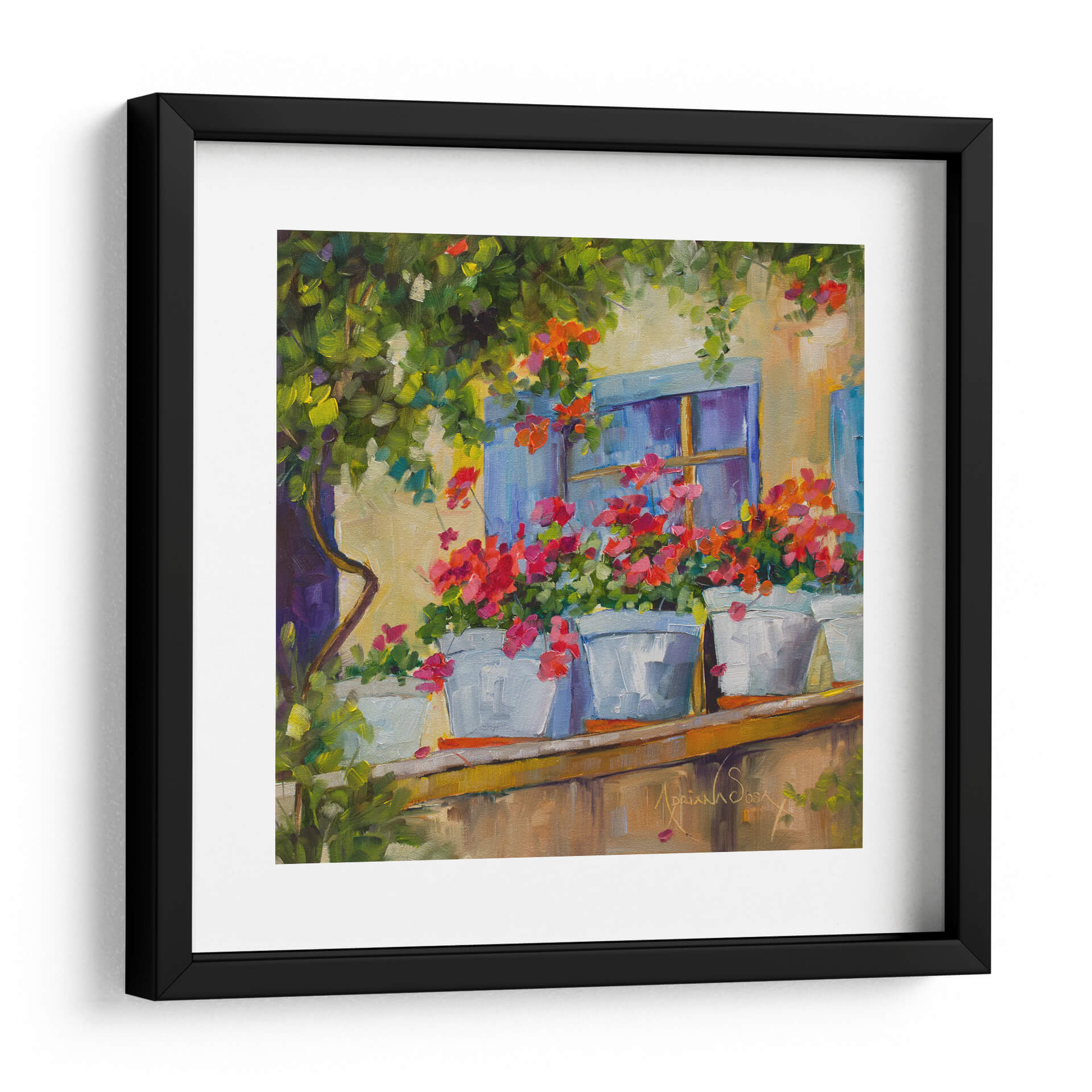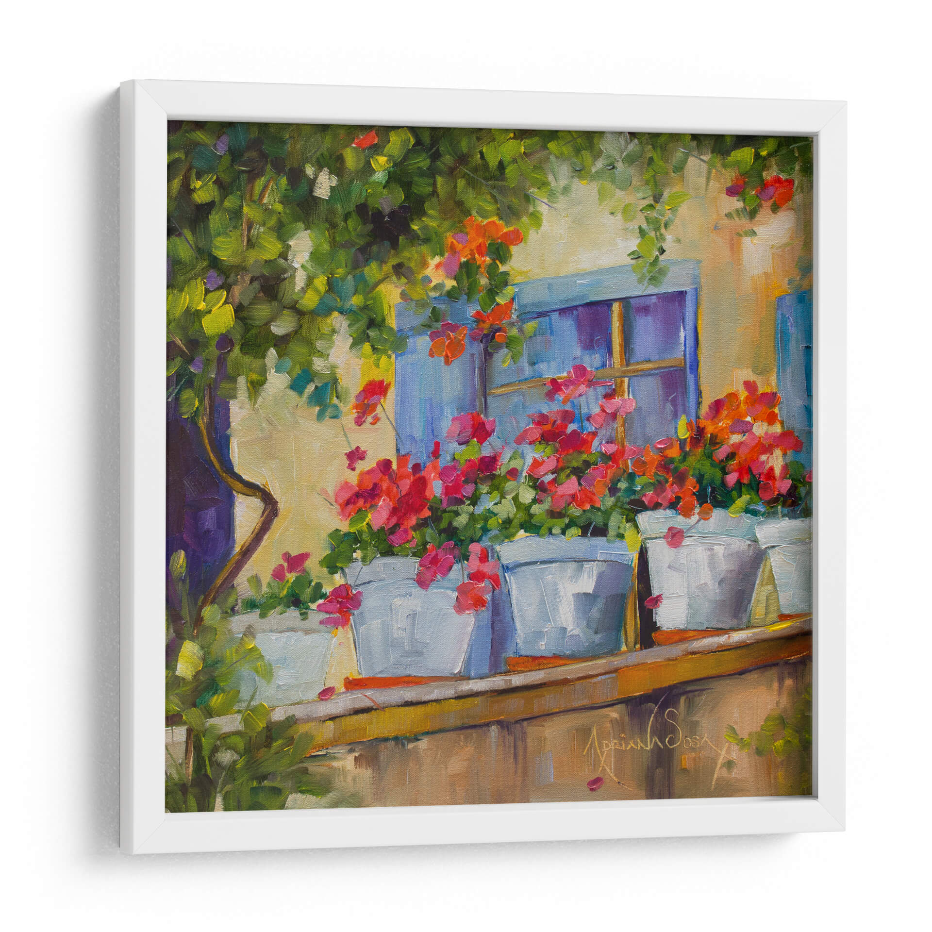 Sumérgete en la serenidad y el encanto de "Por la Ventana", una cautivadora obra de arte de Adriana Sosa. Este cuadro decorativo te transporta a un balcón bañado por el sol, donde vibrantes geranios en macetas blancas se asoman con alegría. Los tonos cálidos de la fachada se entrelazan con el azul profundo de la ventana y el exuberante verdor de la vegetación circundante, creando una paleta de colores rica y armoniosa. El estilo impresionista de Sosa se manifiesta en pinceladas sueltas y expresivas que capturan la luz y la atmósfera de un momento idílico. Cada detalle, desde la textura de las flores hasta la suavidad de la luz, invita a la contemplación y a la tranquilidad. Este cuadro es ideal para añadir un toque de color y vida a cualquier espacio, evocando la sensación de un refugio pacífico y lleno de belleza natural. Perfecto para salones, dormitorios o cualquier rincón que busque inspiración y una conexión con la naturaleza.