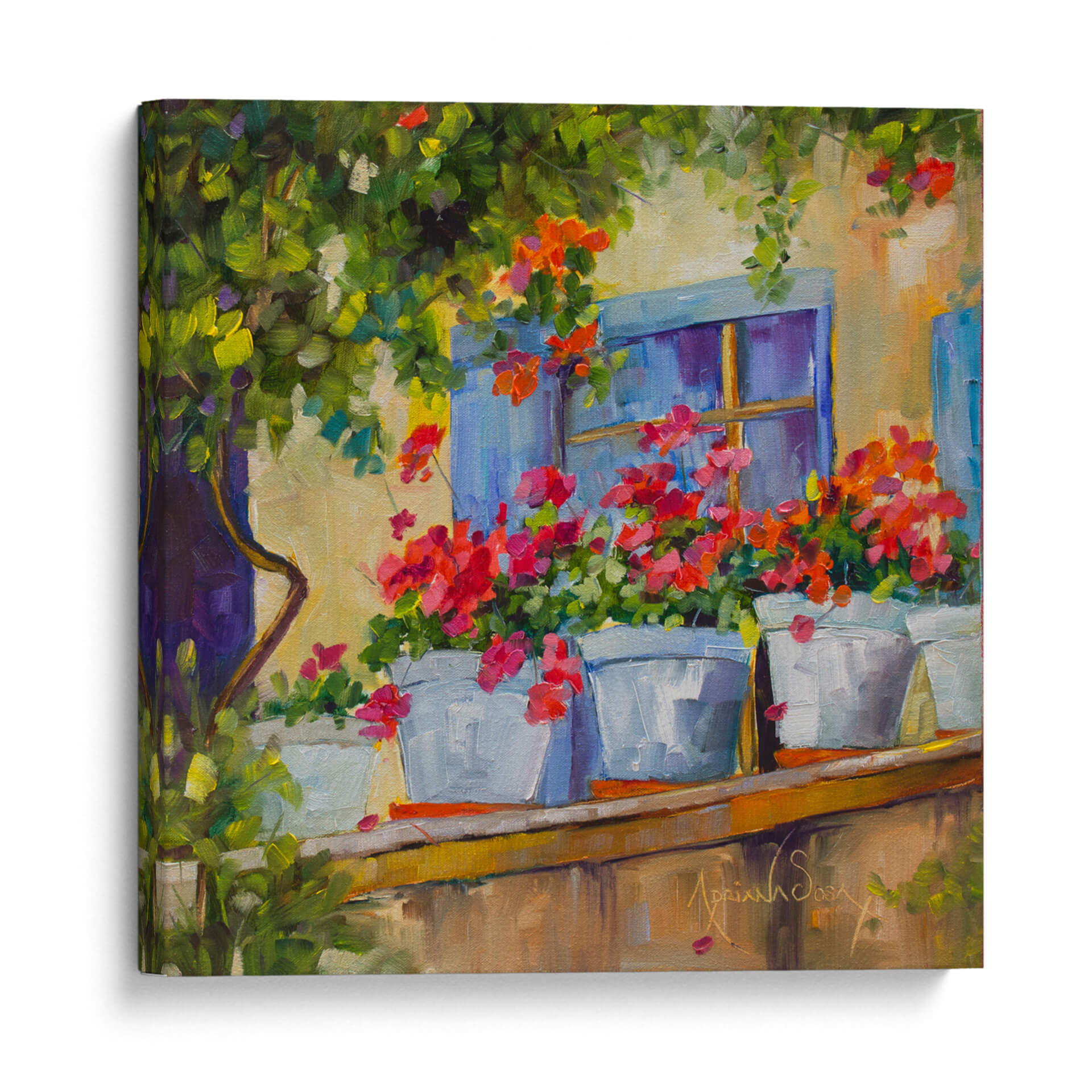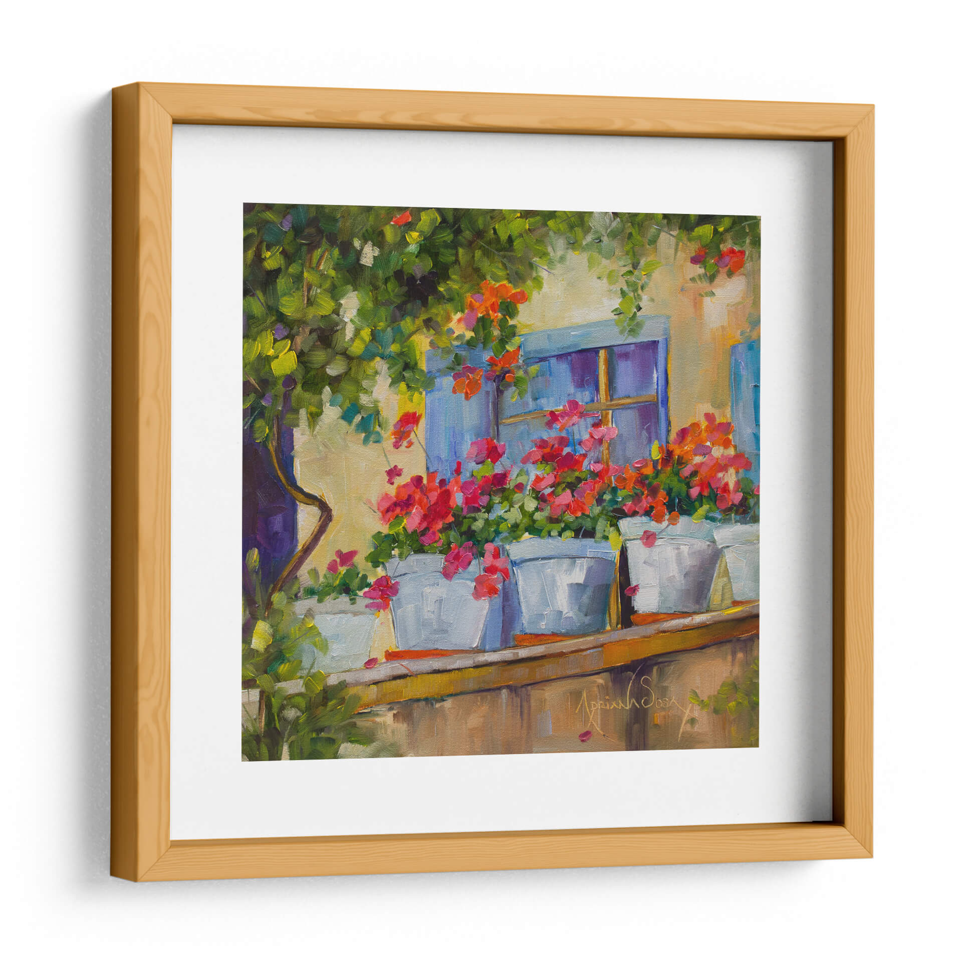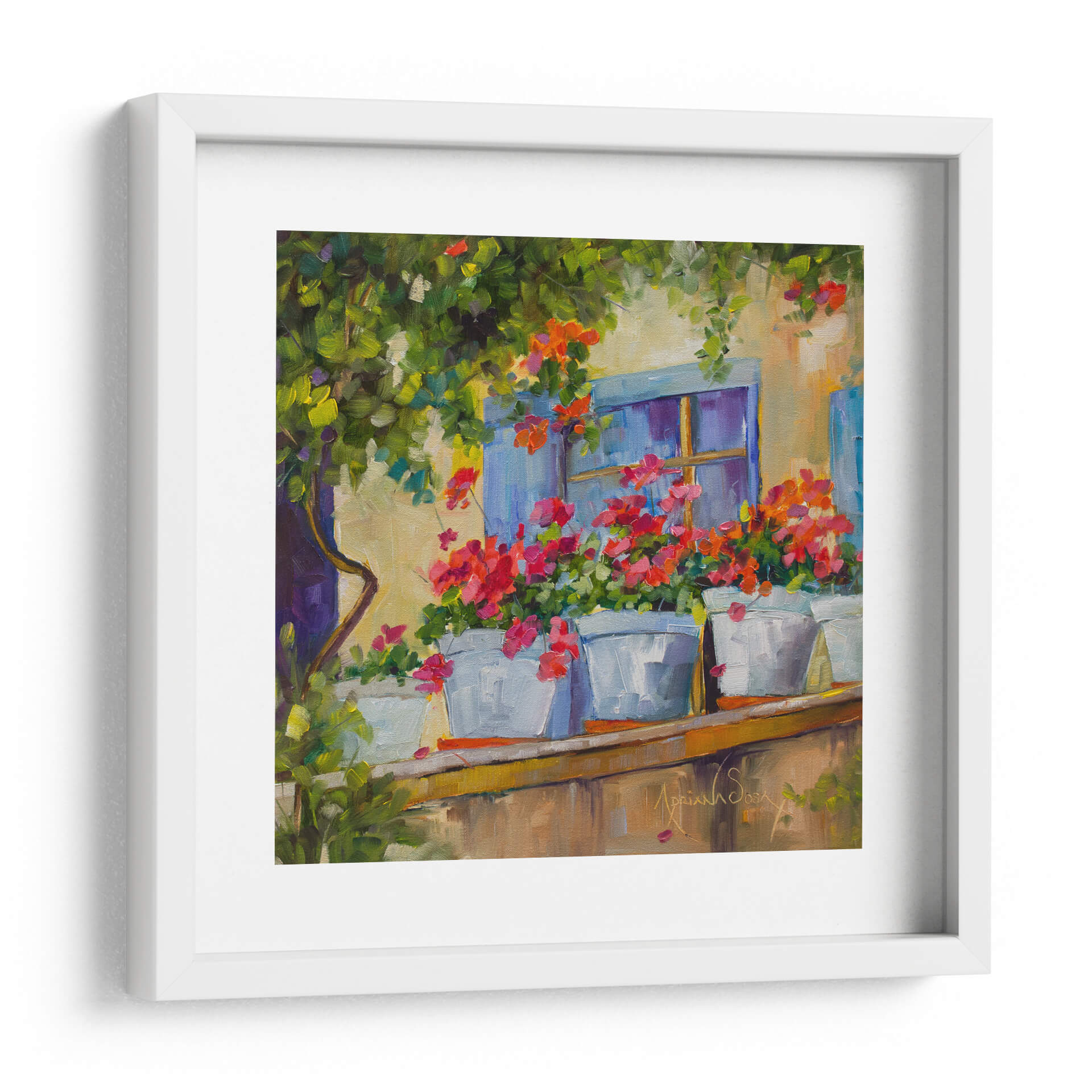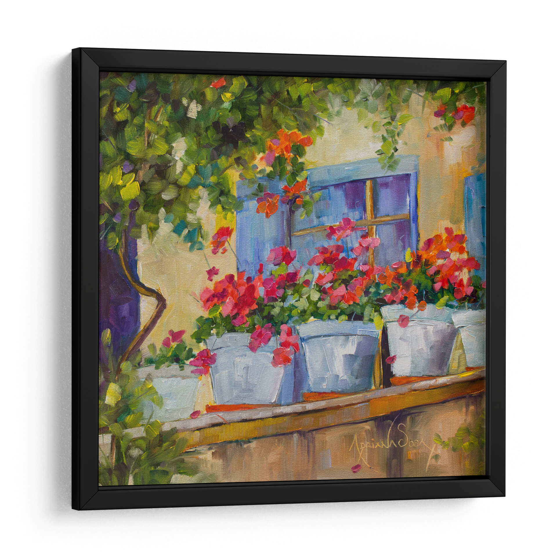 Sumérgete en la serenidad y el encanto de "Por la Ventana", una cautivadora obra de arte de Adriana Sosa. Este cuadro decorativo te transporta a un balcón bañado por el sol, donde vibrantes geranios en macetas blancas se asoman con alegría. Los tonos cálidos de la fachada se entrelazan con el azul profundo de la ventana y el exuberante verdor de la vegetación circundante, creando una paleta de colores rica y armoniosa. El estilo impresionista de Sosa se manifiesta en pinceladas sueltas y expresivas que capturan la luz y la atmósfera de un momento idílico. Cada detalle, desde la textura de las flores hasta la suavidad de la luz, invita a la contemplación y a la tranquilidad. Este cuadro es ideal para añadir un toque de color y vida a cualquier espacio, evocando la sensación de un refugio pacífico y lleno de belleza natural. Perfecto para salones, dormitorios o cualquier rincón que busque inspiración y una conexión con la naturaleza.