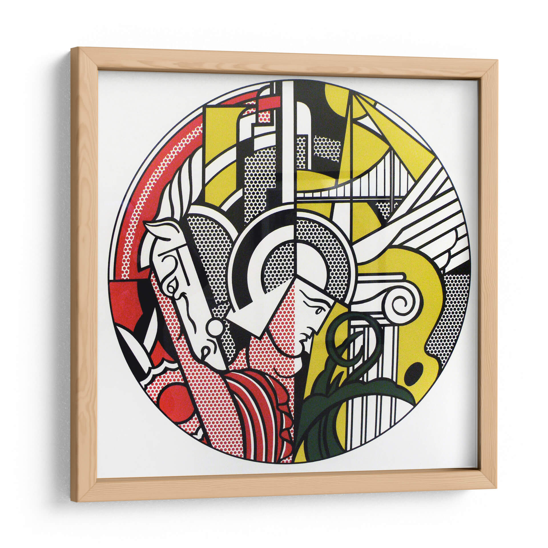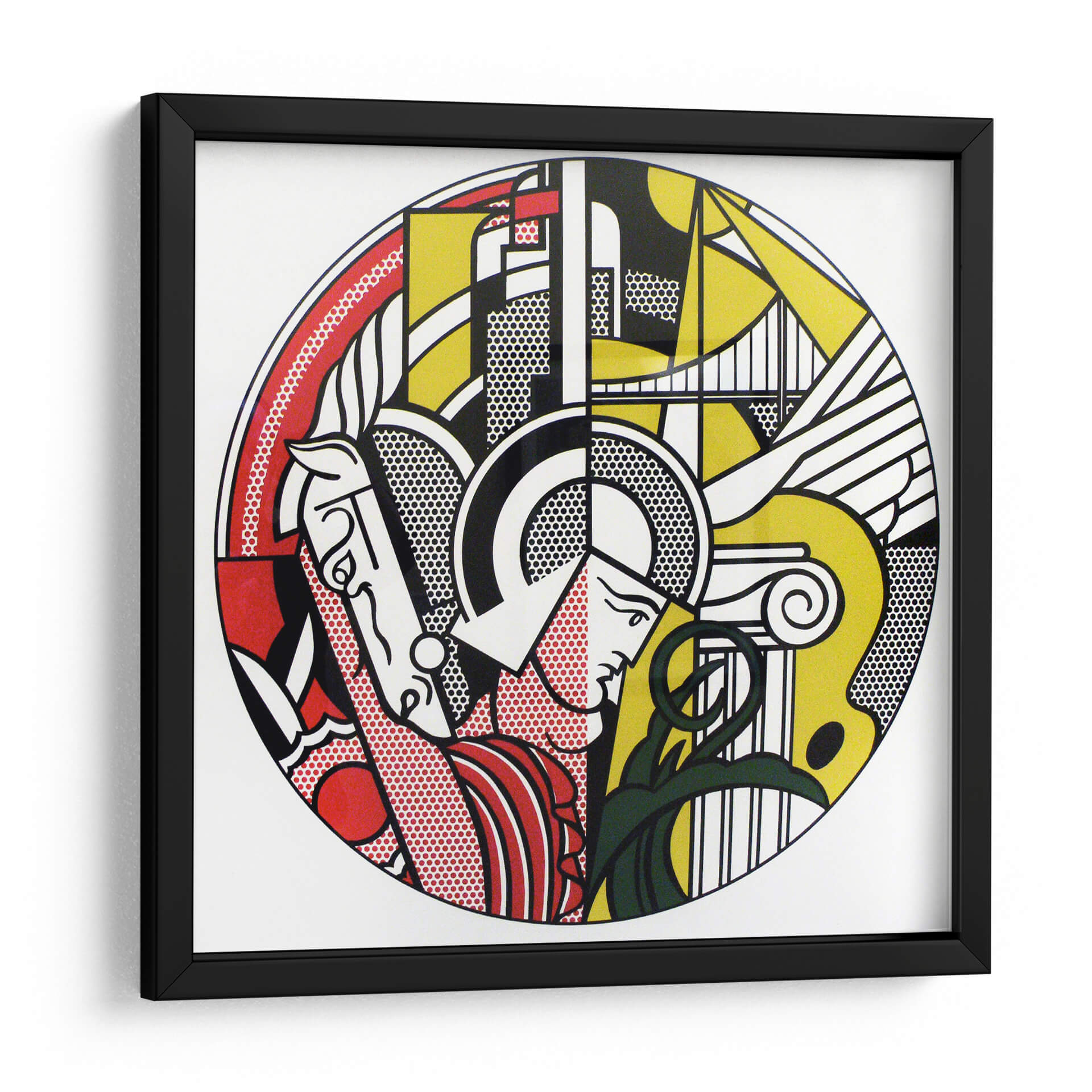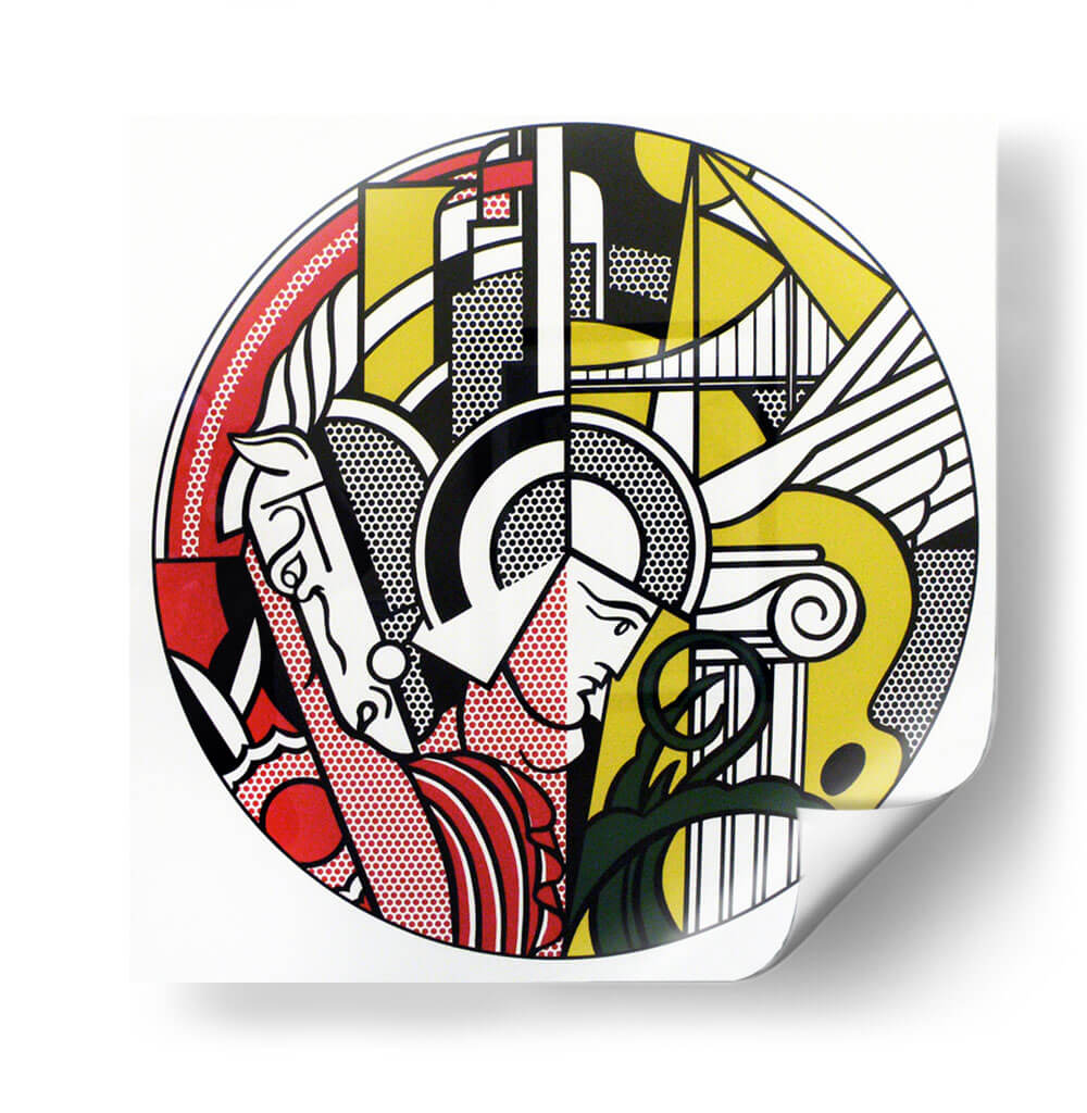 Sumérgete en la vibrante energía del arte pop con esta impactante obra titulada "Gladiador Pop Art". Esta pieza cautivadora presenta una audaz interpretación de una figura clásica, fusionando elementos icónicos de la historia con la estética moderna del pop art. La composición circular se despliega con una paleta de colores primarios audaces, predominantemente rojo, amarillo y negro, acentuados con el distintivo uso de puntos Ben-Day que aportan textura y un aire retro. Observa la dinámica representación de un gladiador, evocando fuerza y un espíritu indomable, entrelazado con detalles arquitectónicos que sugieren un trasfondo clásico y a la vez futurista. El estilo distintivo, que recuerda a los cómics y la publicidad, infunde a la obra una sensación de nostalgia y modernidad simultáneamente. Ideal para aquellos que buscan añadir un toque de audacia y conversación a su sala de estar, estudio u oficina, este lienzo es una declaración de estilo que fusiona el arte histórico con la cultura contemporánea. Su diseño llamativo y su ejecución impecable lo convierten en el punto focal perfecto para cualquier espacio que aspire a la originalidad y el impacto visual.