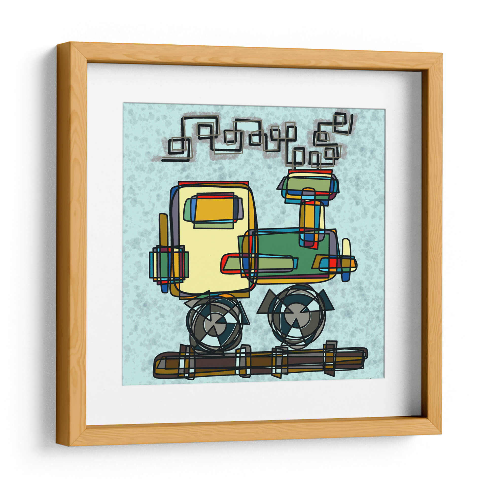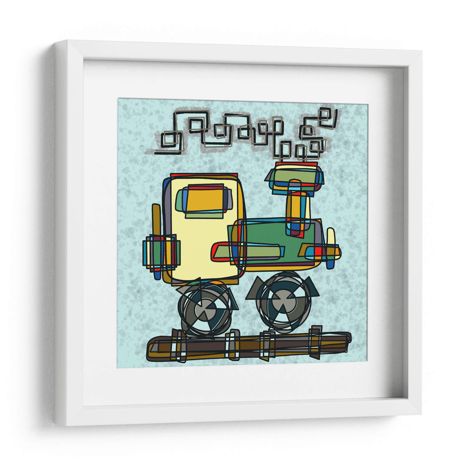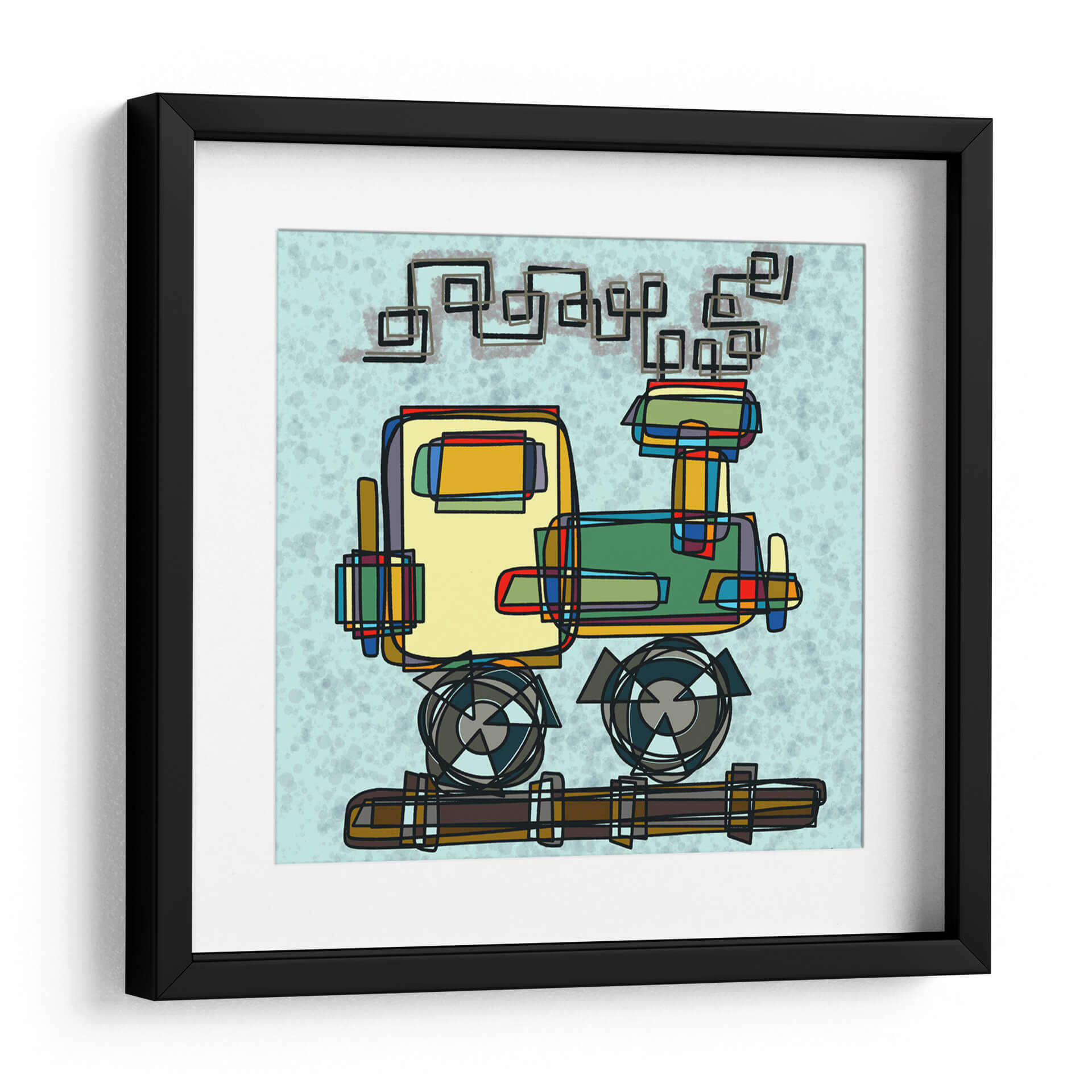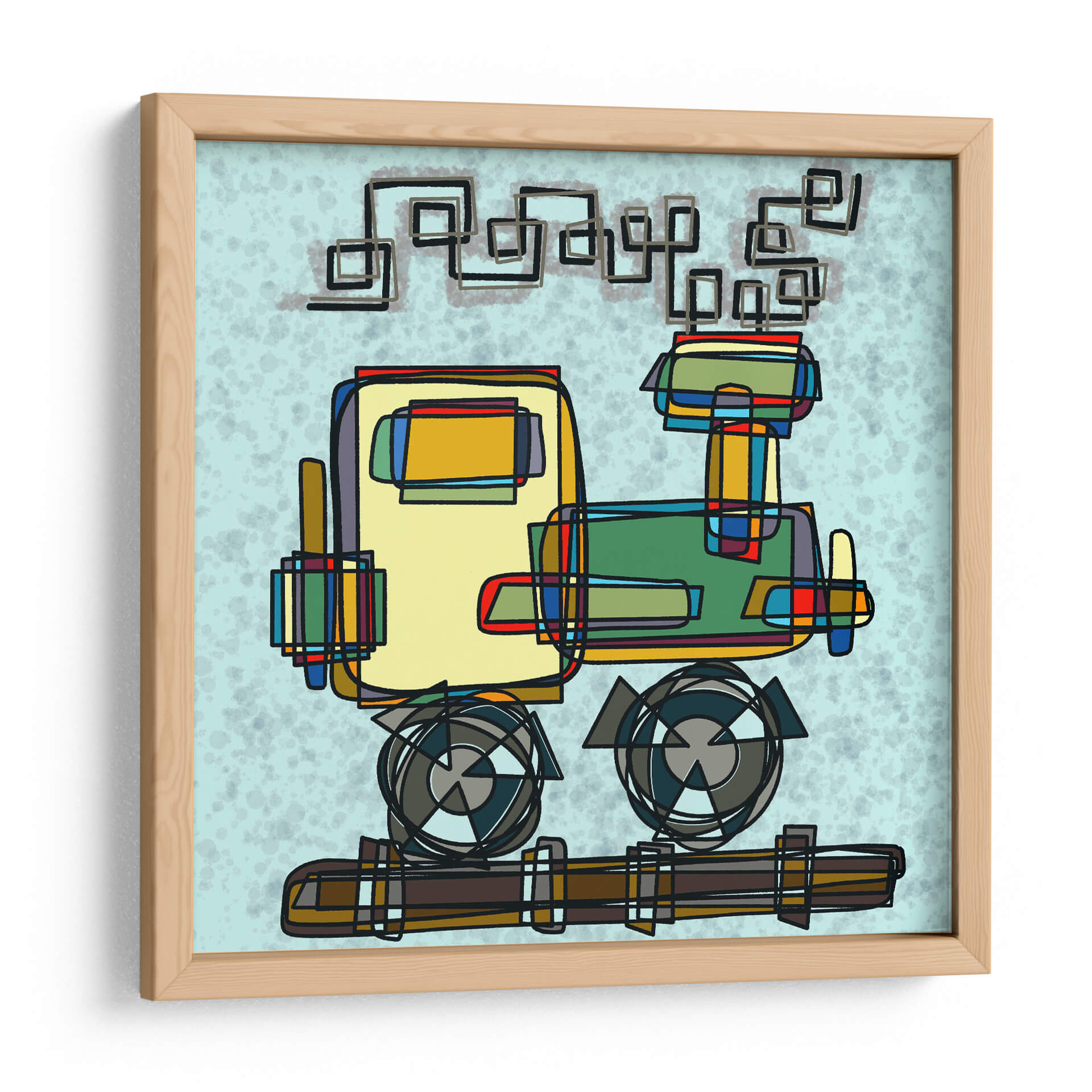 Captura la imaginación con este vibrante cuadro decorativo de 'Locomotora', una obra de arte contemporáneo de Gina Villalobos. La pieza presenta una interpretación audaz y geométrica de una locomotora, utilizando líneas definidas y bloques de color que evocan un estilo moderno y gráfico. La paleta de colores, dominada por tonos amarillos, verdes, rojos y azules, crea un contraste dinámico sobre un fondo de cielo celeste con textura sutil, aportando energía y un toque lúdico al espacio. La composición abstracta invita a la interpretación, fusionando elementos mecánicos con una estética casi infantil, lo que lo convierte en una pieza única para añadir personalidad a cualquier habitación. Ideal para espacios que buscan un acento de color y un punto de conversación, este cuadro es perfecto para salas de estar modernas, estudios creativos u oficinas que deseen inspirar creatividad y movimiento. Su estilo gráfico lo hace versátil, combinando bien con decoraciones minimalistas o eclécticas.