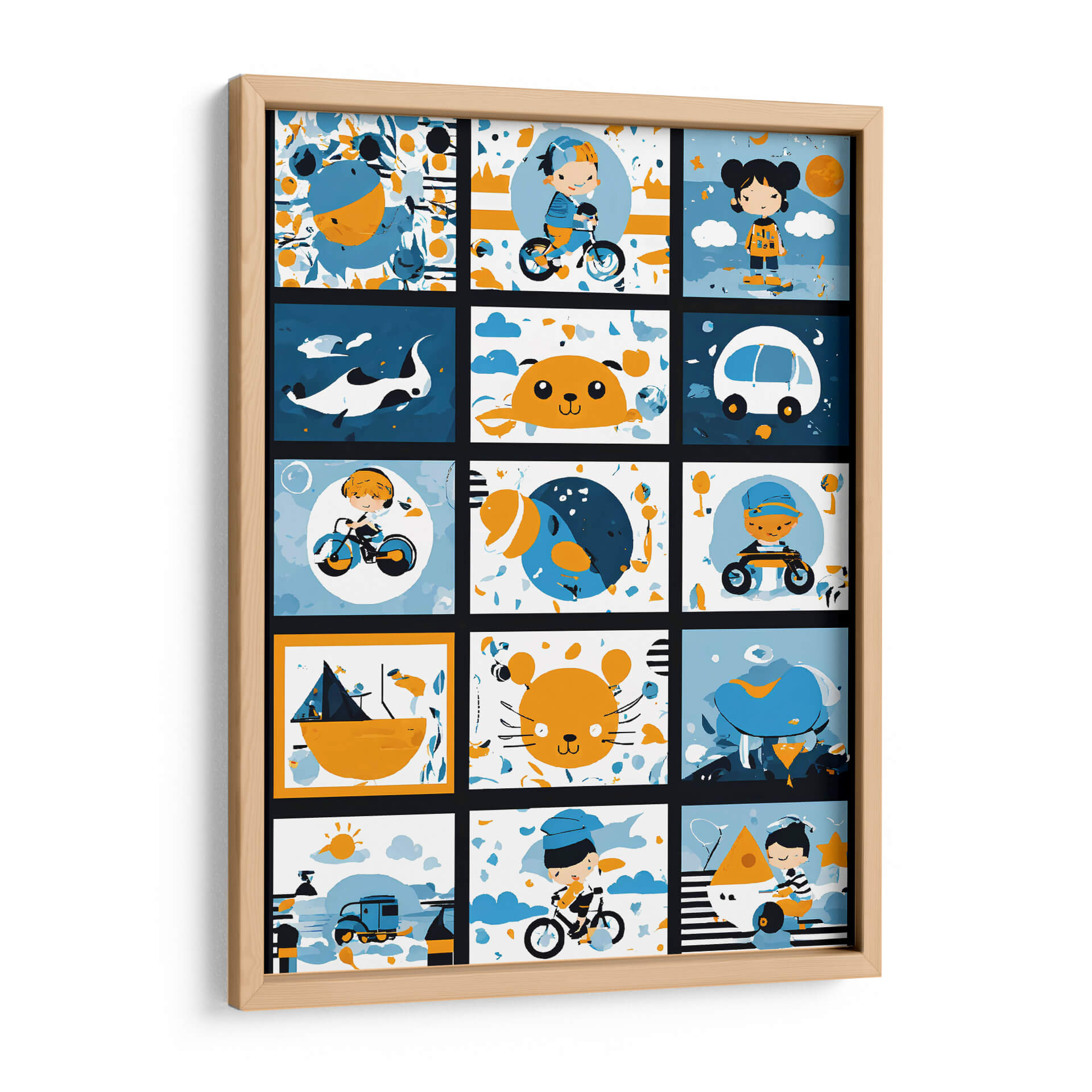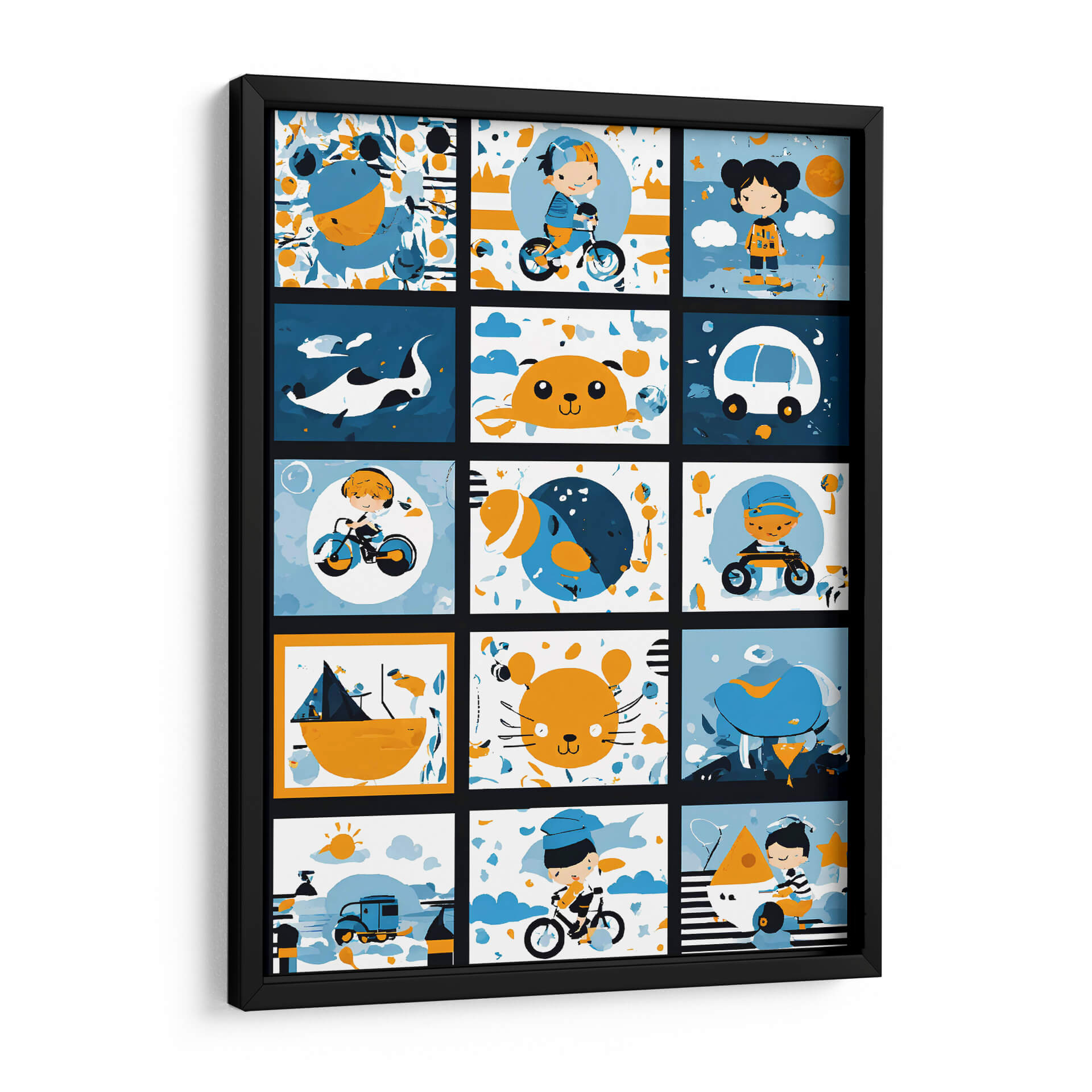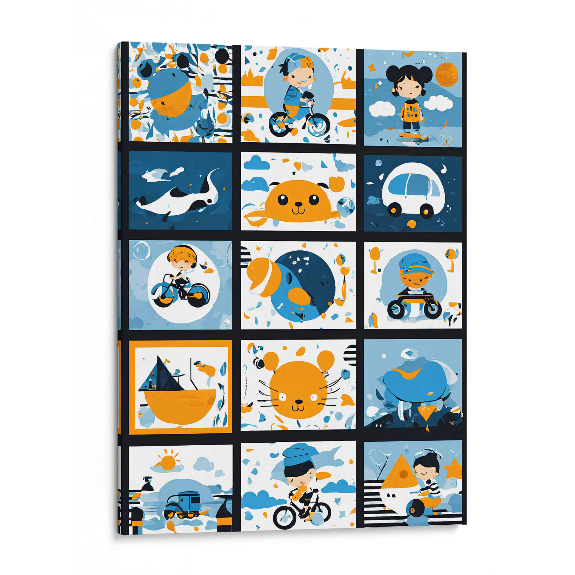 Sumérgete en un mundo de imaginación y alegría con 'Niños en Acción', una obra de arte digital vibrante y cautivadora del artista DEA Digital Esoteric Art. Esta pieza única se presenta como un collage de viñetas, cada una capturando un momento de inocencia y movimiento. Predominan los tonos azules y naranjas, creando un contraste dinámico que evoca tanto la tranquilidad del cielo y el mar como la energía del sol y la aventura. Los personajes, representados con un estilo gráfico y simpático, transmiten una sensación de optimismo y vitalidad. Las escenas de niños montando bicicleta, jugando y explorando, junto a elementos como coches y animales fantásticos, invitan a la reflexión sobre la infancia y la exploración del mundo. Su composición modular la hace versátil, ideal para añadir un toque lúdico y moderno a cualquier habitación infantil, sala de estar o espacio creativo. 'Niños en Acción' no es solo un cuadro decorativo, es una ventana a la imaginación que estimula la conversación y llena de color y vida tu hogar u oficina, convirtiéndose en un punto focal lleno de encanto y positividad. Es la elección perfecta para quienes buscan arte contemporáneo con alma.