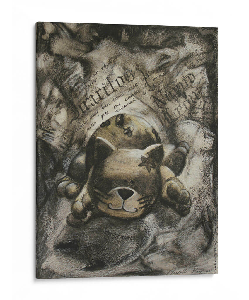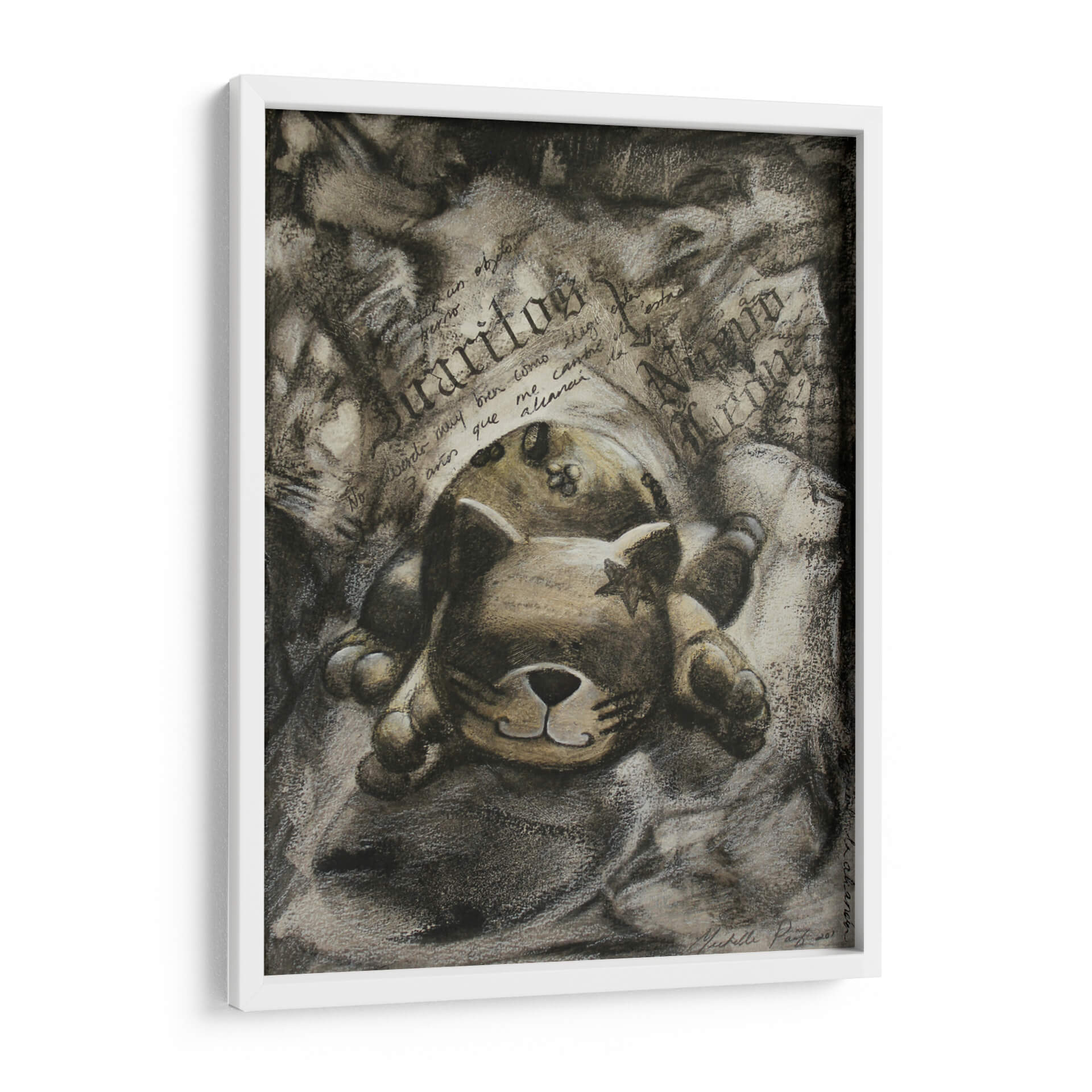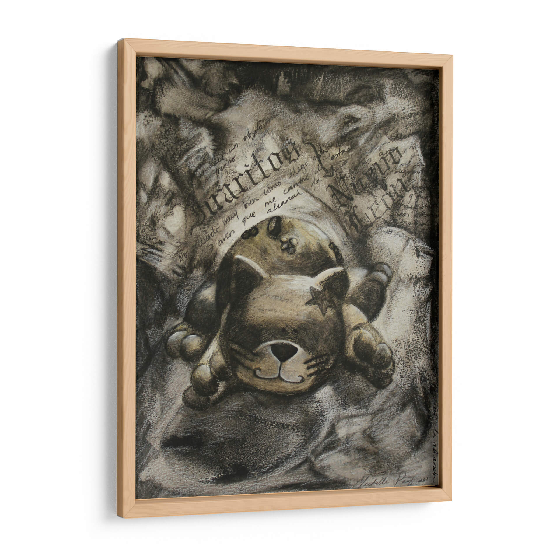 Sumérgete en la ternura y la nostalgia con "Serie La Family", una obra de arte original de Michelle Páez que captura la esencia de la infancia y la calidez del hogar. Esta pieza, ejecutada con una técnica que evoca el dibujo a mano alzada y la textura del carboncillo o pastel, presenta una figura central que recuerda a un tierno osito o gato de peluche, con un aire soñador y reconfortante. La paleta de colores se centra en tonos tierra, ocres y grises, creando una atmósfera íntima y melancólica, pero a la vez acogedora. El fondo texturizado, salpicado de fragmentos de escritura caligráfica, añade una capa de profundidad y misterio, sugiriendo recuerdos o pensamientos fugaces. "Serie La Family" es ideal para añadir un toque de dulzura y calidez a cualquier habitación, desde un dormitorio infantil hasta una acogedora sala de estar o un estudio personal. Es una invitación a la reflexión sobre los lazos afectivos y los tesoros de la memoria. Este cuadro decorativo contemporáneo es perfecto para quienes buscan arte con alma, piezas que hablen de emociones y conecten con el espectador a un nivel personal, aportando un elemento único y emotivo a la decoración de interiores.