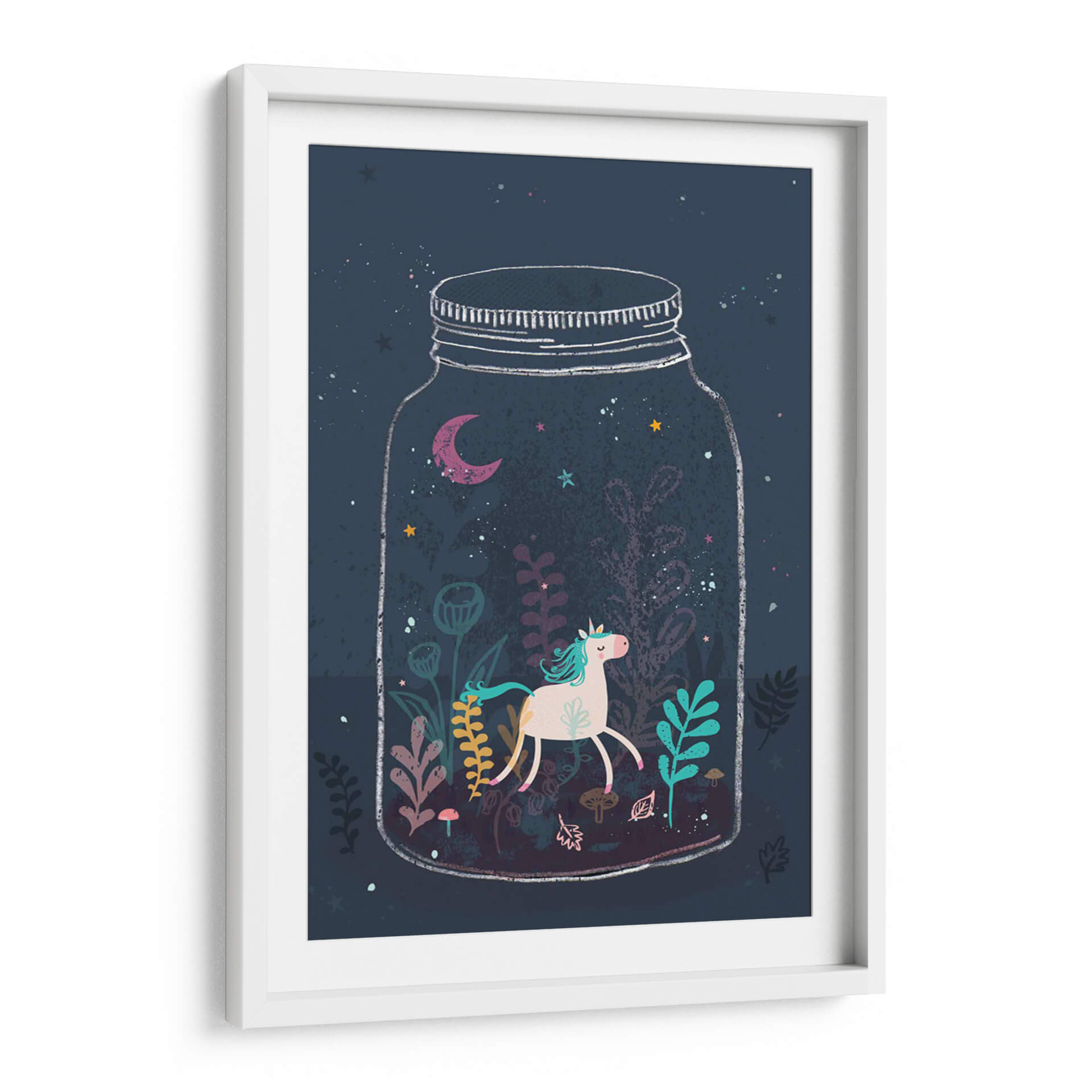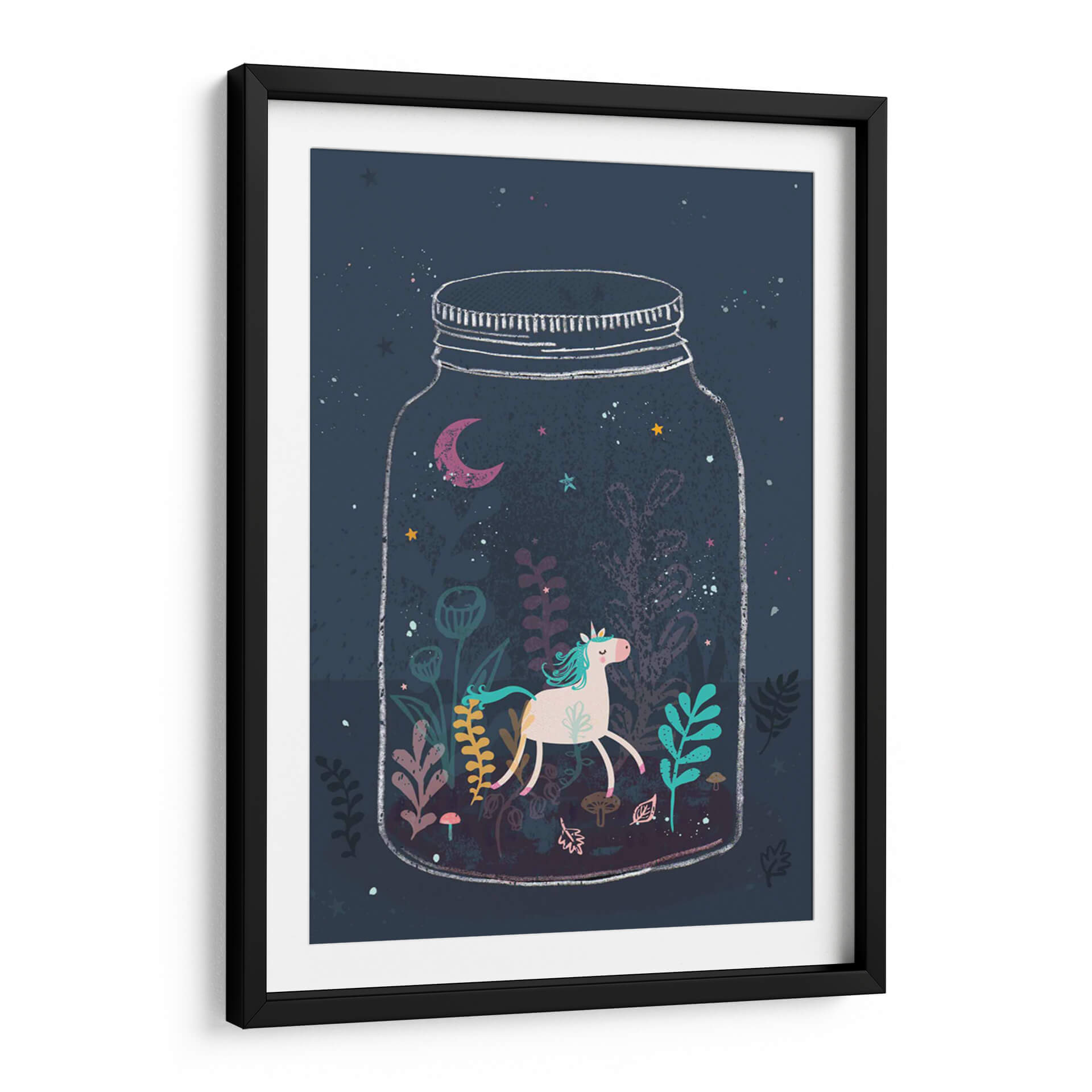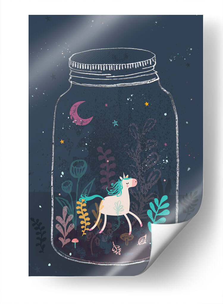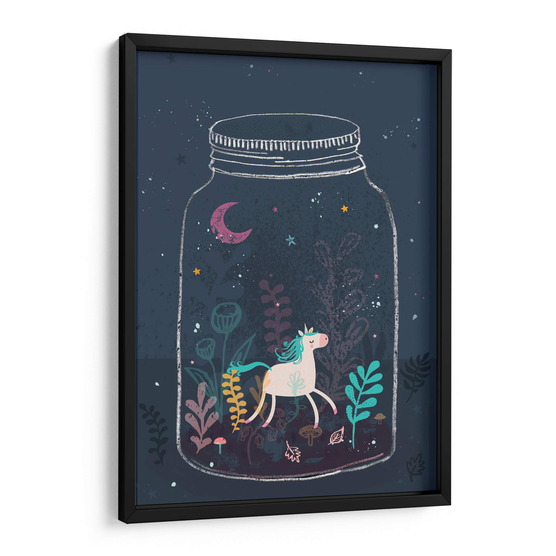 Sumérgete en un mundo de fantasía con este encantador cuadro decorativo "Unicornio de frasquito". La obra presenta un tierno unicornio blanco con crines turquesas y rosadas, corriendo en un entorno mágico contenido dentro de un frasco de vidrio. Un cielo nocturno estrellado, una luna creciente púrpura y una variedad de plantas fantásticas, hongos y musgo conforman este micro-universo. La paleta de colores, dominada por tonos oscuros de azul noche, se complementa con toques vibrantes de rosa, púrpura, turquesa y amarillo, creando una atmósfera etérea y cautivadora. El estilo ilustrativo, con un toque de acuarela y detalles sutiles, evoca una sensación de maravilla y ensueño. Este cuadro es ideal para añadir un toque de magia y serenidad a la habitación de un niño, una guardería, o para cualquier espacio que busque infundir alegría y fantasía. Es una pieza decorativa que invita a la imaginación y se convierte en un punto focal lleno de encanto y originalidad.