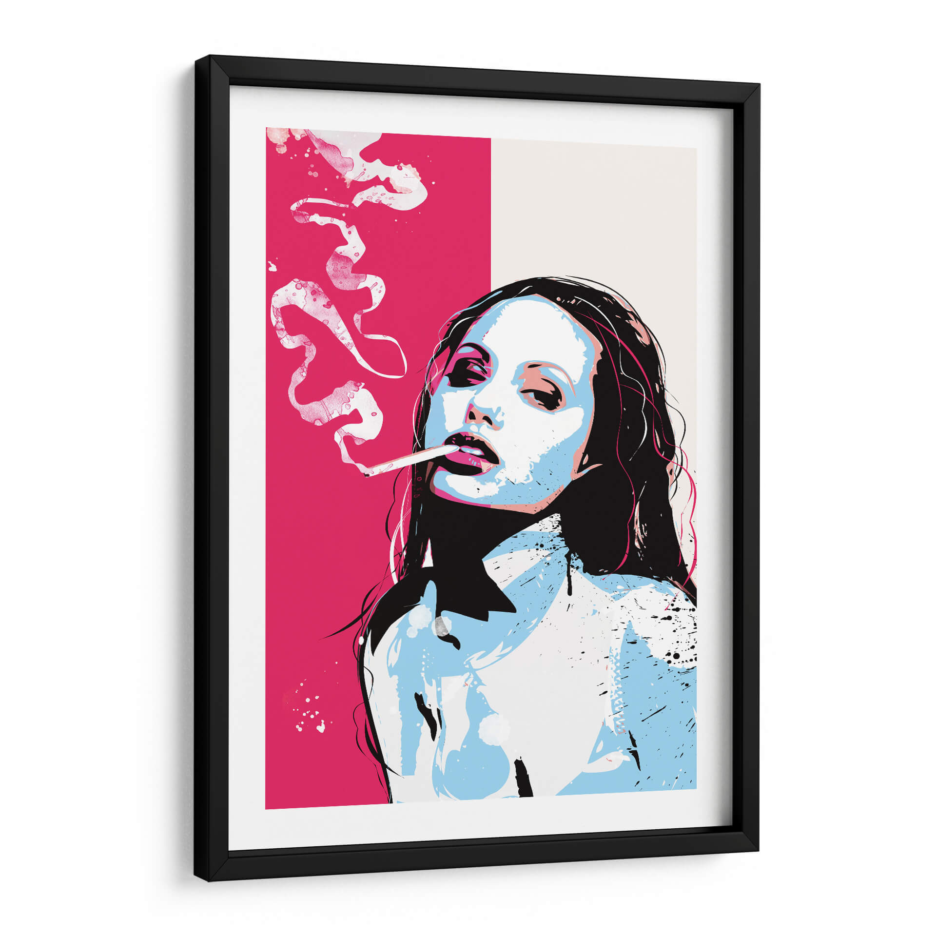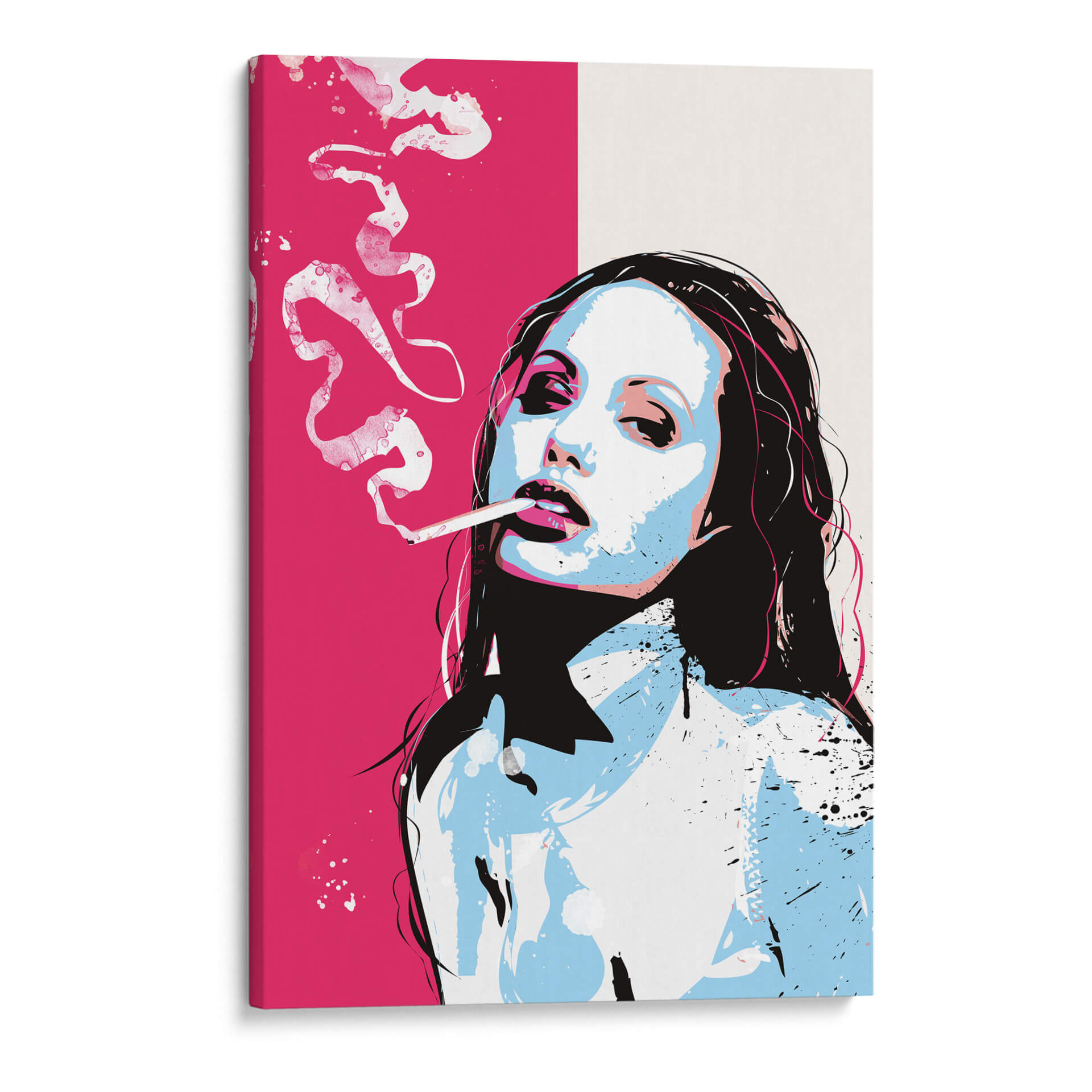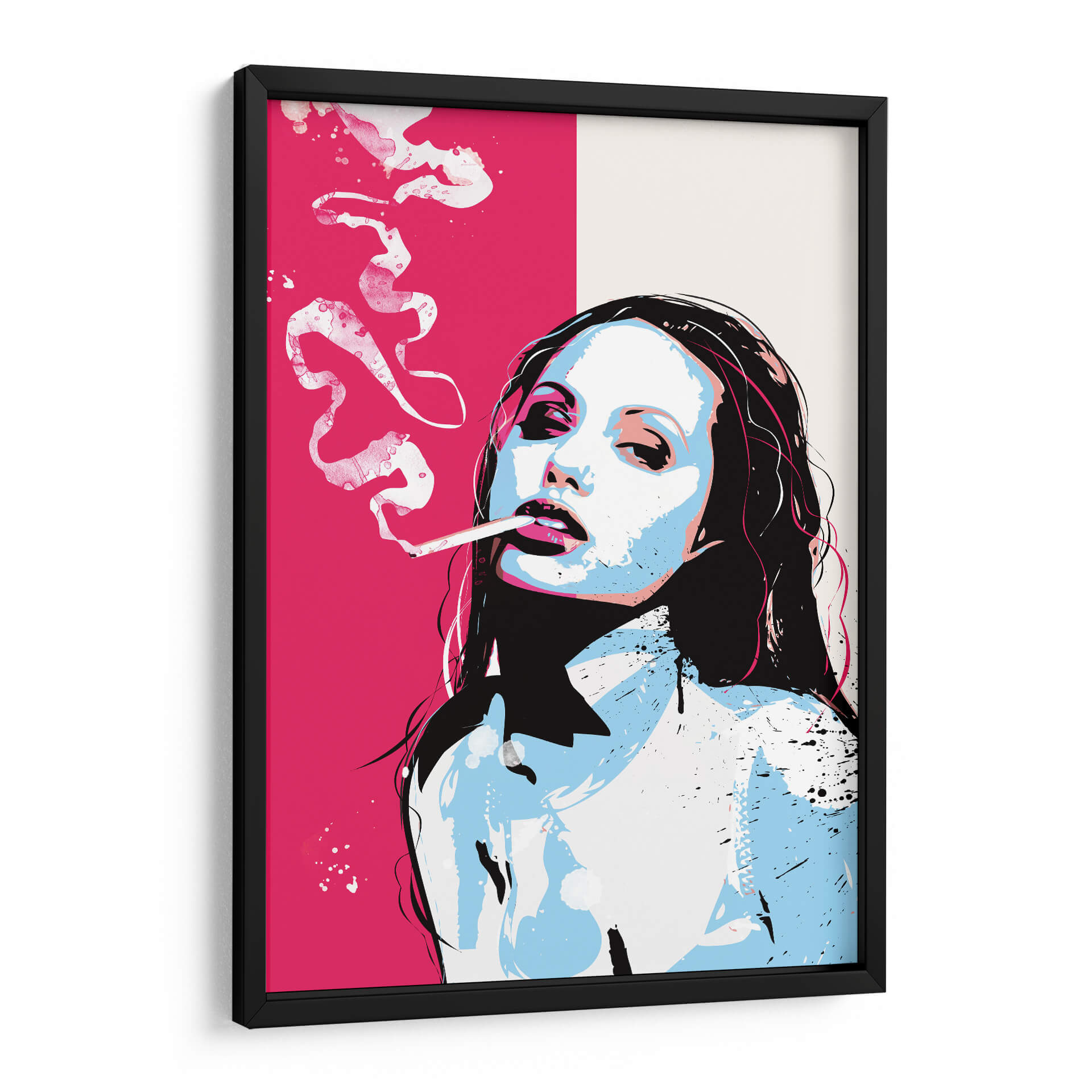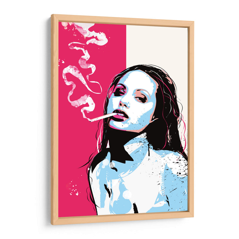 Captura la esencia del arte pop con este impactante cuadro decorativo que presenta un retrato estilizado de una mujer fumando. La obra se caracteriza por su audaz paleta de colores, dominada por un vibrante rosa fucsia en contraste con tonos fríos de azul pálido y blanco, acentuados con toques de negro y detalles sutiles de rosa. La composición se centra en el rostro expresivo de la figura, con una mirada penetrante y los labios entreabiertos, exhalando humo que se difumina en patrones abstractos y dinámicos. El estilo pop art se manifiesta en las líneas definidas, la aplicación de color plano y la energía visual general de la pieza, evocando una atmósfera de sofisticación y rebeldía. Este cuadro decorativo es perfecto para añadir un toque de carácter y modernidad a cualquier espacio, desde salas de estar contemporáneas hasta estudios de diseño o incluso bares con un estilo urbano. Su diseño contemporáneo lo convierte en una pieza de conversación, ideal para quienes aprecian el arte audaz y la estética icónica del pop art. Transforma tu pared con esta obra que fusiona la iconografía pop con una ejecución artística moderna y llena de personalidad, creando un punto focal que inspira y cautiva.