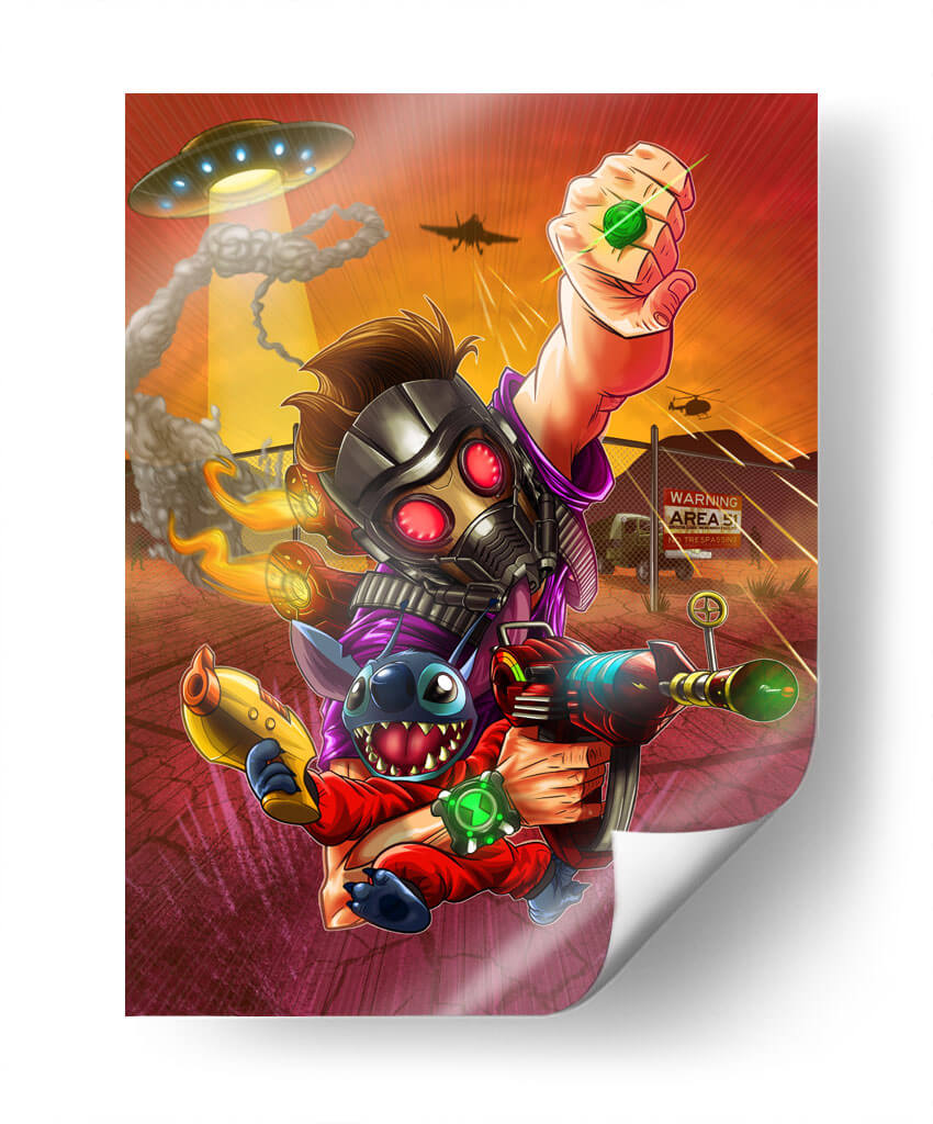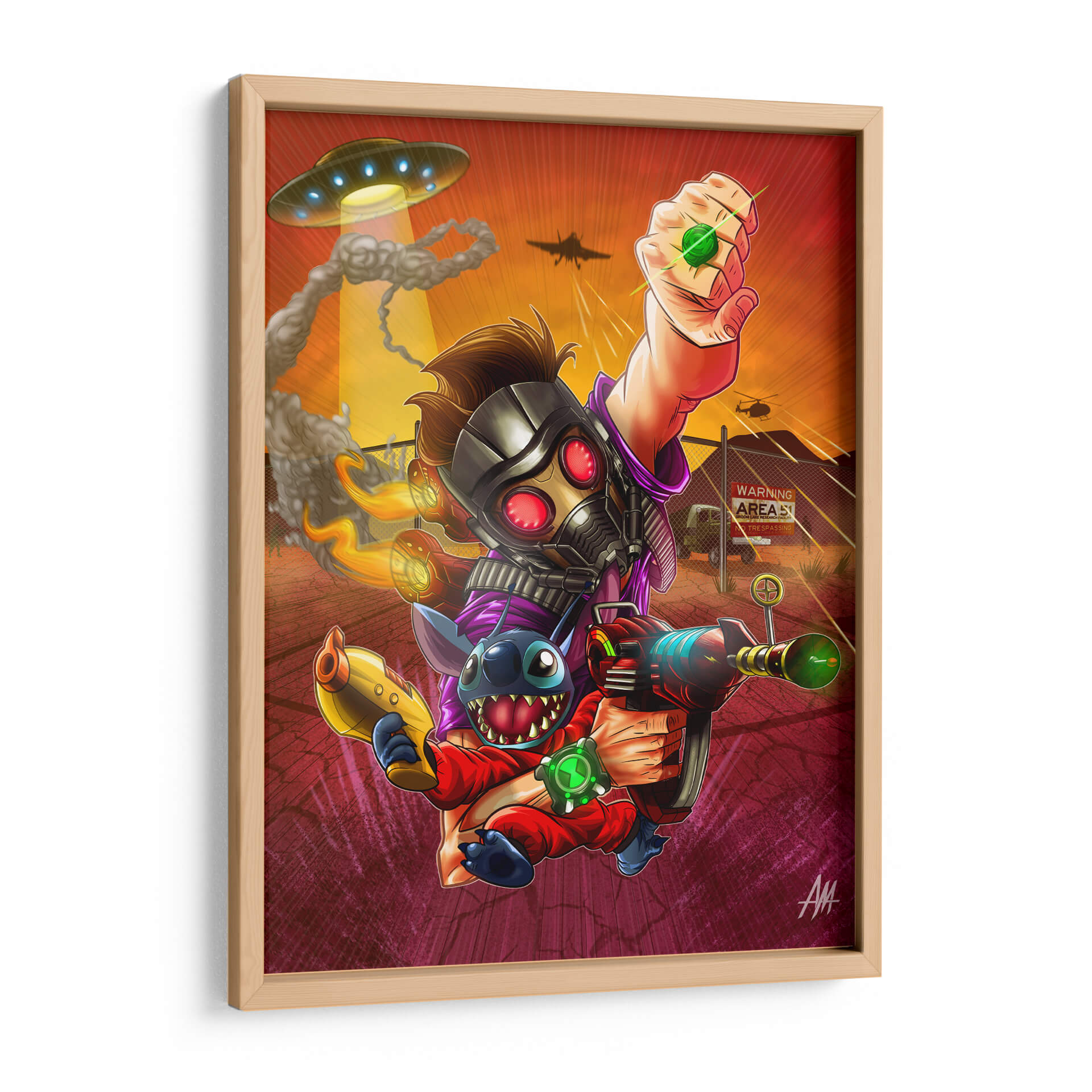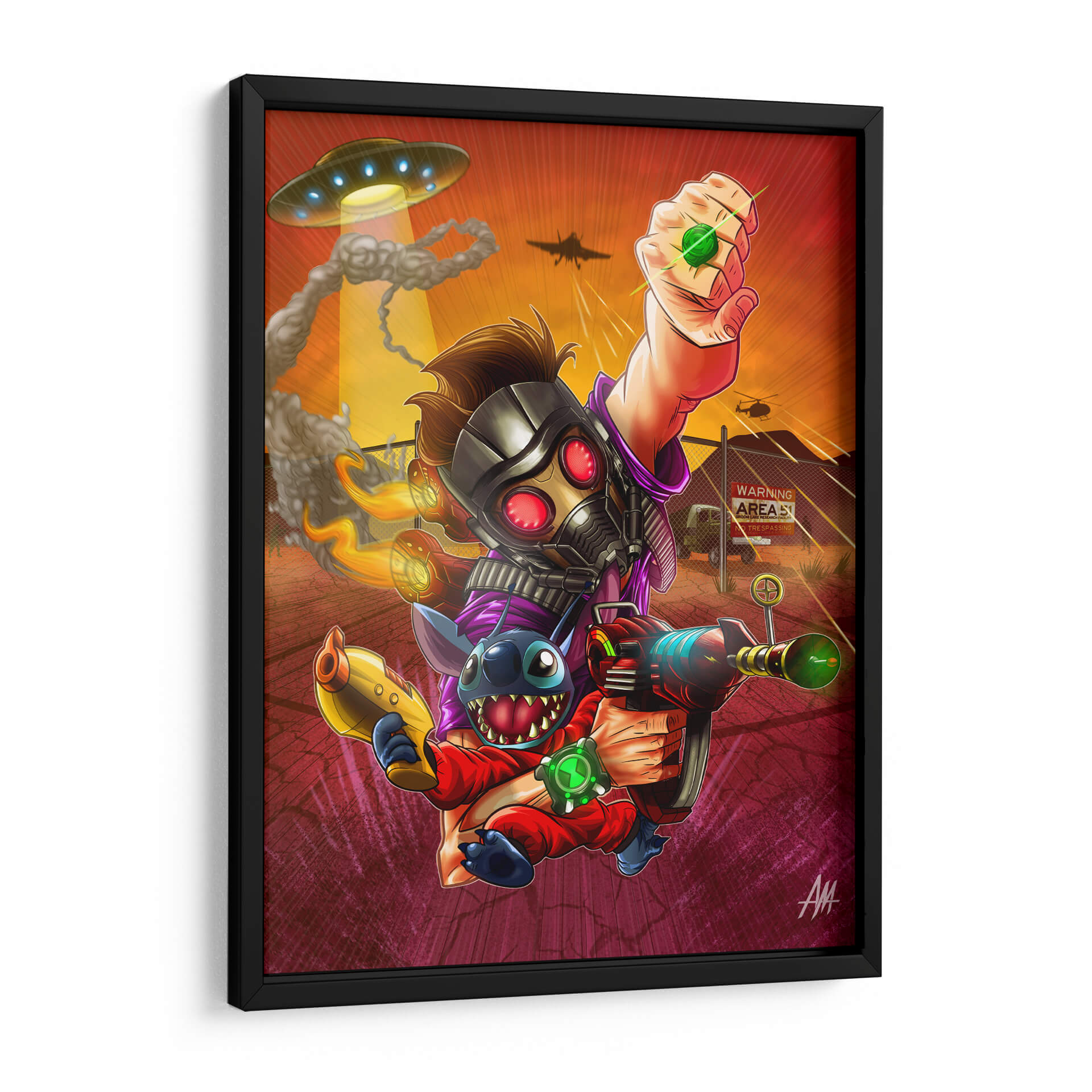 Sumérgete en el misterio y la aventura con "Área 51", una obra de arte digital vibrante y llena de energía del artista Axell Mejía. Esta pieza captura la imaginación con su intrigante representación de elementos extraterrestres y de ciencia ficción. Un personaje con máscara de gas y casco, reminiscentes de exploradores espaciales o militares, domina la escena, portando un misterioso objeto verde en su mano alzada y empuñando un arma futurista. A su lado, una criatura azul de gran tamaño, con dientes afilados y una expresión traviesa, también empuña un arma, añadiendo un toque lúdico y caótico a la composición. El fondo evoca un ambiente desértico y peligroso, con un ovni emitiendo un rayo de luz, un avión de combate y el icónico cartel de "WARNING AREA 51", todo ello bañado en tonos cálidos de naranja y rojo que sugieren un atardecer o un amanecer dramático. Los detalles como el humo, las luces de las naves y la textura del suelo crean una atmósfera inmersiva que invita a la especulación y la fantasía. "Área 51" es ideal para espacios que buscan un toque audaz, juvenil y lleno de carácter, como una sala de juegos, un despacho moderno o una habitación temática. Este cuadro decorativo es una invitación a explorar lo desconocido y añadir un elemento de intriga a tu decoración.