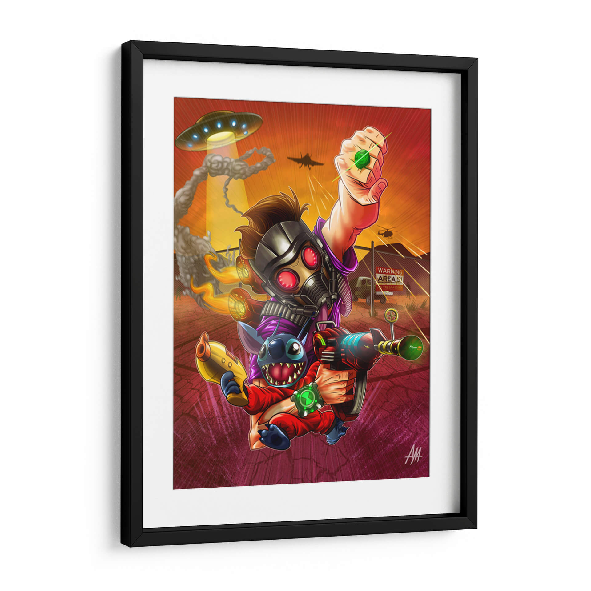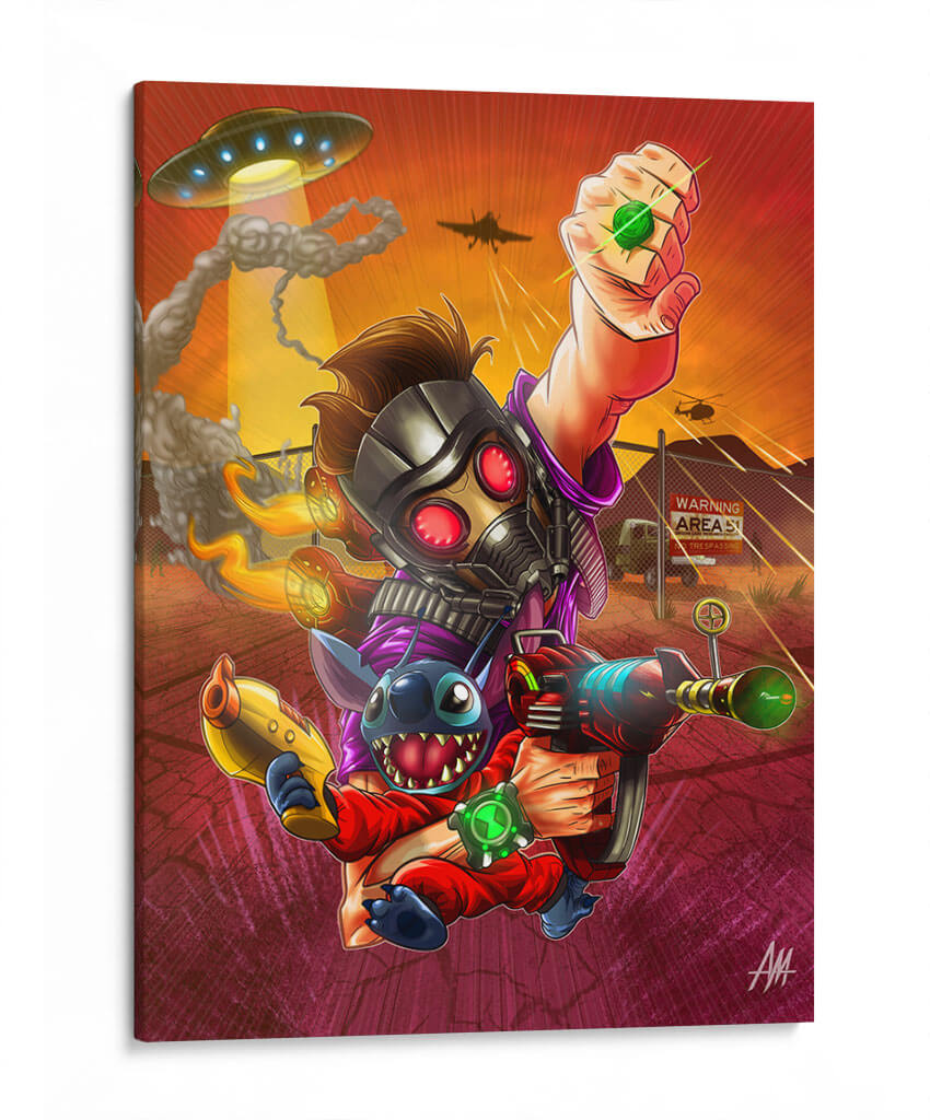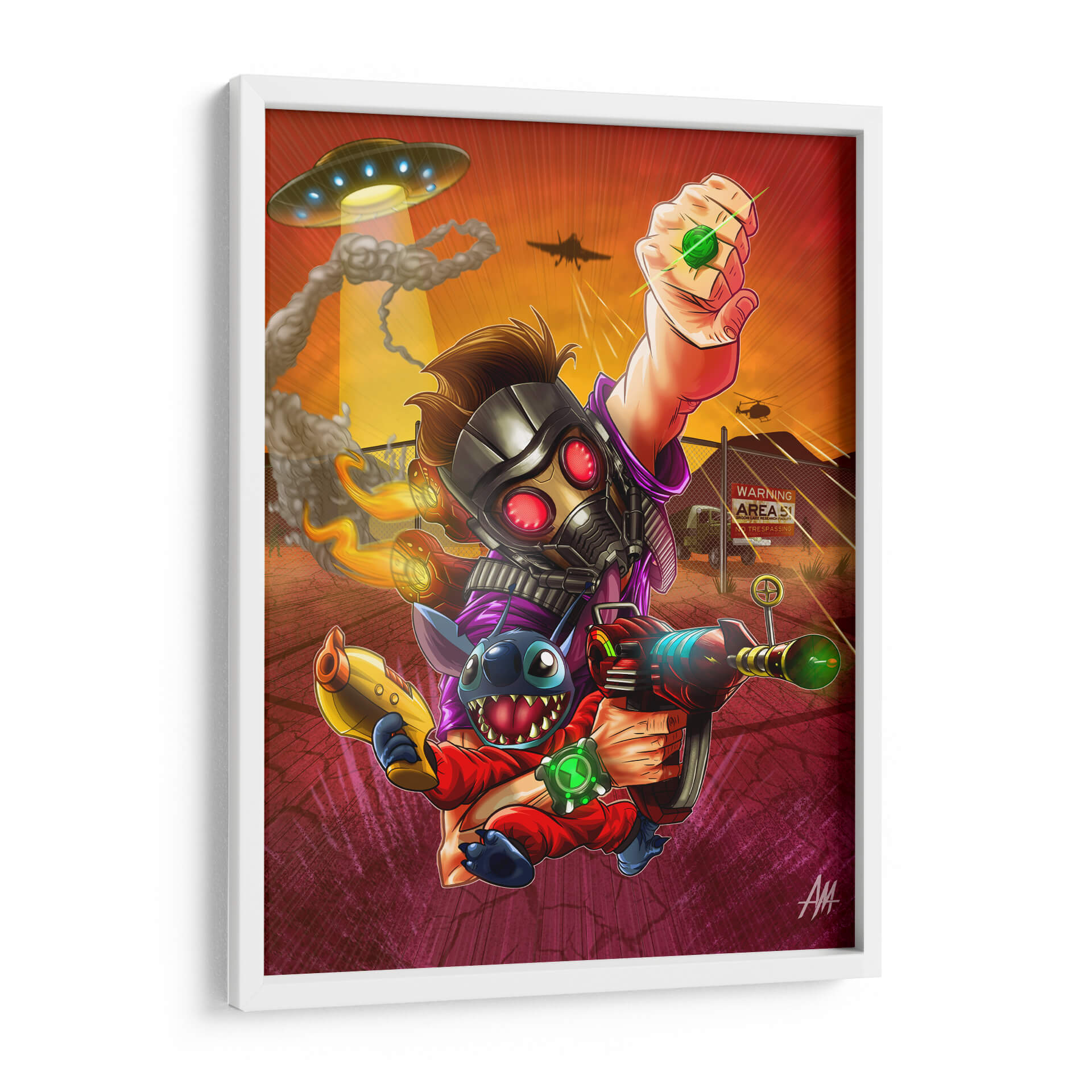 Sumérgete en el misterio y la aventura con "Área 51", una obra de arte digital vibrante y llena de energía del artista Axell Mejía. Esta pieza captura la imaginación con su intrigante representación de elementos extraterrestres y de ciencia ficción. Un personaje con máscara de gas y casco, reminiscentes de exploradores espaciales o militares, domina la escena, portando un misterioso objeto verde en su mano alzada y empuñando un arma futurista. A su lado, una criatura azul de gran tamaño, con dientes afilados y una expresión traviesa, también empuña un arma, añadiendo un toque lúdico y caótico a la composición. El fondo evoca un ambiente desértico y peligroso, con un ovni emitiendo un rayo de luz, un avión de combate y el icónico cartel de "WARNING AREA 51", todo ello bañado en tonos cálidos de naranja y rojo que sugieren un atardecer o un amanecer dramático. Los detalles como el humo, las luces de las naves y la textura del suelo crean una atmósfera inmersiva que invita a la especulación y la fantasía. "Área 51" es ideal para espacios que buscan un toque audaz, juvenil y lleno de carácter, como una sala de juegos, un despacho moderno o una habitación temática. Este cuadro decorativo es una invitación a explorar lo desconocido y añadir un elemento de intriga a tu decoración.