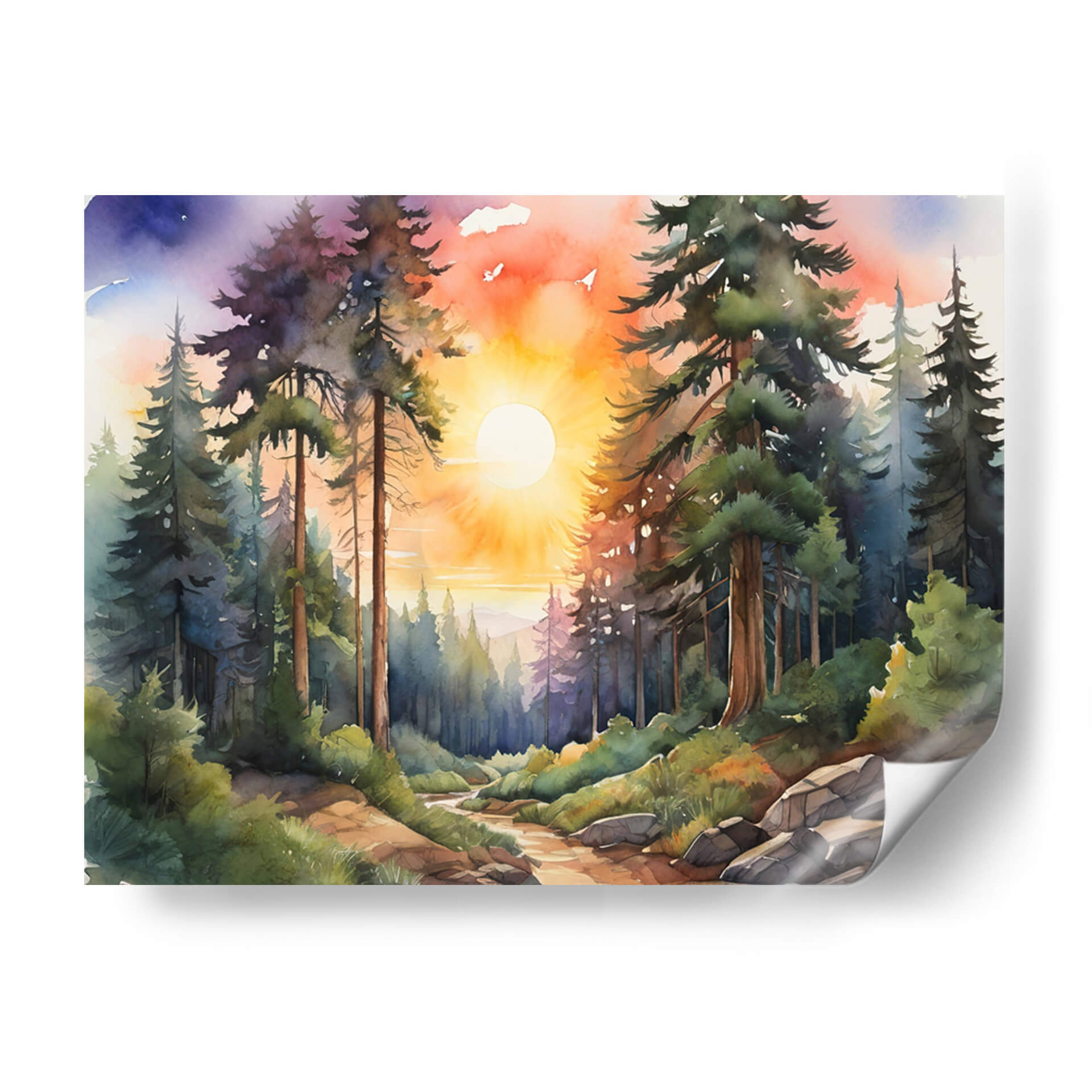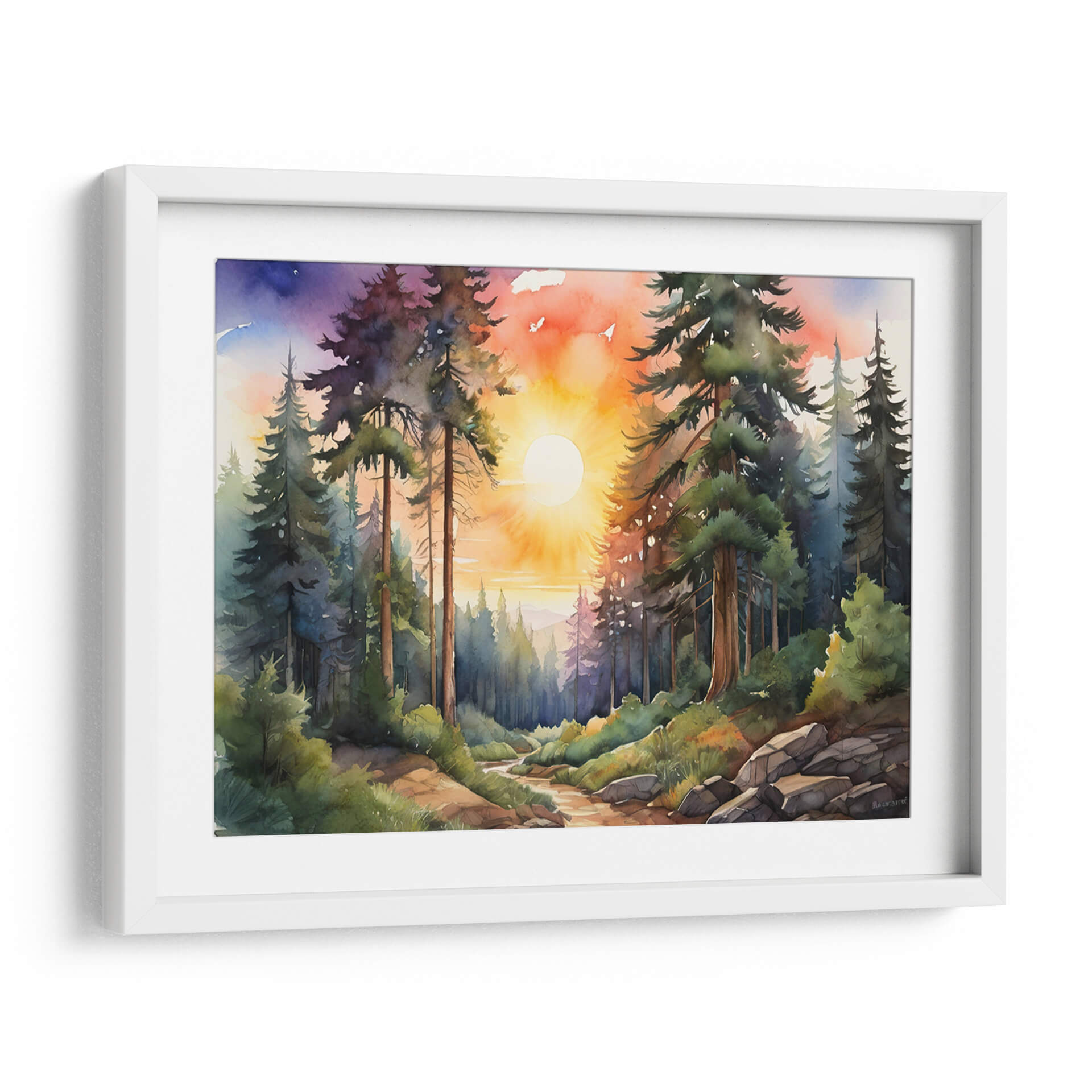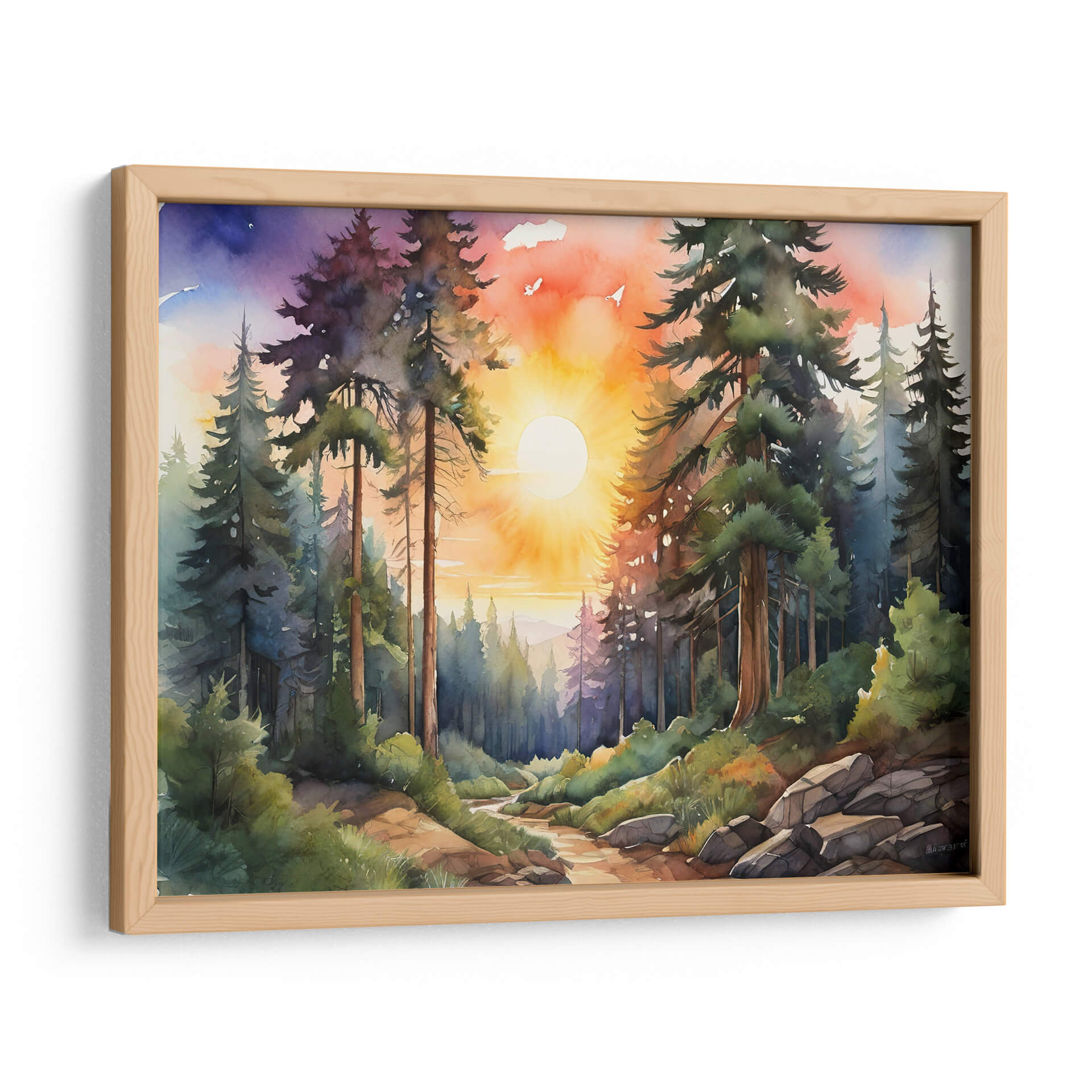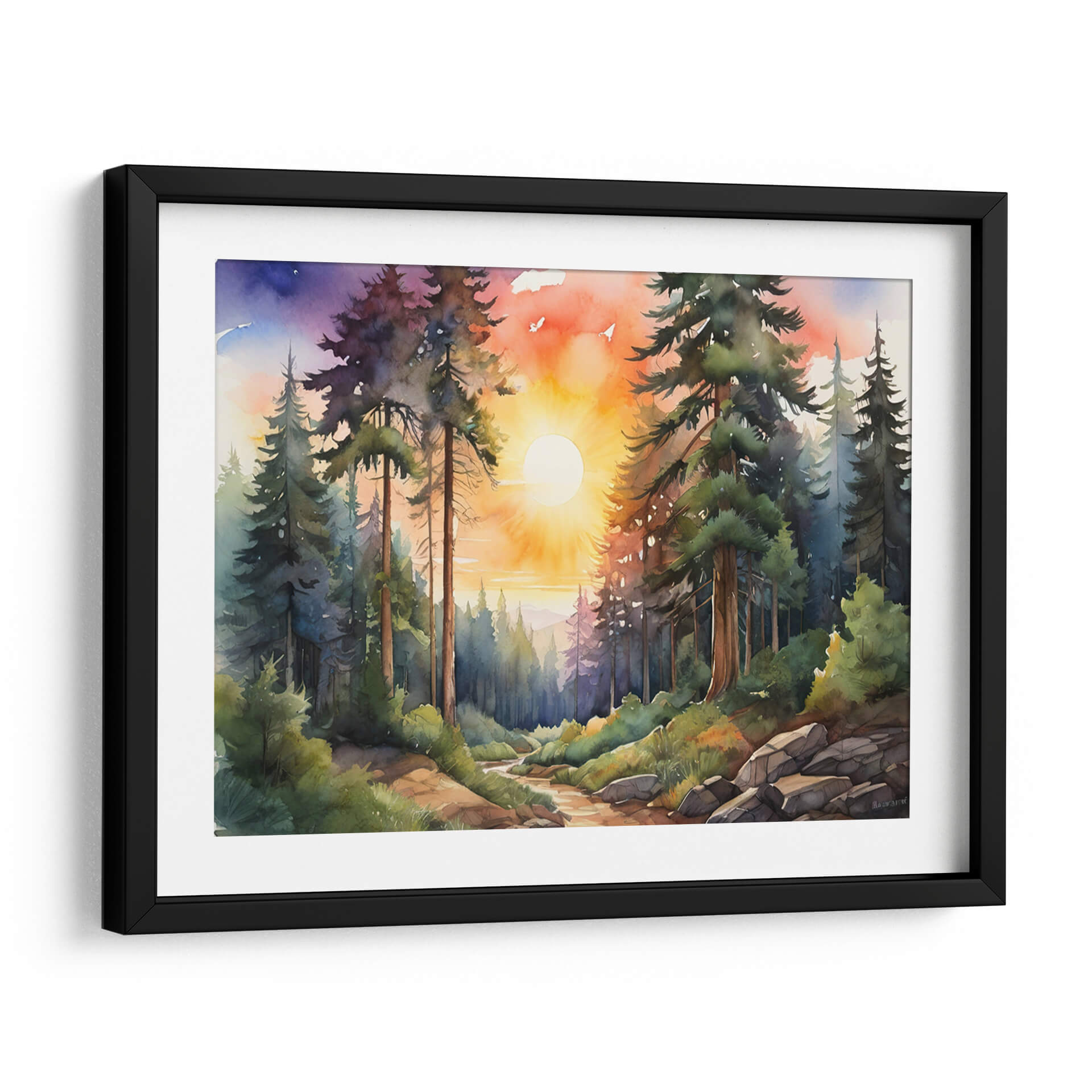 Sumérgete en la serenidad y la majestuosidad de la naturaleza con nuestro cuadro decorativo "Atardecer en el bosque II". Esta obra de arte captura la magia de un bosque frondoso al anochecer, donde los imponentes árboles se alzan como guardianes silenciosos bajo un cielo que se tiñe de vibrantes tonos anaranjados, púrpuras y azules. La luz del sol poniente se filtra a través de las copas, creando un juego de luces y sombras que baña el sendero y las rocas con una calidez dorada. La técnica de acuarela evoca una atmósfera etérea y soñadora, con pinceladas que dan vida a cada hoja y cada tronco. Este cuadro es ideal para quienes buscan añadir un toque de calma, inspiración y conexión con el entorno natural a su hogar u oficina. Imagina este "arte de paisaje" como el punto focal perfecto para tu sala de estar, dormitorio o estudio, aportando una sensación de paz y maravilla. Los colores cálidos y la composición envolvente invitan a la contemplación y al escape, transformando cualquier espacio en un refugio de tranquilidad. Perfecto como "decoración de pared moderna" o "arte contemporáneo" para realzar la estética de tu espacio vital.