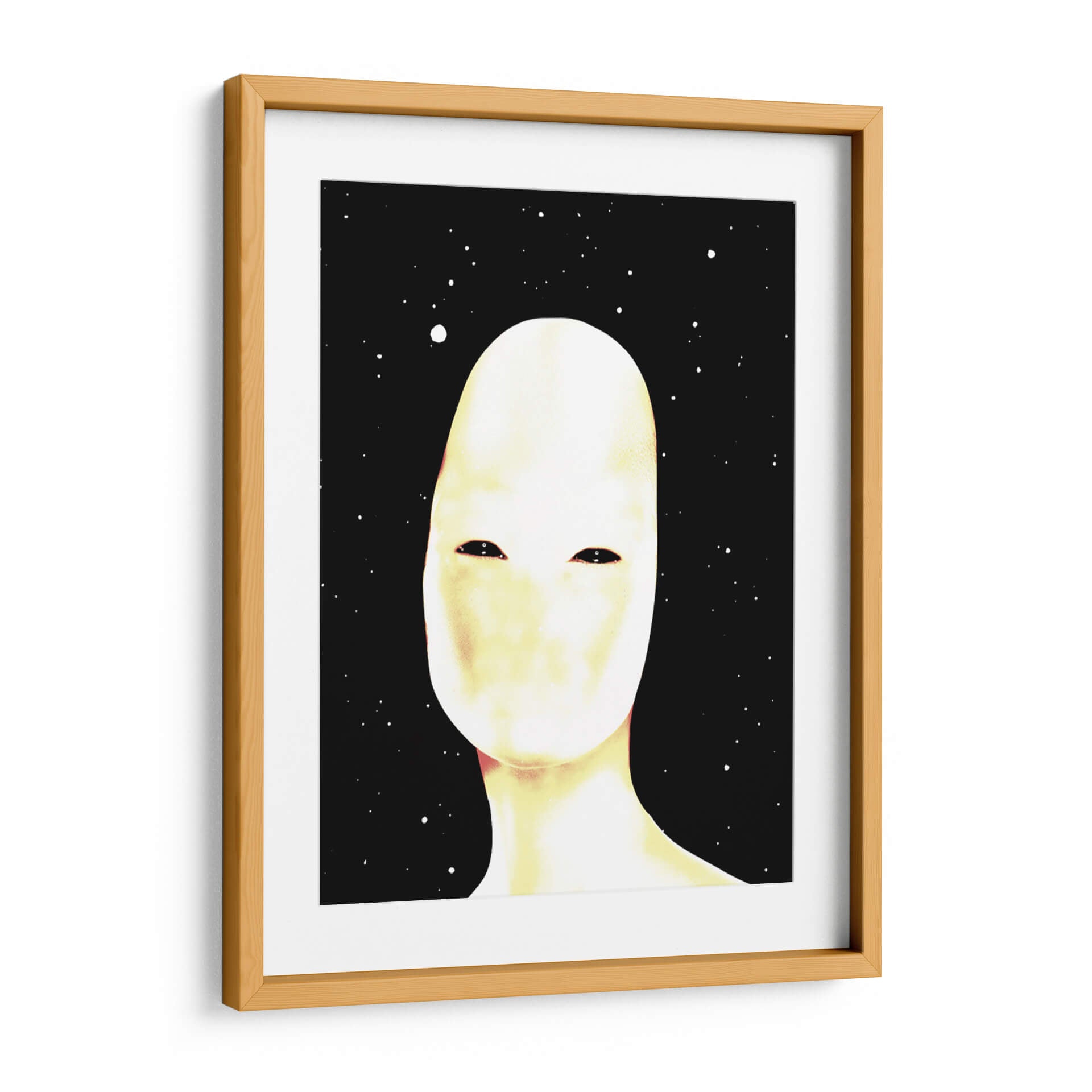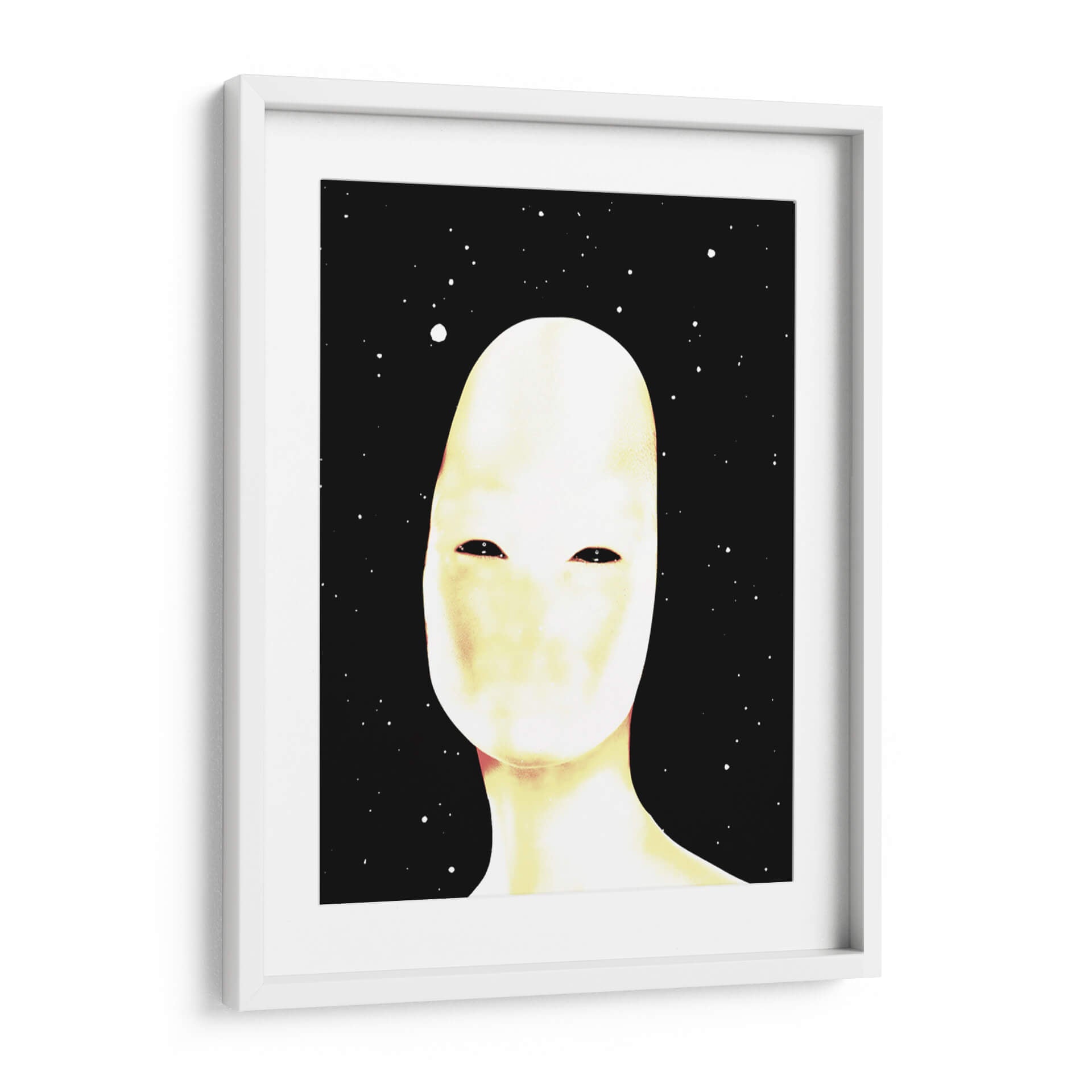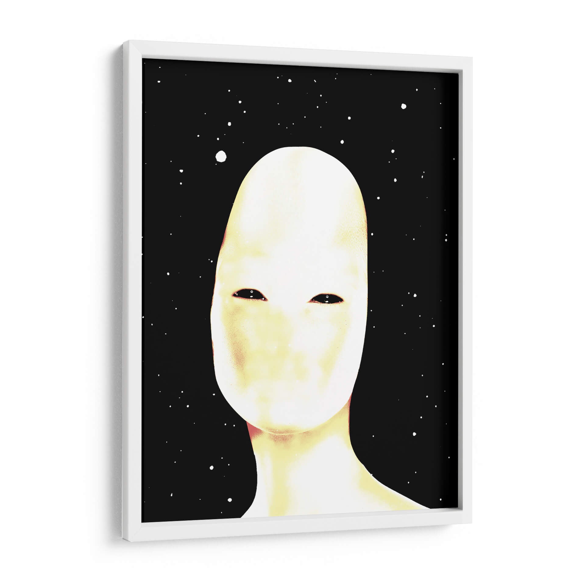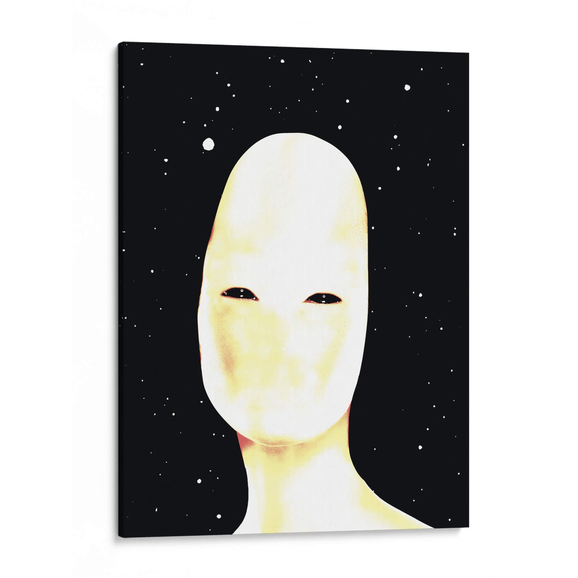 Sumérgete en el misterio y la introspección con este cautivador cuadro decorativo titulado 'Autoretrato' del artista Homo Cosmicam. Esta obra de arte abstracto presenta una figura central de tonos pálidos y etéreos, cuyo rostro carece de rasgos definidos, solo dos profundos ojos oscuros que parecen contemplar el vacío. El fondo negro salpicado de puntos blancos evoca un cielo estrellado o un cosmos infinito, creando una atmósfera de soledad cósmica y autodescubrimiento. Los sutiles matices de amarillo y rosa que bañan la figura principal aportan una calidez inesperada a la frialdad del espacio, generando un contraste intrigante y emotivo. El estilo minimalista y la composición centrada en la figura invitan a la reflexión sobre la identidad, la existencia y nuestro lugar en el universo. Este cuadro decorativo es perfecto para añadir un toque de arte contemporáneo y enigmático a tu sala de estar, estudio u oficina, convirtiéndose en un punto focal que genera conversación y admiración. Si buscas una pieza que combine la abstracción moderna con una profunda carga emocional, este 'Autoretrato' es una elección excepcional para transformar tu espacio con arte que inspira y cuestiona.