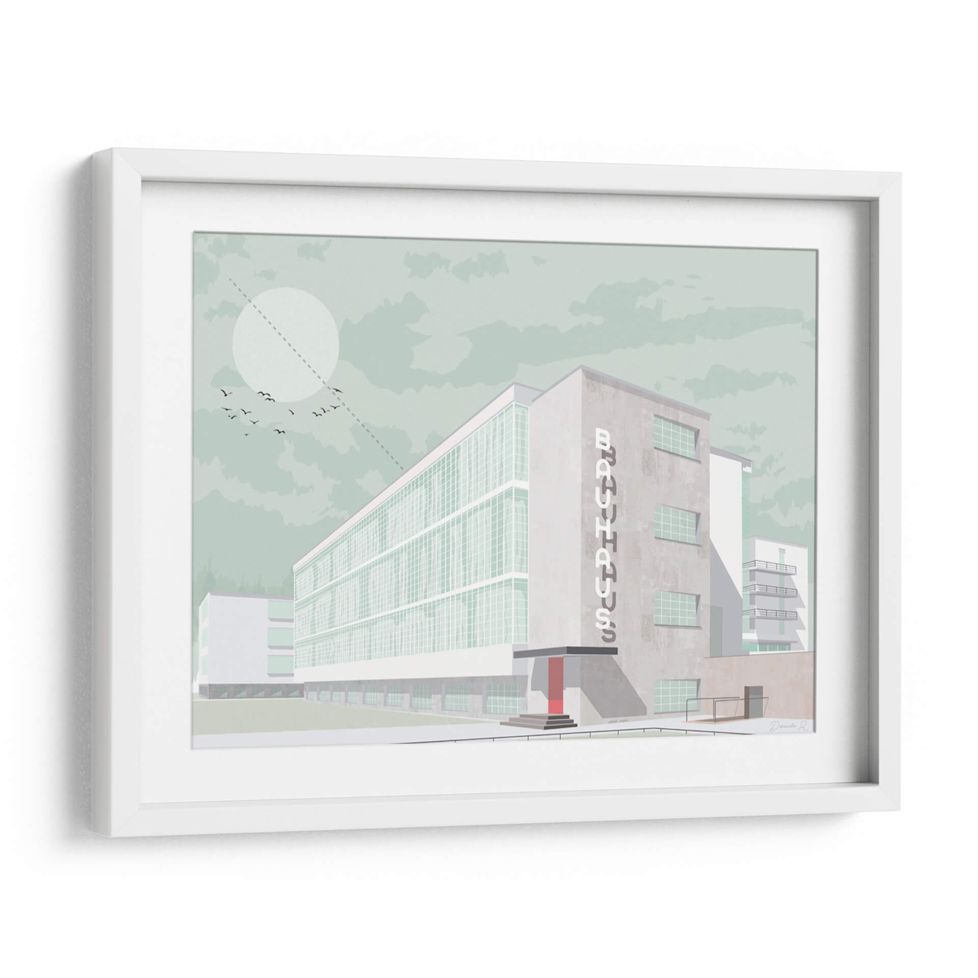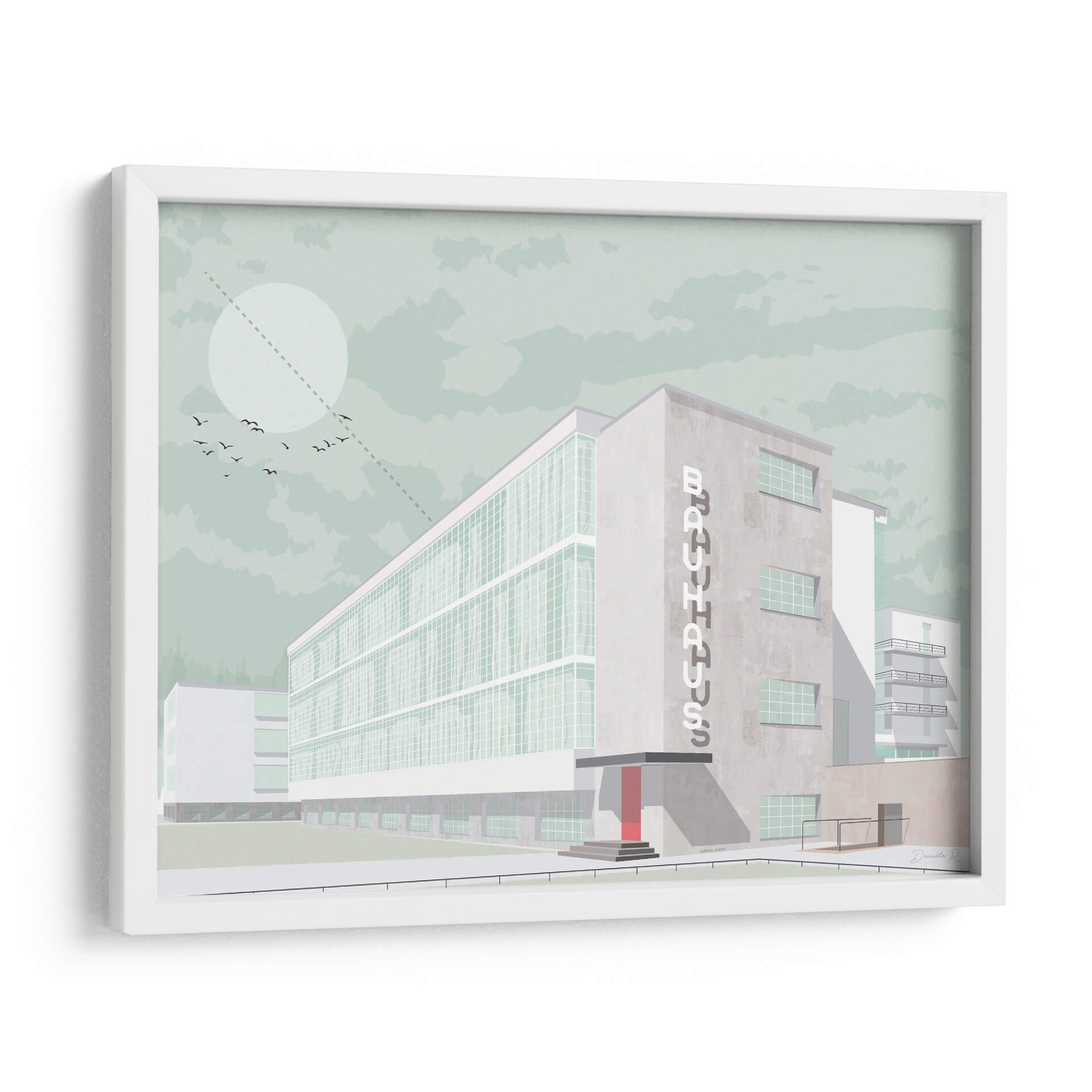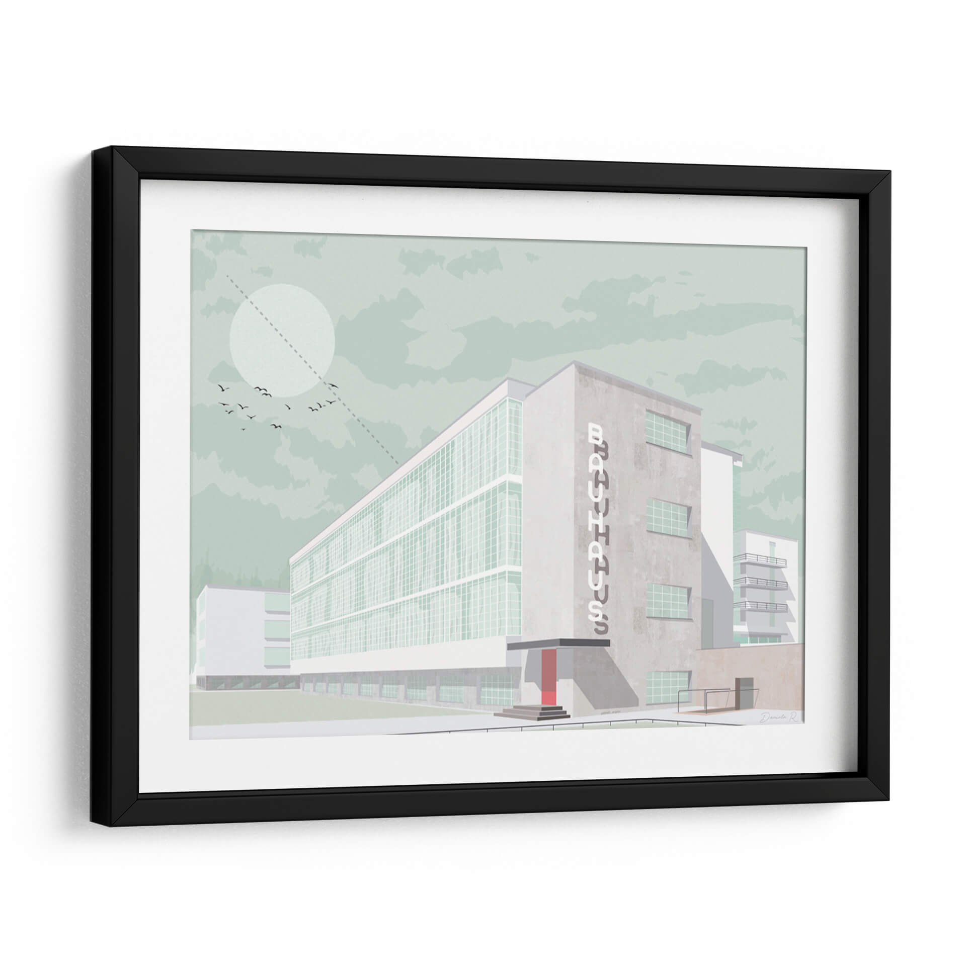 Sumérgete en la estética icónica de la Bauhaus con este cautivador cuadro decorativo. La obra captura la esencia del movimiento Bauhaus, presentando una representación estilizada de la emblemática arquitectura de la escuela, destacando sus líneas limpias, formas geométricas y funcionalidad. La paleta de colores, dominada por suaves tonos verdes y grises, crea una atmósfera de serenidad y sofisticación, mientras que la sutil representación del sol y las aves en el cielo añade un toque etéreo y de movimiento. Este cuadro decorativo es perfecto para infundir un sentido de orden, modernidad y legado artístico en cualquier espacio. Ideal para salas de estar contemporáneas, estudios de diseño, oficinas o cualquier lugar donde se aprecie la historia del diseño y la arquitectura. Su composición equilibrada y su estilo distintivo lo convierten en una pieza de arte de pared que inspira y dialoga con el entorno, aportando un toque de refinamiento intelectual y visual. Añade un pedazo de la historia del diseño a tu hogar.