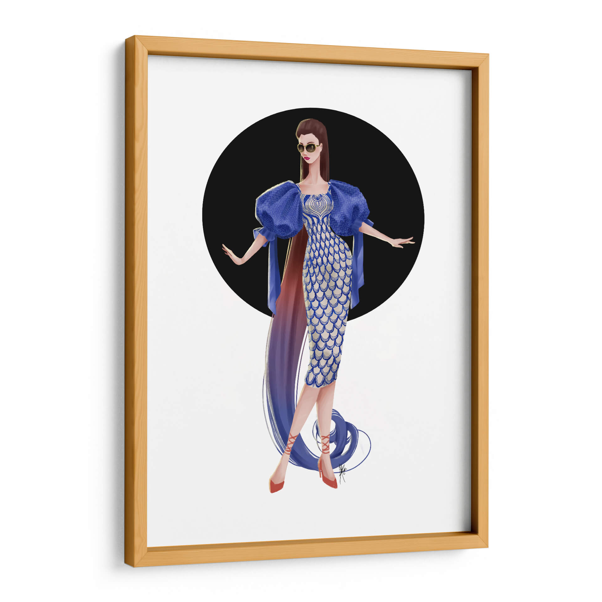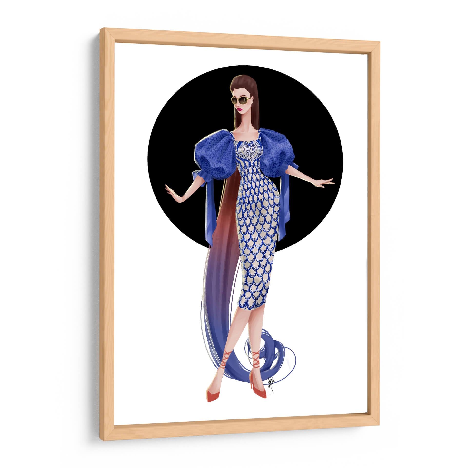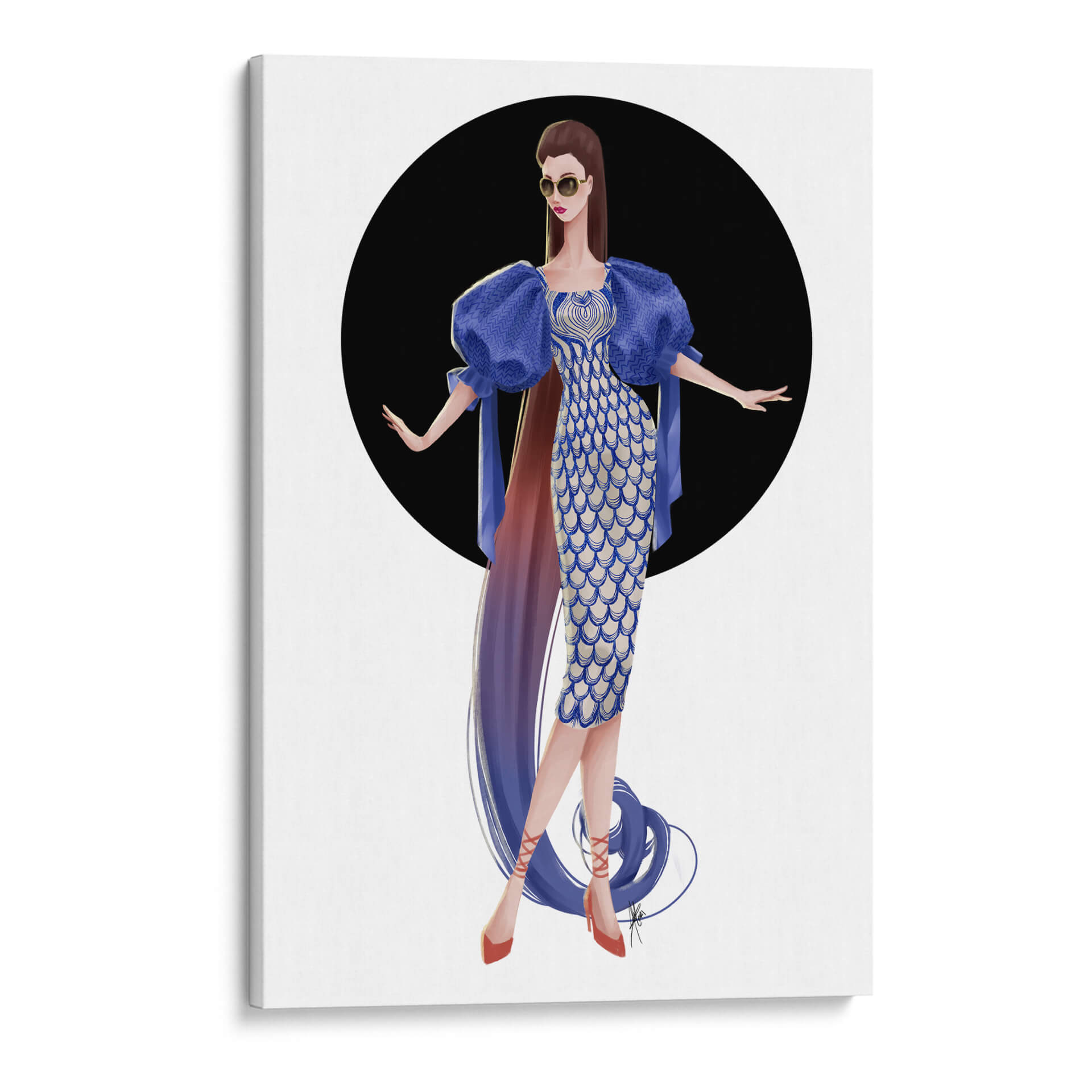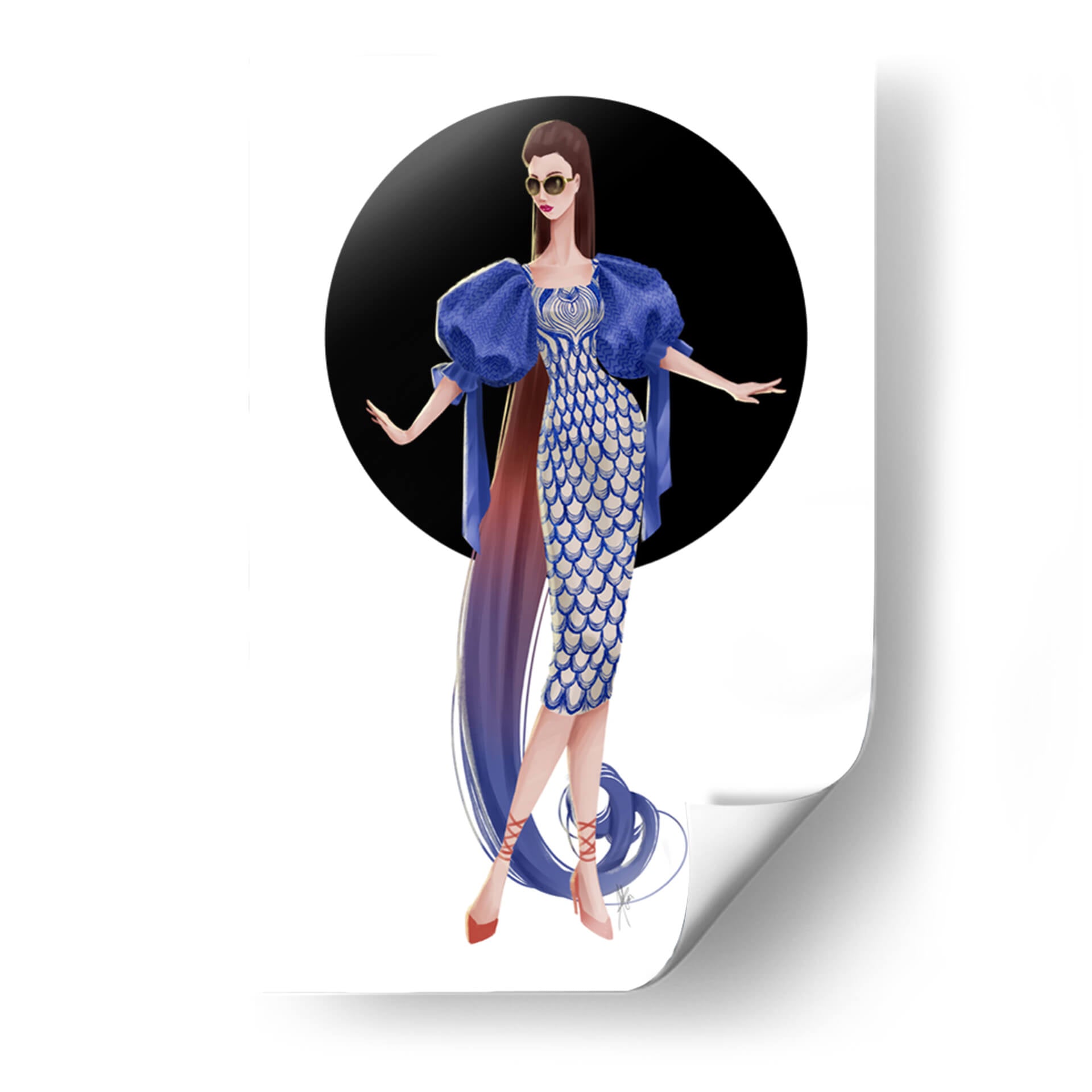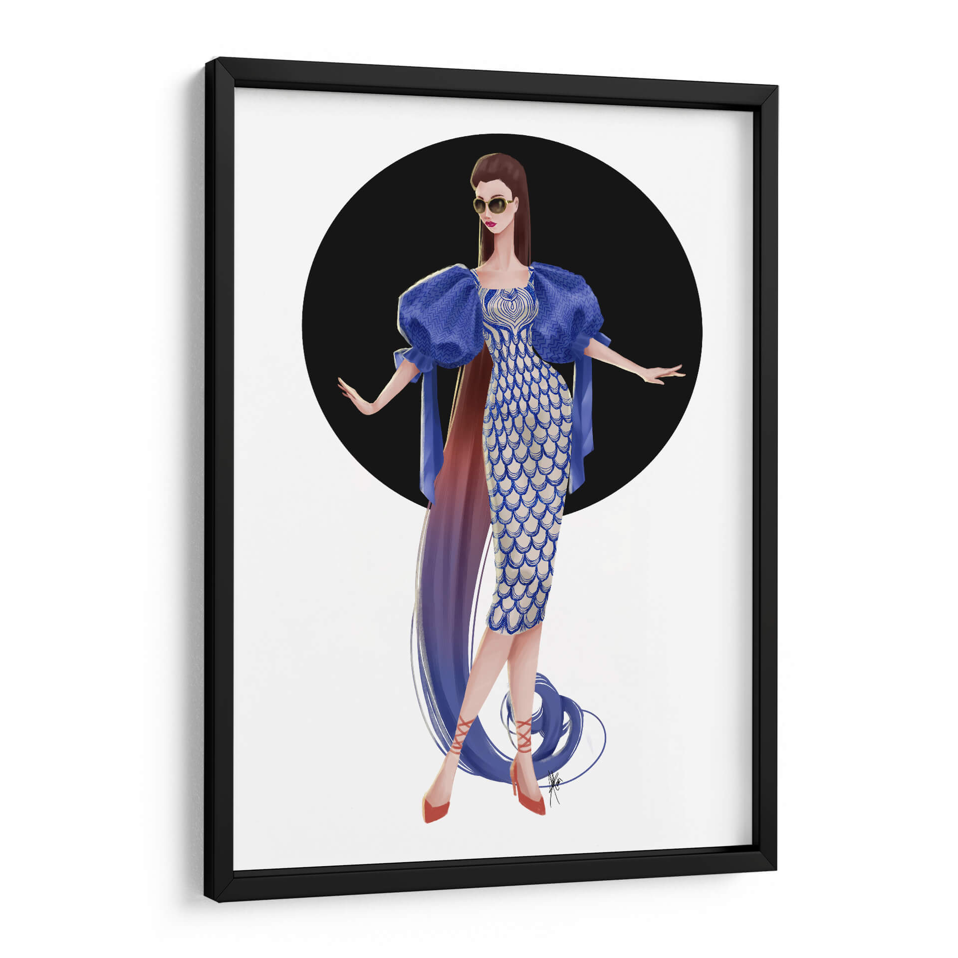 Sumérgete en el mundo de la moda y el arte con este cautivador cuadro decorativo digital, titulado 'Benito Santos Deco' y creado por el artista Púrpura Imperial. Esta obra evoca una elegancia atemporal y un toque de glamour contemporáneo. La figura central, una mujer estilizada con gafas de sol y un vestido que recuerda a escamas marinas en tonos azules y plateados, irradia confianza y sofisticación. Las mangas voluminosas y la fluidez de la tela que cae a su lado añaden un dinamismo visual que contrasta elegantemente con el círculo negro abstracto de fondo. La paleta de colores, dominada por el azul vibrante y los detalles plateados, crea una atmósfera de lujo y exclusividad. Los sutiles toques de rojo en los zapatos de tacón y los cordones en espiral que se entrelazan en la base aportan un contraste audaz. Este cuadro decorativo es ideal para espacios que buscan un punto focal de moda y arte, como salas de estar modernas, vestidores o estudios creativos. Aporta una dosis de estilo chic y una narrativa visual fascinante a tu decoración.