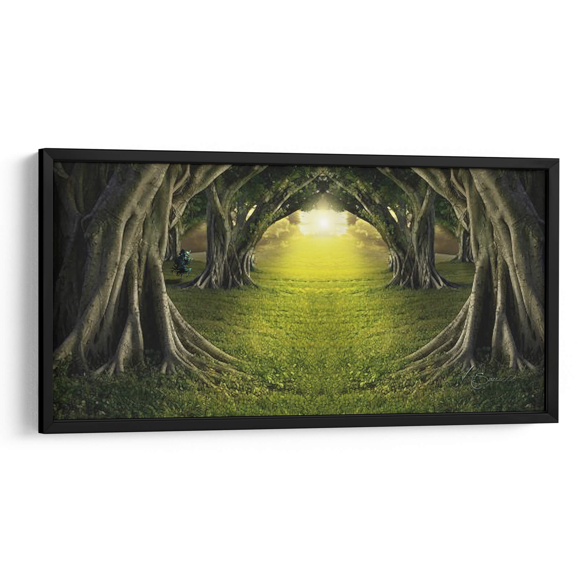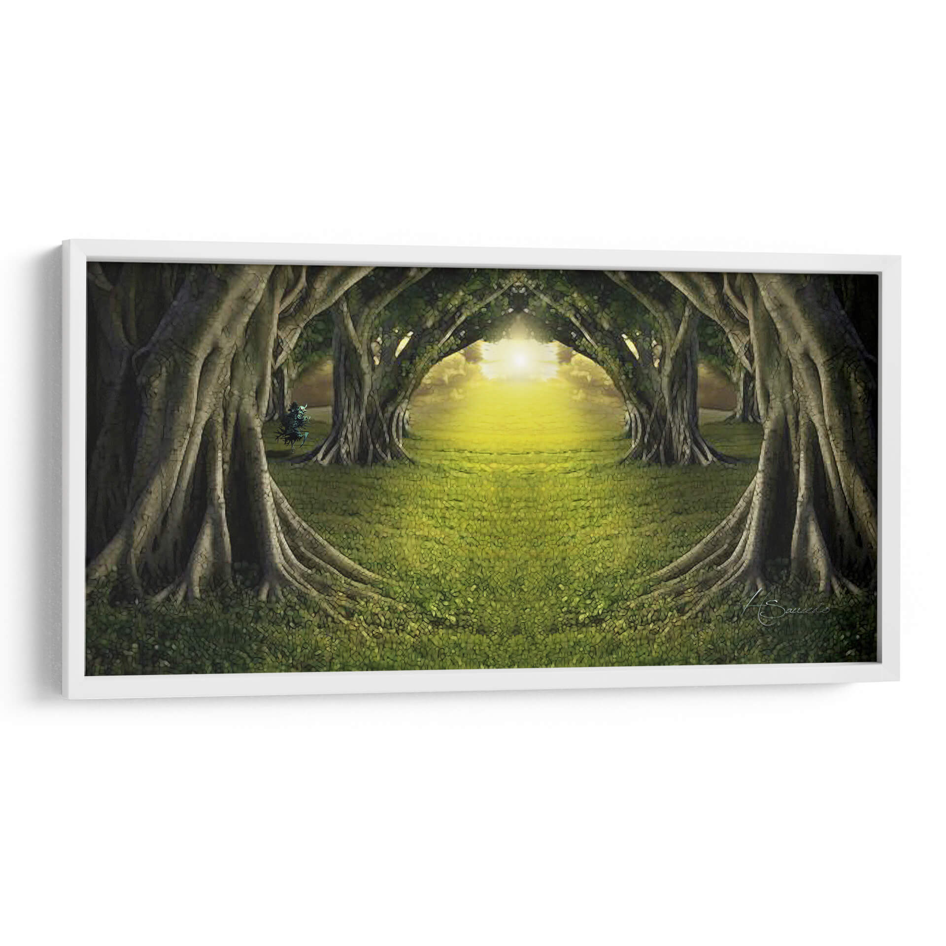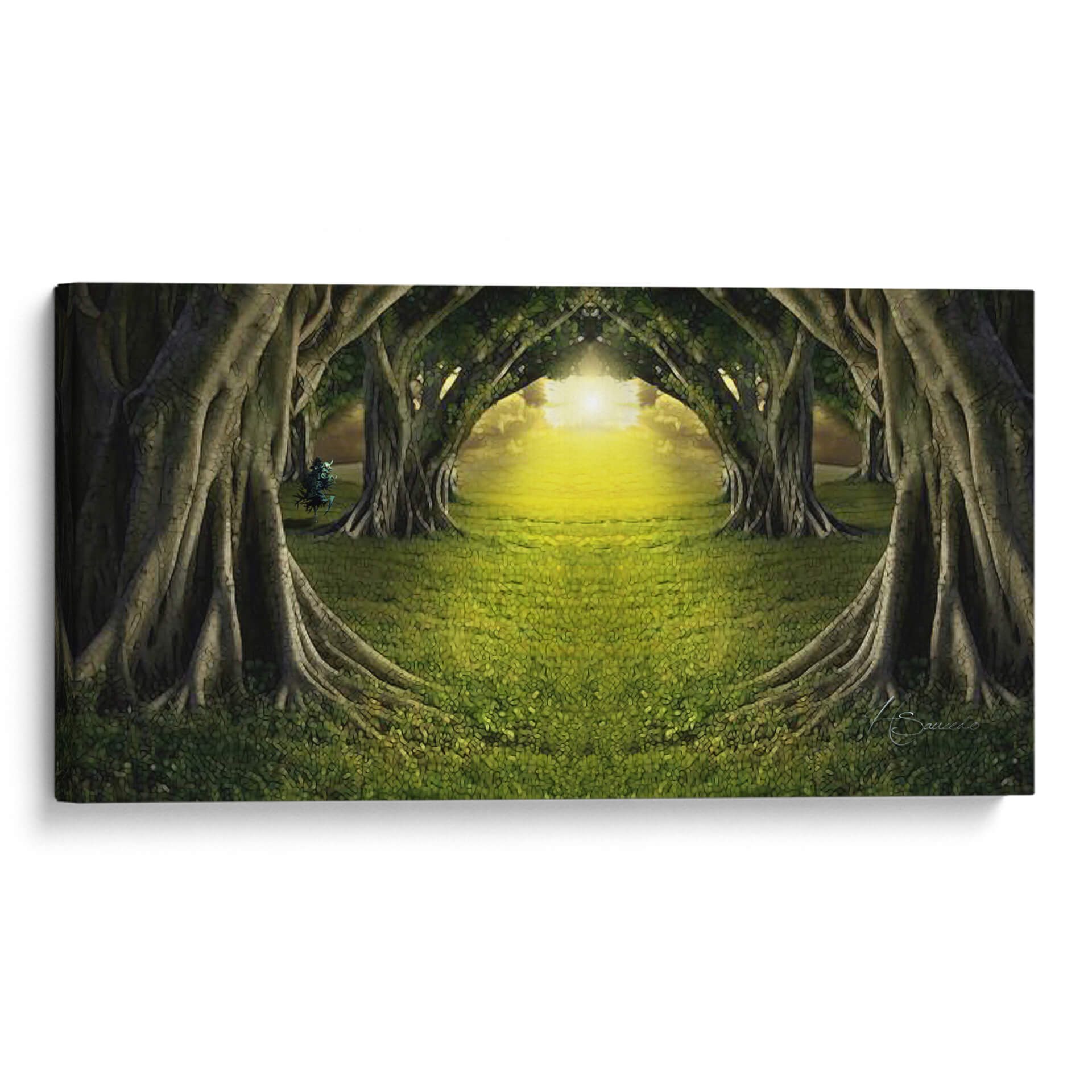 Adéntrate en la mágica escena del cuadro decorativo "Bosque de Luz" de HSaucedo, una obra que captura la esencia etérea de un camino iluminado por el sol a través de un túnel de árboles frondosos. La exuberante hierba verde, salpicada de delicadas flores, se extiende invitando al espectador a un viaje sensorial. Los imponentes árboles, con sus raíces expuestas y troncos robustos, forman arcos naturales que dirigen la mirada hacia un resplandor dorado y cálido en el horizonte. La paleta de colores, dominada por verdes profundos y amarillos vibrantes, crea una atmósfera de paz, misterio y renovación, transportando la tranquilidad de la naturaleza al interior de tu hogar u oficina. Este cuadro de paisaje contemporáneo es ideal para espacios que buscan infundir serenidad y una conexión con el mundo natural. Su composición simétrica y la luz envolvente invitan a la contemplación, convirtiéndolo en una pieza central perfecta para salas de estar, estudios o dormitorios que deseen un toque de ensueño y espiritualidad. "Bosque de Luz" es más que una obra de arte; es una invitación a encontrar la calma y la belleza en el camino.