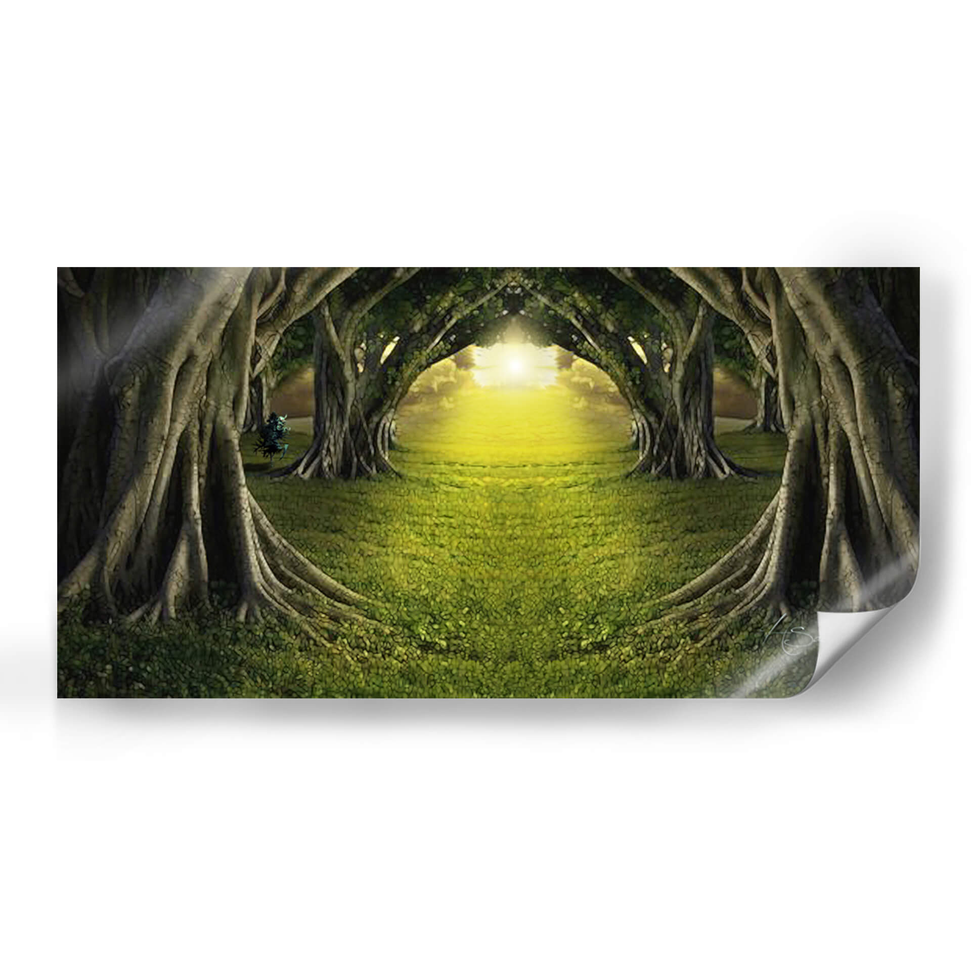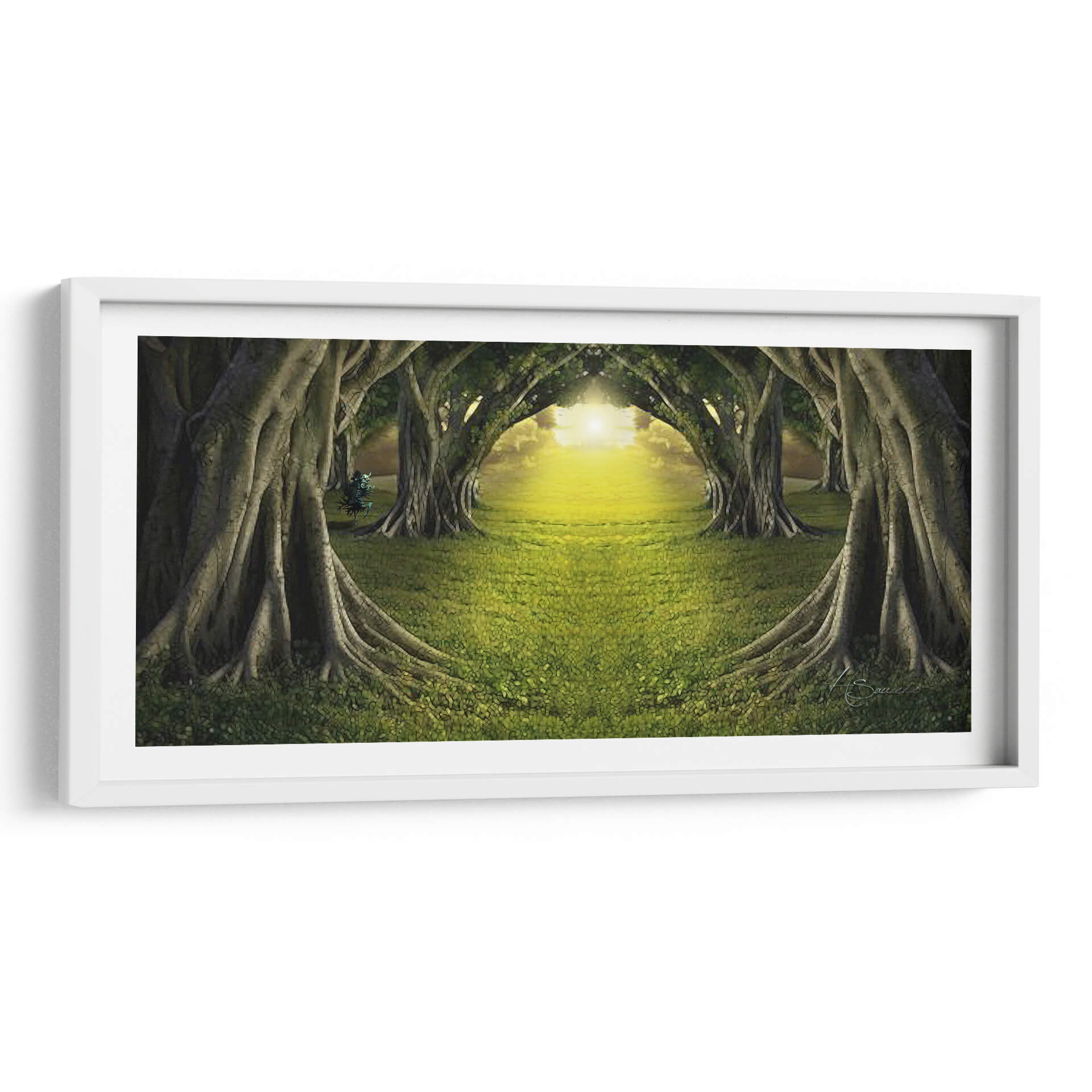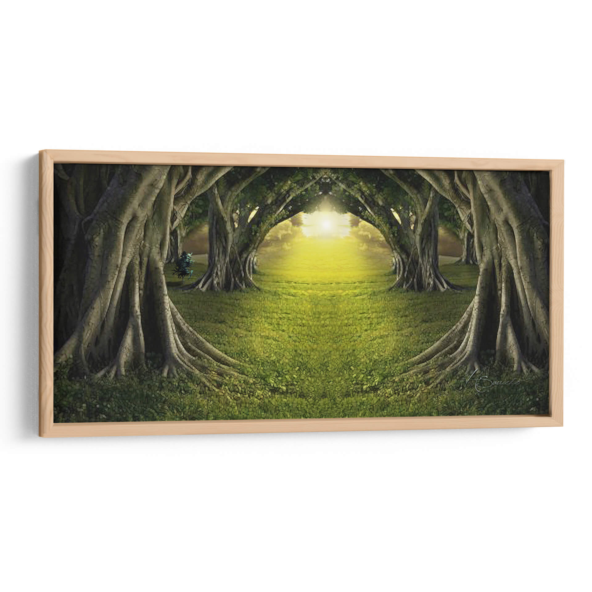 Adéntrate en la mágica escena del cuadro decorativo "Bosque de Luz" de HSaucedo, una obra que captura la esencia etérea de un camino iluminado por el sol a través de un túnel de árboles frondosos. La exuberante hierba verde, salpicada de delicadas flores, se extiende invitando al espectador a un viaje sensorial. Los imponentes árboles, con sus raíces expuestas y troncos robustos, forman arcos naturales que dirigen la mirada hacia un resplandor dorado y cálido en el horizonte. La paleta de colores, dominada por verdes profundos y amarillos vibrantes, crea una atmósfera de paz, misterio y renovación, transportando la tranquilidad de la naturaleza al interior de tu hogar u oficina. Este cuadro de paisaje contemporáneo es ideal para espacios que buscan infundir serenidad y una conexión con el mundo natural. Su composición simétrica y la luz envolvente invitan a la contemplación, convirtiéndolo en una pieza central perfecta para salas de estar, estudios o dormitorios que deseen un toque de ensueño y espiritualidad. "Bosque de Luz" es más que una obra de arte; es una invitación a encontrar la calma y la belleza en el camino.