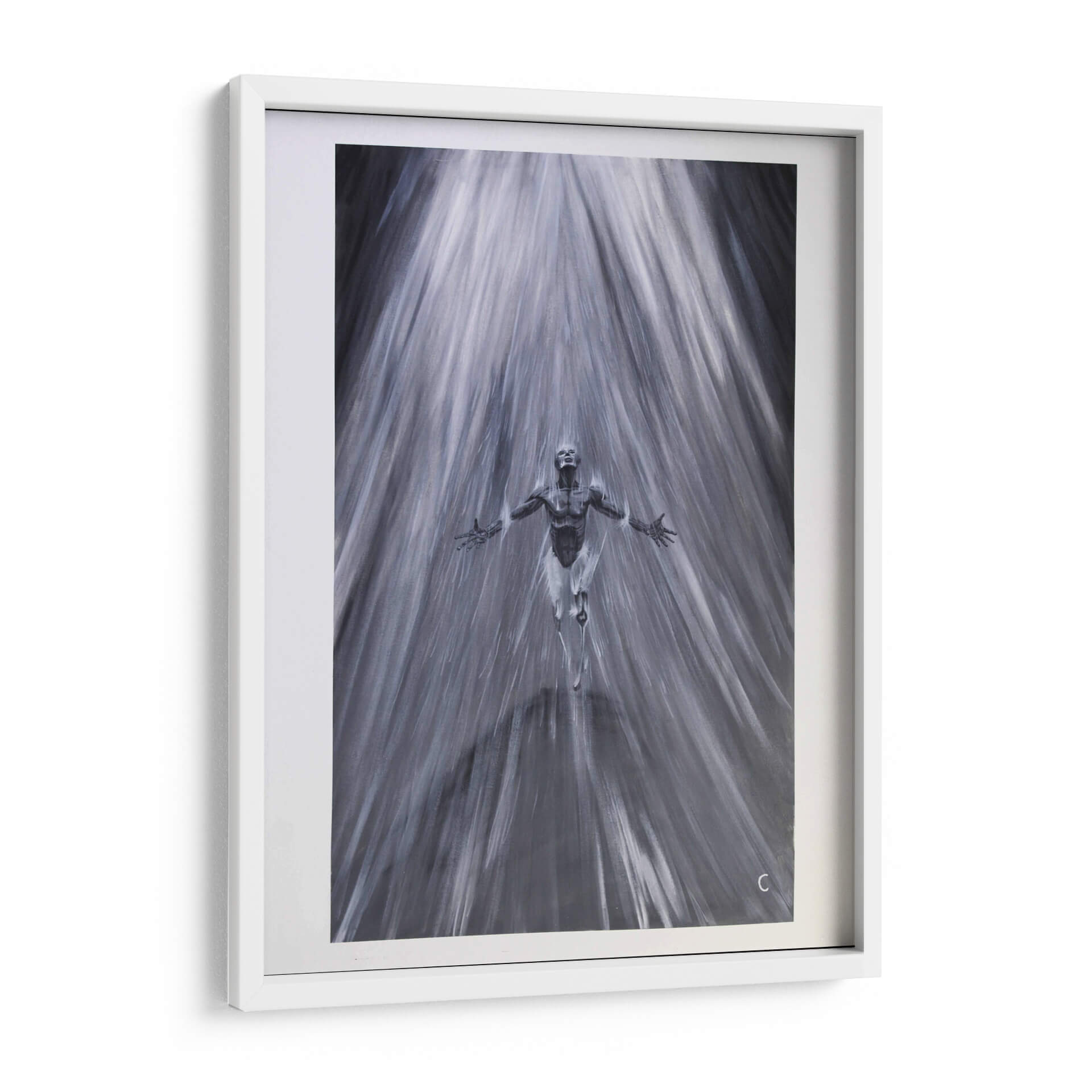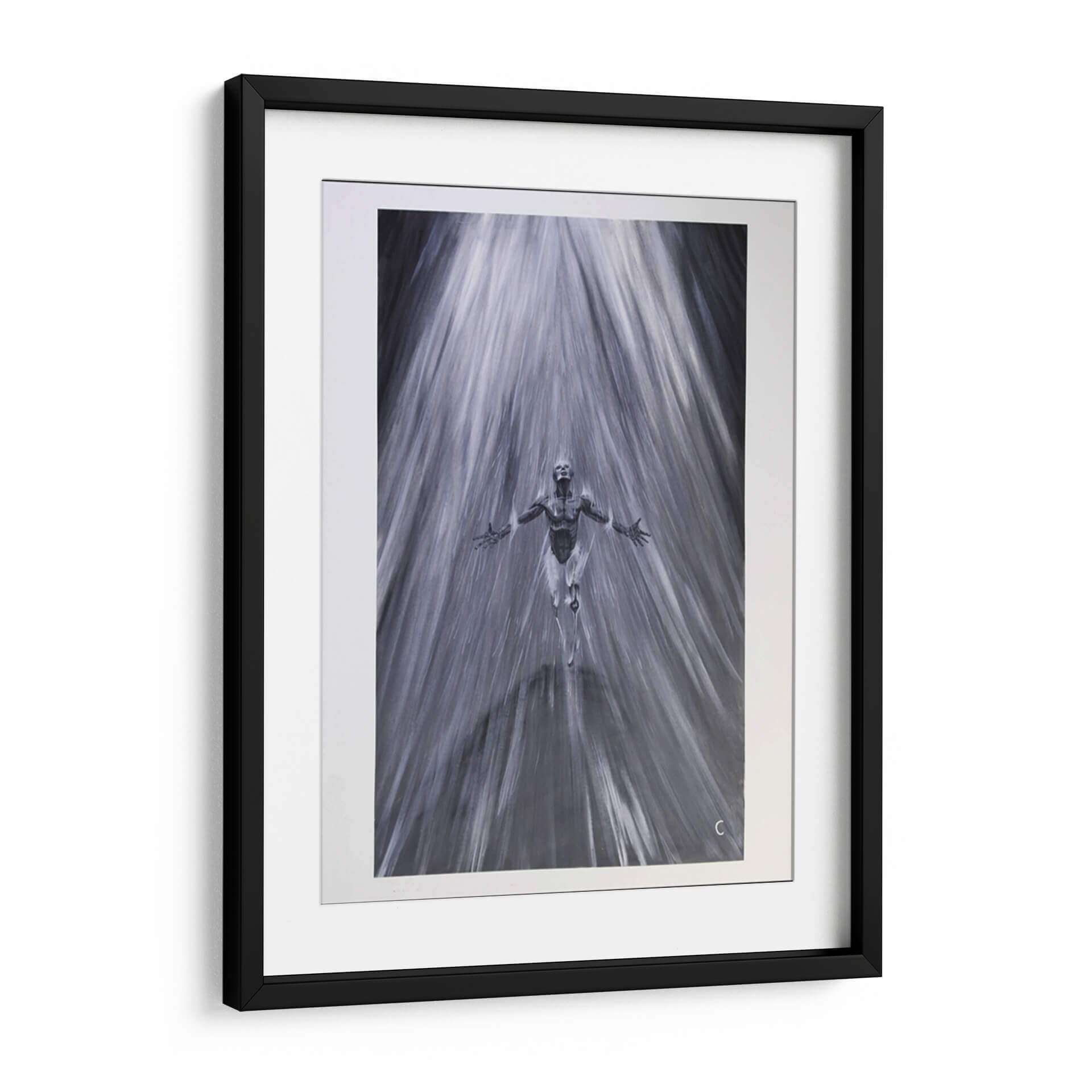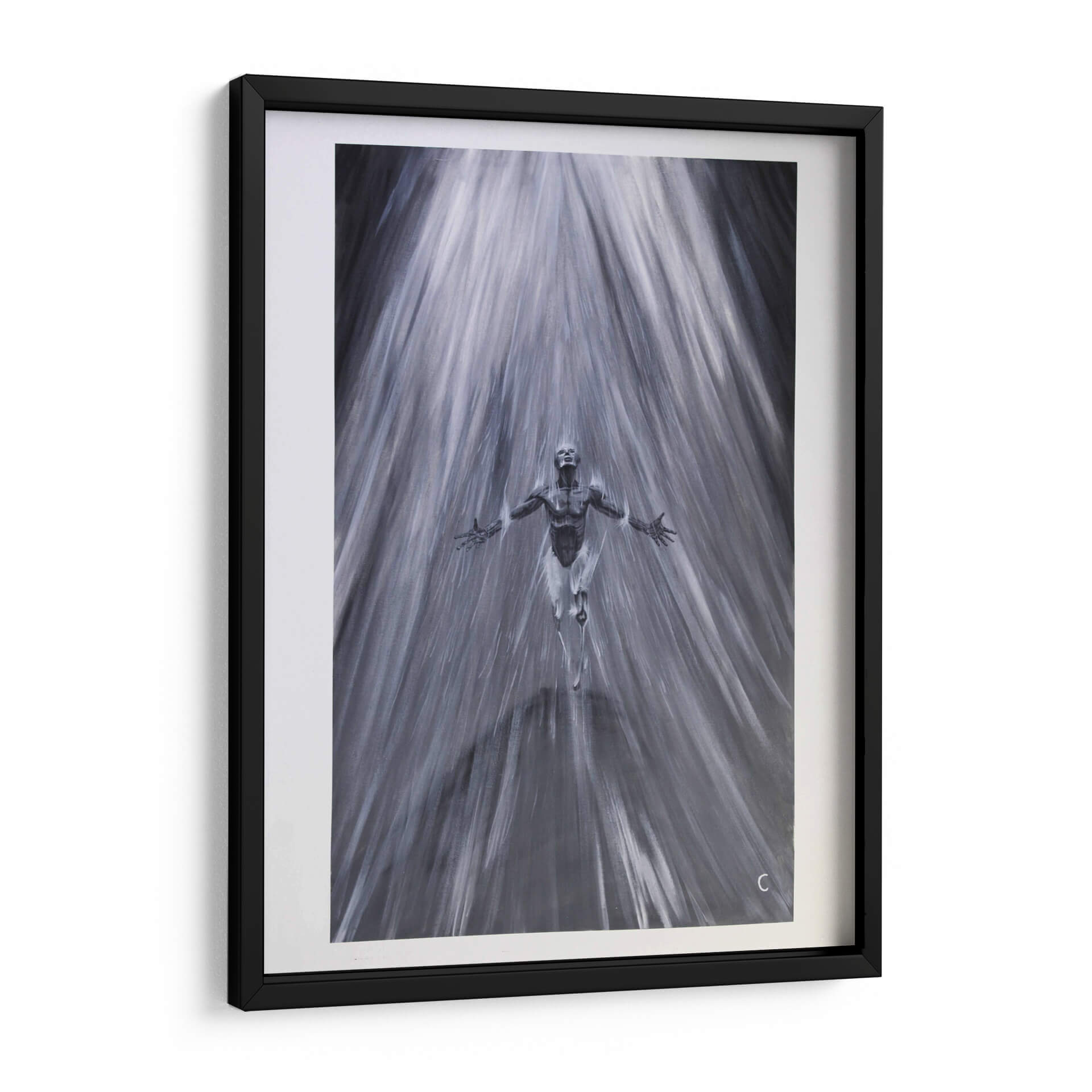 Sumérgete en la poderosa obra de arte "Depuración" de Christian Morales, una pieza que evoca una profunda sensación de liberación y transformación. La imagen presenta una figura humana etérea, suspendida en el centro, ascendiendo o descendiendo a través de un torrente de lo que parecen ser rayos de luz o agua purificadora. La paleta de colores se basa en una escala de grises y blancos, creando una atmósfera dramática y a la vez serena, que acentúa la pureza del momento. El estilo es figurativo con toques de abstracción en la representación del entorno, lo que añade un elemento de misterio y contemplación. La composición dirige la mirada hacia la figura central, enfatizando su vulnerabilidad y su fuerza espiritual. Este cuadro decorativo es ideal para espacios que buscan una conexión con lo trascendental, como un estudio personal, una sala de meditación o un recibidor moderno. "Depuración" invita a la reflexión sobre la introspección, el renacimiento y la superación personal, convirtiéndose en un punto focal inspirador que dialoga con el observador sobre su propio viaje interior. Añade una dimensión de profundidad y significado a tu decoración con esta obra única.