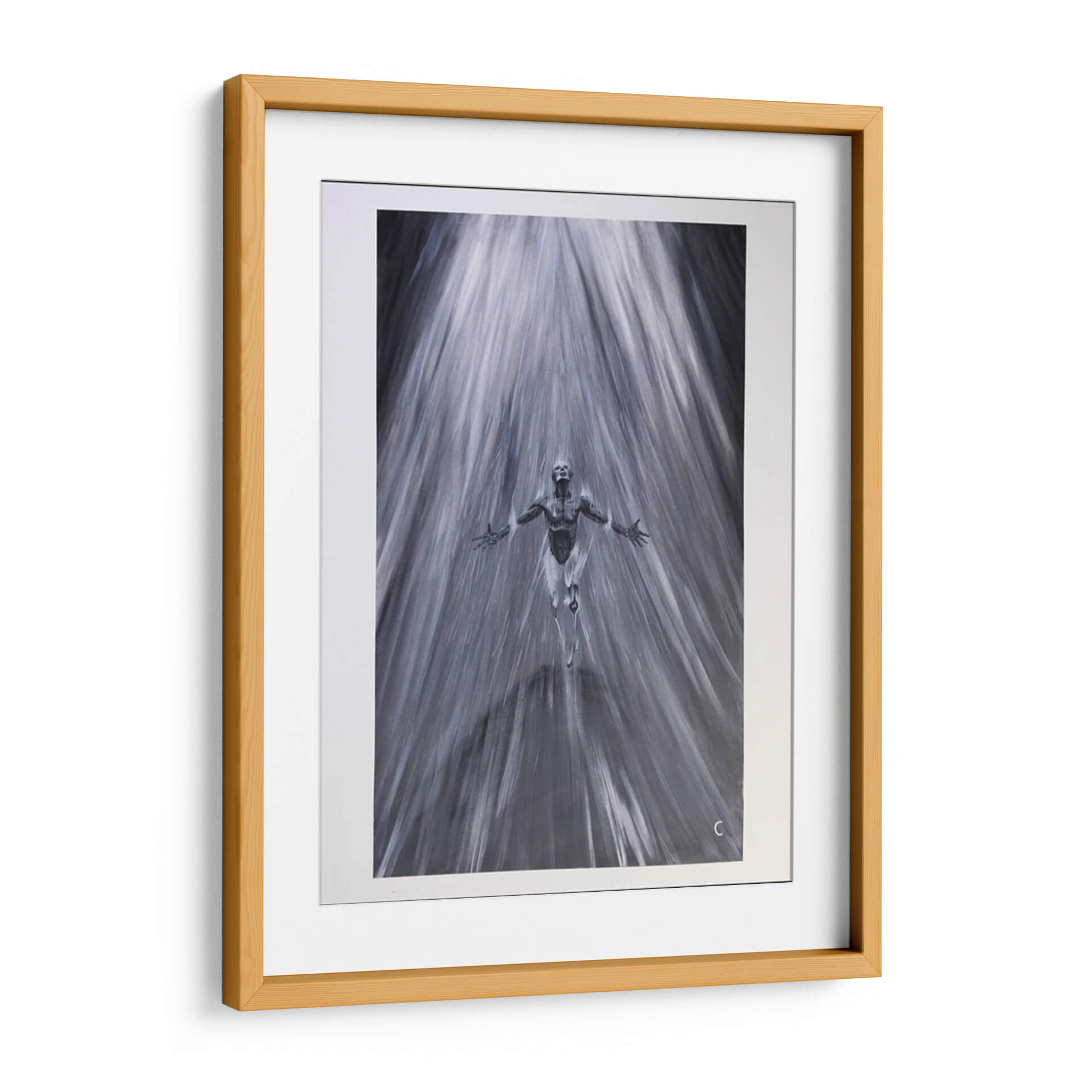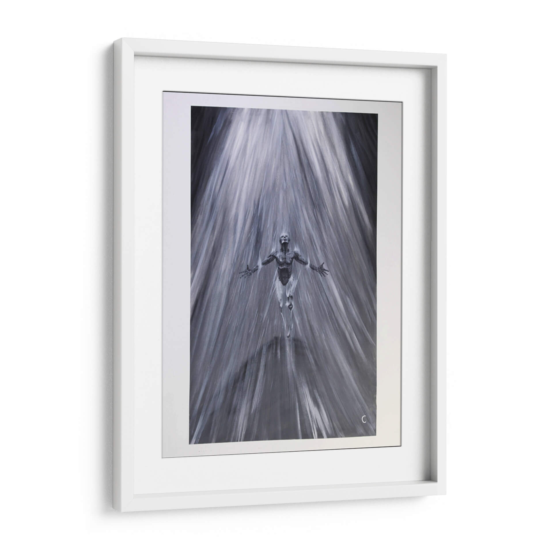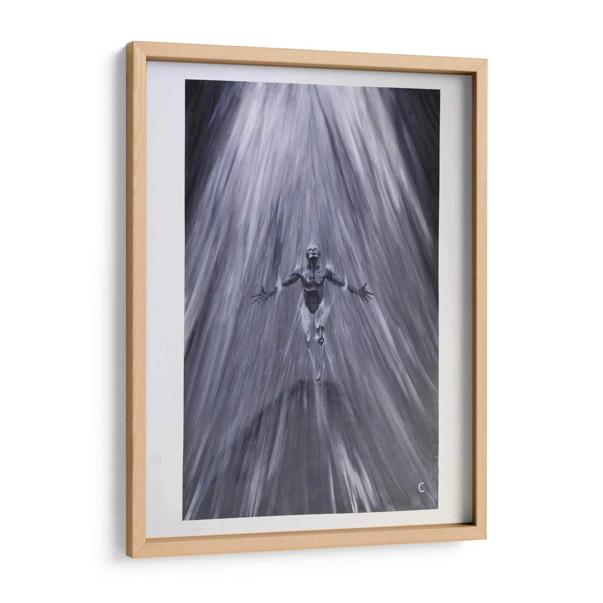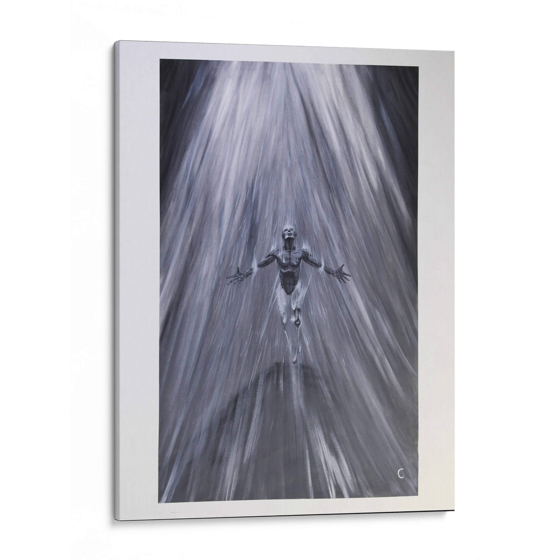 Sumérgete en la poderosa obra de arte "Depuración" de Christian Morales, una pieza que evoca una profunda sensación de liberación y transformación. La imagen presenta una figura humana etérea, suspendida en el centro, ascendiendo o descendiendo a través de un torrente de lo que parecen ser rayos de luz o agua purificadora. La paleta de colores se basa en una escala de grises y blancos, creando una atmósfera dramática y a la vez serena, que acentúa la pureza del momento. El estilo es figurativo con toques de abstracción en la representación del entorno, lo que añade un elemento de misterio y contemplación. La composición dirige la mirada hacia la figura central, enfatizando su vulnerabilidad y su fuerza espiritual. Este cuadro decorativo es ideal para espacios que buscan una conexión con lo trascendental, como un estudio personal, una sala de meditación o un recibidor moderno. "Depuración" invita a la reflexión sobre la introspección, el renacimiento y la superación personal, convirtiéndose en un punto focal inspirador que dialoga con el observador sobre su propio viaje interior. Añade una dimensión de profundidad y significado a tu decoración con esta obra única.