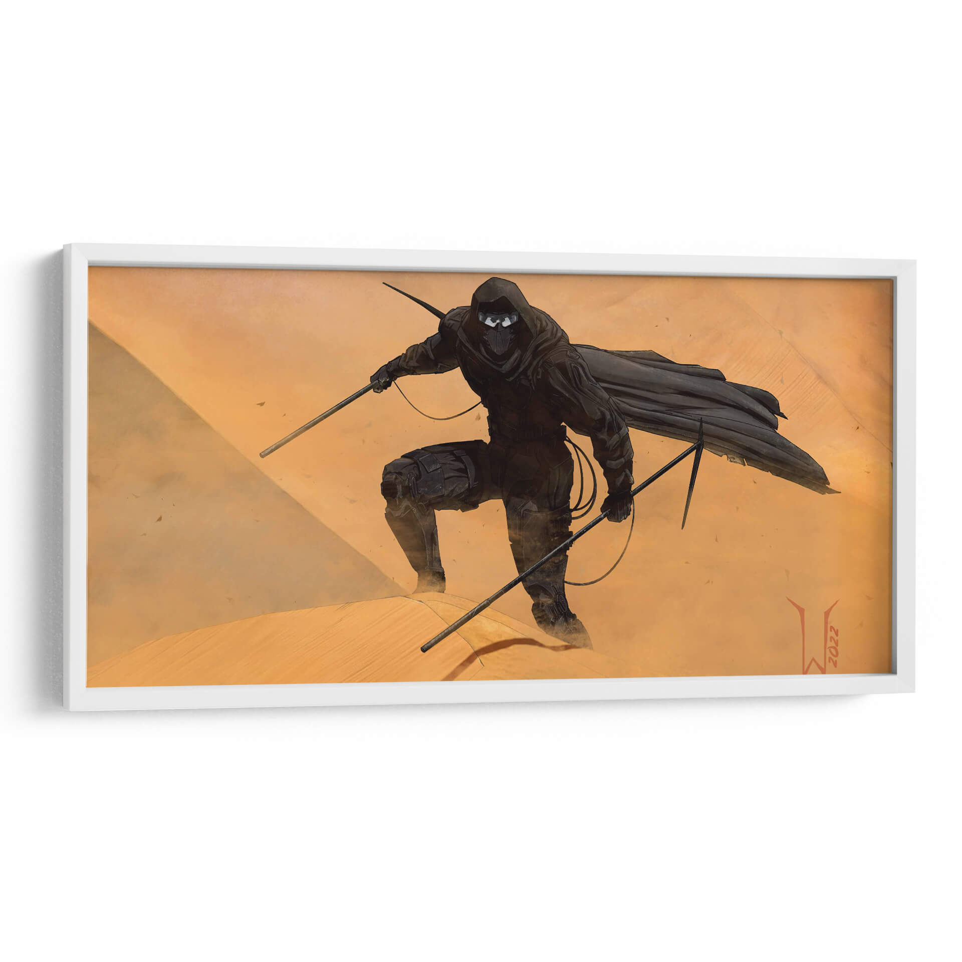 Sumérgete en el misterioso y desértico mundo de 'DUNE II' con este impactante cuadro decorativo. La obra presenta una figura solitaria, vestida con túnicas oscuras y una máscara que oculta su identidad, emergiendo de las dunas de arena bajo un cielo anaranjado y polvoriento. La composición dinámica y la paleta de colores cálidos dominada por tonos tierra crean una atmósfera de intriga y aventura, evocando la sensación de un viaje épico y solitario. Los detalles de la vestimenta y las armas sugieren un guerrero o explorador preparado para enfrentar los desafíos de un entorno hostil. Este cuadro es ideal para añadir un toque de dramatismo y misterio a tu sala de estar, estudio u oficina, convirtiéndose en un punto focal que invita a la contemplación. Su estilo artístico, que combina elementos de fantasía y realismo, lo hace perfecto para coleccionistas y entusiastas de historias de ciencia ficción y mundos exóticos. Dale vida a tus paredes con esta pieza única que evoca la fuerza y la resiliencia ante la adversidad, un verdadero testimonio de exploración y supervivencia en paisajes inhóspitos.