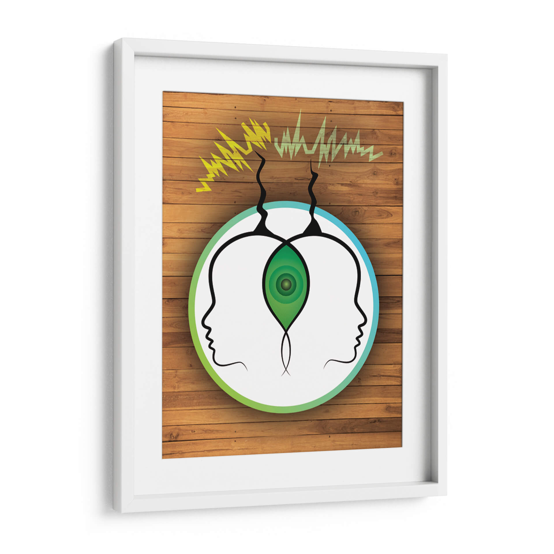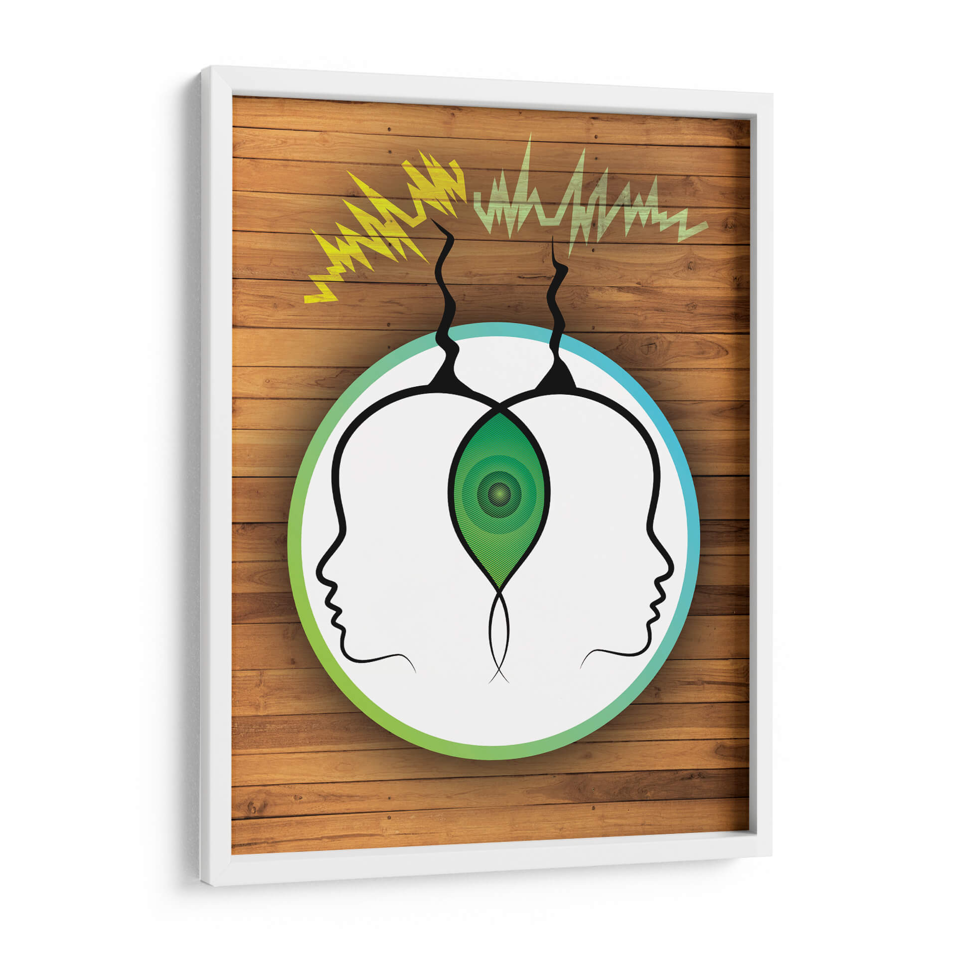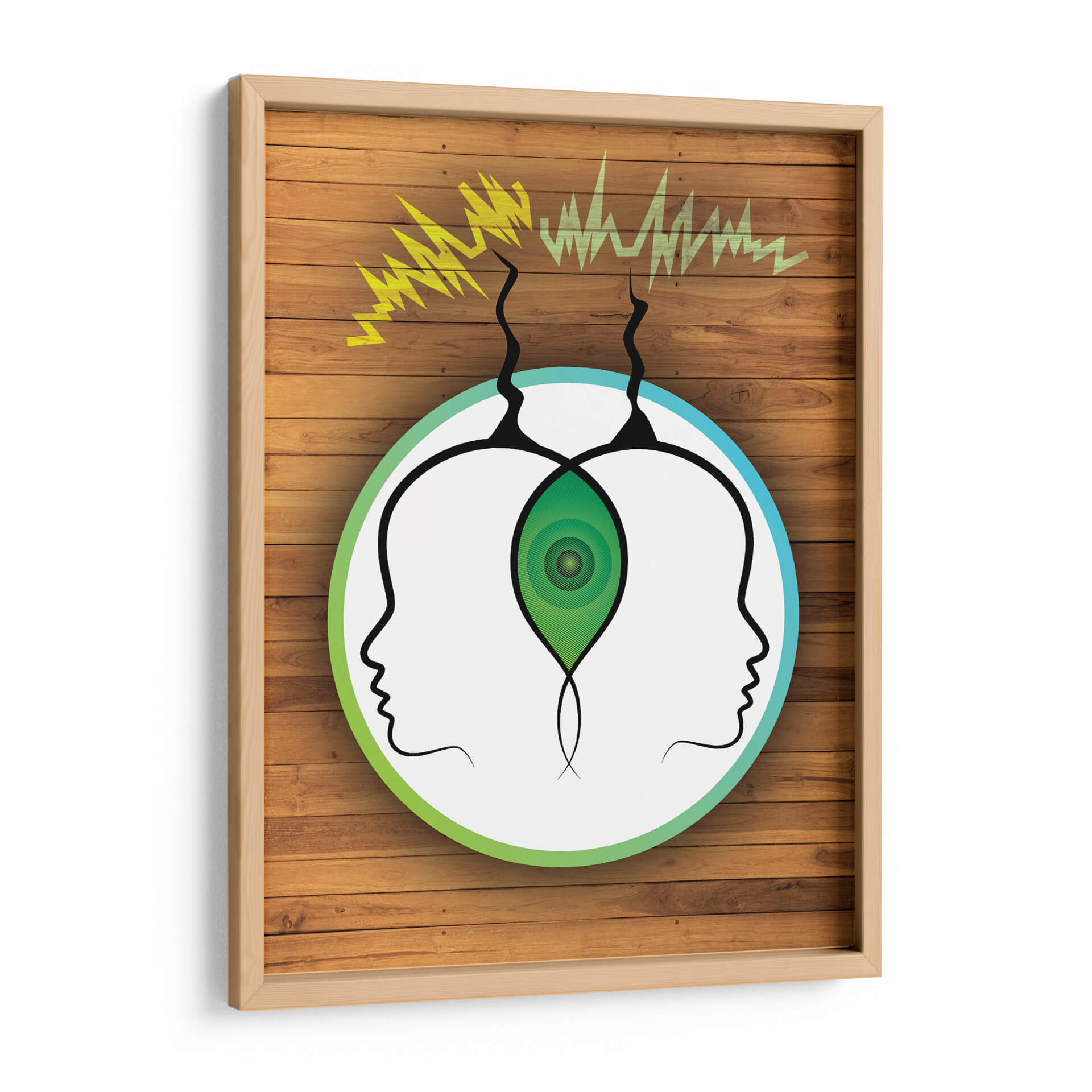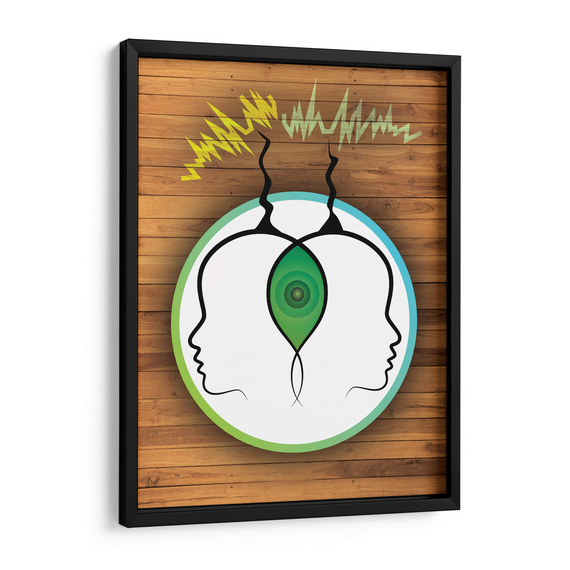 Sumérgete en la misteriosa conexión entre mentes con "Frecuencia Telepática", una obra de arte visualmente cautivadora de Homo Cosmicam. Este cuadro decorativo presenta dos perfiles de cabeza abstractos, enmarcados por un círculo que transita del verde vibrante al azul sereno, sugiriendo un canal de comunicación etéreo. Ondas de energía amarilla y verde emergen de la parte superior, simbolizando la transmisión de pensamientos e ideas, mientras que un núcleo verde concéntrico en el centro, entre las dos cabezas, representa un punto de conexión o entendimiento profundo. La composición minimalista, sobre un fondo que imita la textura cálida de la madera, crea un contraste intrigante, atrayendo la mirada hacia el concepto central de la telepatía. "Frecuencia Telepática" es ideal para quienes buscan añadir un toque de intriga intelectual y un diálogo visual a sus espacios, ya sea una oficina moderna, un estudio o una sala de estar contemporánea. Esta pieza invita a la reflexión sobre la comunicación no verbal y la interconexión humana, convirtiéndose en un punto focal que inspira conversaciones y curiosidad. Es una adición única para coleccionistas de arte contemporáneo y para aquellos que aprecian el arte conceptual con un diseño limpio y moderno. Añade esta obra maestra a tu colección y deja que su energía única transforme tu entorno.