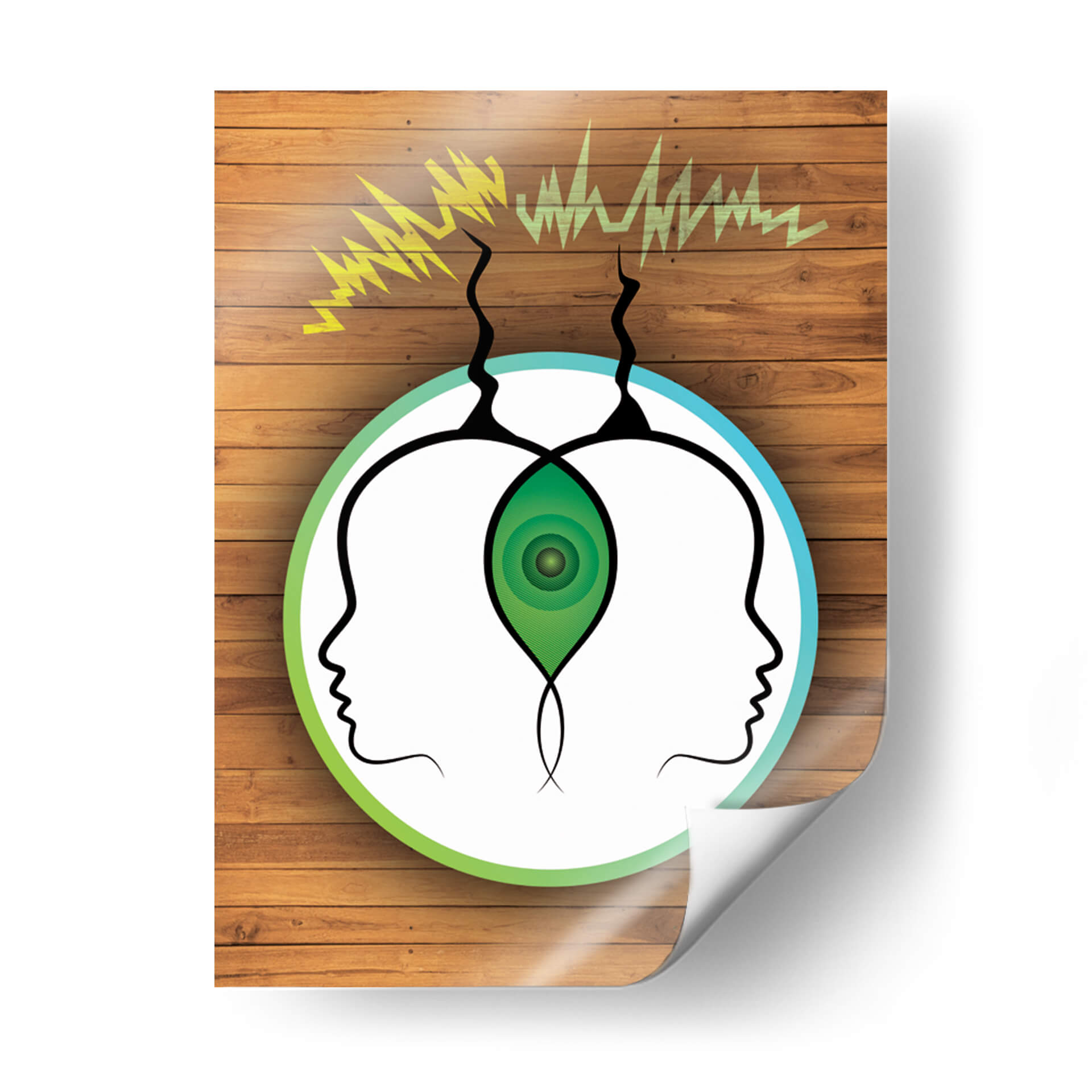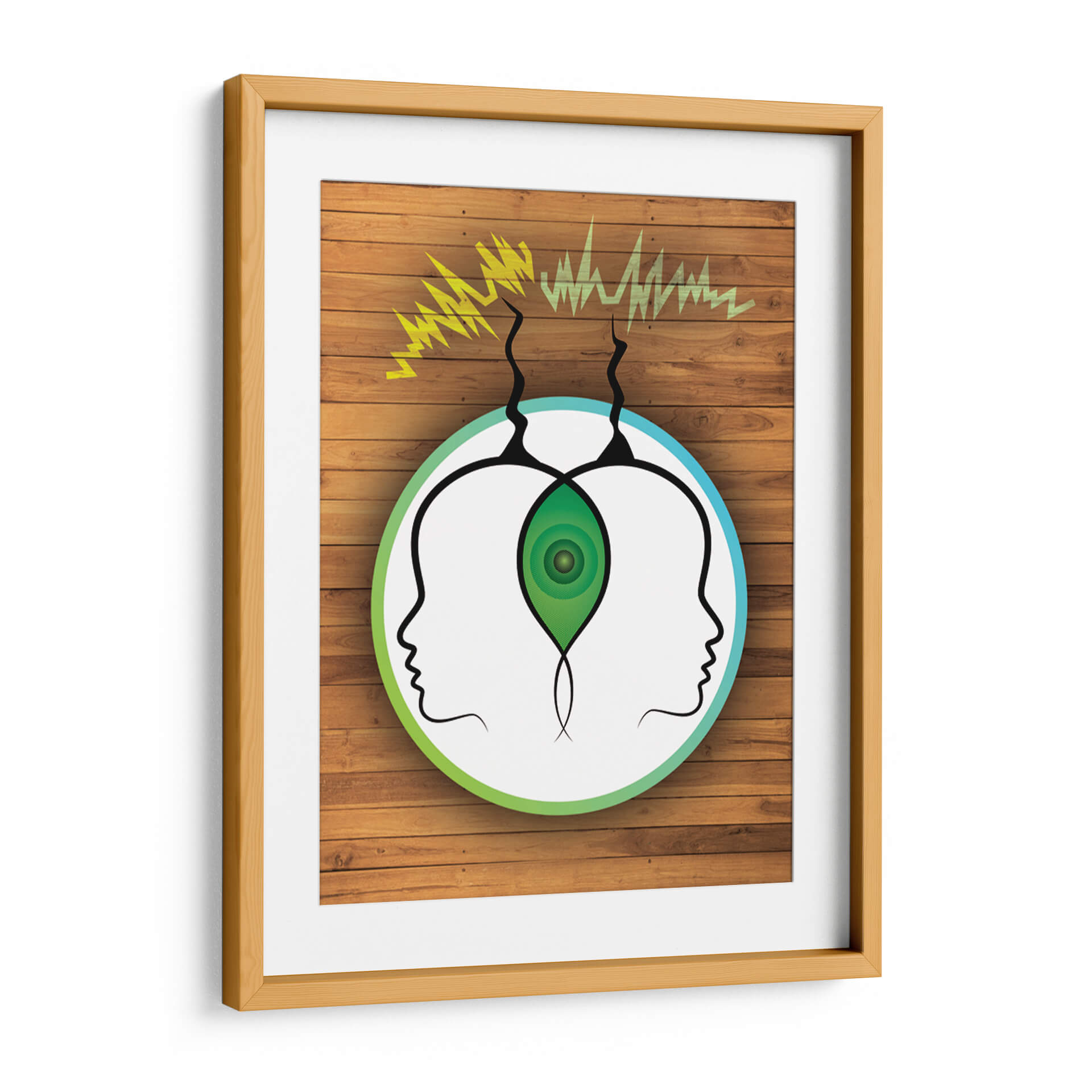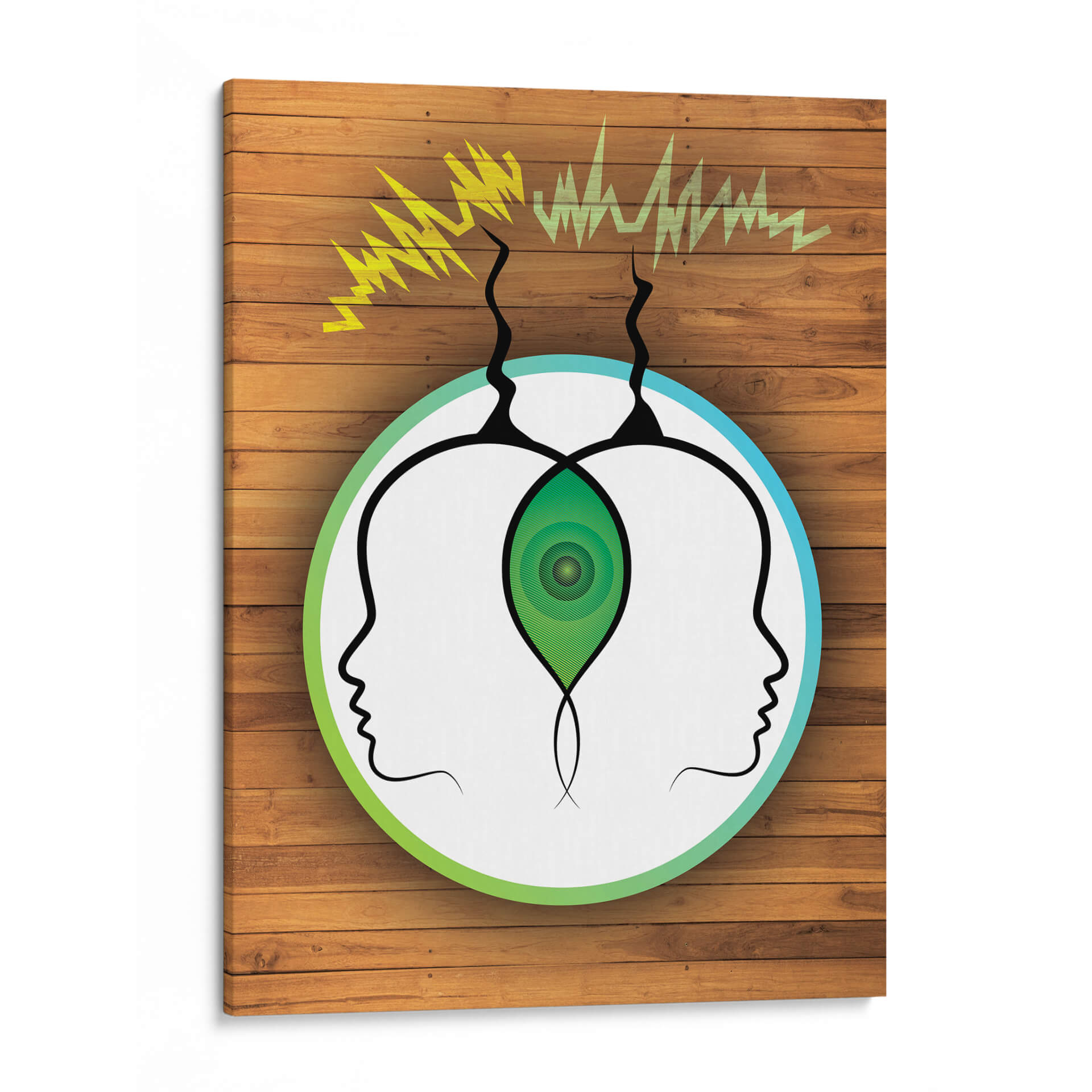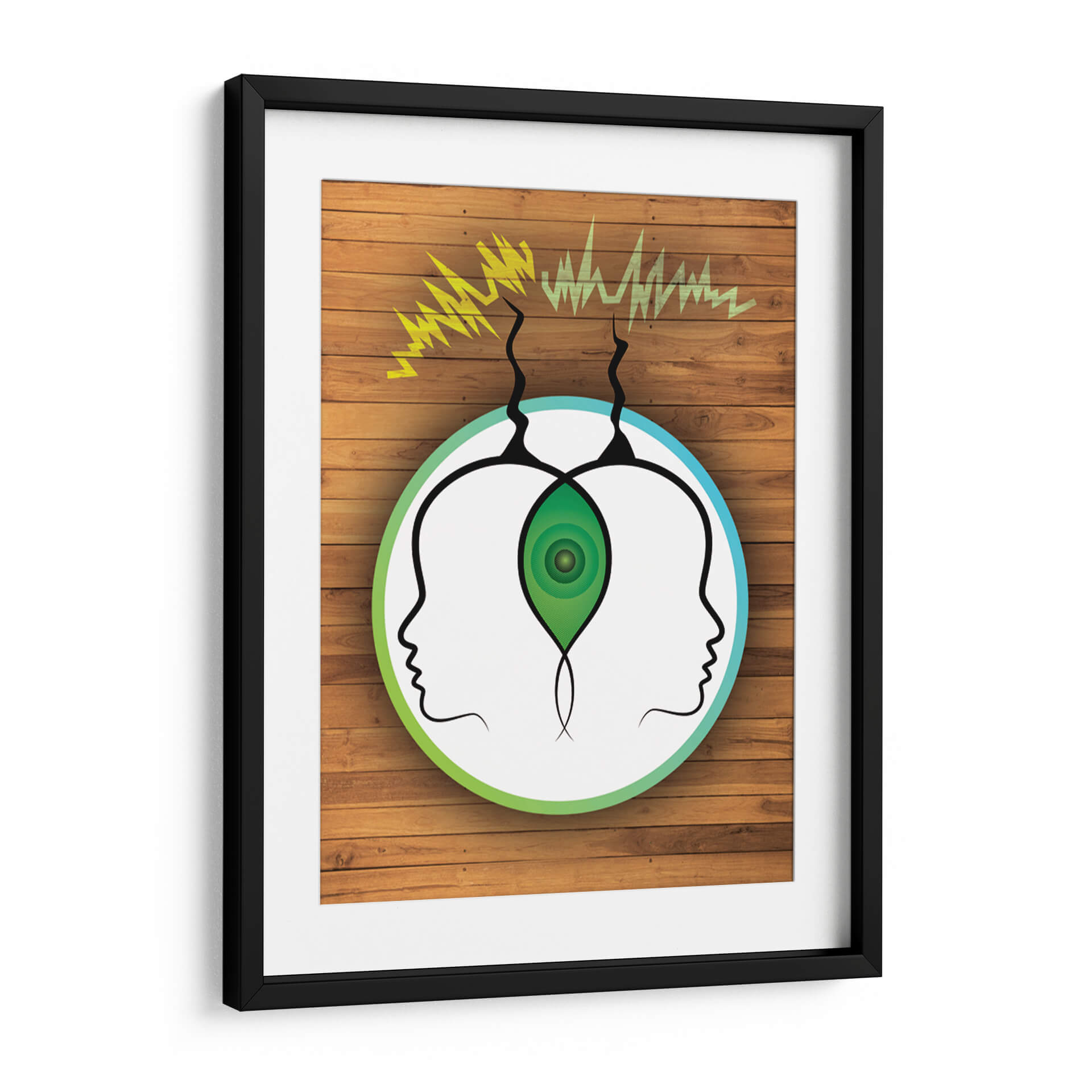 Sumérgete en la misteriosa conexión entre mentes con "Frecuencia Telepática", una obra de arte visualmente cautivadora de Homo Cosmicam. Este cuadro decorativo presenta dos perfiles de cabeza abstractos, enmarcados por un círculo que transita del verde vibrante al azul sereno, sugiriendo un canal de comunicación etéreo. Ondas de energía amarilla y verde emergen de la parte superior, simbolizando la transmisión de pensamientos e ideas, mientras que un núcleo verde concéntrico en el centro, entre las dos cabezas, representa un punto de conexión o entendimiento profundo. La composición minimalista, sobre un fondo que imita la textura cálida de la madera, crea un contraste intrigante, atrayendo la mirada hacia el concepto central de la telepatía. "Frecuencia Telepática" es ideal para quienes buscan añadir un toque de intriga intelectual y un diálogo visual a sus espacios, ya sea una oficina moderna, un estudio o una sala de estar contemporánea. Esta pieza invita a la reflexión sobre la comunicación no verbal y la interconexión humana, convirtiéndose en un punto focal que inspira conversaciones y curiosidad. Es una adición única para coleccionistas de arte contemporáneo y para aquellos que aprecian el arte conceptual con un diseño limpio y moderno. Añade esta obra maestra a tu colección y deja que su energía única transforme tu entorno.
