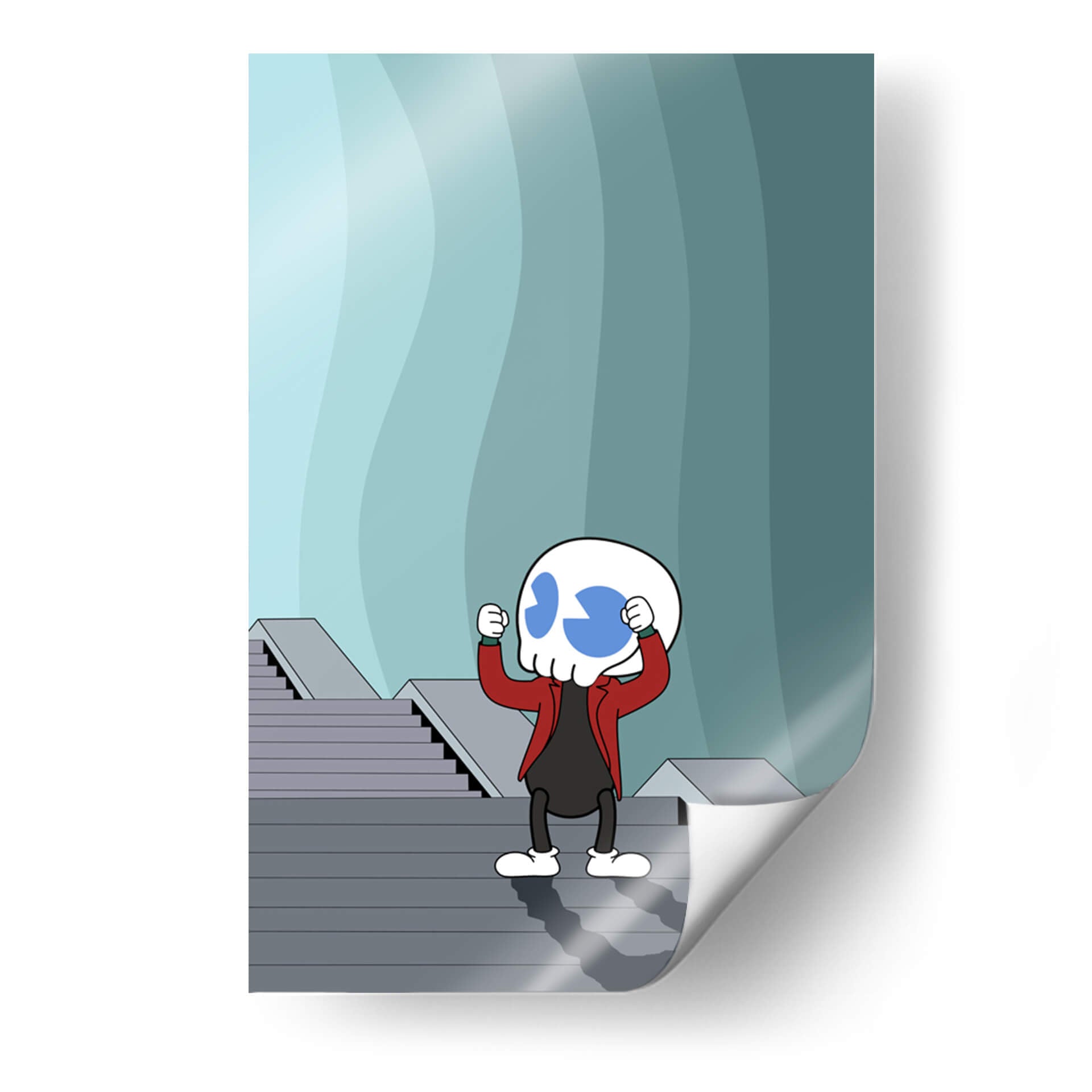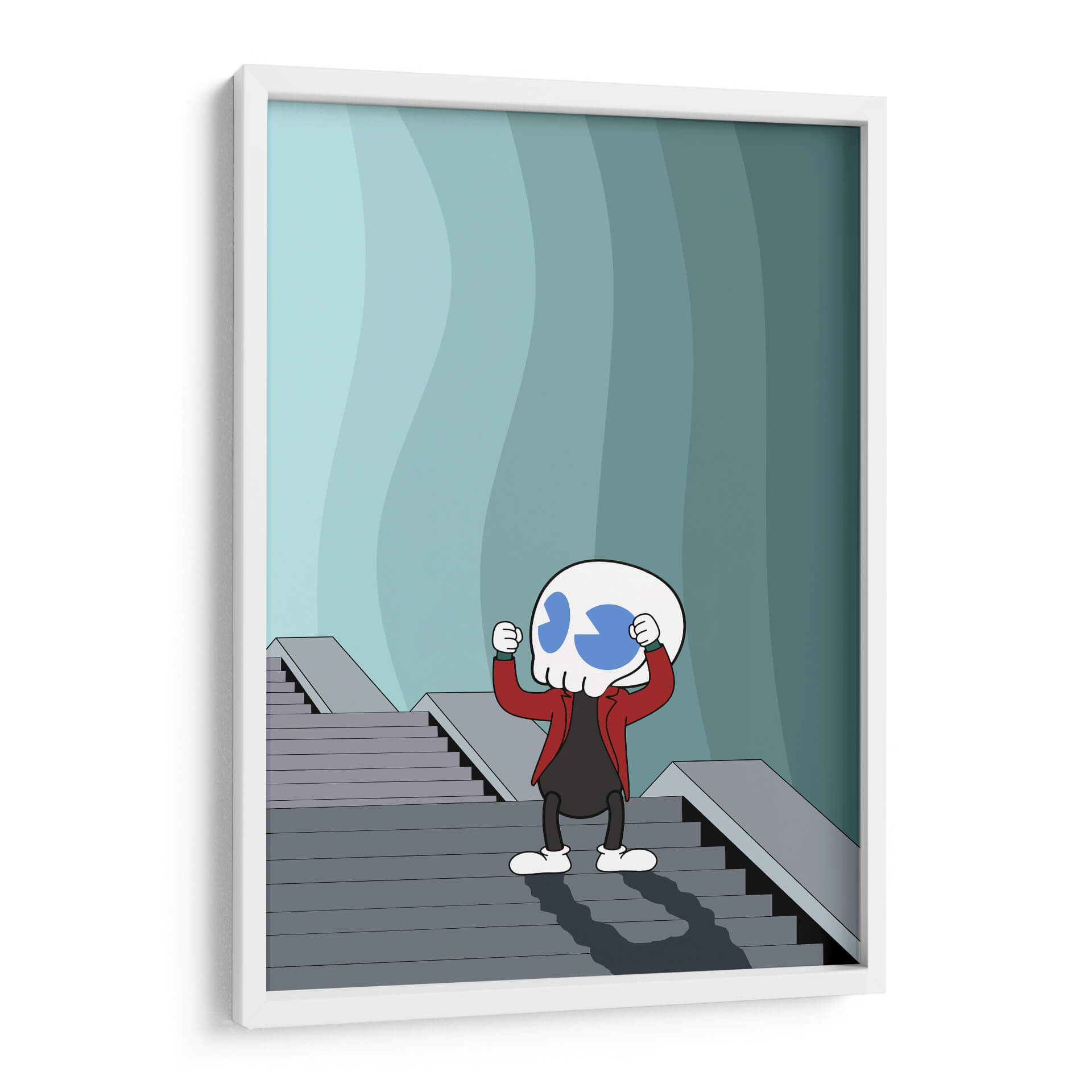 Sumérgete en la enigmática obra "Kullws Joker Green" de Khevth Art, una pieza de arte contemporáneo que desafía las convenciones y estimula la imaginación. Este cuadro decorativo presenta una figura estilizada con cabeza de calavera, adornada con dos grandes círculos azules que evocan una expresión sorprendida o juguetona. Viste una chaqueta roja vibrante sobre una vestimenta oscura, creando un contraste llamativo. La figura se alza sobre una escalera geométrica de tonos grises, que asciende hacia un fondo abstracto de ondulaciones en degradado de azul verdoso y gris. La composición juega con las líneas rectas de la escalera frente a las curvas suaves del fondo, generando una dinámica visual intrigante. La paleta de colores, dominada por los tonos fríos del fondo y la frialdad de la figura, se ve interrumpida por el acento cálido de la chaqueta roja, lo que añade un toque de audacia y energía. Esta obra es ideal para aquellos que buscan un toque de surrealismo y humor negro en su decoración. Perfecta para salones modernos, oficinas creativas o cualquier espacio que desee un elemento de conversación único y lleno de personalidad. "Kullws Joker Green" no es solo una imagen, es una invitación a reflexionar sobre la dualidad y la expresión en el arte contemporáneo.