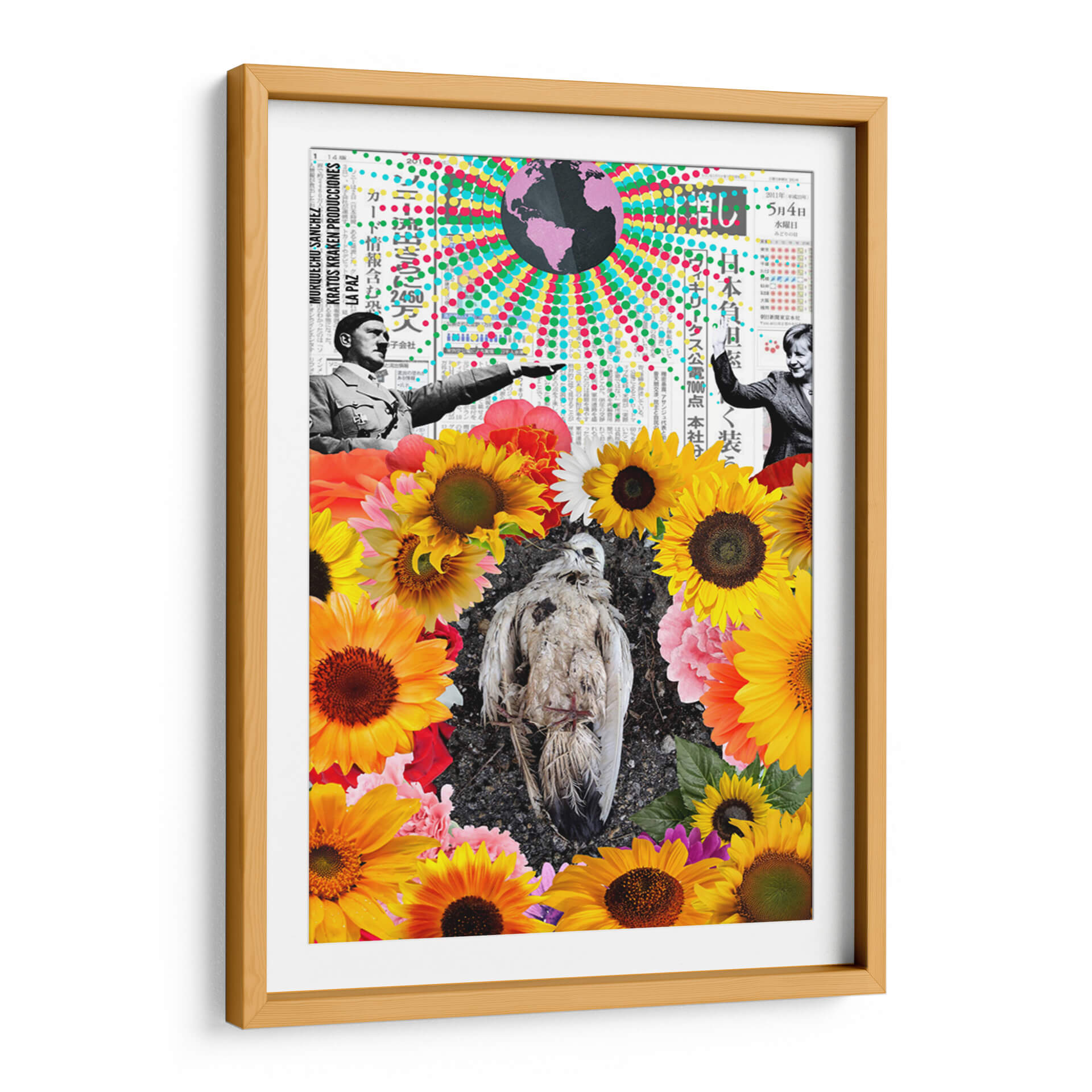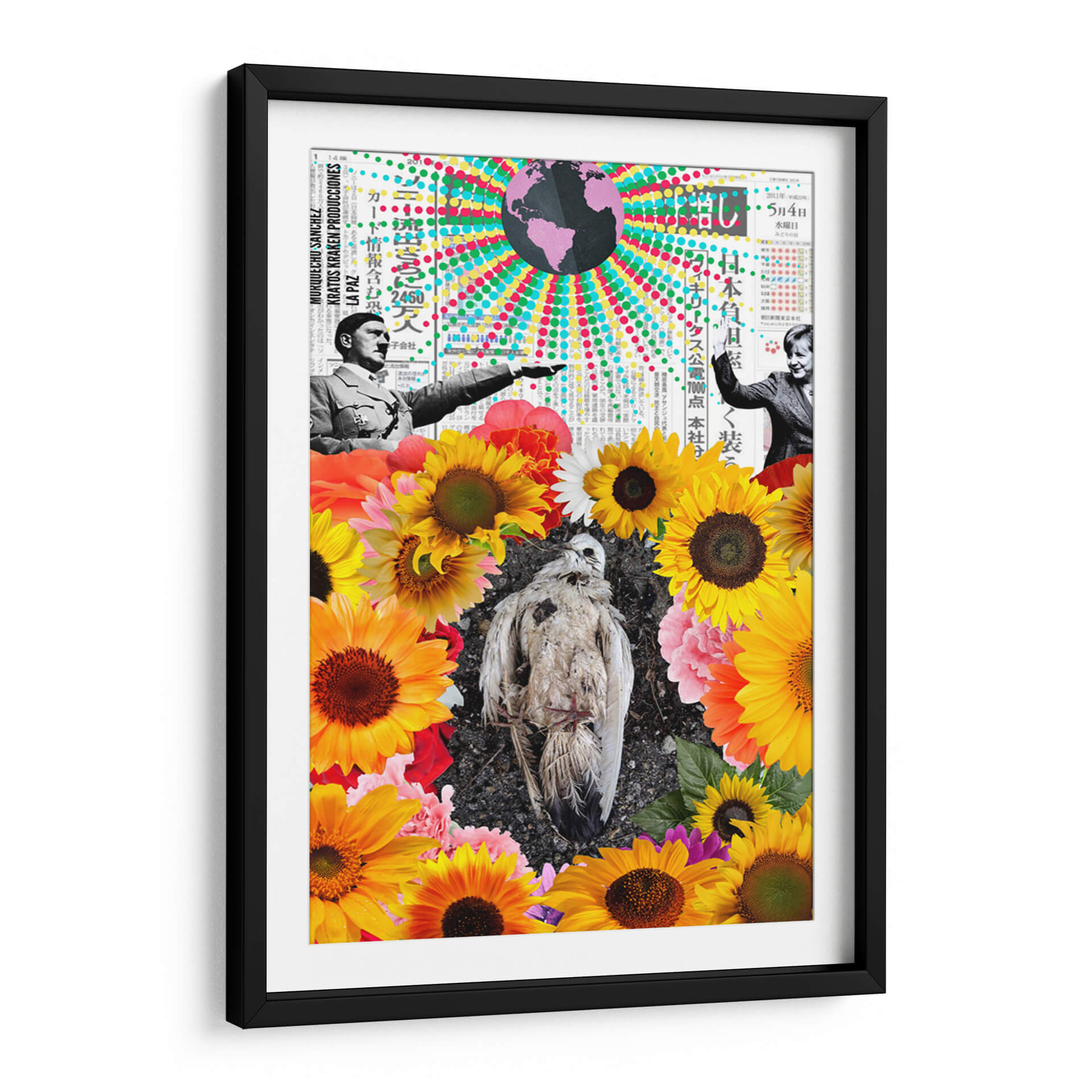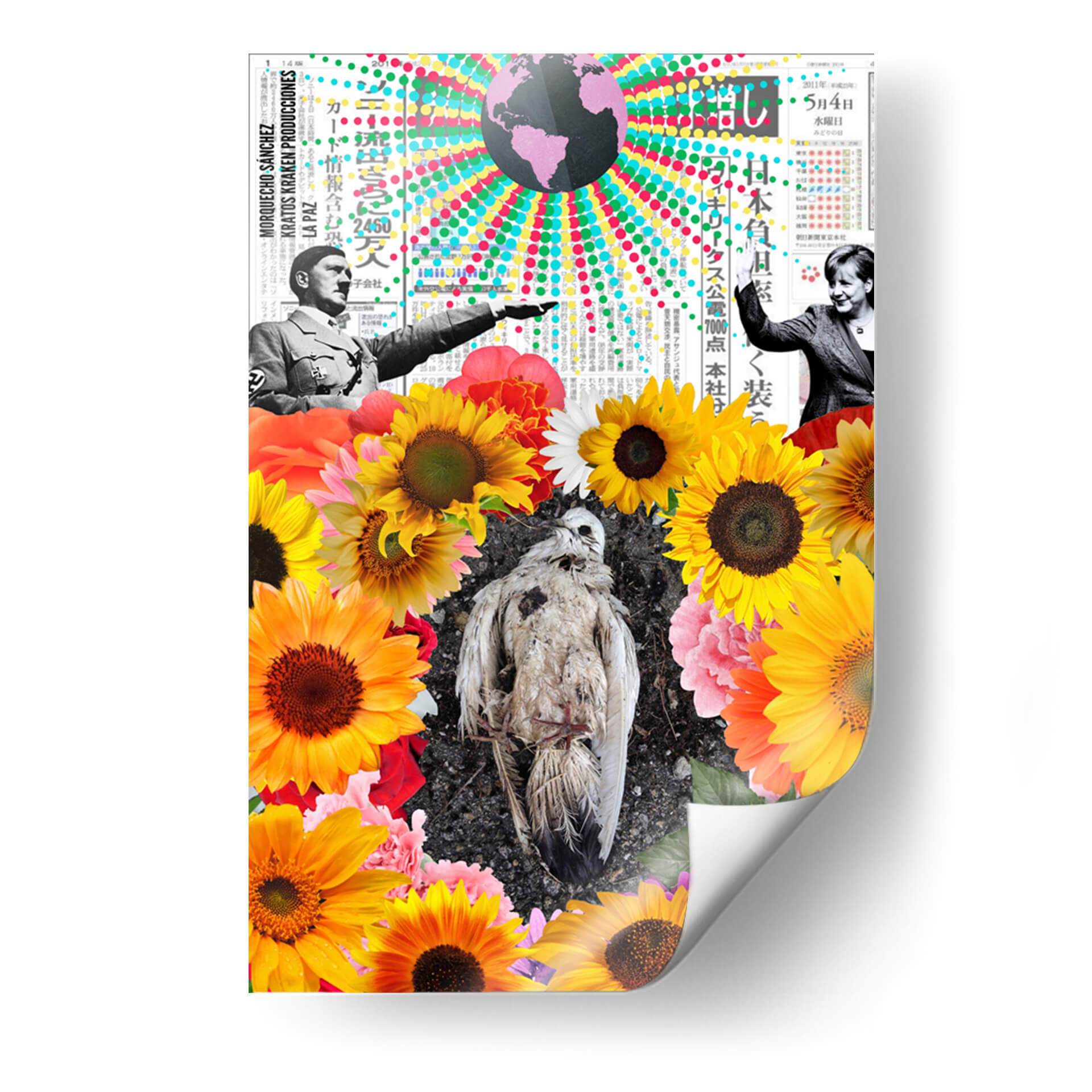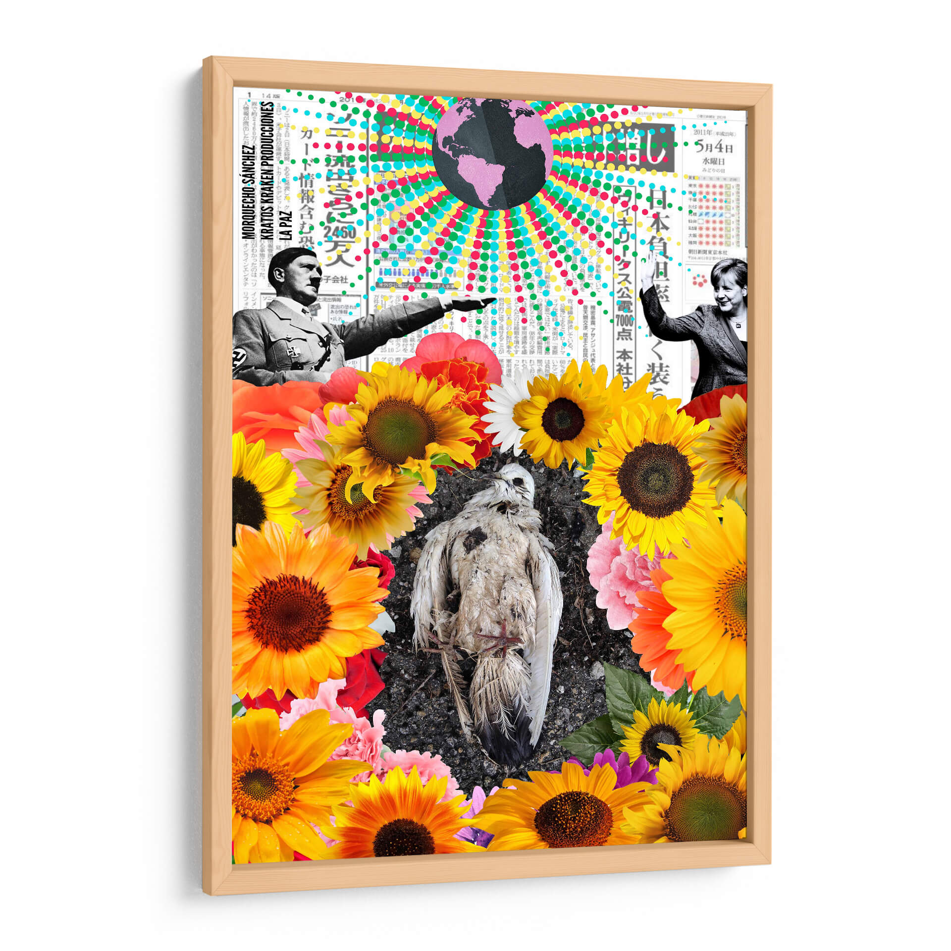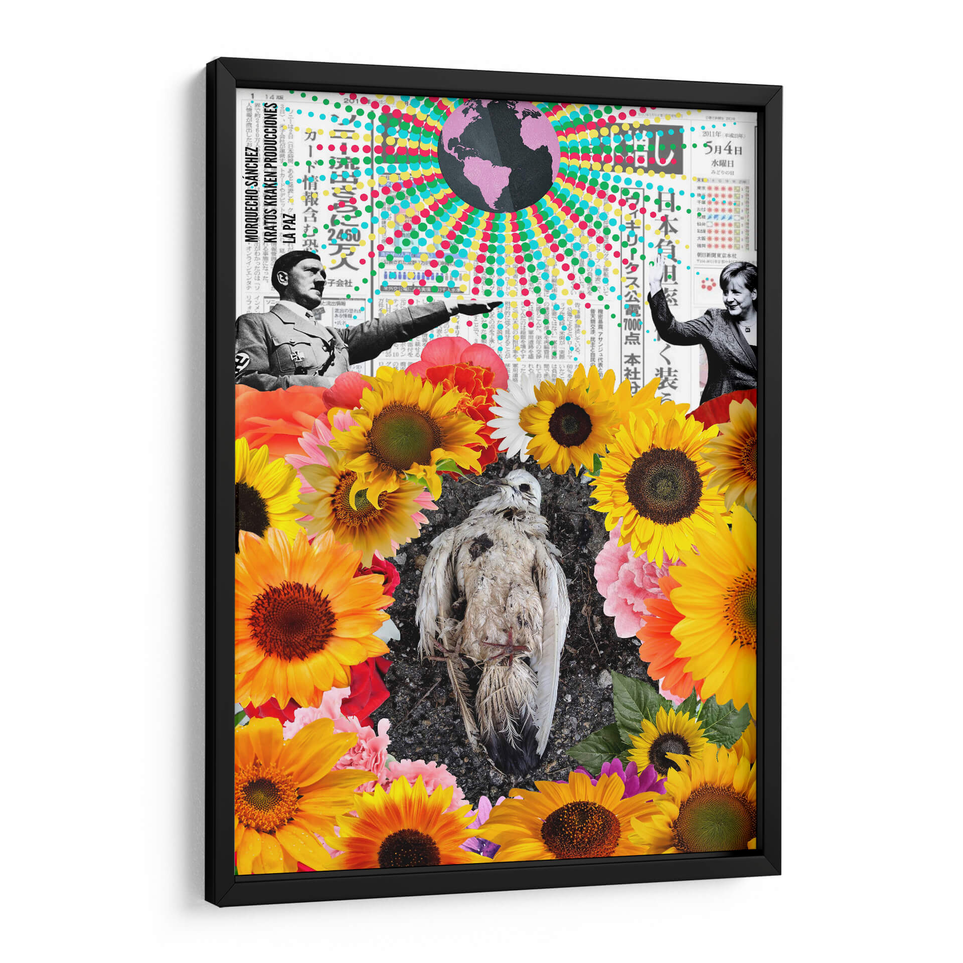 Sumérgete en la complejidad visual de "La Paz", una obra de arte contemporáneo que desafía las percepciones y provoca la reflexión. Este cuadro decorativo, del artista Morquecho Sánchez, es un collage impactante que entrelaza elementos históricos y naturales. En su centro, un ave en descomposición reposa sobre un lecho de vibrantes girasoles y otras flores, creando un contraste agudo entre la fragilidad de la vida y la exuberancia de la naturaleza. En la parte superior, imágenes históricas y texto en japonés sugieren un trasfondo de eventos globales y comunicación. La paleta de colores, rica y variada, va desde los tonos cálidos y alegres de las flores hasta los grises y blancos del ave, pasando por un globo terráqueo en tonos púrpuras y arcoíris que añade un toque surrealista. La composición es audaz, invitando al espectador a descifrar las múltiples capas de significado. "La Paz" es ideal para espacios que buscan un punto focal intrigante y que inviten a la conversación, aportando una dosis de arte conceptual y provocador a cualquier decoración moderna, ya sea en una sala de estar, estudio u oficina.