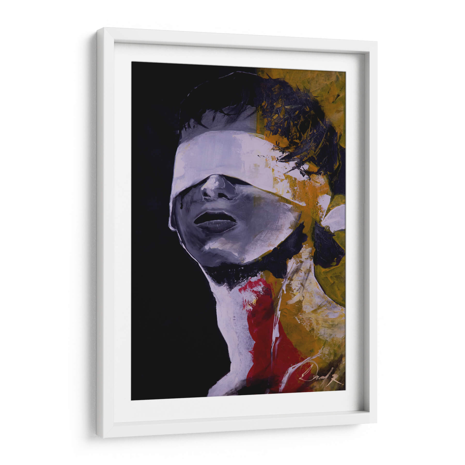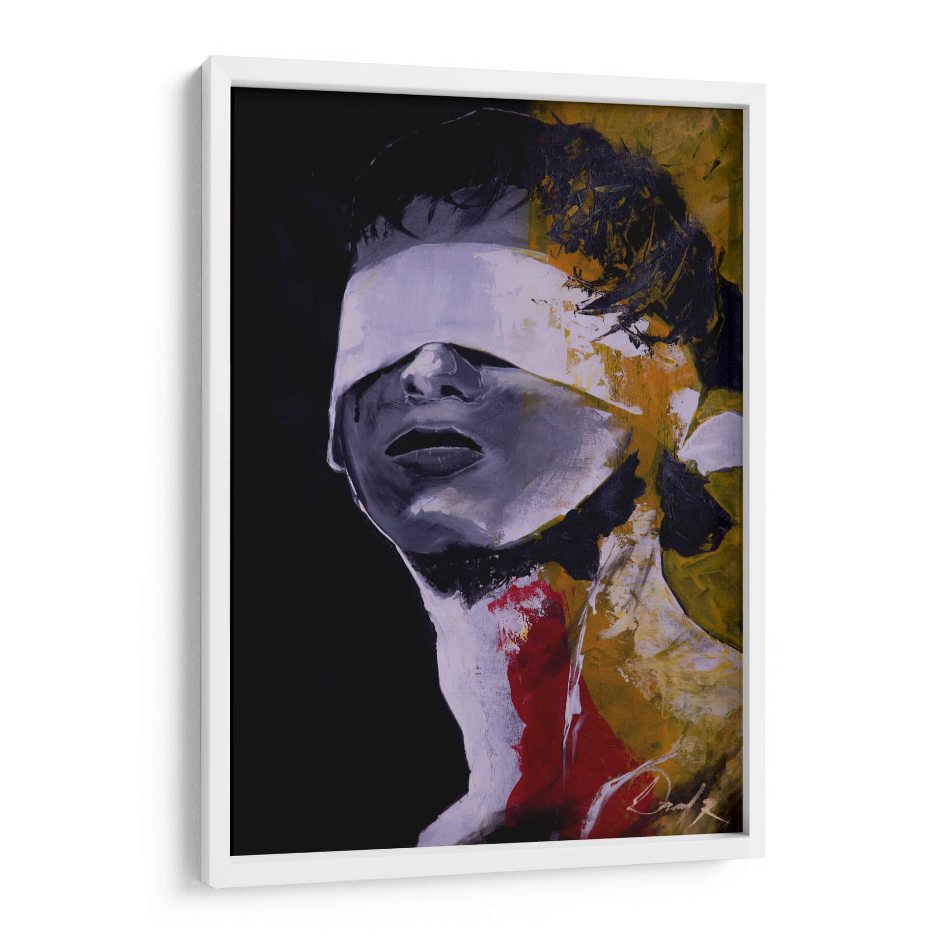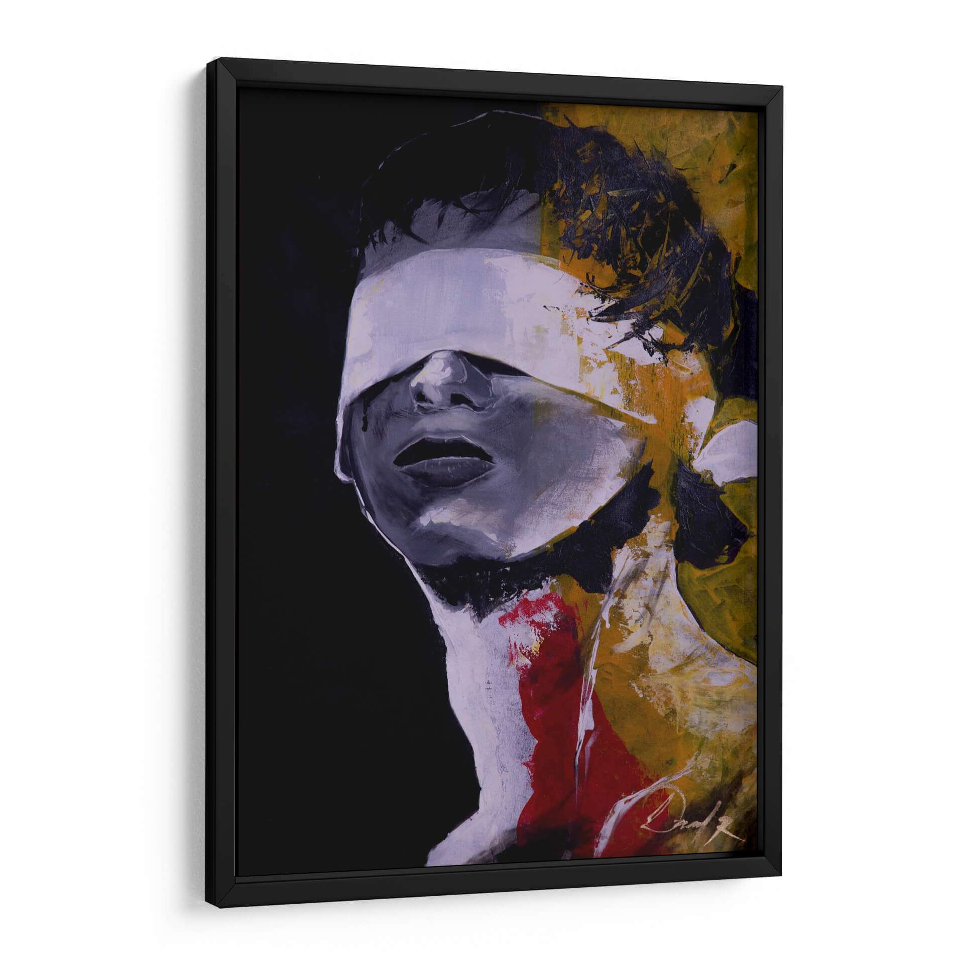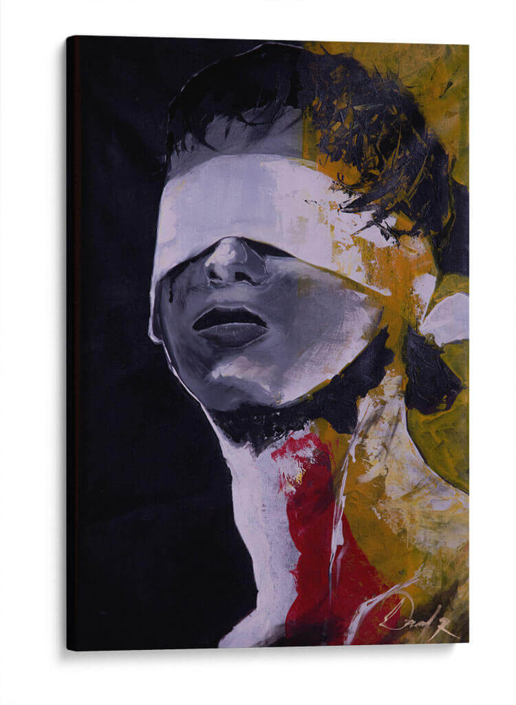 Sumérgete en la profunda introspección que ofrece el cuadro decorativo "Mordaza" de David Ríos. Esta obra de arte contemporáneo captura un rostro femenino con los ojos vendados, invitando a la reflexión sobre la percepción, la vulnerabilidad y la libertad interior. La paleta de colores, dominada por contrastes dramáticos entre el negro profundo, grises, blancos y vibrantes toques de amarillo y rojo, crea una atmósfera cargada de emoción y misterio. La técnica expresionista, con pinceladas audaces y texturas visibles, añade una dimensión visceral a la pieza, haciendo que cada detalle sea una invitación a la contemplación. "Mordaza" es más que una imagen; es una experiencia emocional que puede transformar cualquier espacio, desde un sereno dormitorio hasta una sala de estar que busca un punto focal intrigante. Ideal para aquellos que aprecian el arte con profundidad psicológica y un toque de audacia expresiva, este cuadro decorativo se convierte en un diálogo silencioso entre la obra y el espectador, aportando carácter y personalidad a tu decoración.