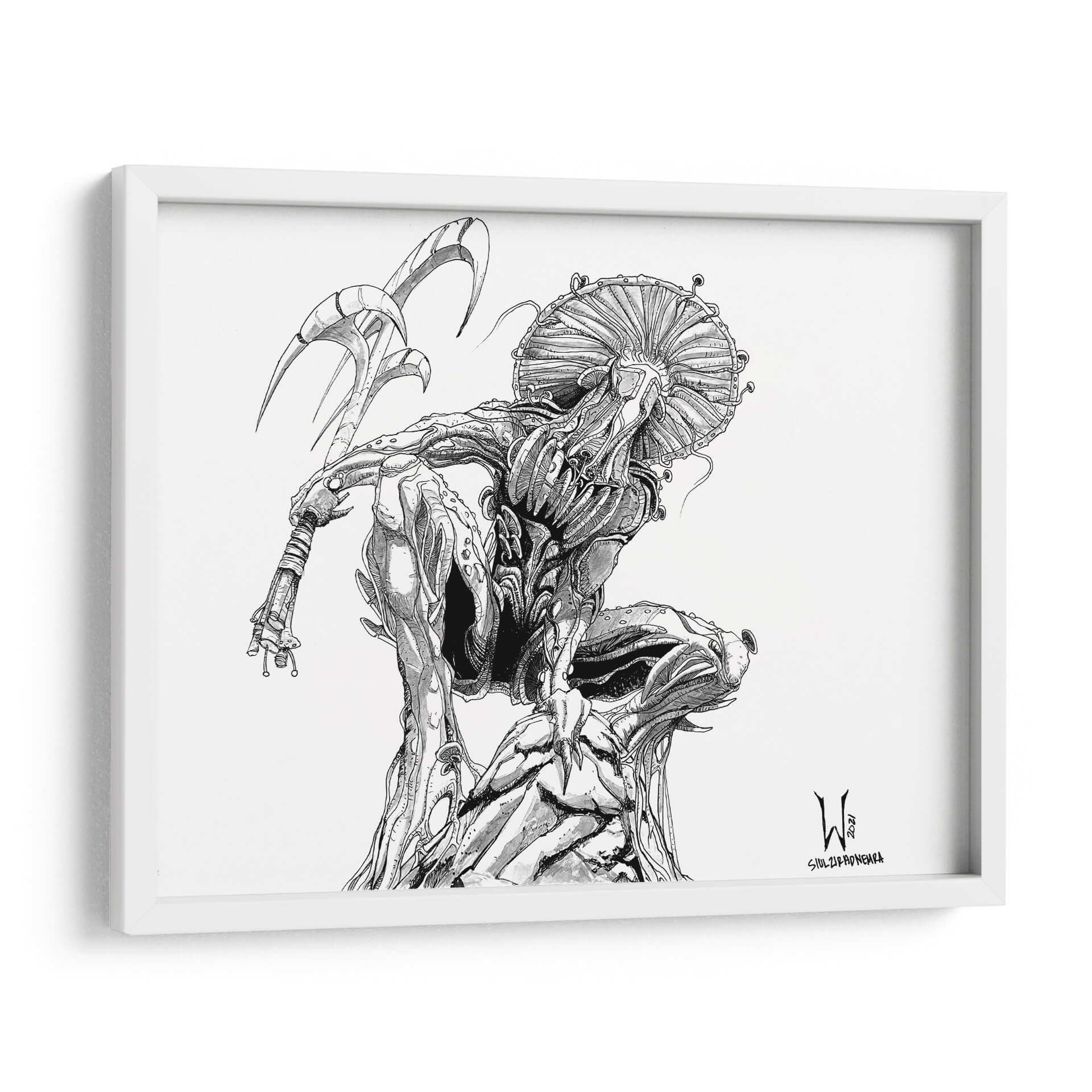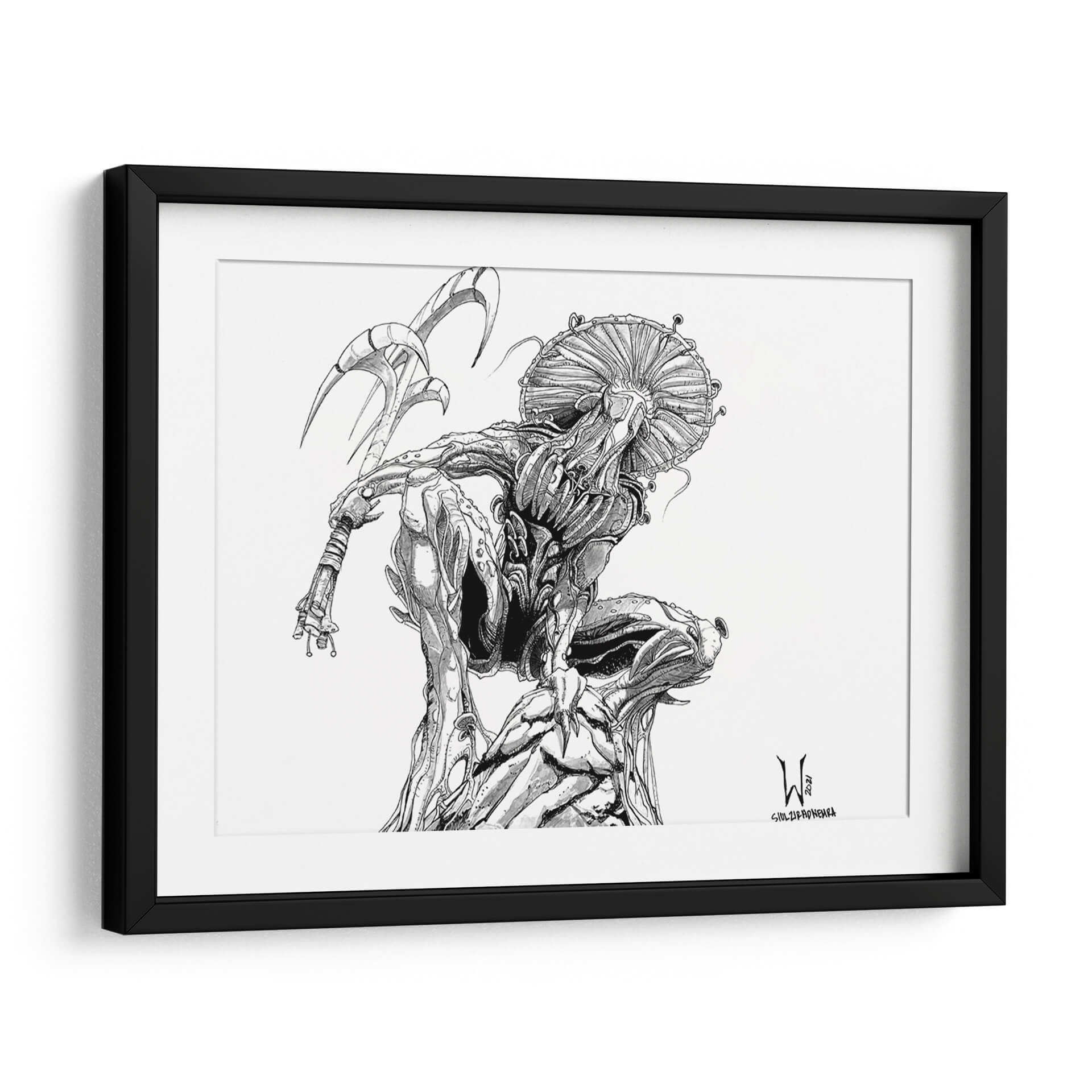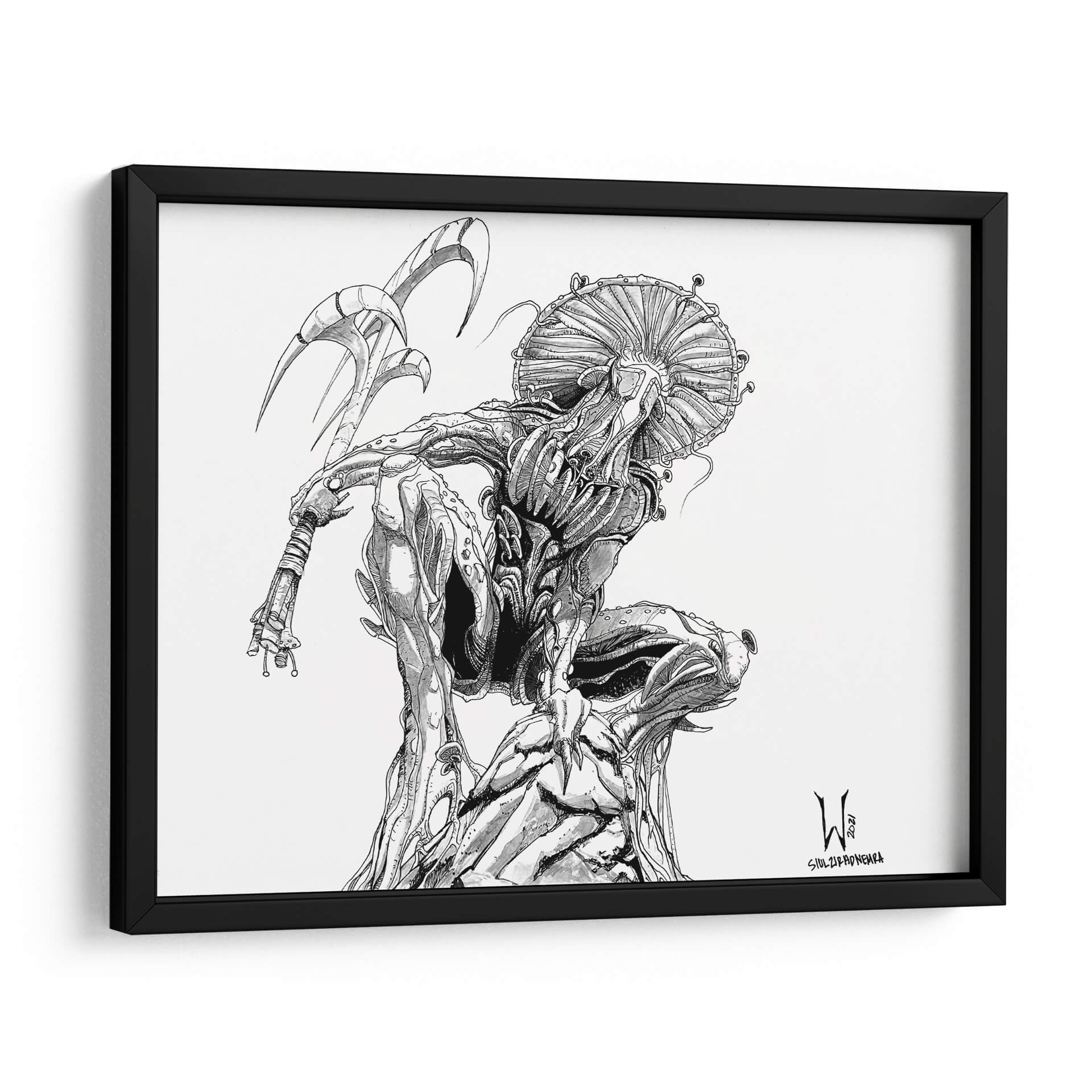 Adéntrate en un universo de fantasía y misterio con "MUSHROOM", una obra de arte digital que captura la imaginación con su intrincado diseño y su atmósfera enigmática. Esta pieza, creada por el artista siulziradnemra, presenta una figura biomecánica o fantástica, reminiscente de un hongo estilizado, posada sobre estructuras orgánicas que parecen crecer y entrelazarse. La técnica de dibujo a tinta, con un detallado uso de sombreado y líneas finas, otorga una profundidad y textura impresionantes, creando un juego de luces y sombras que añade dramatismo a la composición. Los tonos monocromáticos intensifican la sensación de surrealismo y lo onírico, haciendo que el espectador se pierda en los detalles y las formas orgánicas que componen la figura principal. Es una pieza ideal para quienes buscan un cuadro decorativo que sea a la vez provocador y estéticamente fascinante, perfecto para añadir un toque de originalidad y carácter a un estudio, una sala de estar moderna o un espacio que requiera una declaración visual audaz. "MUSHROOM" no es solo una obra de arte, sino una invitación a explorar lo desconocido y a celebrar la creatividad sin límites del arte contemporáneo.