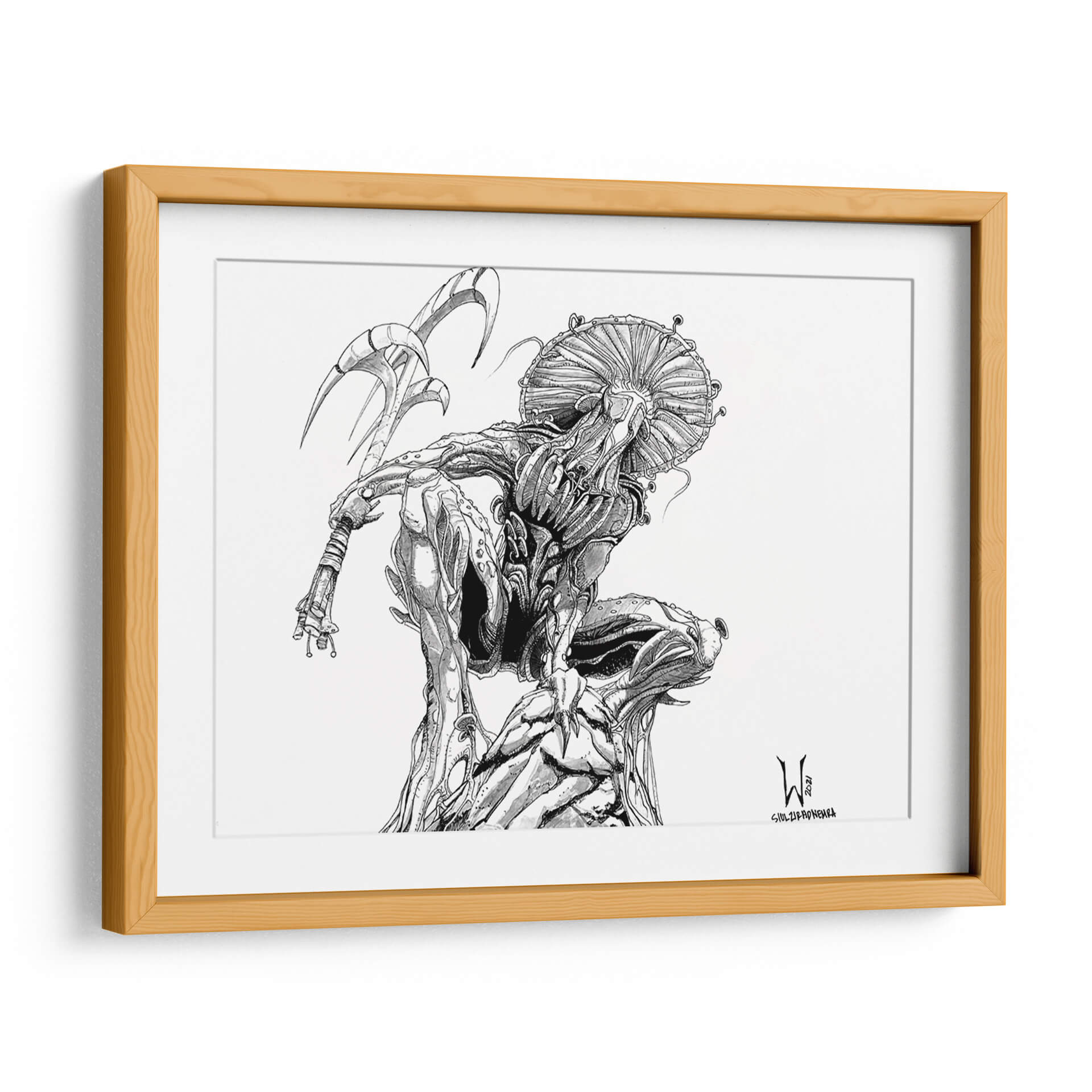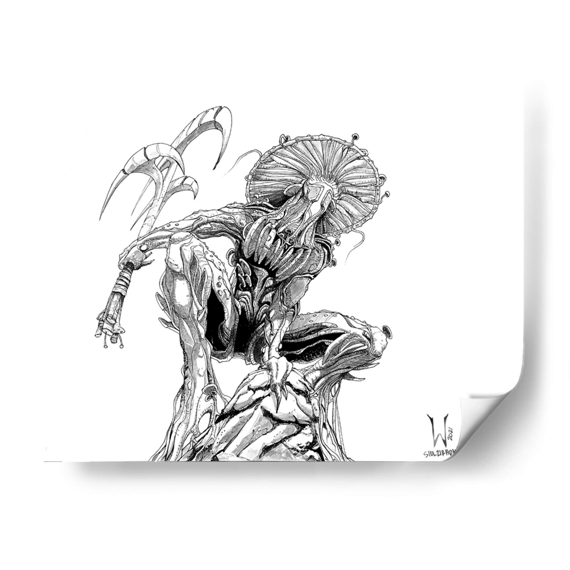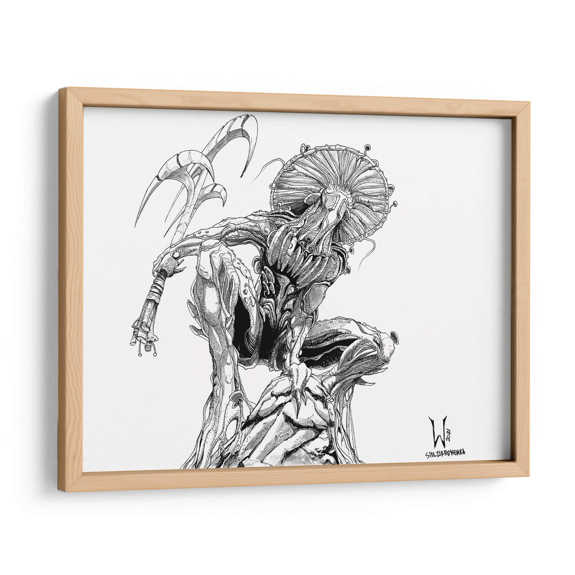 Adéntrate en un universo de fantasía y misterio con "MUSHROOM", una obra de arte digital que captura la imaginación con su intrincado diseño y su atmósfera enigmática. Esta pieza, creada por el artista siulziradnemra, presenta una figura biomecánica o fantástica, reminiscente de un hongo estilizado, posada sobre estructuras orgánicas que parecen crecer y entrelazarse. La técnica de dibujo a tinta, con un detallado uso de sombreado y líneas finas, otorga una profundidad y textura impresionantes, creando un juego de luces y sombras que añade dramatismo a la composición. Los tonos monocromáticos intensifican la sensación de surrealismo y lo onírico, haciendo que el espectador se pierda en los detalles y las formas orgánicas que componen la figura principal. Es una pieza ideal para quienes buscan un cuadro decorativo que sea a la vez provocador y estéticamente fascinante, perfecto para añadir un toque de originalidad y carácter a un estudio, una sala de estar moderna o un espacio que requiera una declaración visual audaz. "MUSHROOM" no es solo una obra de arte, sino una invitación a explorar lo desconocido y a celebrar la creatividad sin límites del arte contemporáneo.