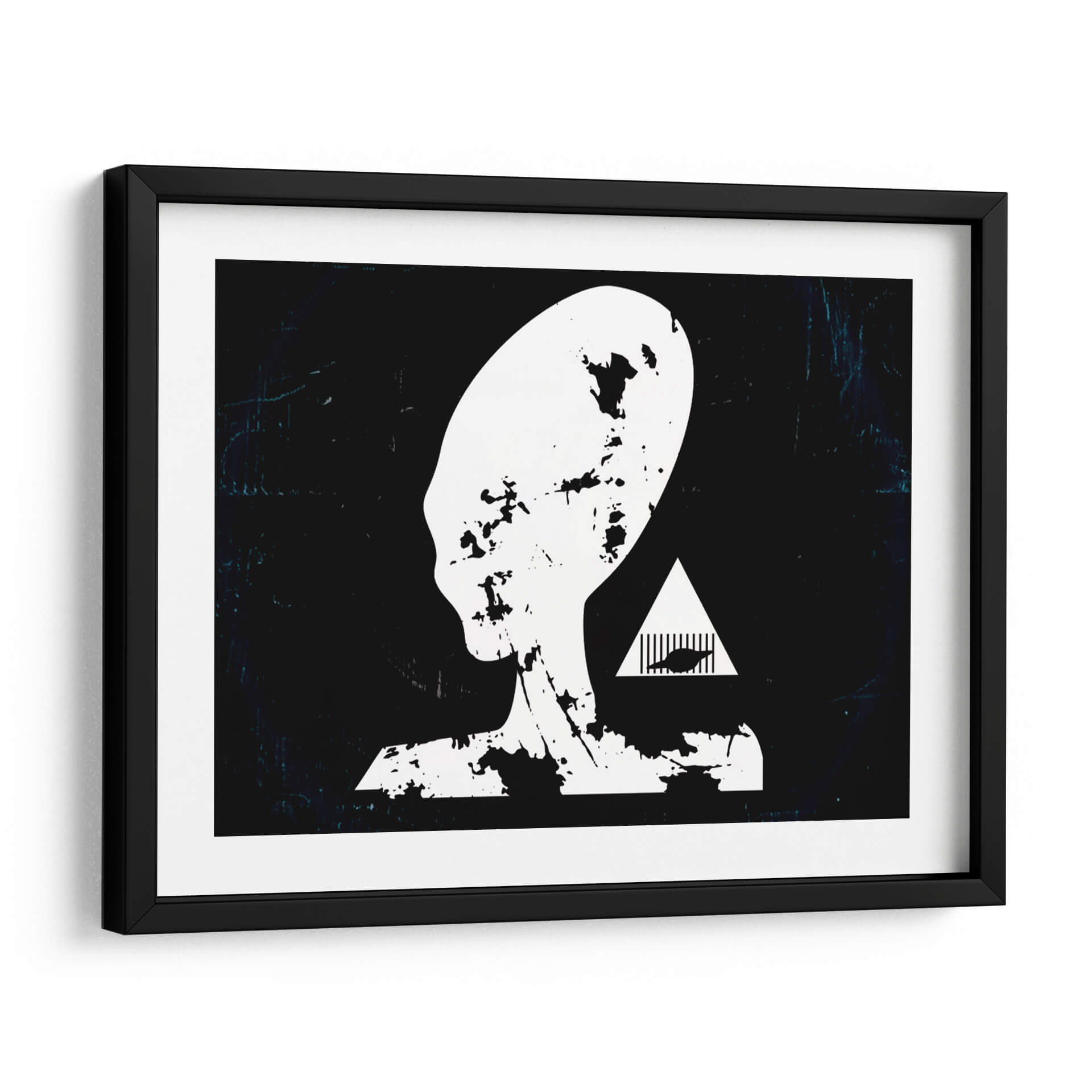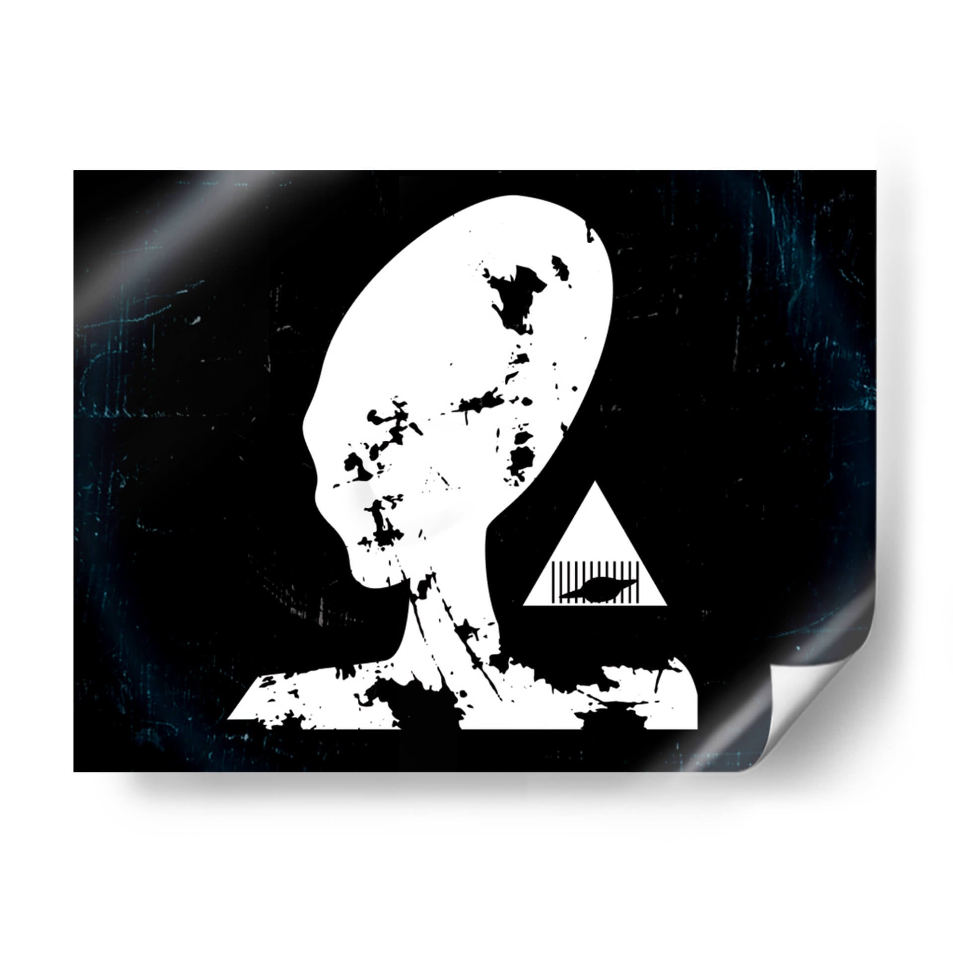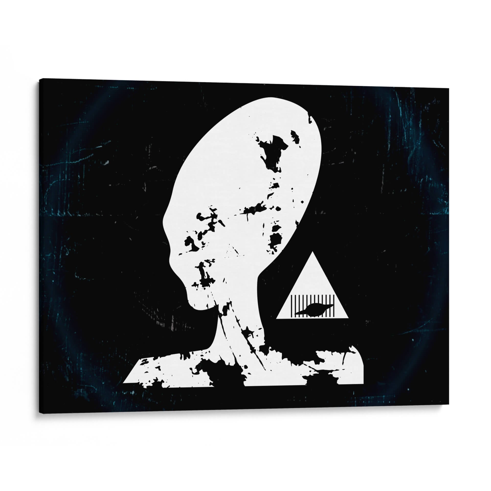 Adéntrate en el misterio del cosmos con "Prision Alienigena", una obra de arte contemporáneo que desafía la imaginación y cautiva la mirada. Este cuadro decorativo presenta una silueta icónica de una cabeza alienígena en blanco y negro, con un diseño que evoca texturas rasgadas y desgastadas, confiriéndole una profundidad inesperada. El fondo oscuro, salpicado de sutiles efectos de luz y textura, crea una atmósfera enigmática que invita a la reflexión. Junto a la figura principal, un triángulo blanco enmarca un diseño abstracto que añade un toque de intriga y simbolismo, sugiriendo una narrativa visual que trasciende lo convencional. El estilo minimalista con toques de grunge o arte urbano, junto a su paleta monocromática y contrastante, lo convierte en una pieza versátil. "Prision Alienigena" es ideal para espacios modernos, oficinas creativas o cualquier lugar donde se desee incorporar un elemento de ciencia ficción, misterio y conversación. Este cuadro es perfecto para quienes buscan una decoración de pared audaz y con carácter, capaz de transformar cualquier ambiente en un portal a lo desconocido y fascinante.