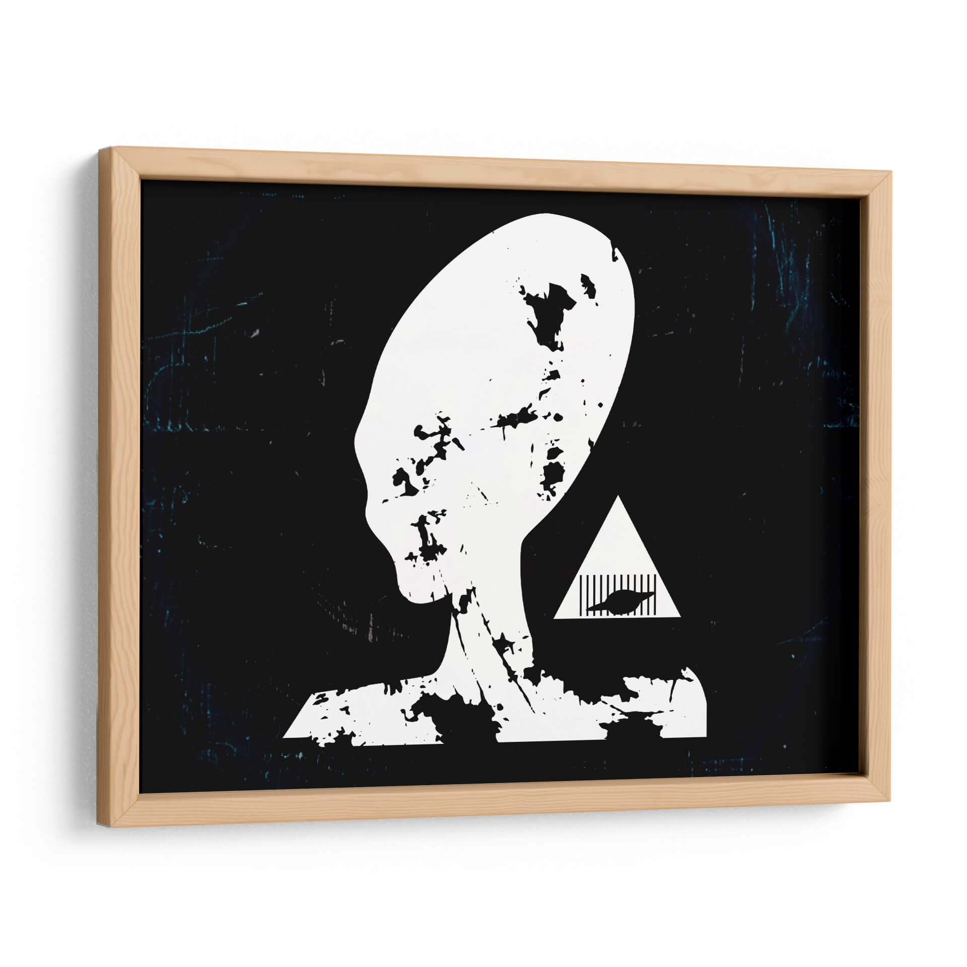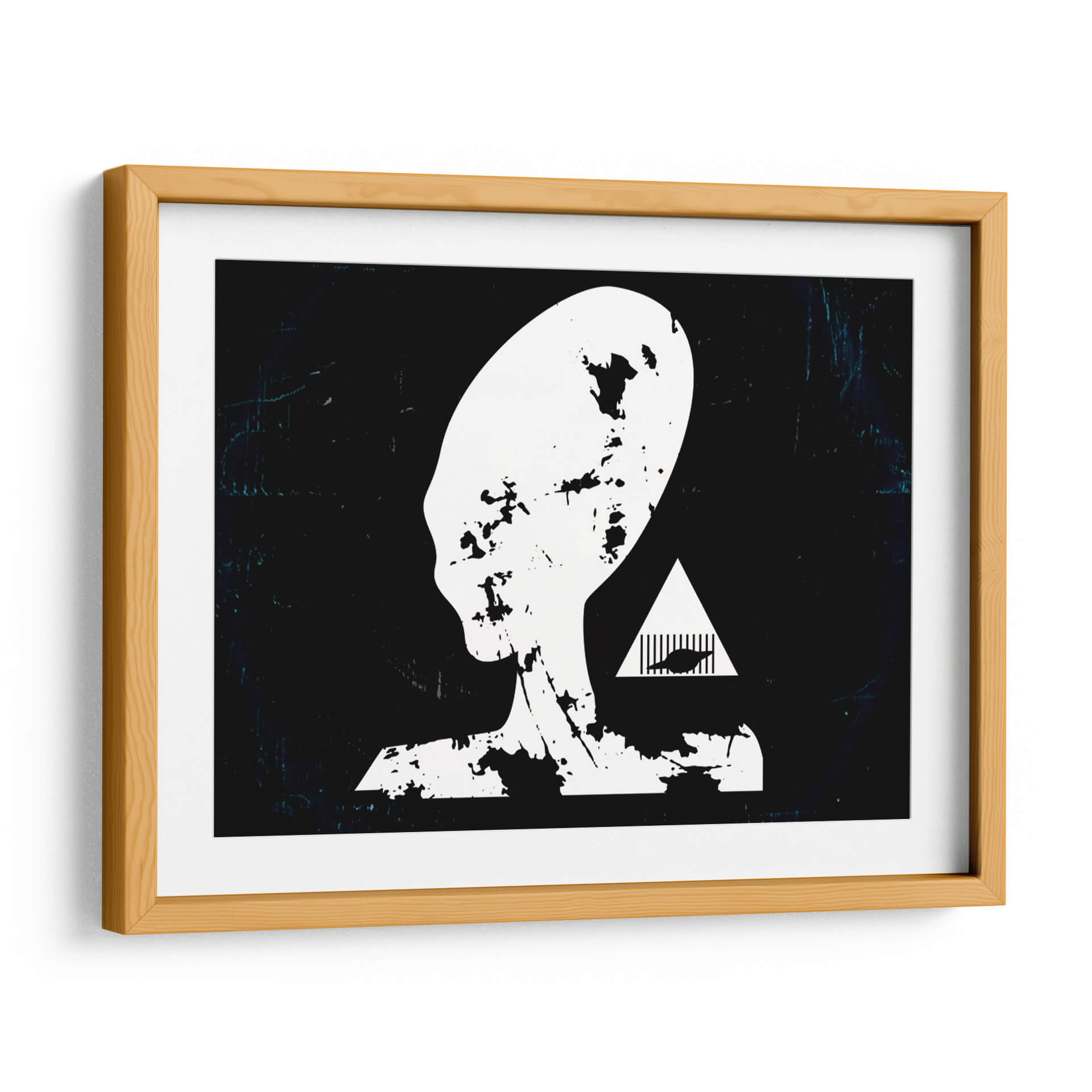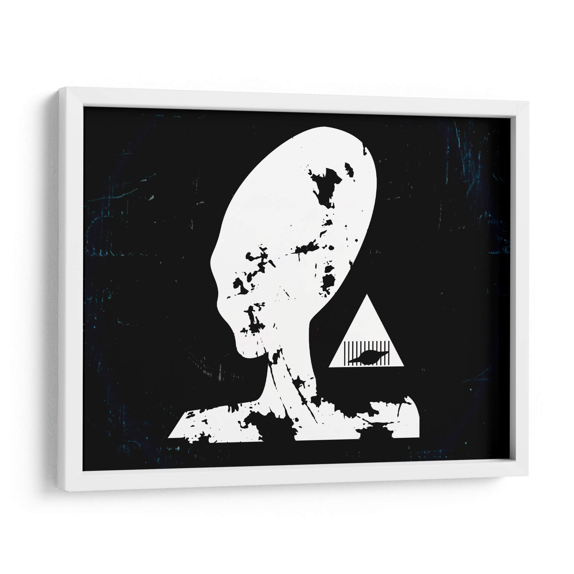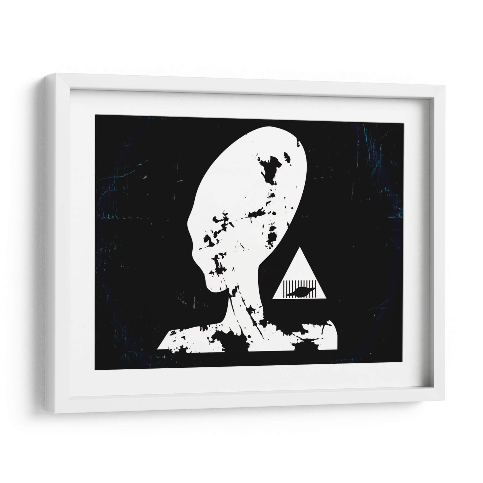 Adéntrate en el misterio del cosmos con "Prision Alienigena", una obra de arte contemporáneo que desafía la imaginación y cautiva la mirada. Este cuadro decorativo presenta una silueta icónica de una cabeza alienígena en blanco y negro, con un diseño que evoca texturas rasgadas y desgastadas, confiriéndole una profundidad inesperada. El fondo oscuro, salpicado de sutiles efectos de luz y textura, crea una atmósfera enigmática que invita a la reflexión. Junto a la figura principal, un triángulo blanco enmarca un diseño abstracto que añade un toque de intriga y simbolismo, sugiriendo una narrativa visual que trasciende lo convencional. El estilo minimalista con toques de grunge o arte urbano, junto a su paleta monocromática y contrastante, lo convierte en una pieza versátil. "Prision Alienigena" es ideal para espacios modernos, oficinas creativas o cualquier lugar donde se desee incorporar un elemento de ciencia ficción, misterio y conversación. Este cuadro es perfecto para quienes buscan una decoración de pared audaz y con carácter, capaz de transformar cualquier ambiente en un portal a lo desconocido y fascinante.