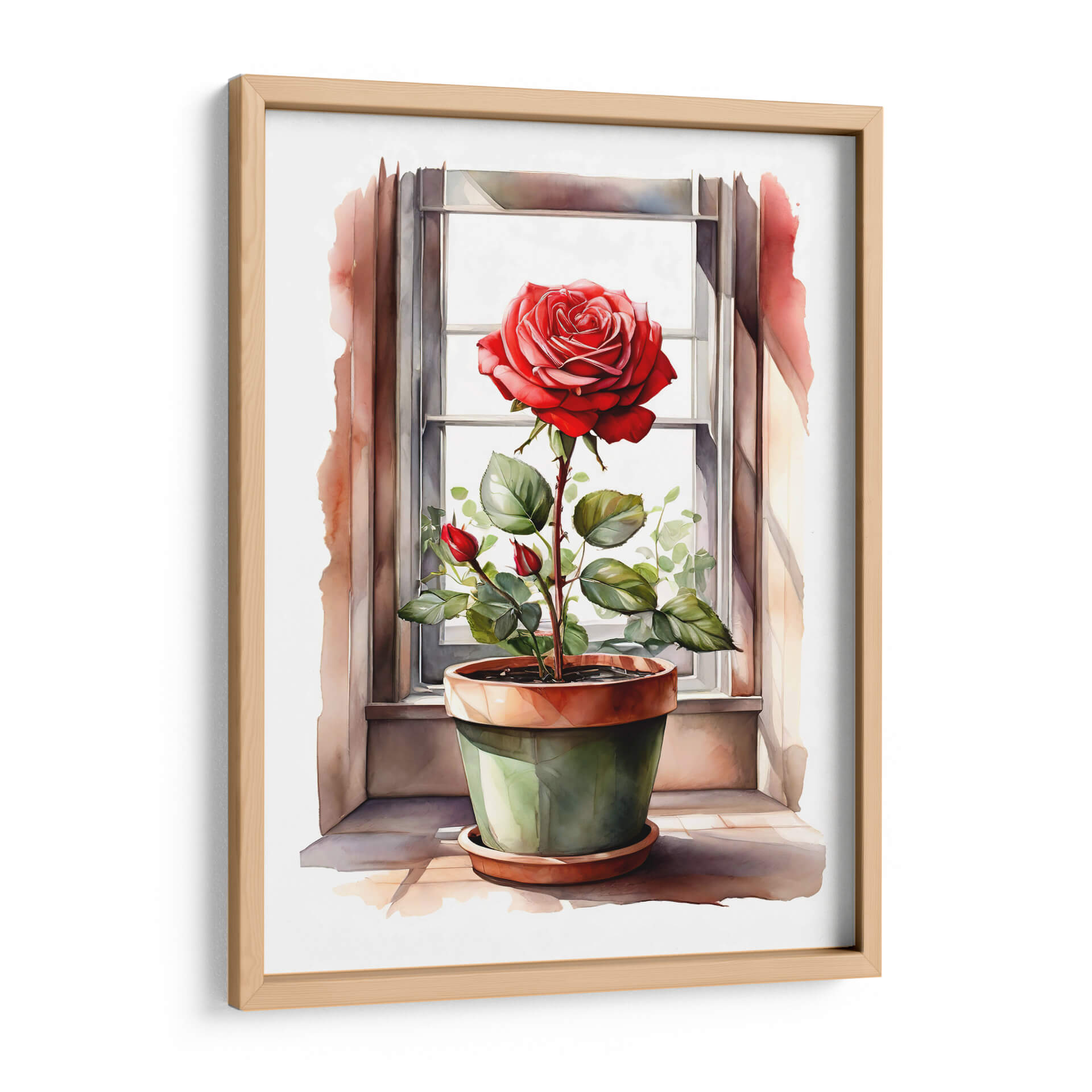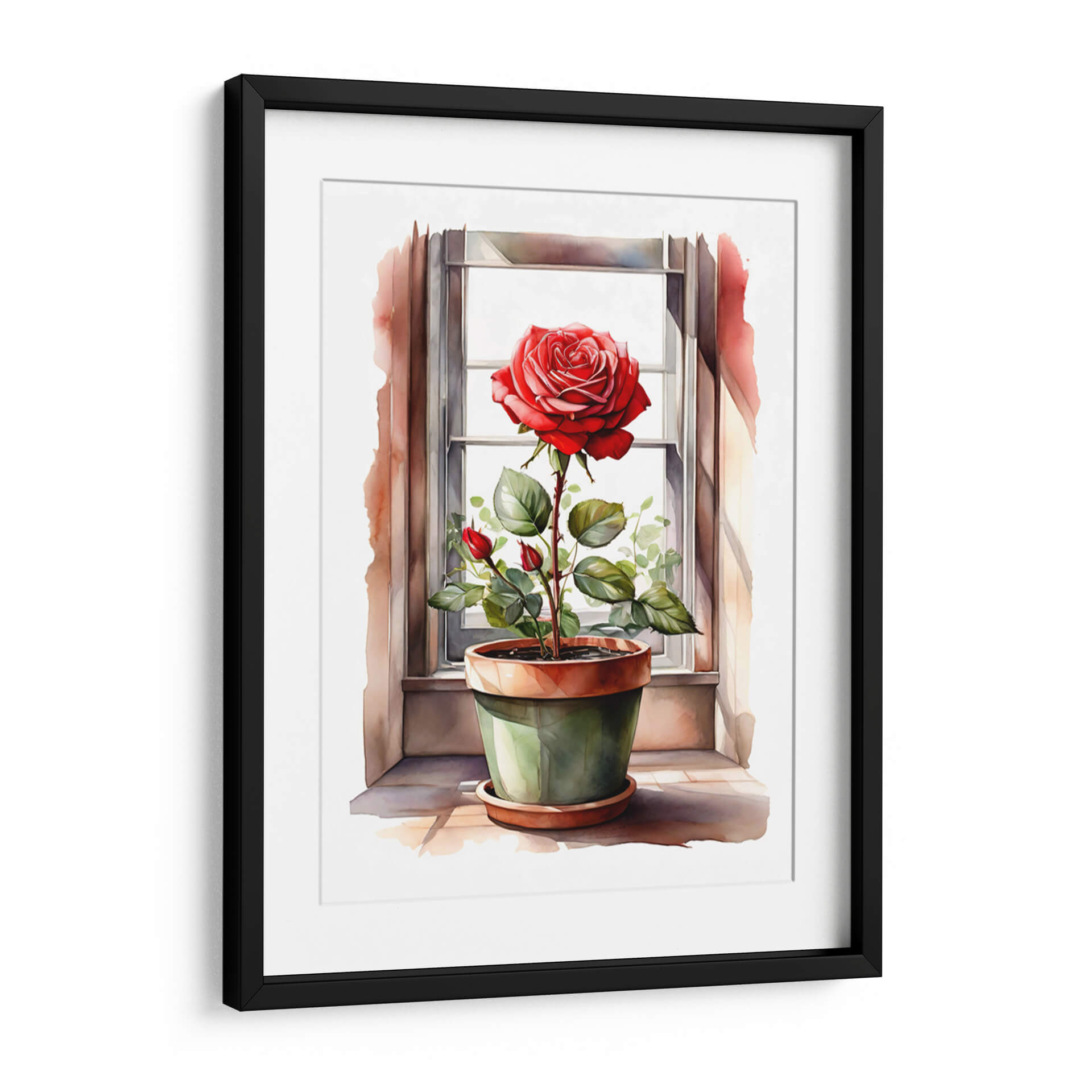 Embárcate en un viaje visual con "Rosa en la Ventana", una obra de arte que captura la delicadeza y la belleza atemporal de una rosa en plena floración. Esta pieza, bañada por la luz natural que se filtra a través de un ventanal, presenta una rosa roja vibrante como protagonista, rodeada de sus brotes y hojas verdes, todo ello dispuesto en una maceta clásica sobre el alféizar. La técnica de acuarela, con sus trazos fluidos y translúcidos, confiere a la imagen una atmósfera etérea y serena, realzando la riqueza de los colores y la suavidad de las formas. Los tonos cálidos y terrosos del alféizar y las cortinas contrastan delicadamente con el intenso rojo de la flor y los verdes frescos de la vegetación, creando un equilibrio visual armonioso. "Rosa en la Ventana" es más que un simple cuadro decorativo; es una invitación a la contemplación, un recordatorio de la belleza que se encuentra en los momentos cotidianos. Ideal para añadir un toque de elegancia y calma a tu sala de estar, dormitorio o incluso a un espacio de oficina, esta obra aportará una sensación de frescura y vitalidad. Su estilo, que evoca la pintura clásica con un toque moderno, la convierte en una pieza versátil que se adapta a diversos estilos de decoración, desde el clásico hasta el contemporáneo.