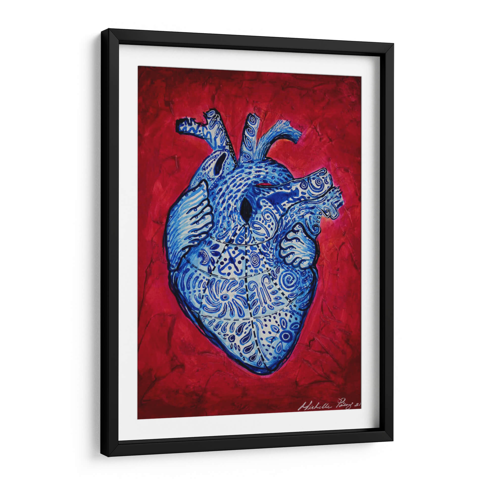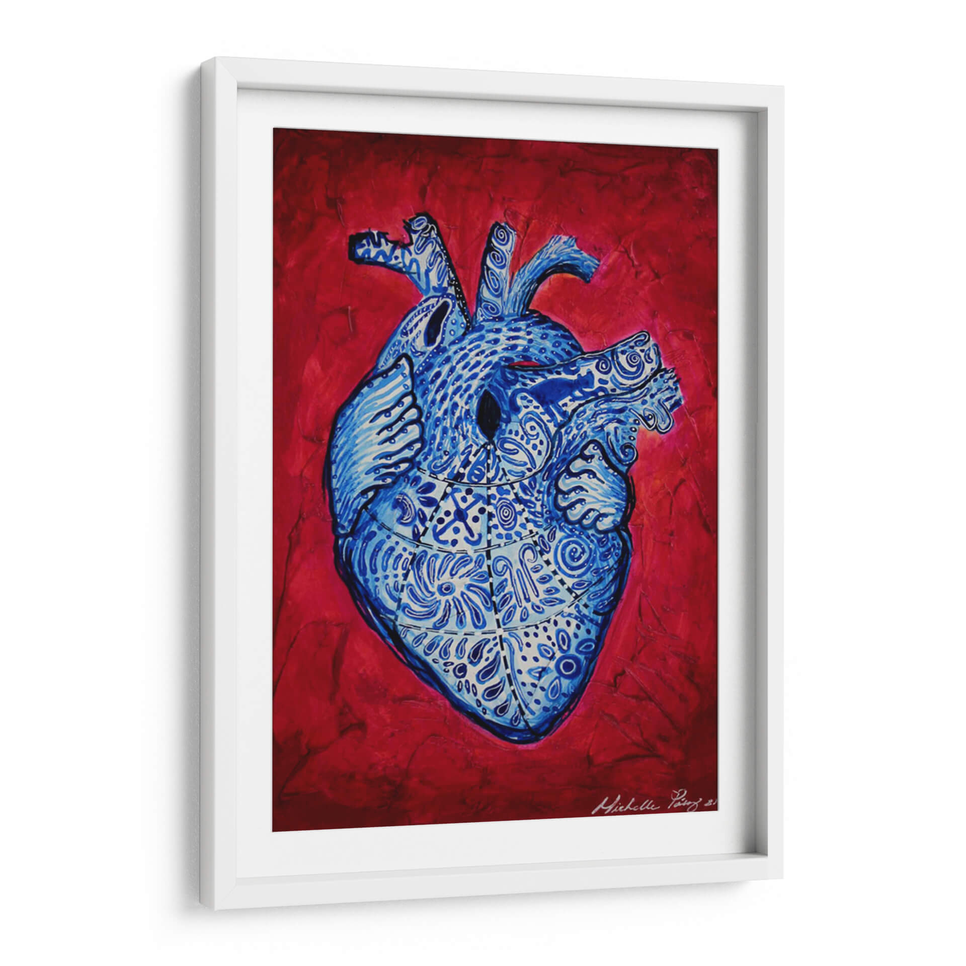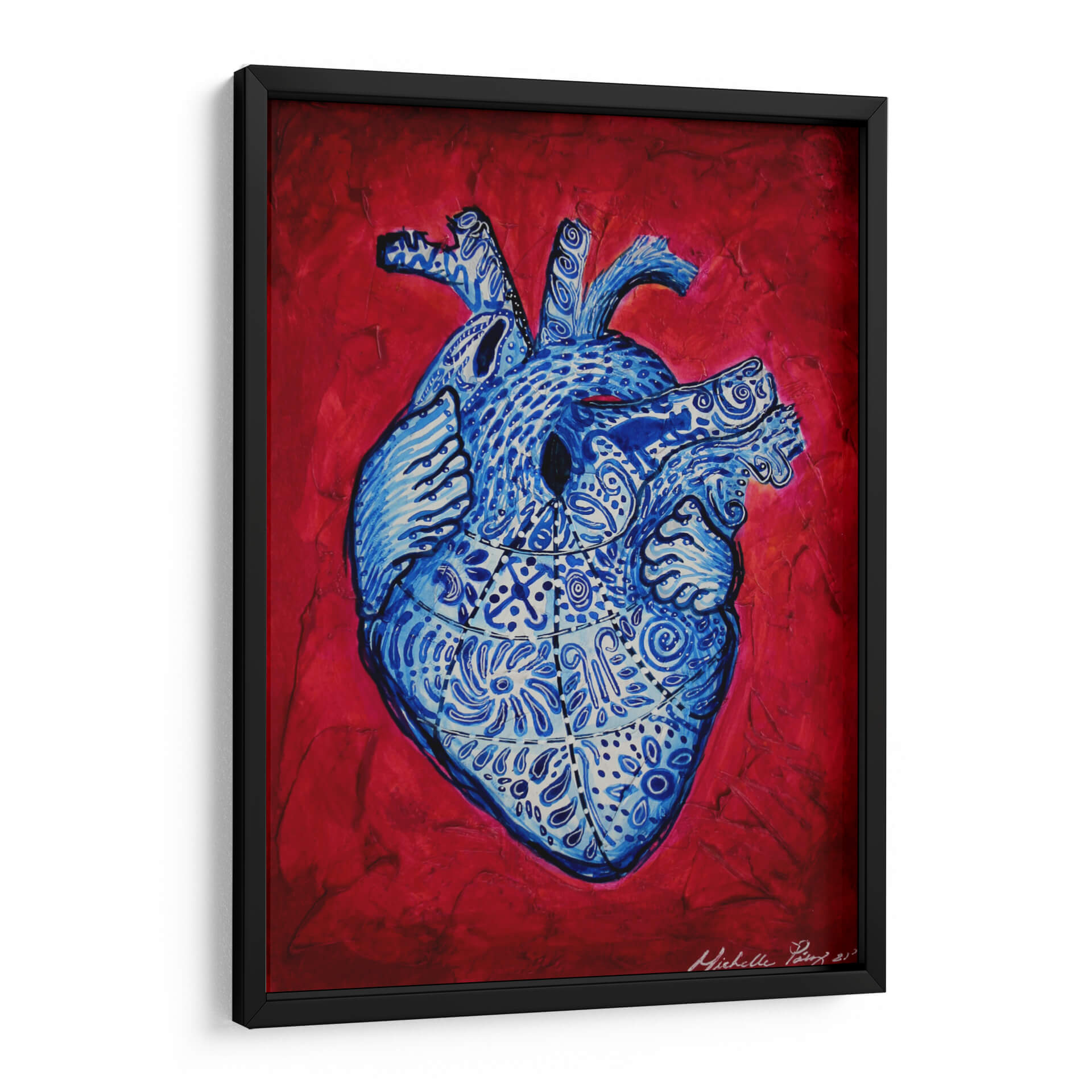 Sumérgete en la fascinante obra "Serie Corazonas #13" de Michelle Páez, una pieza vibrante que reinterpreta la anatomía humana con una explosión de color y detalle. Este cuadro decorativo presenta un corazón estilizado, meticulosamente adornado con intrincados patrones y diseños en tonos azules intensos, que contrastan dramáticamente con un fondo texturizado en rojo apasionado. La obra evoca una mezcla de vitalidad, complejidad emocional y la belleza inherente a la vida. Su estilo artístico contemporáneo y la audaz paleta de colores la convierten en una pieza ideal para añadir un toque de personalidad y profundidad a cualquier espacio. Imagina este cuadro como un punto focal cautivador en tu sala de estar, un elemento inspirador en tu estudio u oficina, o una declaración audaz en tu dormitorio. "Serie Corazonas #13" no es solo una decoración de pared, es una invitación a reflexionar sobre la belleza del interior y la energía que nos impulsa. Descubre la fusión de arte, emoción y diseño que Michelle Páez plasma en esta obra única, perfecta para quienes buscan una pieza de arte con carácter y significado.