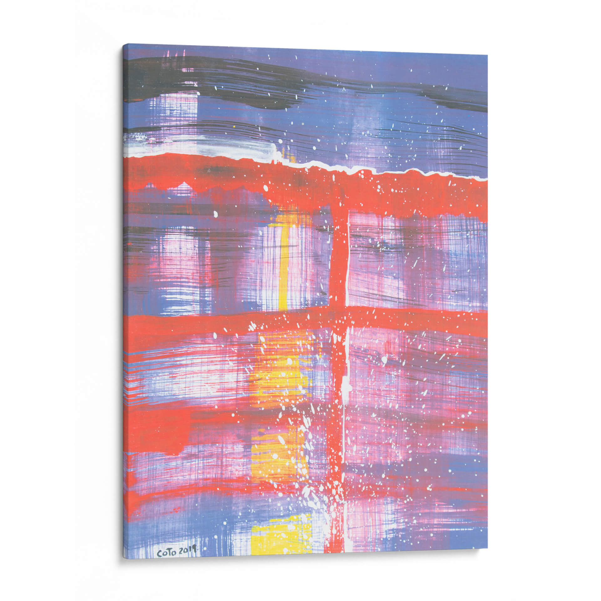 Sumérgete en la vibrante abstracción de esta cautivadora obra de arte de Karlo Coto. El lienzo despliega un audaz juego de pinceladas enérgicas que crean una composición dinámica y llena de movimiento. Los tonos azules profundos y púrpuras se entrelazan con vibrantes líneas rojas y toques de amarillo brillante, generando un contraste visual impactante. La técnica de salpicaduras blancas añade una textura intrigante, sugiriendo la efervescencia de la vida o la luz estelar. Esta pieza abstracta, con su fuerte presencia visual y paleta de colores audaz, es ideal para infundir energía y carácter a cualquier espacio. Perfecta como punto focal en una sala de estar moderna, un estudio creativo o incluso un pasillo contemporáneo, este cuadro decorativo invita a la contemplación y a la interpretación personal. Su estilo abstracto permite una gran versatilidad decorativa, adaptándose a interiores que buscan un toque de originalidad y expresión artística. Añade profundidad y un toque de arte moderno a tu hogar u oficina con esta obra única.