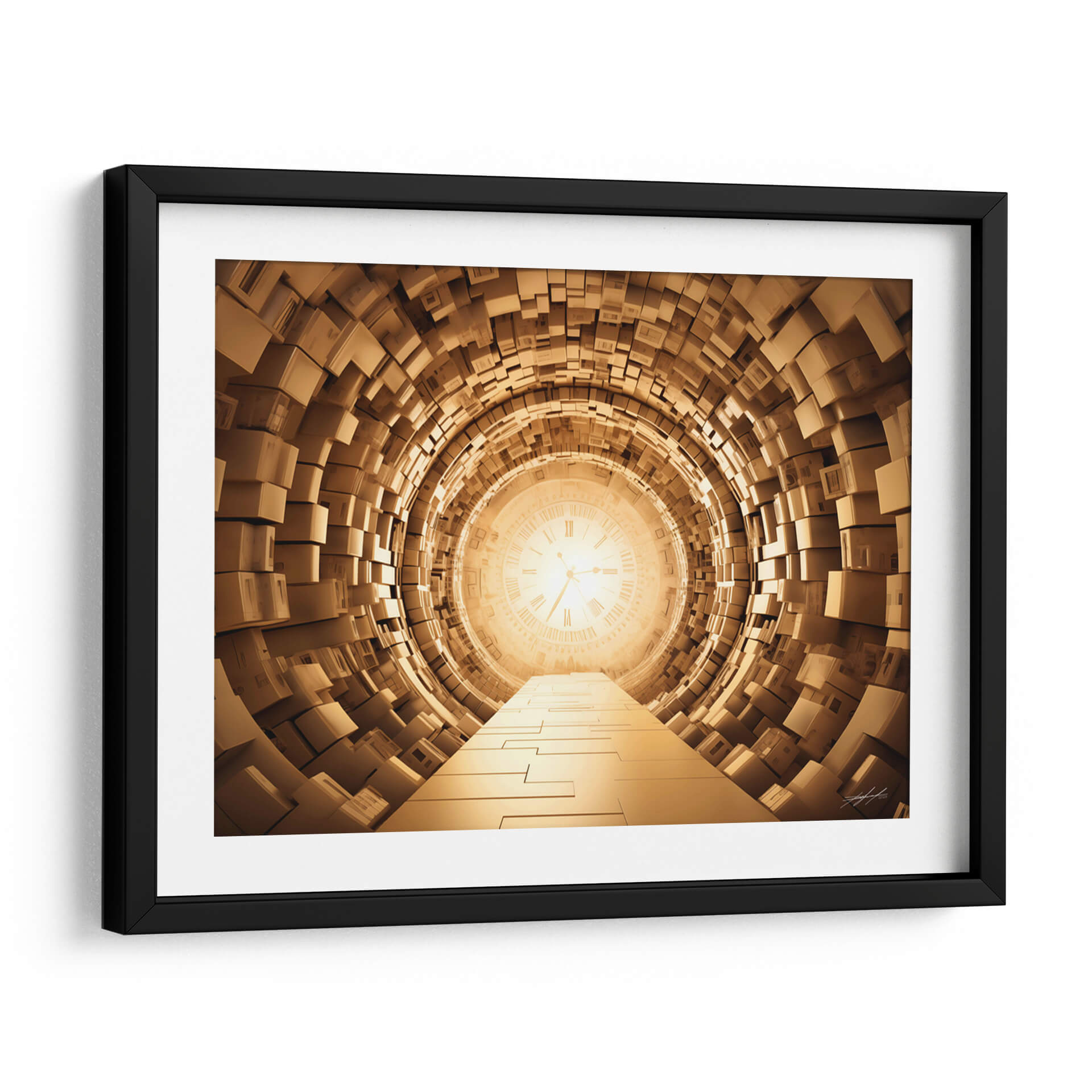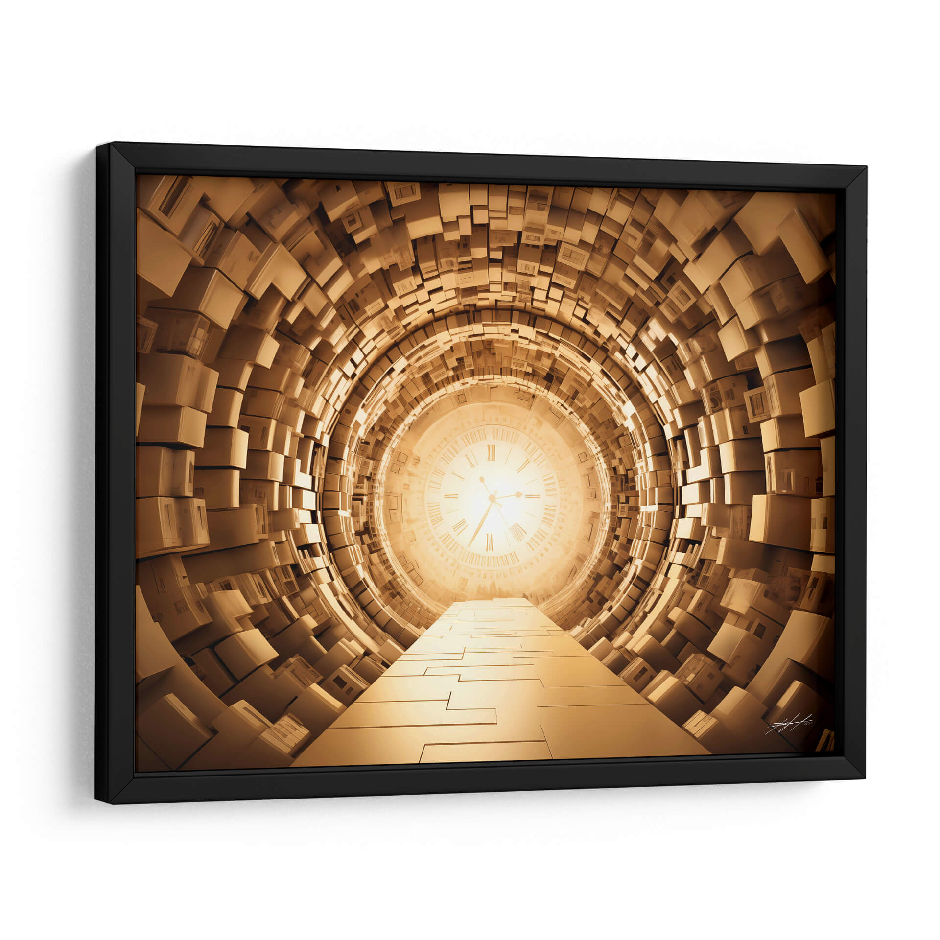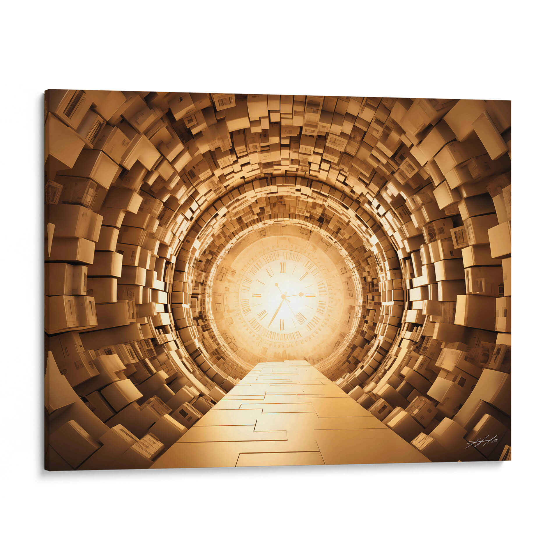 Sumérgete en la fascinación del tiempo y el espacio con "Tiempo - 1", una obra de arte digital que te transportará a un túnel de dimensiones abstractas y futuristas. Dominada por una paleta de tonos dorados y cobrizos, esta pieza evoca una sensación de calidez, misterio y avance constante. La composición se centra en un túnel circular que se expande hacia un punto de luz brillante, donde se distingue un reloj analógico con números romanos, simbolizando el paso incesante de los segundos y las eras. Las paredes del túnel, formadas por una intrincada repetición de formas cúbicas y geométricas, crean una perspectiva hipnótica que invita a la contemplación. Este cuadro decorativo es perfecto para aquellos que buscan añadir un toque de intriga y modernidad a su hogar u oficina. Ideal para salas de estar, estudios o espacios que requieran un elemento visual que inspire reflexión sobre la temporalidad y el progreso. "Tiempo - 1" no es solo una decoración, es una invitación a viajar a través de conceptos abstractos, convirtiendo cualquier pared en un portal a la imaginación y al futuro.