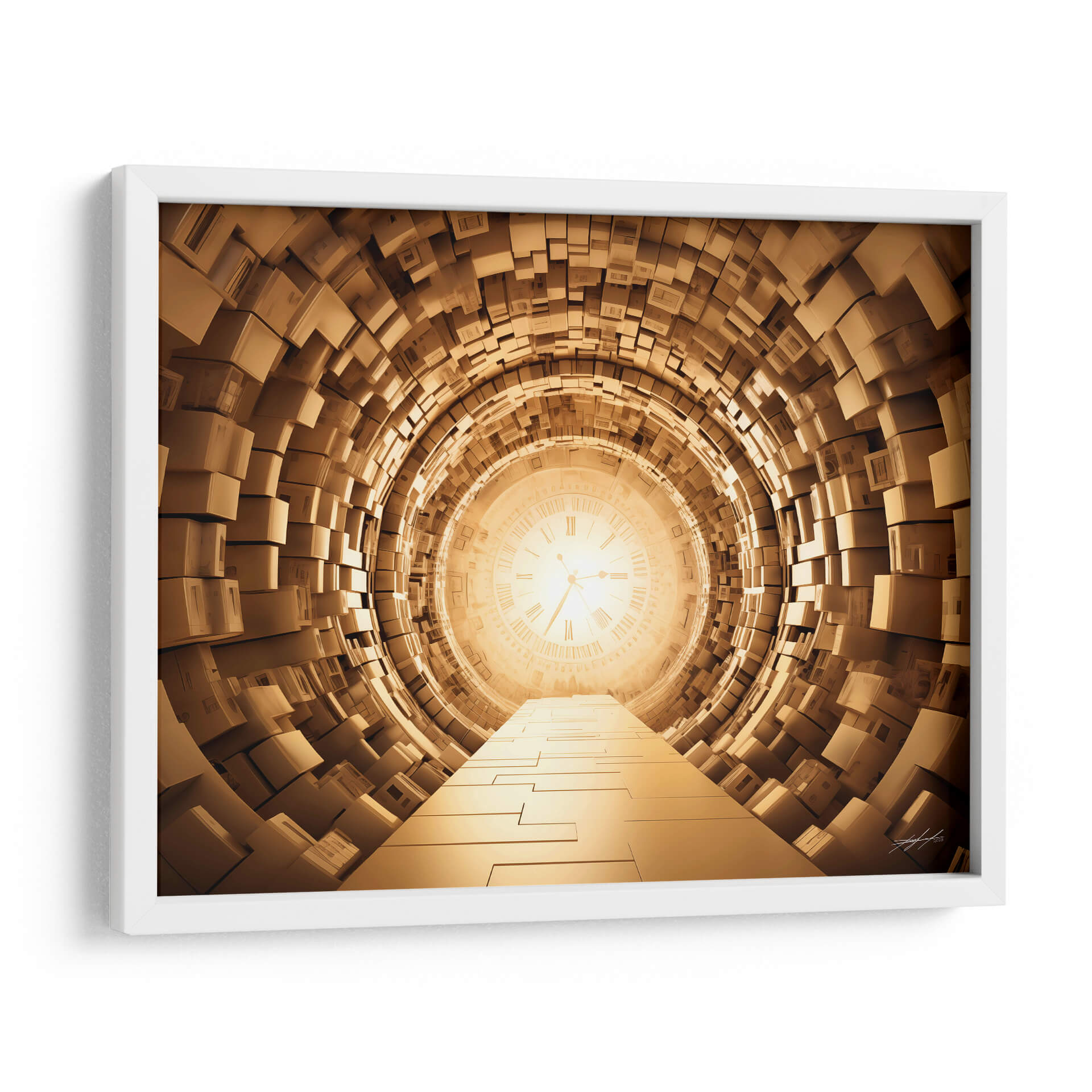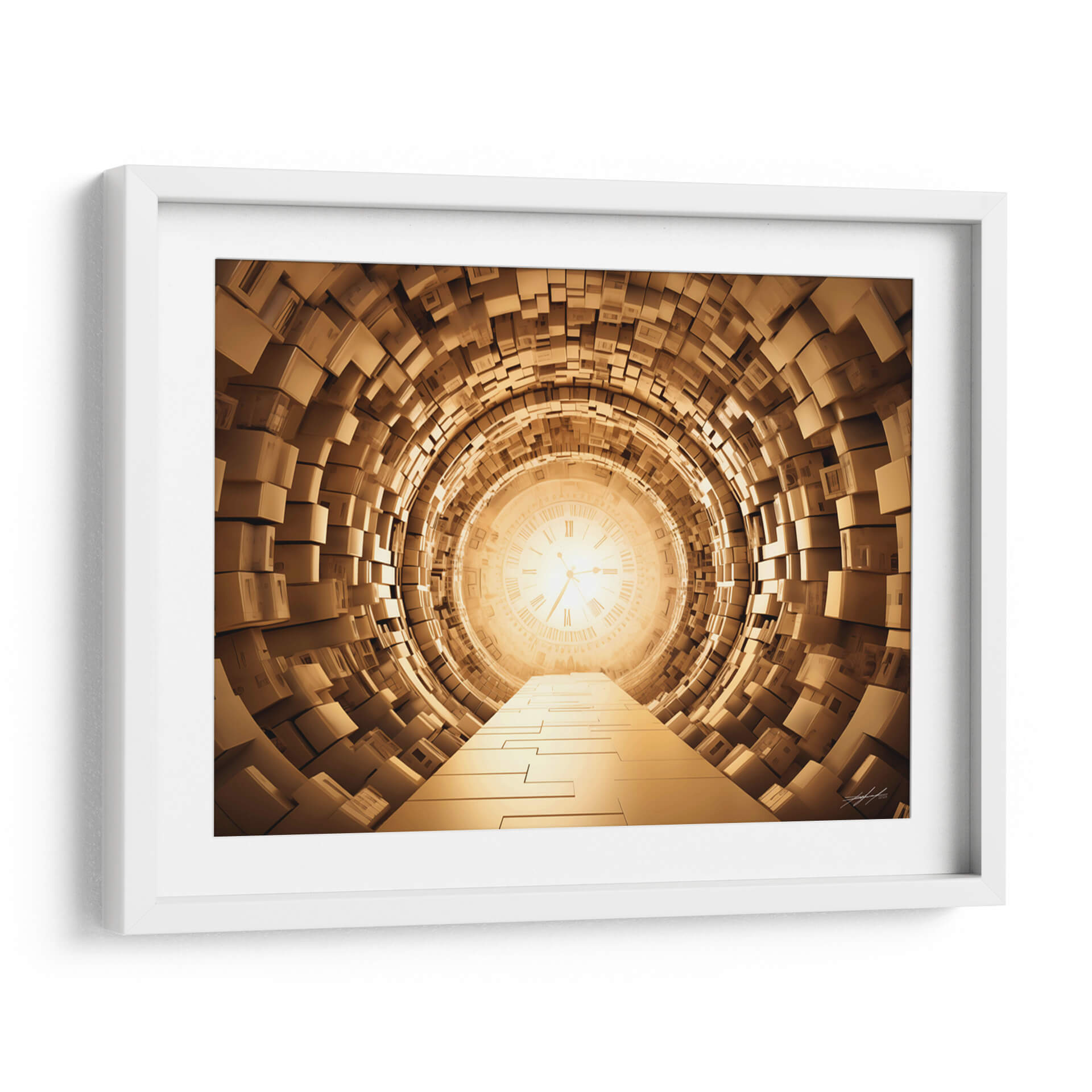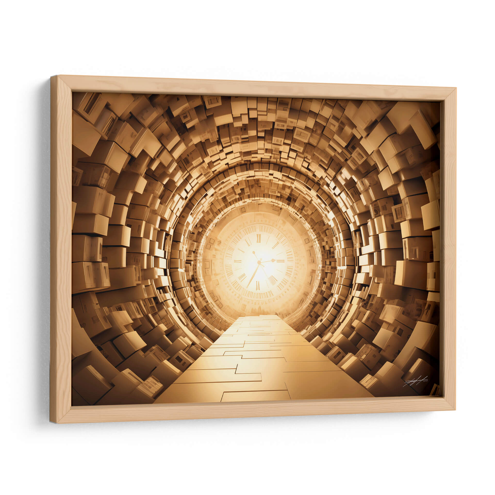 Sumérgete en la fascinación del tiempo y el espacio con "Tiempo - 1", una obra de arte digital que te transportará a un túnel de dimensiones abstractas y futuristas. Dominada por una paleta de tonos dorados y cobrizos, esta pieza evoca una sensación de calidez, misterio y avance constante. La composición se centra en un túnel circular que se expande hacia un punto de luz brillante, donde se distingue un reloj analógico con números romanos, simbolizando el paso incesante de los segundos y las eras. Las paredes del túnel, formadas por una intrincada repetición de formas cúbicas y geométricas, crean una perspectiva hipnótica que invita a la contemplación. Este cuadro decorativo es perfecto para aquellos que buscan añadir un toque de intriga y modernidad a su hogar u oficina. Ideal para salas de estar, estudios o espacios que requieran un elemento visual que inspire reflexión sobre la temporalidad y el progreso. "Tiempo - 1" no es solo una decoración, es una invitación a viajar a través de conceptos abstractos, convirtiendo cualquier pared en un portal a la imaginación y al futuro.
