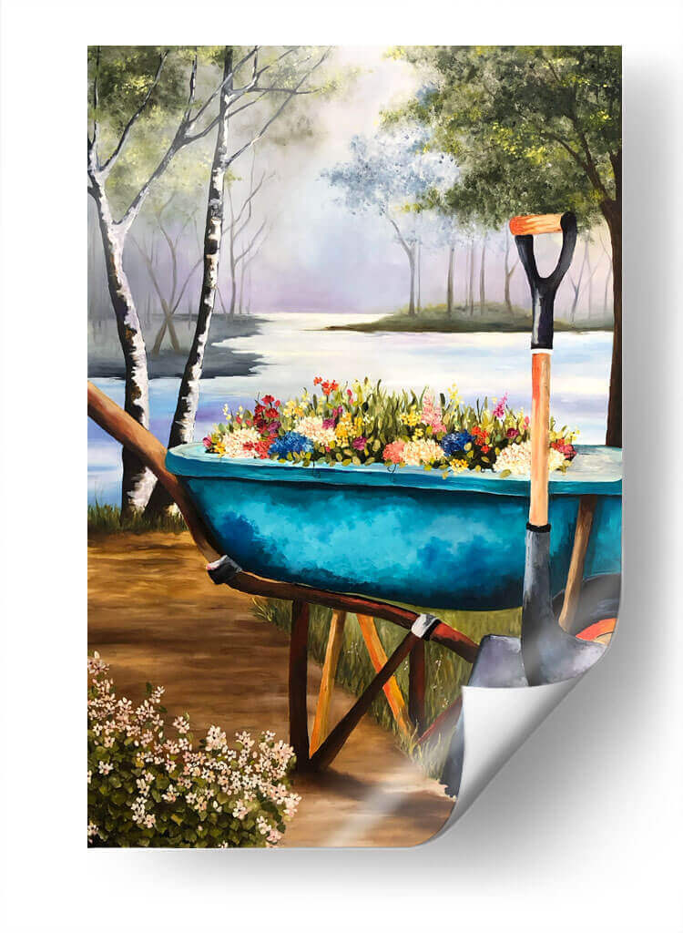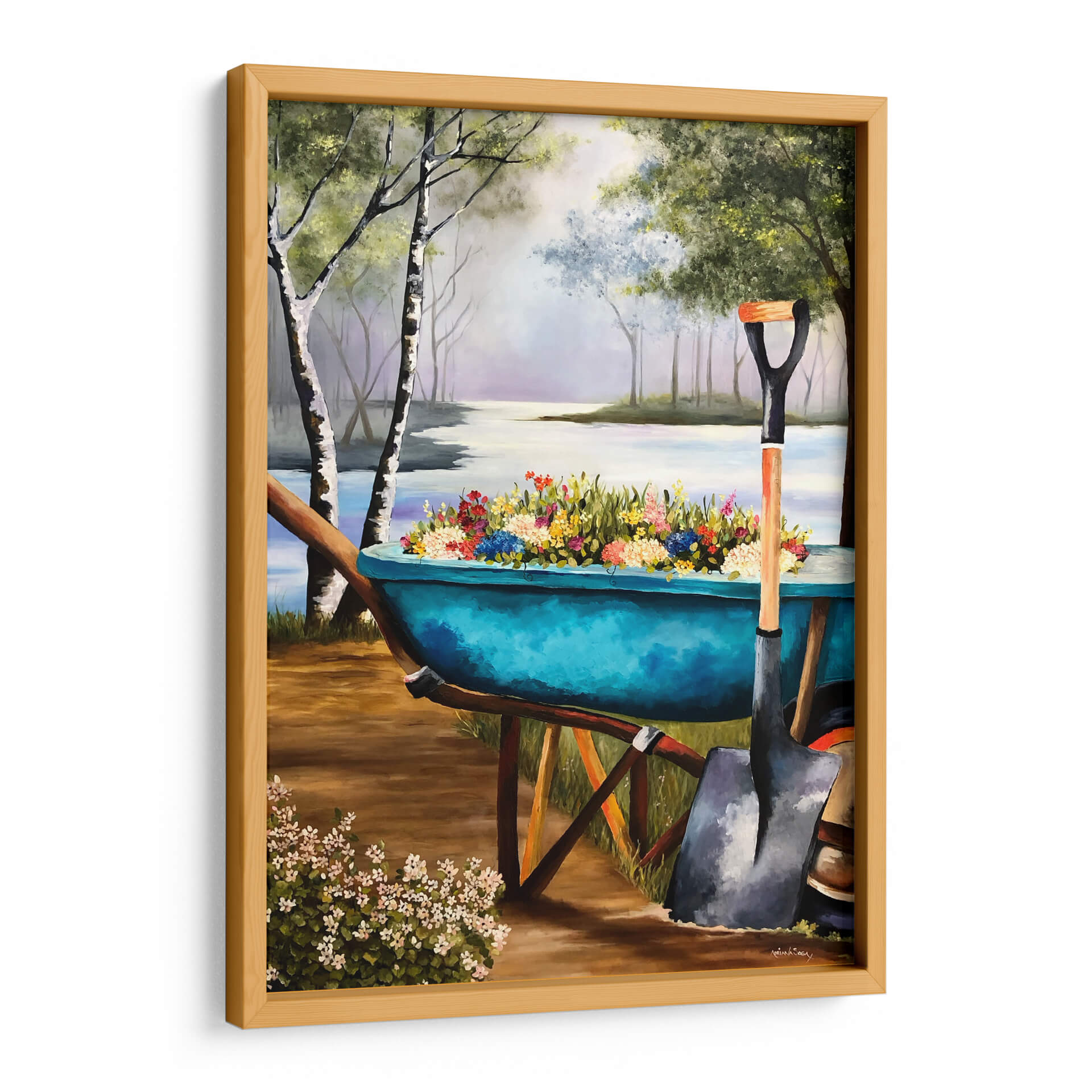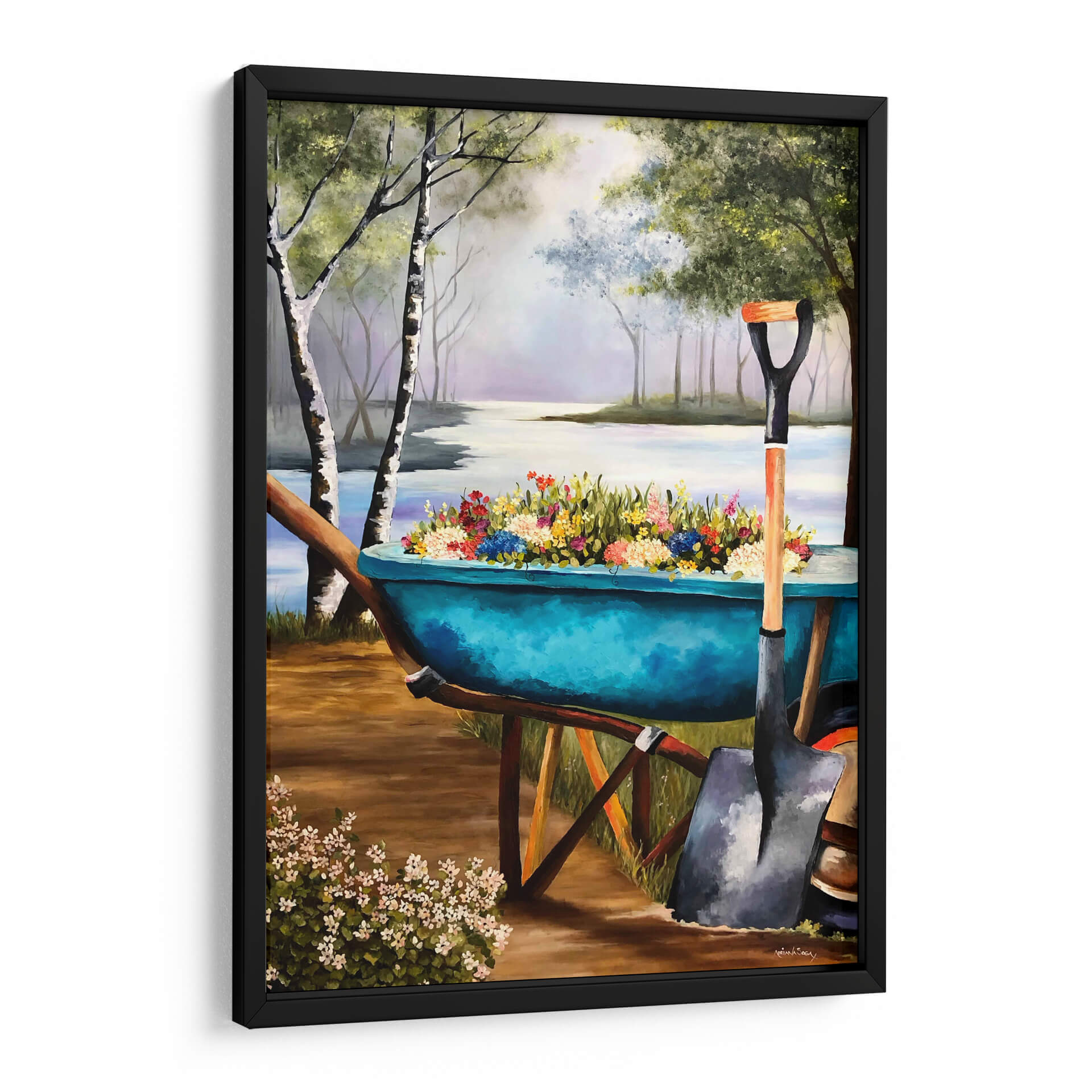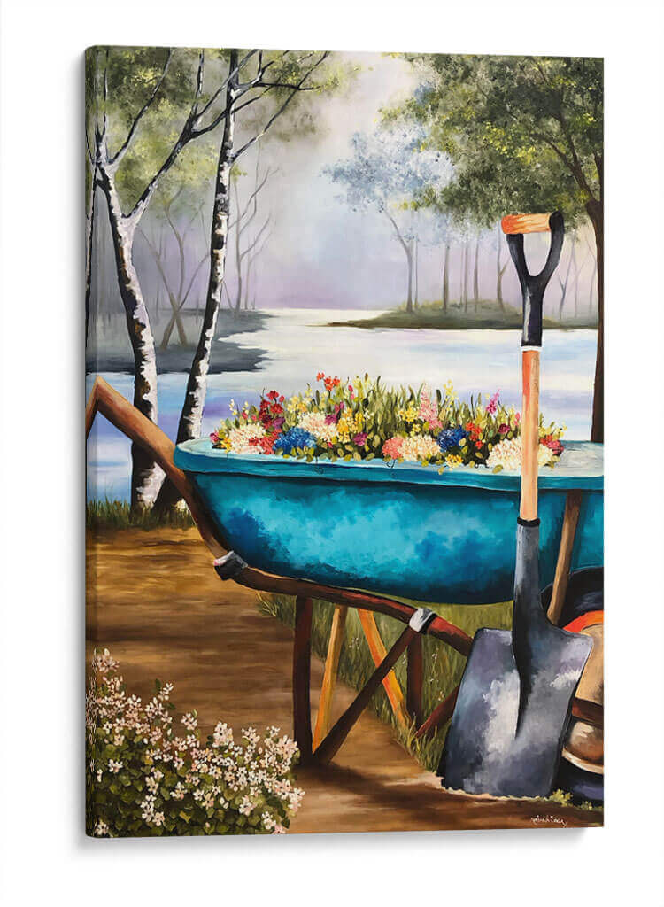 Sumérgete en la serenidad del campo con "Tiempo de Introspección", una obra de arte cautivadora de Adriana Sosa. Este cuadro decorativo captura un momento idílico de contemplación en la naturaleza, presentando un vibrante carro de jardinería rebosante de flores de colores. Los tonos verdes y azules predominantes, junto con toques de rojo, amarillo y rosa, crean una atmósfera tranquila y a la vez alegre. El estilo pictórico, con pinceladas expresivas y un enfoque en la luz y el color, evoca una sensación de paz y conexión con el entorno natural. Las siluetas de árboles esbeltos y un cuerpo de agua sereno al fondo añaden profundidad y misterio a la composición. Esta pieza es ideal para transformar cualquier espacio, ya sea una sala de estar, un comedor o un estudio, en un refugio de calma y belleza natural. El carro azul, un elemento central inesperado, añade un toque de color y personalidad, invitando a la reflexión sobre la belleza encontrada en las tareas cotidianas y en la simple contemplación de la naturaleza. "Tiempo de Introspección" es más que una decoración; es una invitación a pausar, respirar y apreciar la quietud que nos rodea, aportando una dosis de vitalidad y serenidad a tu hogar u oficina.