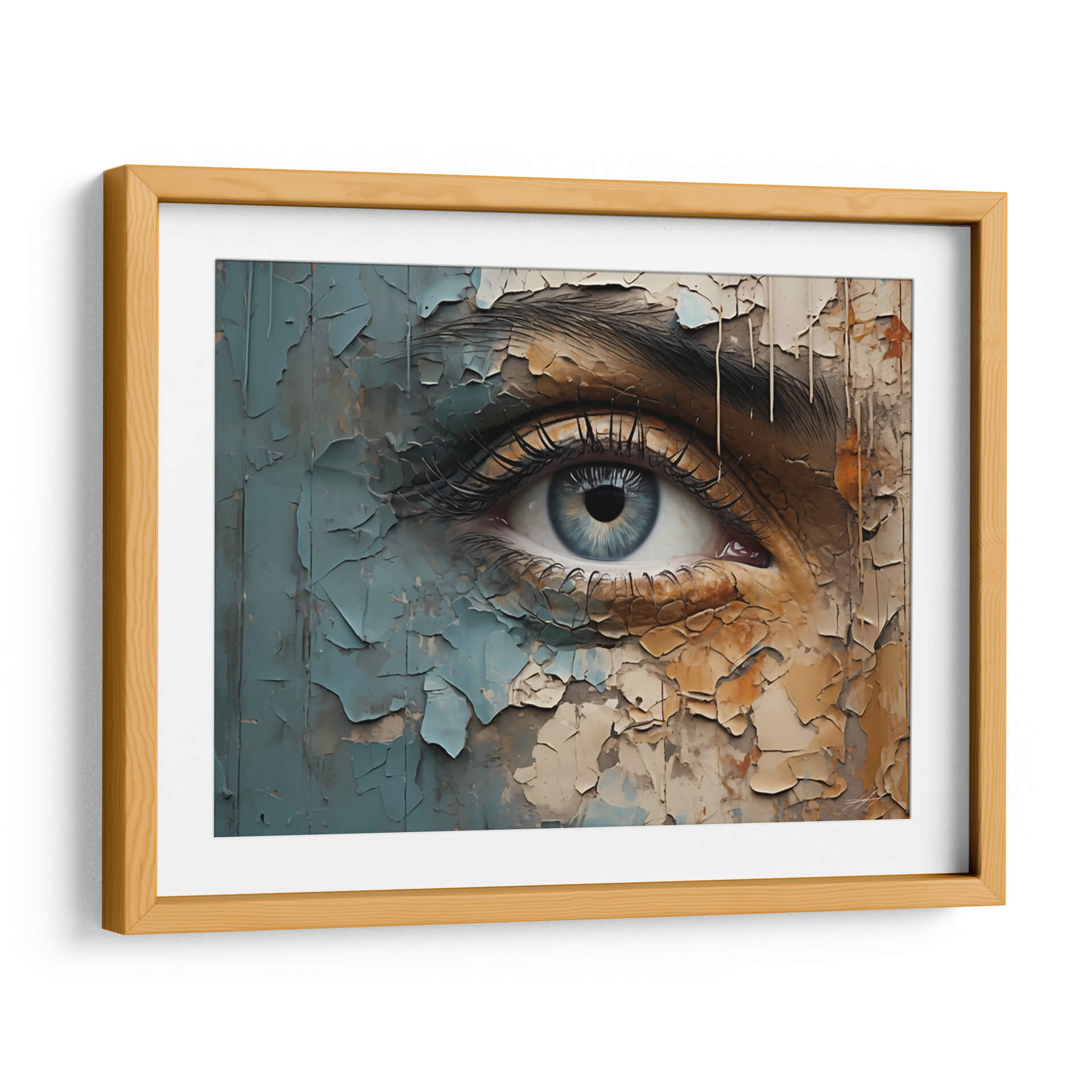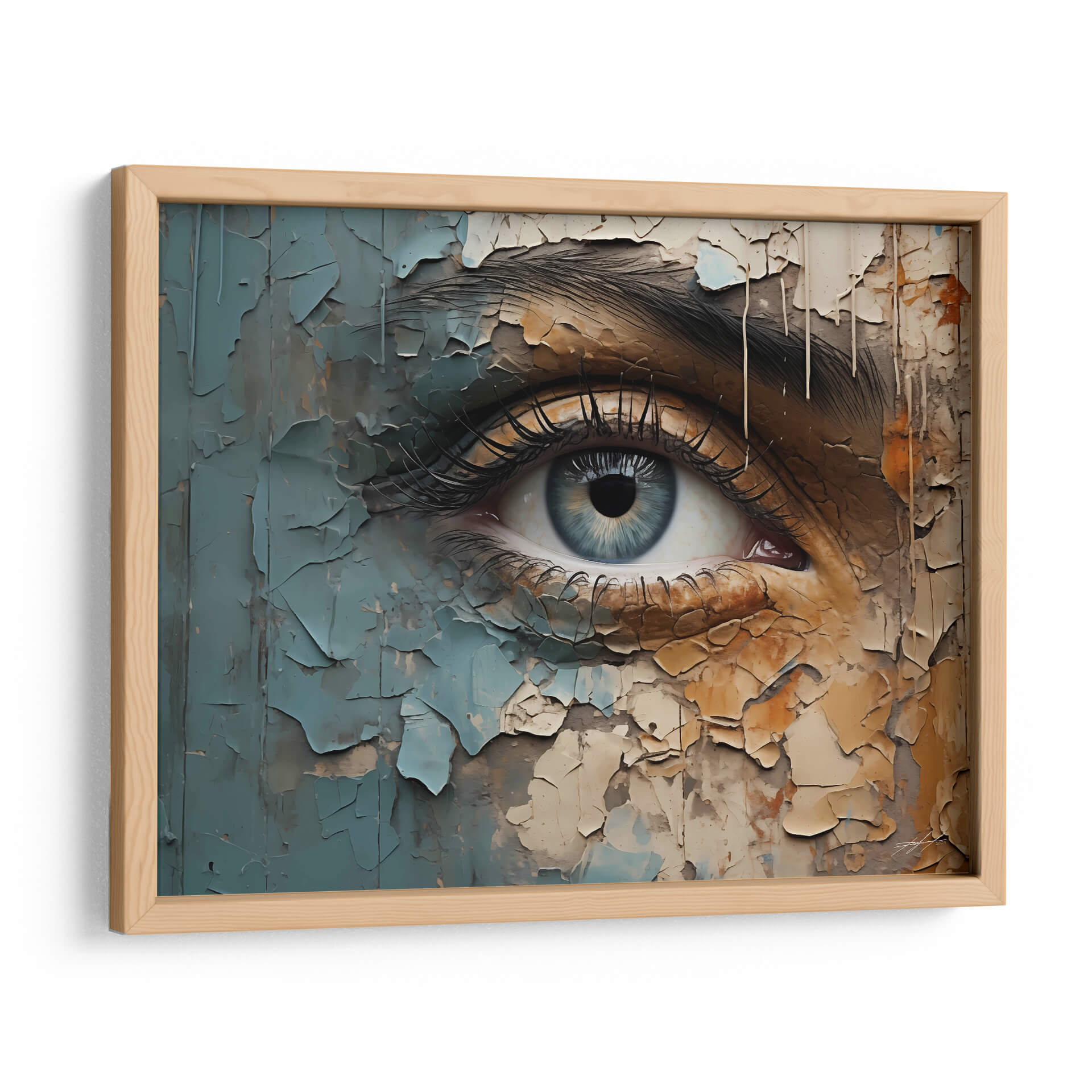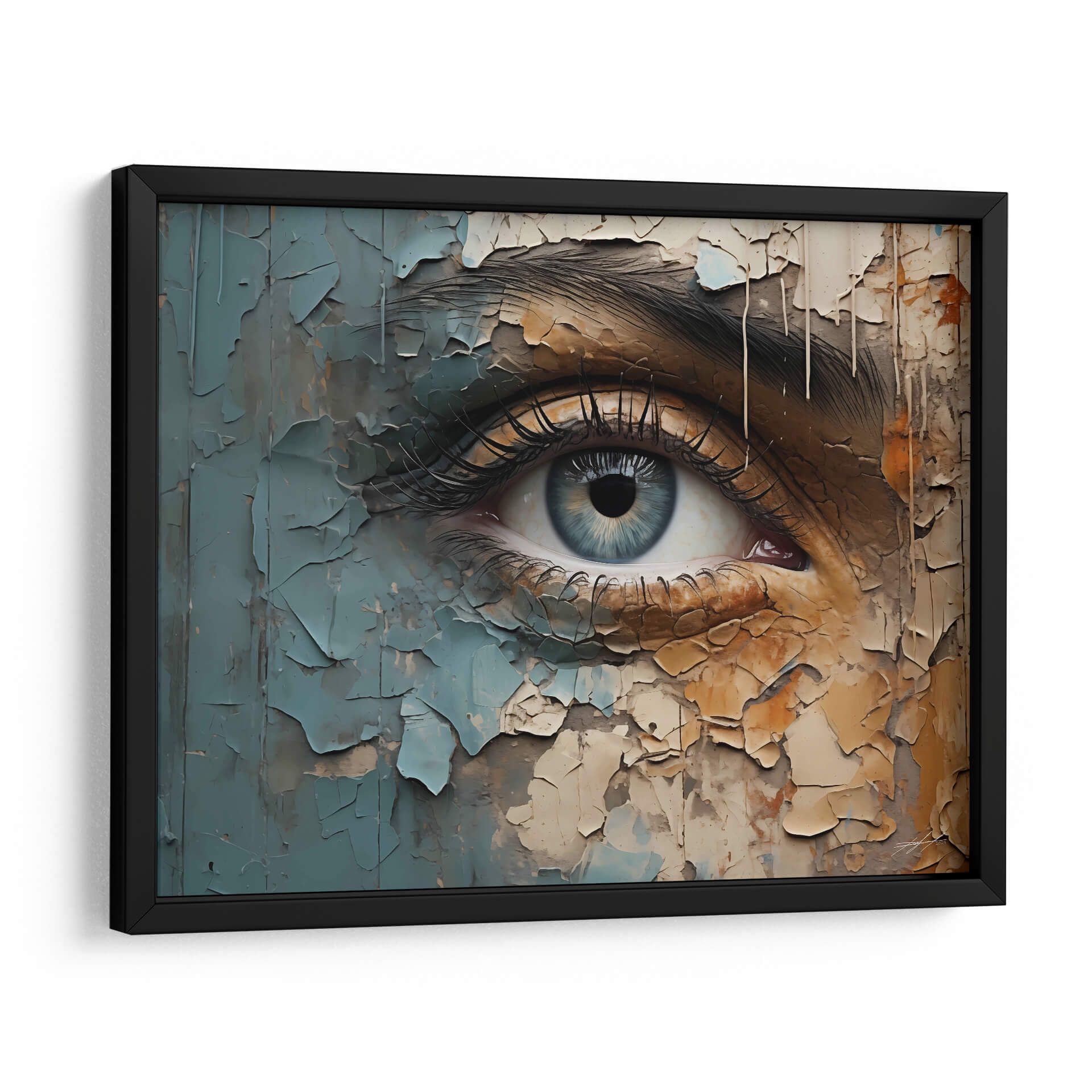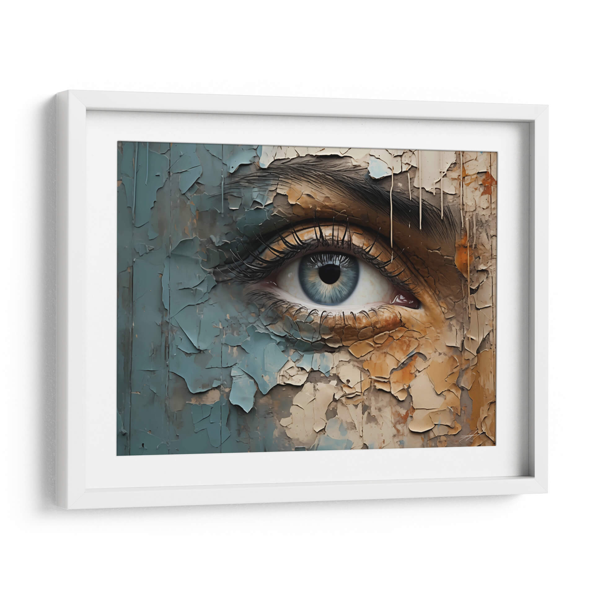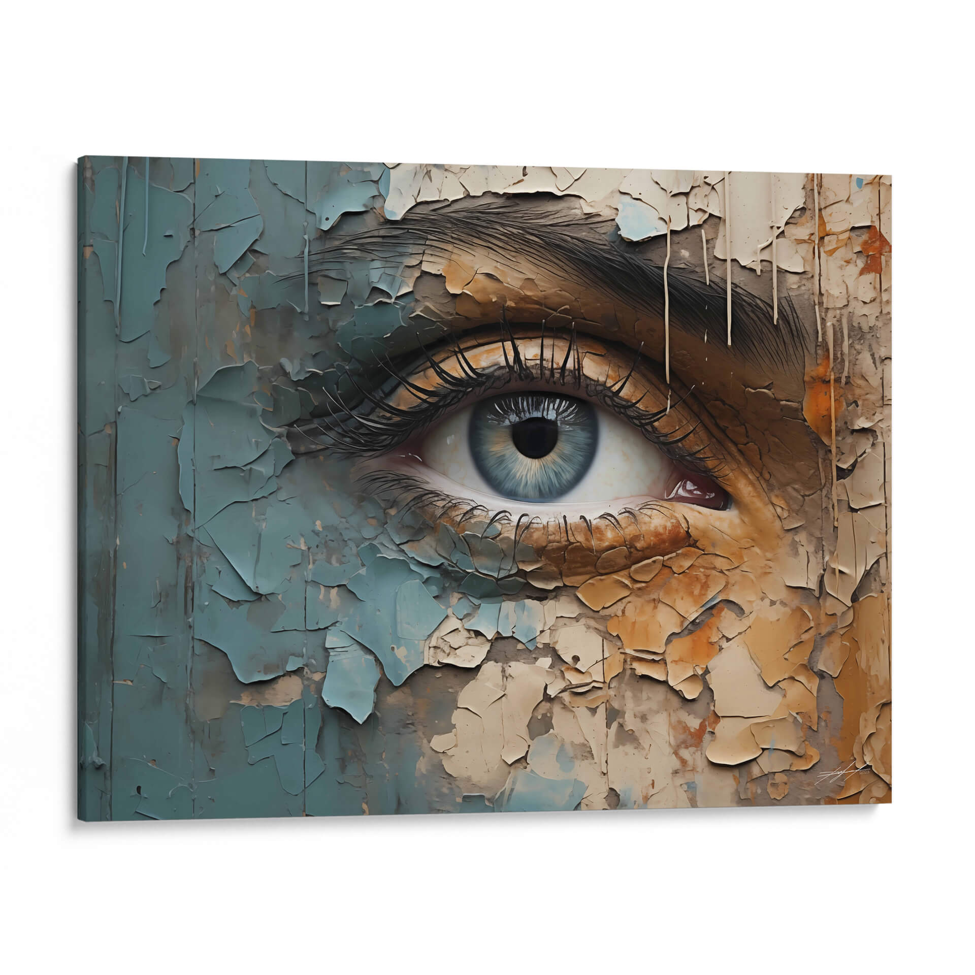 Sumérgete en la profundidad de la mirada con "VEO - 8", una obra de arte digital que captura la esencia de la introspección. Este cuadro decorativo presenta un primer plano de un ojo humano, cuya pupila azul irradia una serenidad enigmática. La obra se distingue por su textura única, simulando capas de pintura descascarada en tonos tierra, grises y azules pálidos, creando un contraste intrigante entre lo orgánico y lo desgastado. La composición detallada de las pestañas y la ceja añade un realismo cautivador, contrastando con la abstracción del fondo agrietado. "VEO - 8" es ideal para quienes buscan añadir un toque de misterio y profundidad a sus espacios, funcionando como un punto focal impactante en salas de estar modernas, estudios o incluso dormitorios. Su paleta de colores terrosos y fríos permite una integración armoniosa con diversas decoraciones, aportando carácter y sofisticación. Este lienzo es una invitación a la contemplación, un recordatorio de la complejidad y la belleza que se esconde en la mirada. Descubre el poder de la conexión visual con esta pieza única.