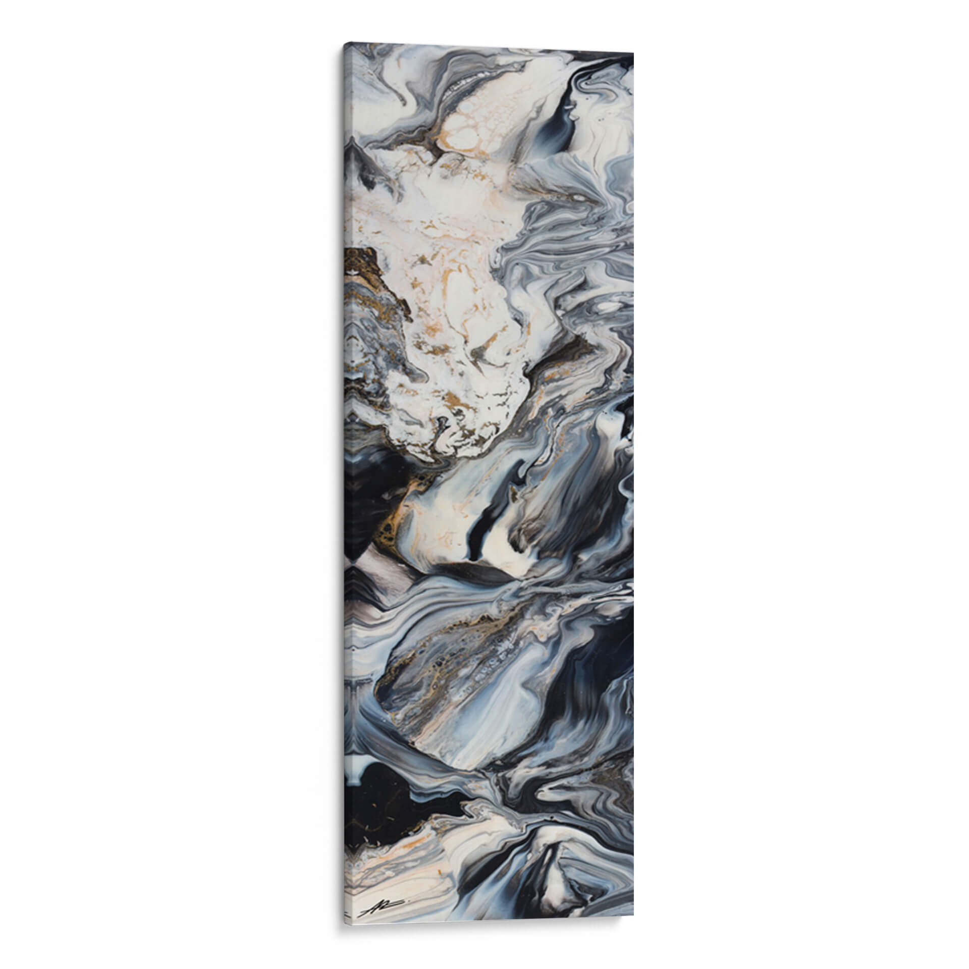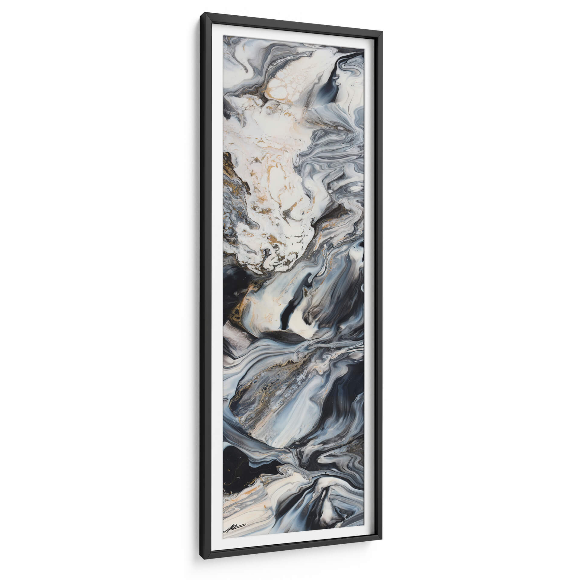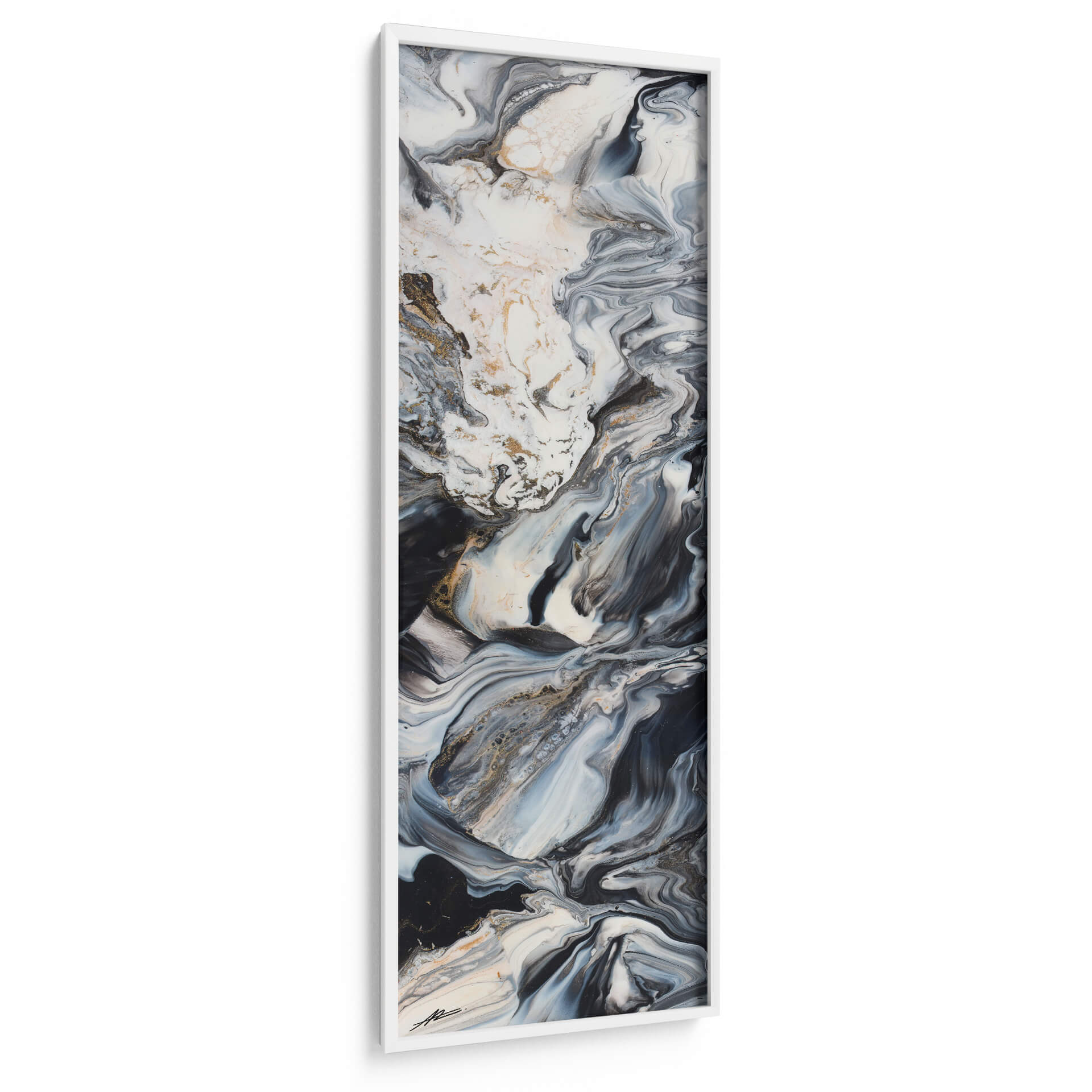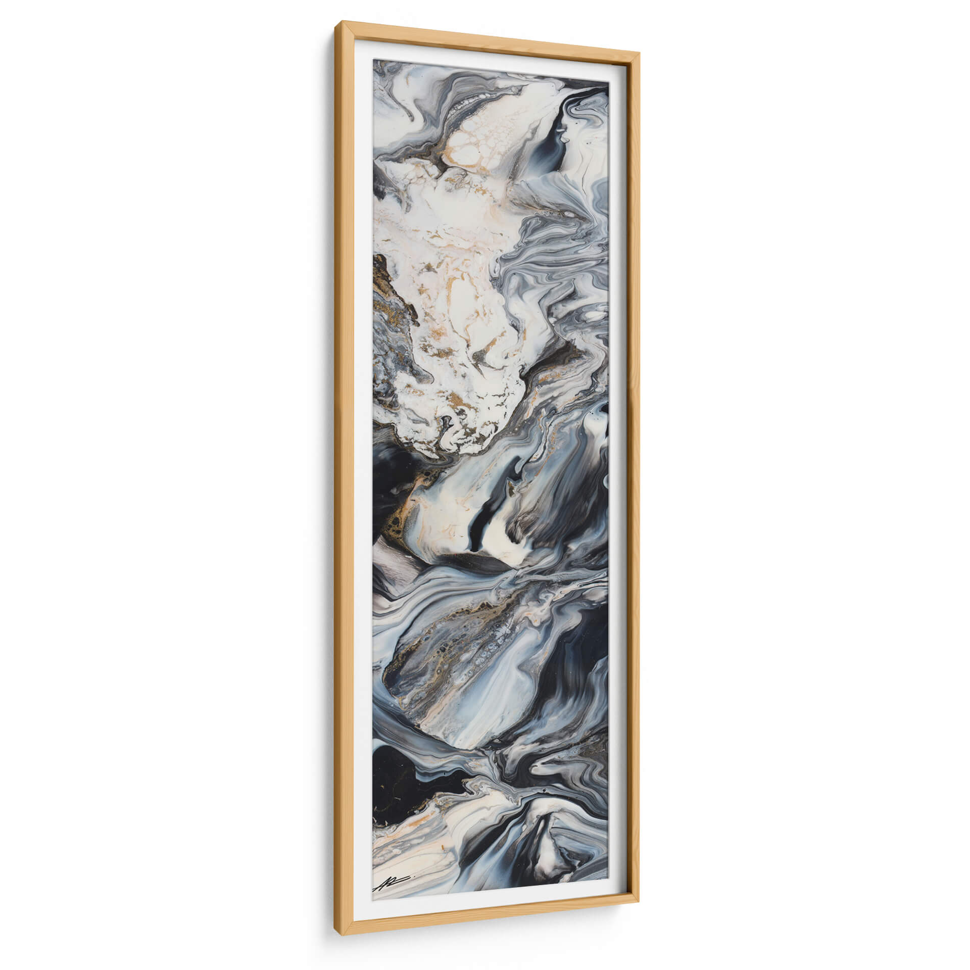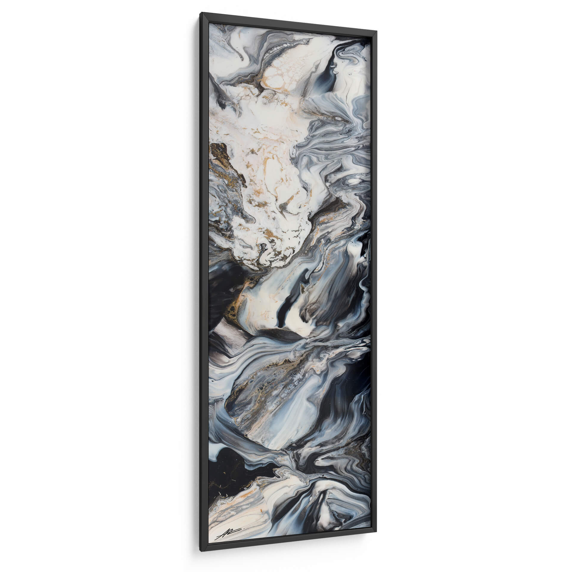 Sumérgete en la sofisticación abstracta de "Veta de Oro" de Alicia Rodríguez, un cuadro decorativo que evoca la belleza geológica y la fluidez del movimiento. Esta obra vertical captura la esencia de las vetas minerales y las formaciones rocosas, fusionando tonos profundos de gris y negro con destellos luminosos de dorado y blanco cremoso. La técnica de vertido (pour painting) empleada por la artista crea remolinos orgánicos y texturas visuales que invitan a la contemplación, simulando la delicadeza de la seda o la robustez del mármol. "Veta de Oro" es una pieza maestra contemporánea, ideal para añadir un toque de elegancia discreta y un punto focal dinámico a cualquier espacio. Su composición alargada y sus contrastes dramáticos la hacen perfecta para pasillos estrechos, espacios modernos o para complementar una decoración de estilo industrial o maximalista. Deja que esta vibrante obra de arte enriquezca tu hogar u oficina, aportando una sensación de profundidad, lujo y un diseño contemporáneo inigualable que resonará con tu estilo personal y cautivará a tus invitados. Descubre el poder transformador del arte abstracto.