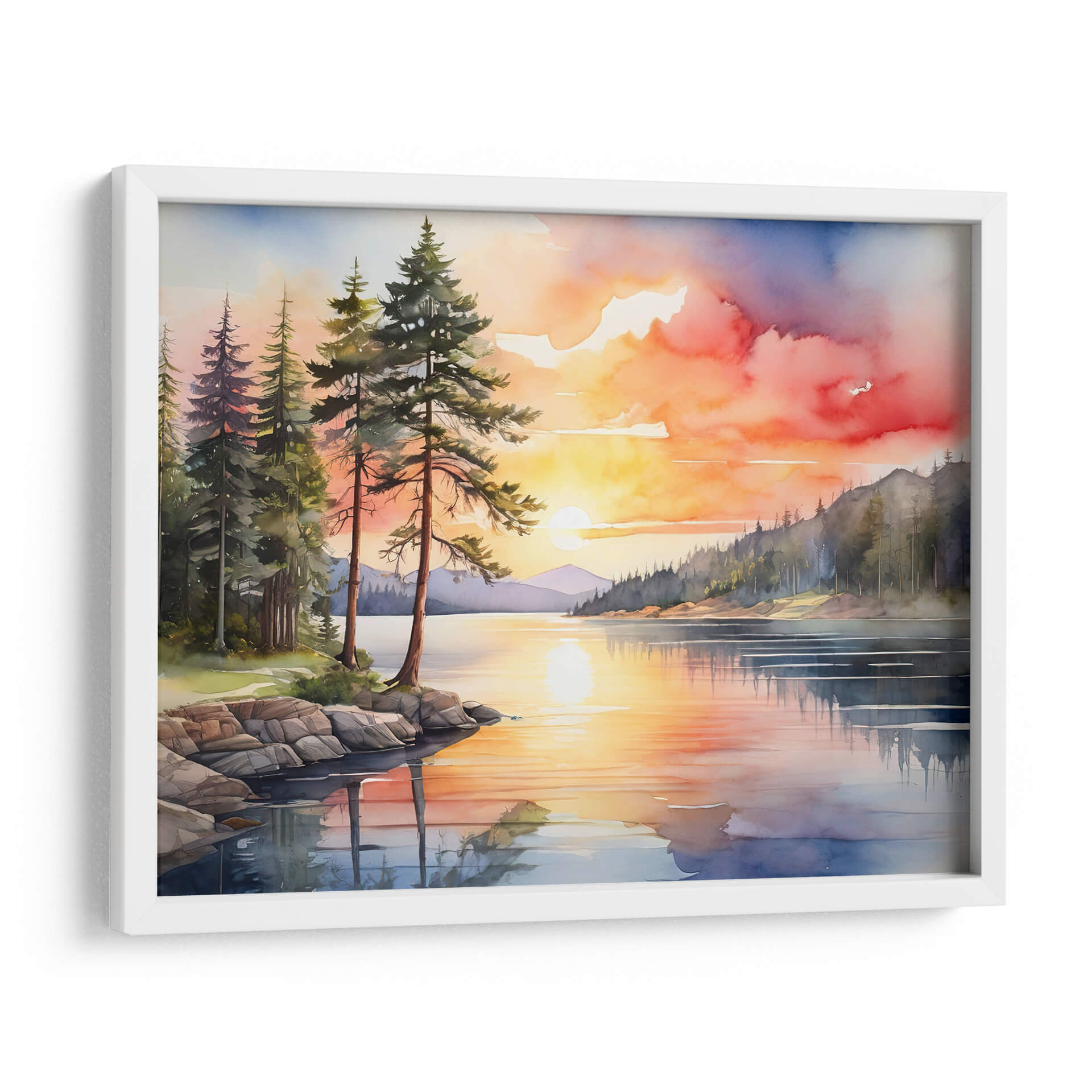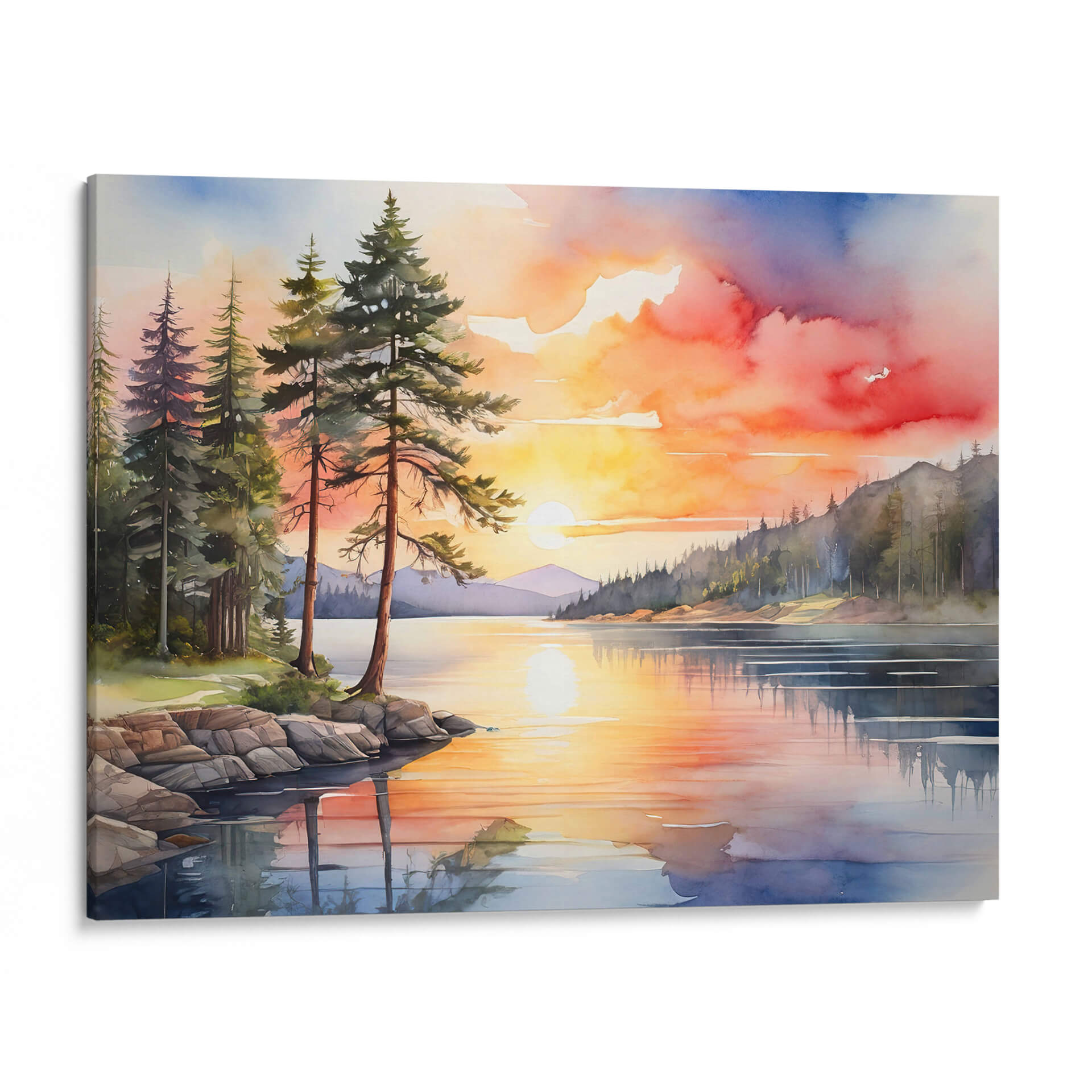 Captura la serenidad y la majestuosidad de la naturaleza con este cautivador cuadro decorativo 'Vista al Lago'. La obra, inspirada en la técnica de acuarela, presenta un atardecer vibrante sobre un lago tranquilo, rodeado de pinos imponentes y rocas escarpadas. Los tonos cálidos del cielo, que transitan del naranja al rojo intenso y se funden con azules suaves, crean una atmósfera de paz y reflexión. La luz del sol poniente se refleja en las tranquilas aguas del lago, duplicando la belleza escénica y añadiendo profundidad a la composición. Los árboles, representados con detalle y trazos sueltos, aportan una sensación de vitalidad y conexión con el entorno natural. Este cuadro es ideal para aquellos que buscan infundir calma y belleza natural en sus hogares u oficinas. Su estilo evocador lo convierte en una pieza focal perfecta para salones, dormitorios o cualquier espacio que necesite un toque de inspiración paisajística. Añade esta obra maestra a tu colección y transforma tu ambiente en un oasis de tranquilidad y color.