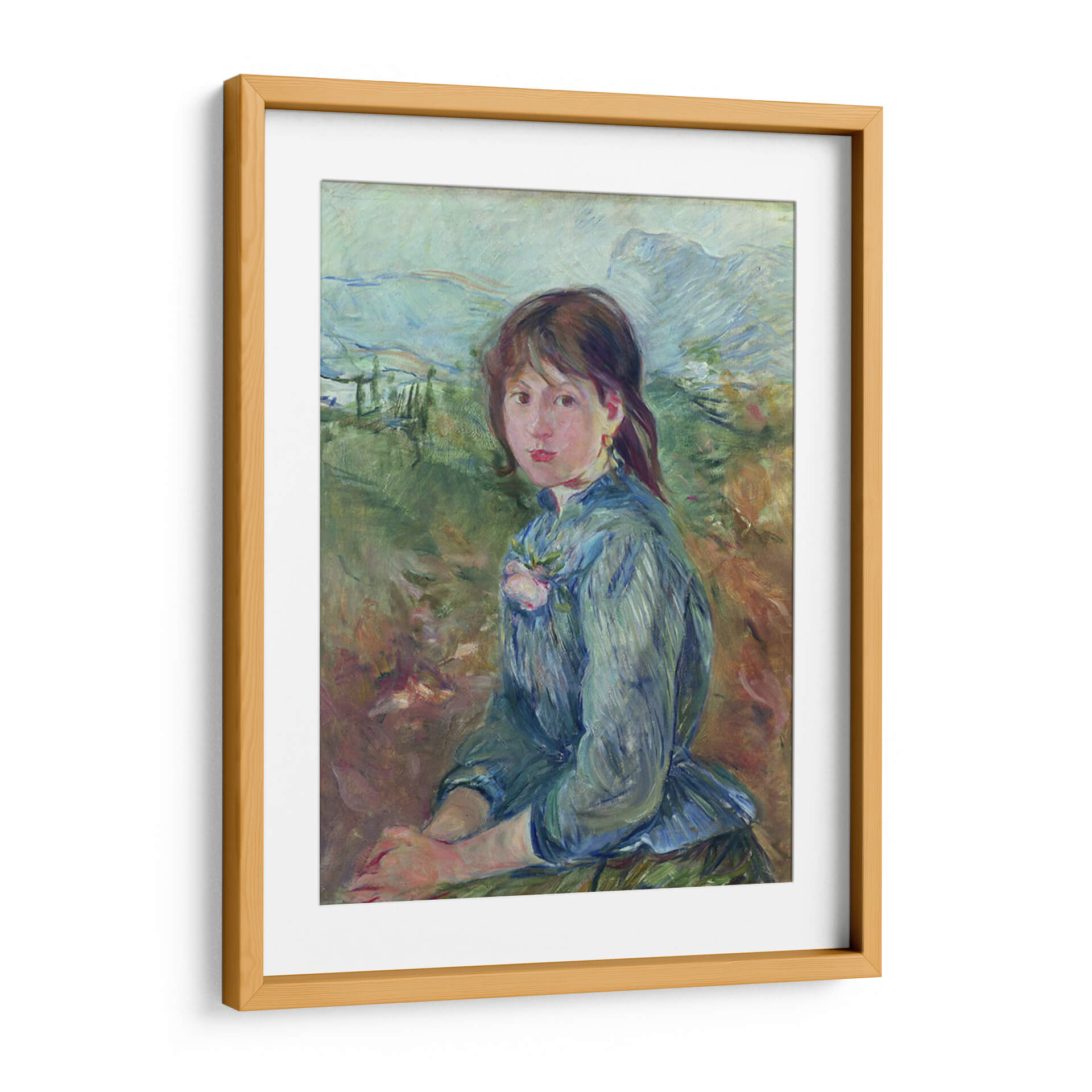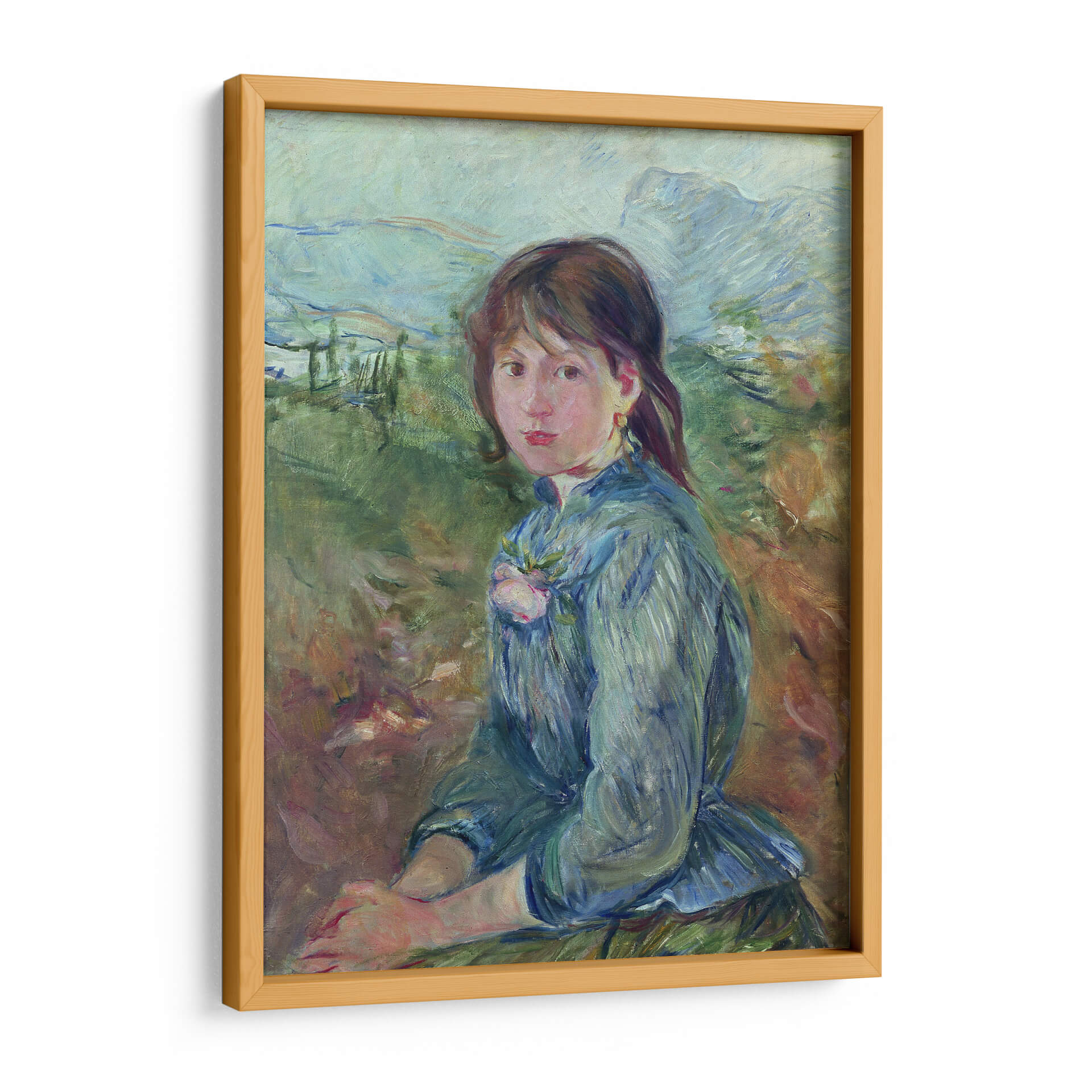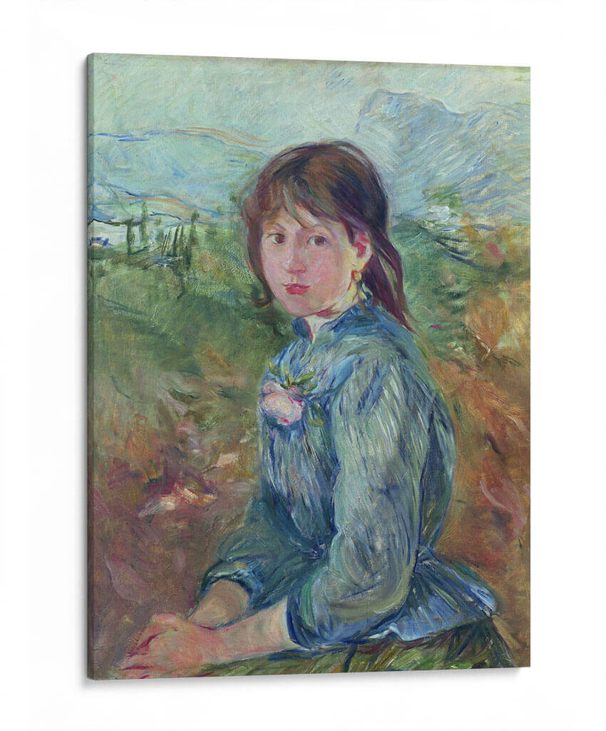 Sumérgete en la serenidad campestre con "Aldeana nizarda" de Berthe Morisot, una obra maestra impresionista que captura la delicadeza y la quietud de la vida rural. Esta pintura al óleo presenta a una joven campesina sentada en un paisaje bucólico, con pinceladas sueltas y luminosas que definen su figura y el entorno natural. La paleta de colores, dominada por verdes terrosos, azules suaves y toques de rosa, evoca una atmósfera de paz y contemplación. La mirada de la joven, directa pero introspectiva, invita al espectador a conectar con su mundo interior. La composición, con la figura central y el paisaje desenfocado al fondo, crea una sensación de intimidad y profundidad. Ideal para añadir un toque de sofisticación atemporal y calma a tu sala de estar, dormitorio o estudio, esta obra es un testimonio del genio de Morisot para capturar la esencia de la vida cotidiana con elegancia y sensibilidad. Transforma tu espacio en un refugio de belleza y tranquilidad con este lienzo inspirador.