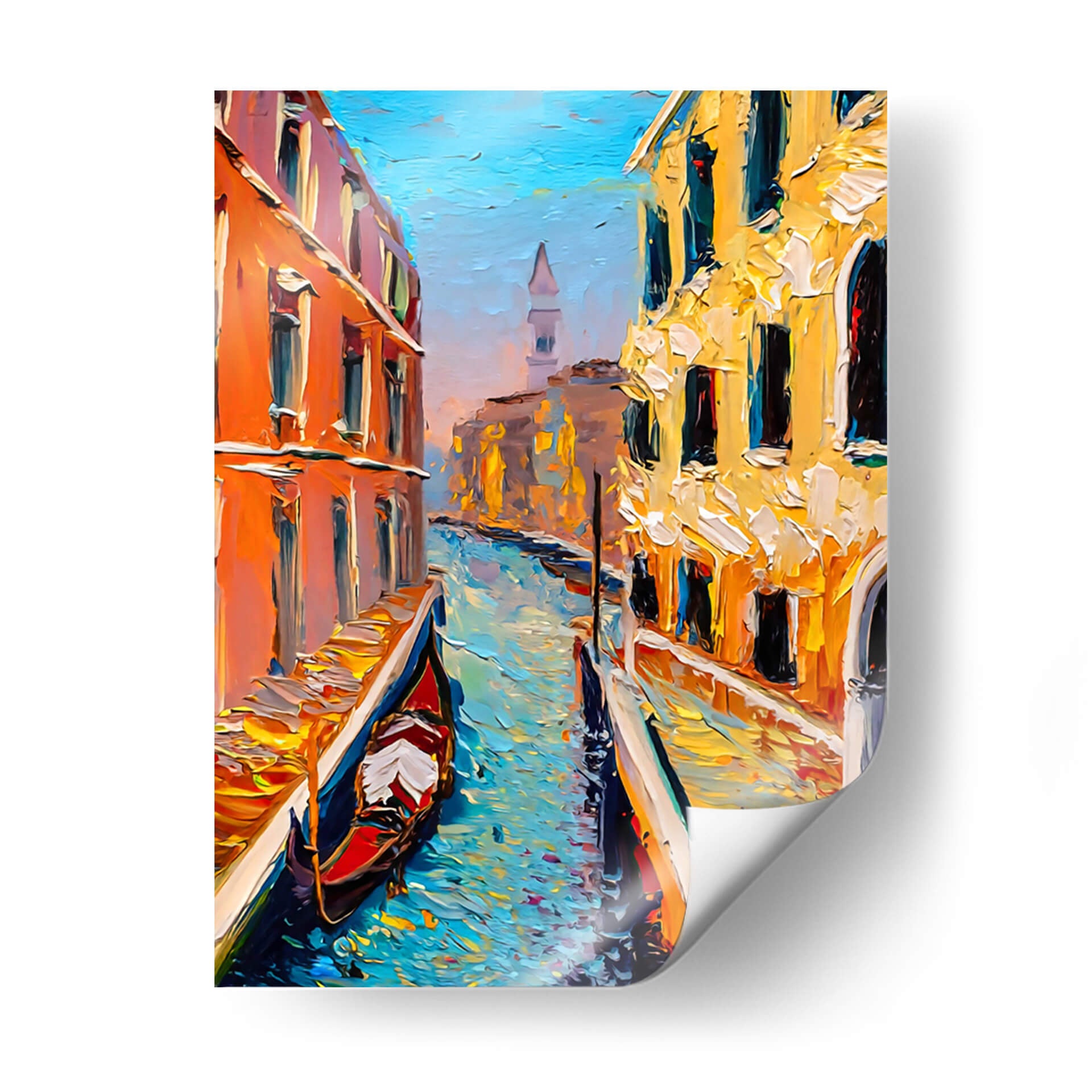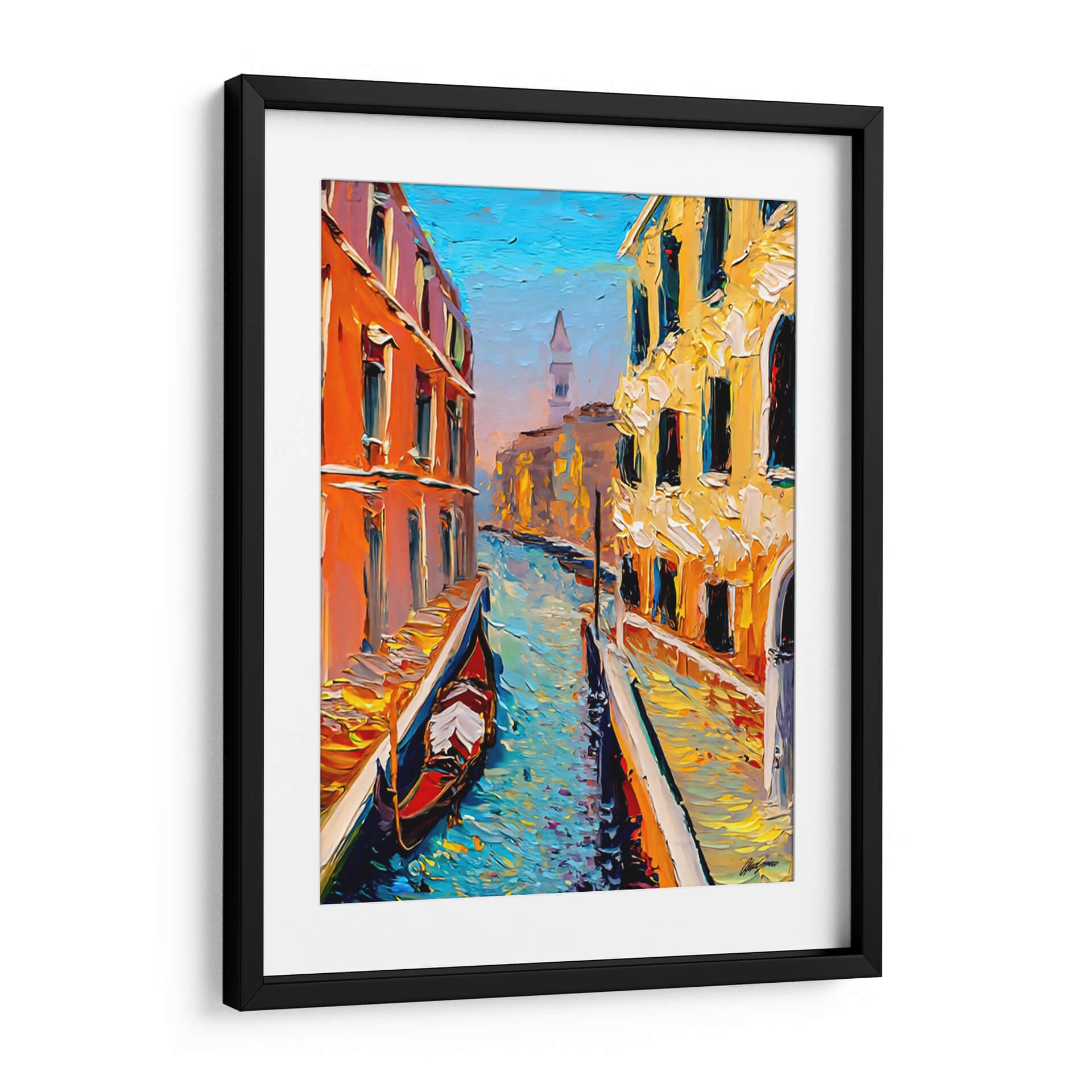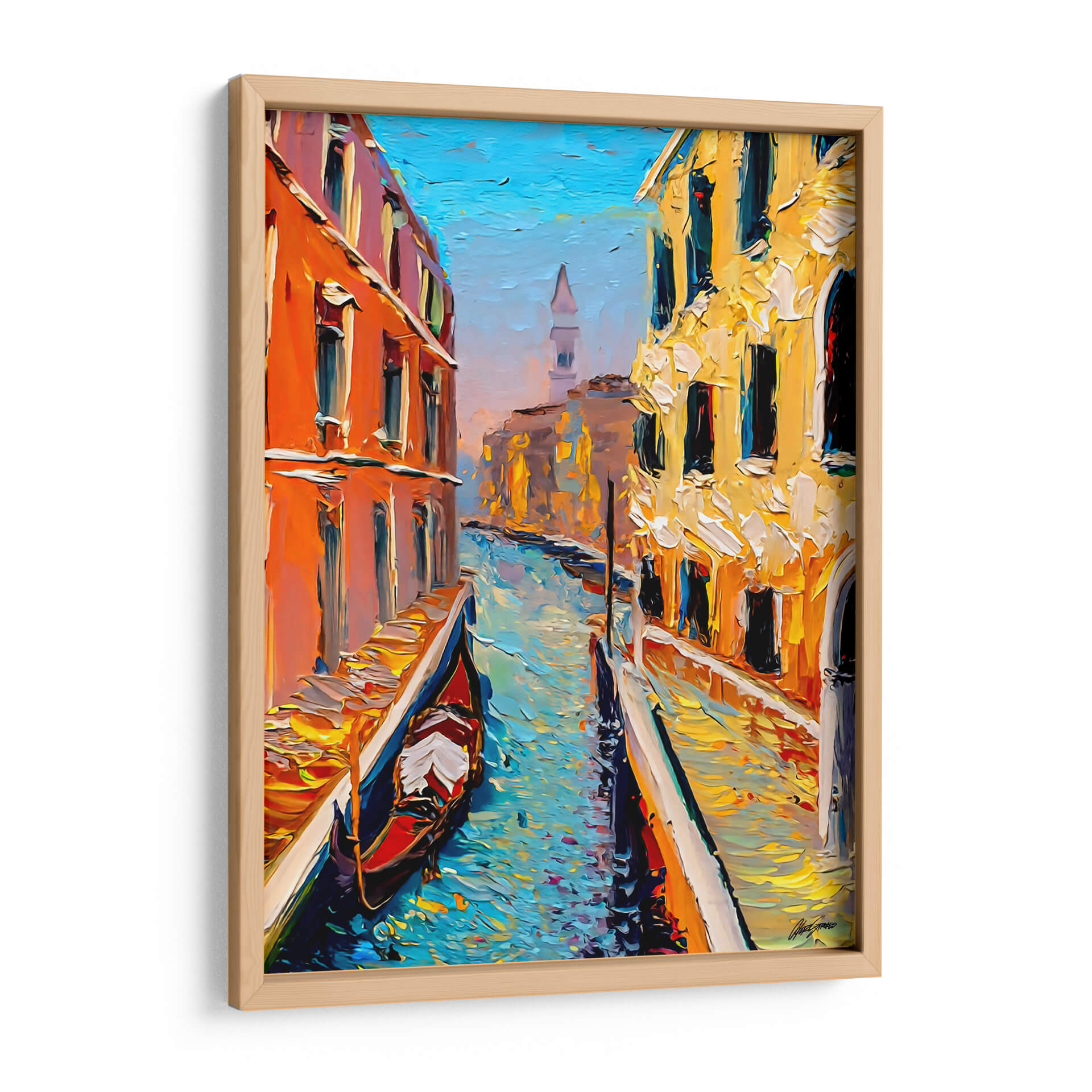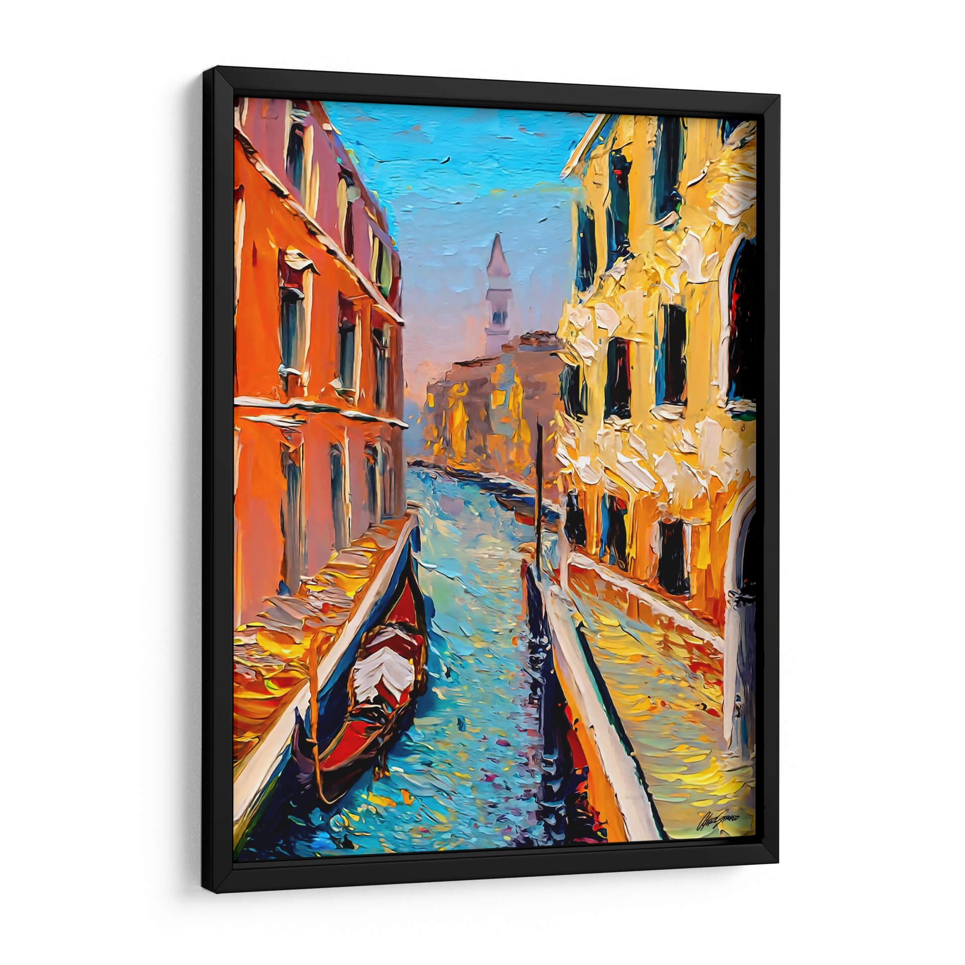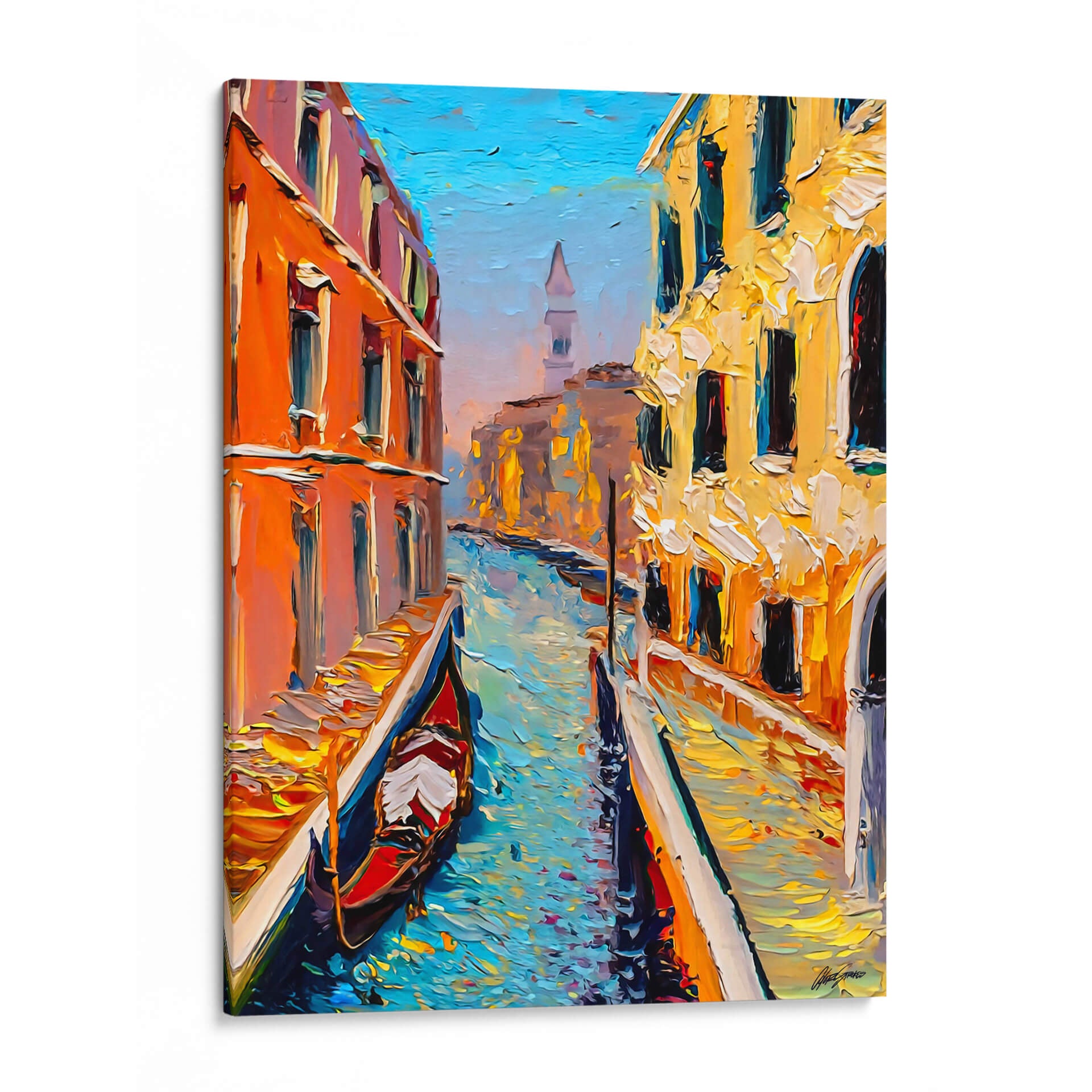 Sumérgete en la romántica atmósfera de Venecia con este vibrante cuadro decorativo, "Canales de Venecia", del artista Color Strokes. La obra captura la esencia de la ciudad italiana a través de una técnica de pintura expresiva y texturizada, donde las pinceladas audaces dan vida a los icónicos edificios venecianos bañados por una luz cálida y dorada. El canal central, de un azul intenso salpicado de reflejos, fluye serpenteante entre las fachadas de colores anaranjados y amarillos, creando una perspectiva cautivadora. La presencia de una góndola roja añade un toque de color distintivo y evoca el encanto tradicional de los paseos por sus aguas. Este cuadro es una invitación a soñar con escapadas y a traer la belleza atemporal de Italia a tu hogar u oficina. Su estilo artístico, cercano al impresionismo moderno, con un uso audaz del color y la textura, lo convierte en una pieza focal perfecta para salones, comedores o estudios que busquen una decoración con carácter y un aire de sofisticación mediterránea. Una ventana a la magia de Venecia, lista para transformar tu espacio.