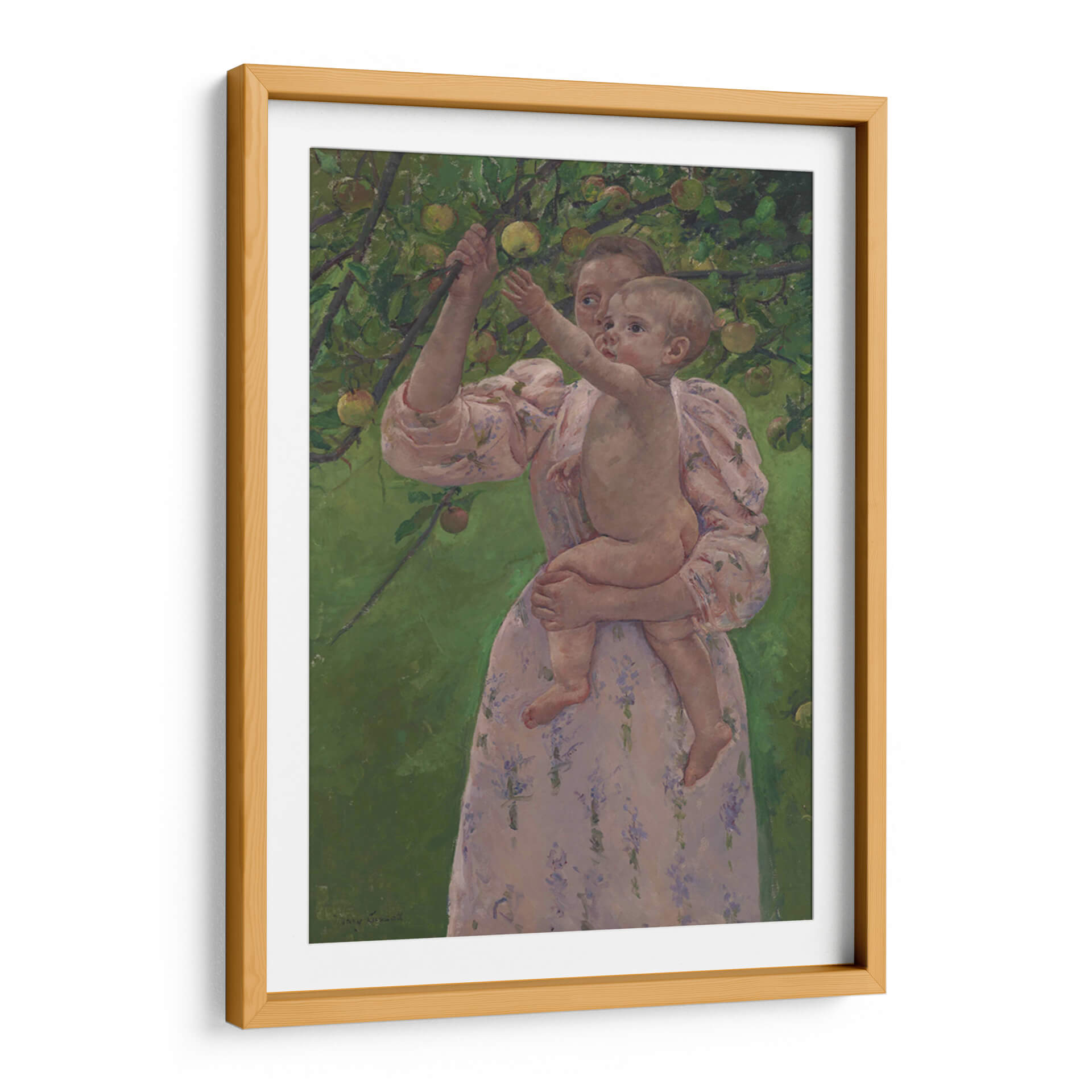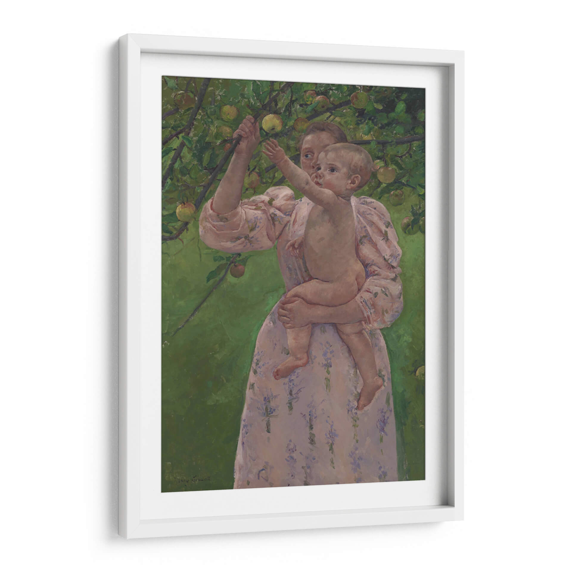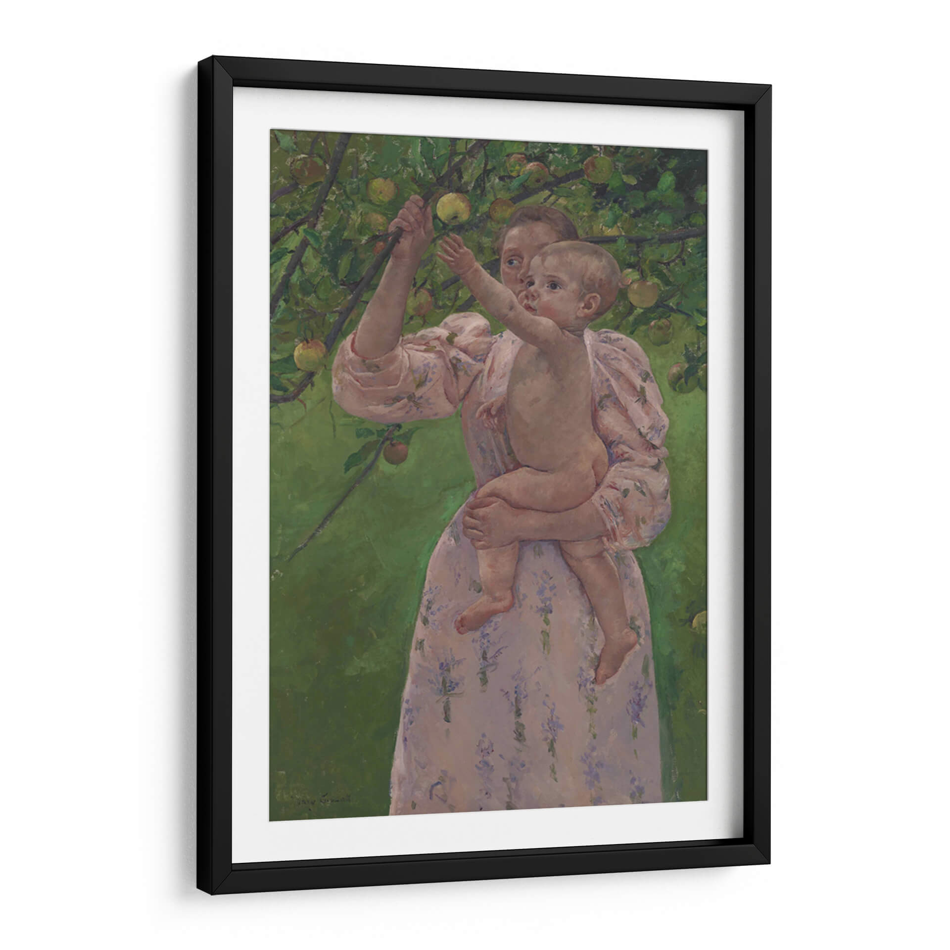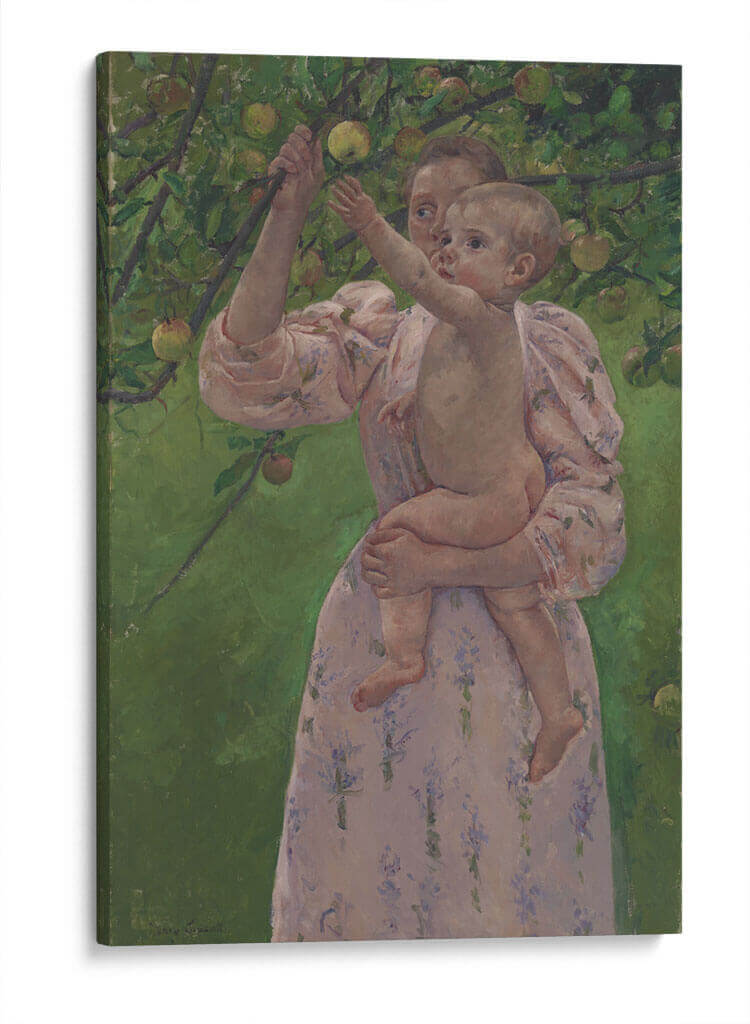 Sumérgete en la ternura y la conexión familiar con "Niño recogiendo una fruta", una obra maestra de Mary Cassatt que captura un momento íntimo y tierno. Este cuadro decorativo presenta a una madre sosteniendo a su bebé en un entorno frondoso, rodeado de ramas cargadas de frutas. La paleta de colores, dominada por verdes vibrantes del follaje y los tonos suaves y rosados del vestido de la madre y la piel del niño, crea una atmósfera de calidez y serenidad. El estilo impresionista de Cassatt se manifiesta en las pinceladas sueltas y la captura de la luz, dando vida a la escena con una sensación de espontaneidad y dulzura. La composición, centrada en la interacción entre madre e hijo, evoca sentimientos de amor incondicional, inocencia y la alegría simple de la vida al aire libre. Este cuadro decorativo es ideal para añadir un toque de dulzura y sofisticación a cualquier habitación, especialmente en espacios como dormitorios, salas de estar o incluso guarderías, donde su encanto atemporal y su emotividad pueden crear un ambiente acogedor y lleno de afecto. Un lienzo que celebra la maternidad y la infancia, perfecto para quienes buscan arte que toque el alma.